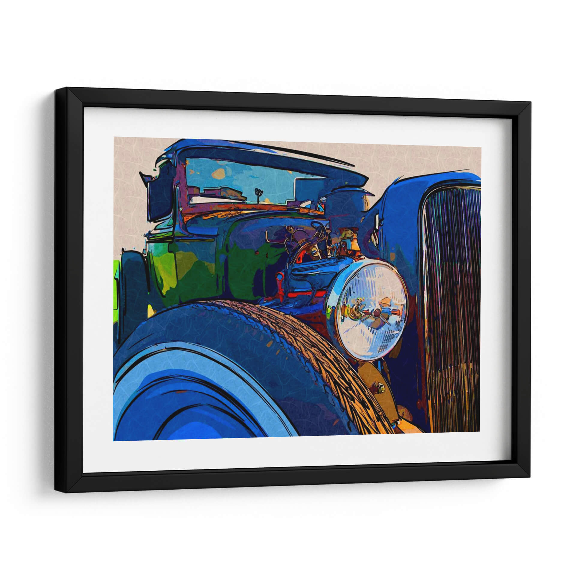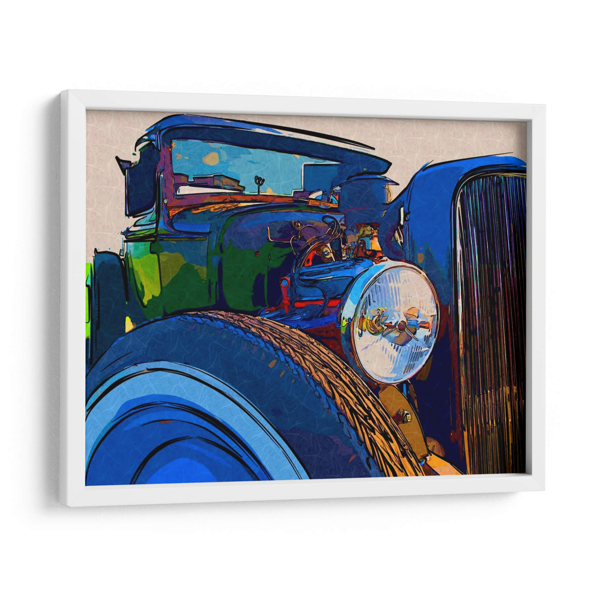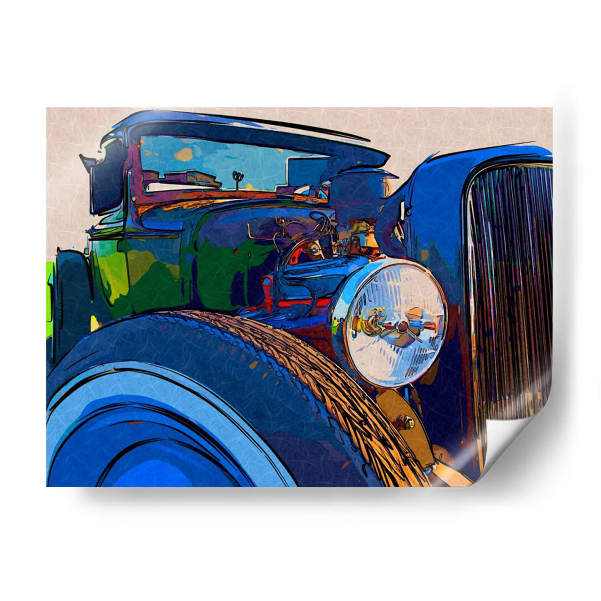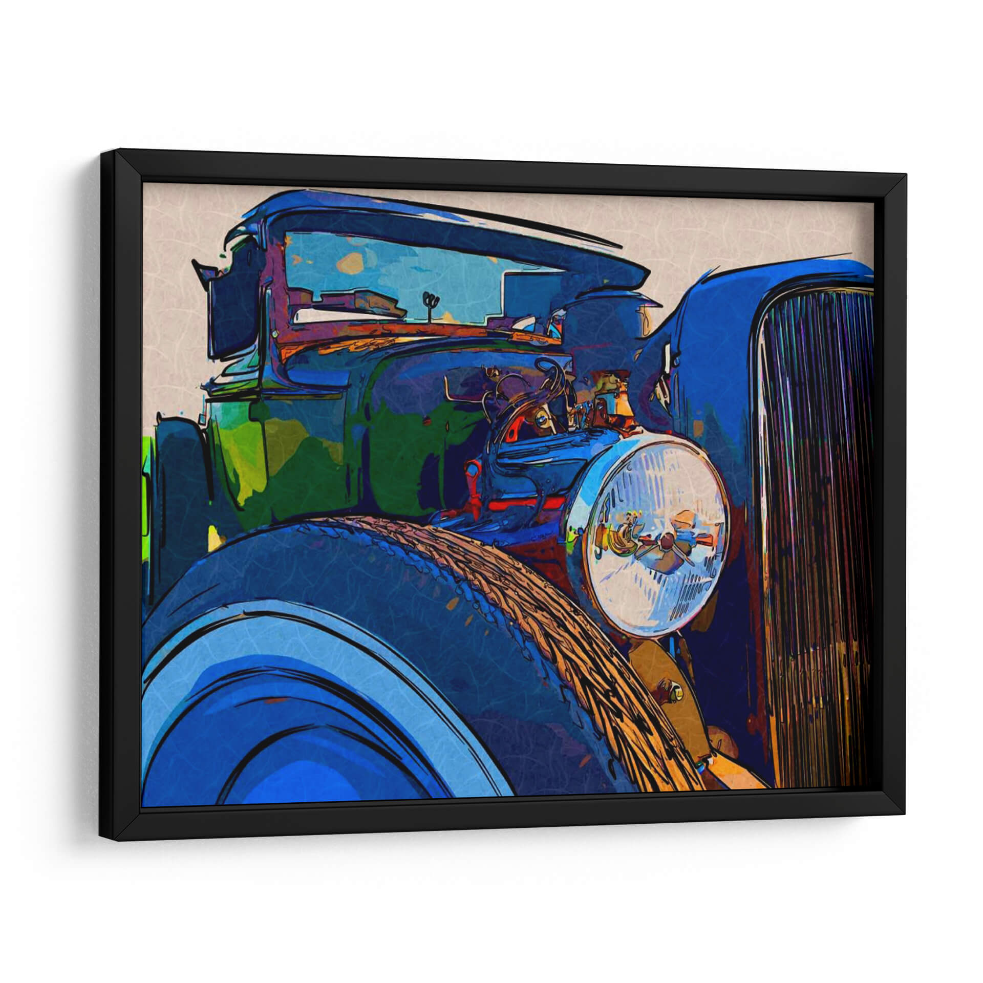 Sumérgete en la nostalgia y el estilo con 'Classic Cruisin I', una obra de arte que captura la esencia de los automóviles clásicos con una interpretación moderna y vibrante. Este cuadro decorativo presenta un primer plano detallado de un vehículo de época, destacando sus líneas curvas y su imponente parrilla. La paleta de colores, dominada por azules intensos, verdes profundos y toques de naranja y rojo, crea una atmósfera enérgica y dinámica. El estilo artístico, que fusiona elementos del arte pop y la abstracción, le otorga una cualidad única y contemporánea, perfecta para añadir un punto focal audaz a cualquier espacio. Ideal para los amantes de los coches clásicos, los entusiastas del diseño retro o cualquiera que busque una pieza de conversación que transmita carácter y sofisticación. Este cuadro es más que una simple decoración; es una declaración de estilo que evoca libertad, aventura y un aprecio por la ingeniería automotriz icónica. Añade un toque de elegancia atemporal a tu sala de estar, estudio u oficina con esta impresionante representación artística que celebra la era dorada del automovilismo.