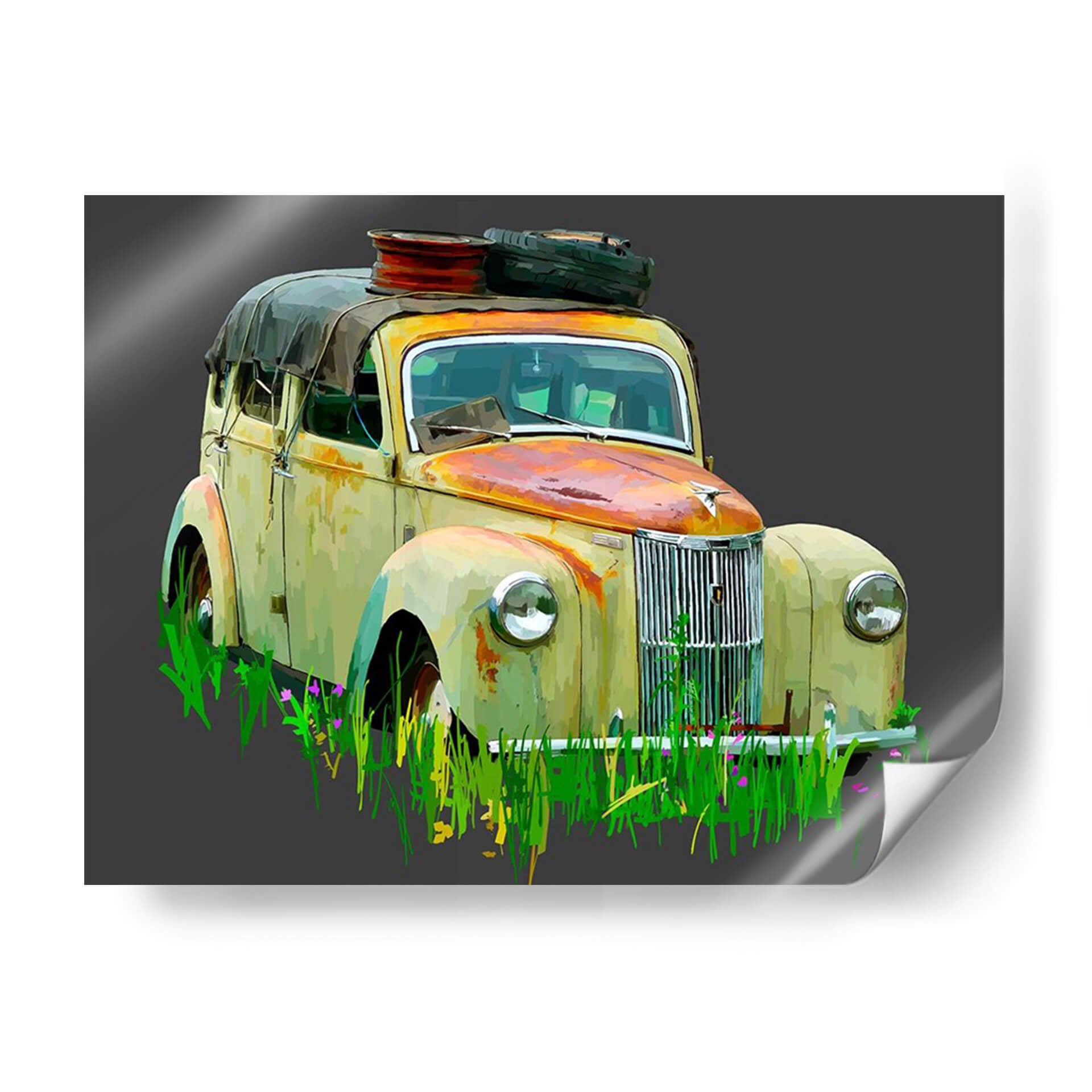 Este cuadro decorativo, "Coche Oxidado III" de Emily Kalina, captura la melancólica belleza de un vehículo clásico abandonado en la naturaleza. La obra se centra en un coche de época, con su carrocería desgastada por el tiempo mostrando tonos óxidos y amarillentos que contrastan con el verde vibrante de la hierba alta que lo rodea. Las pinceladas, de estilo expresionista o impresionista digital, aportan textura y profundidad, dando vida a la escena. La composición, con el coche ocupando la mayor parte del encuadre, invita a la reflexión sobre el paso del tiempo, la nostalgia y la resistencia. La paleta de colores, dominada por ocres, verdes y toques de azul en los cristales, crea una atmósfera evocadora y ligeramente melancólica, pero a la vez llena de carácter. Este cuadro es ideal para añadir un toque de historia, carácter y conversación a cualquier espacio, desde una sala de estar moderna hasta una oficina o un estudio personal que aprecie el arte con narrativa y un aire vintage. "Coche Oxidado III" no es solo una imagen, es una invitación a contemplar la belleza en lo imperfecto y a evocar recuerdos de épocas pasadas, convirtiéndose en un punto focal único y lleno de personalidad para tu decoración.