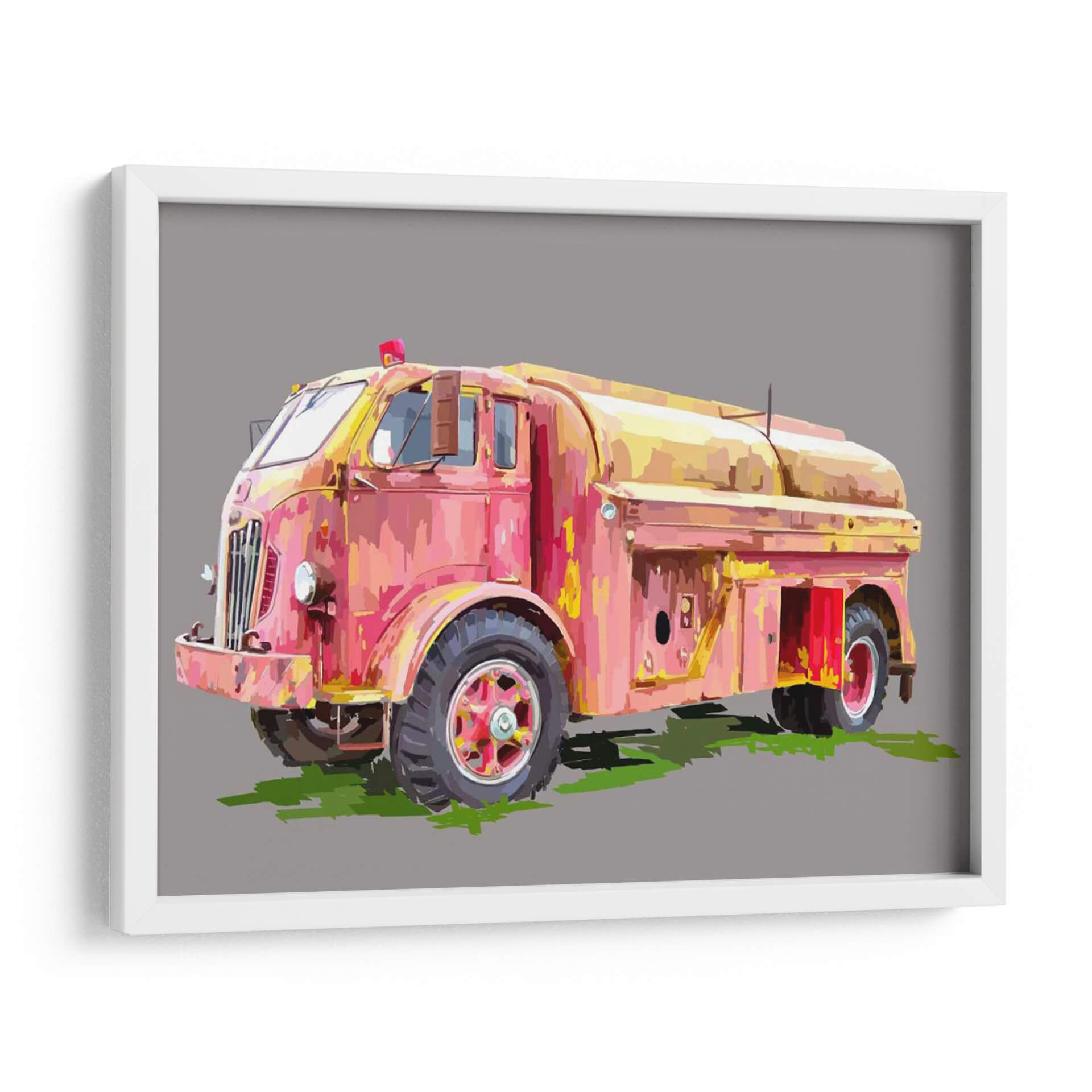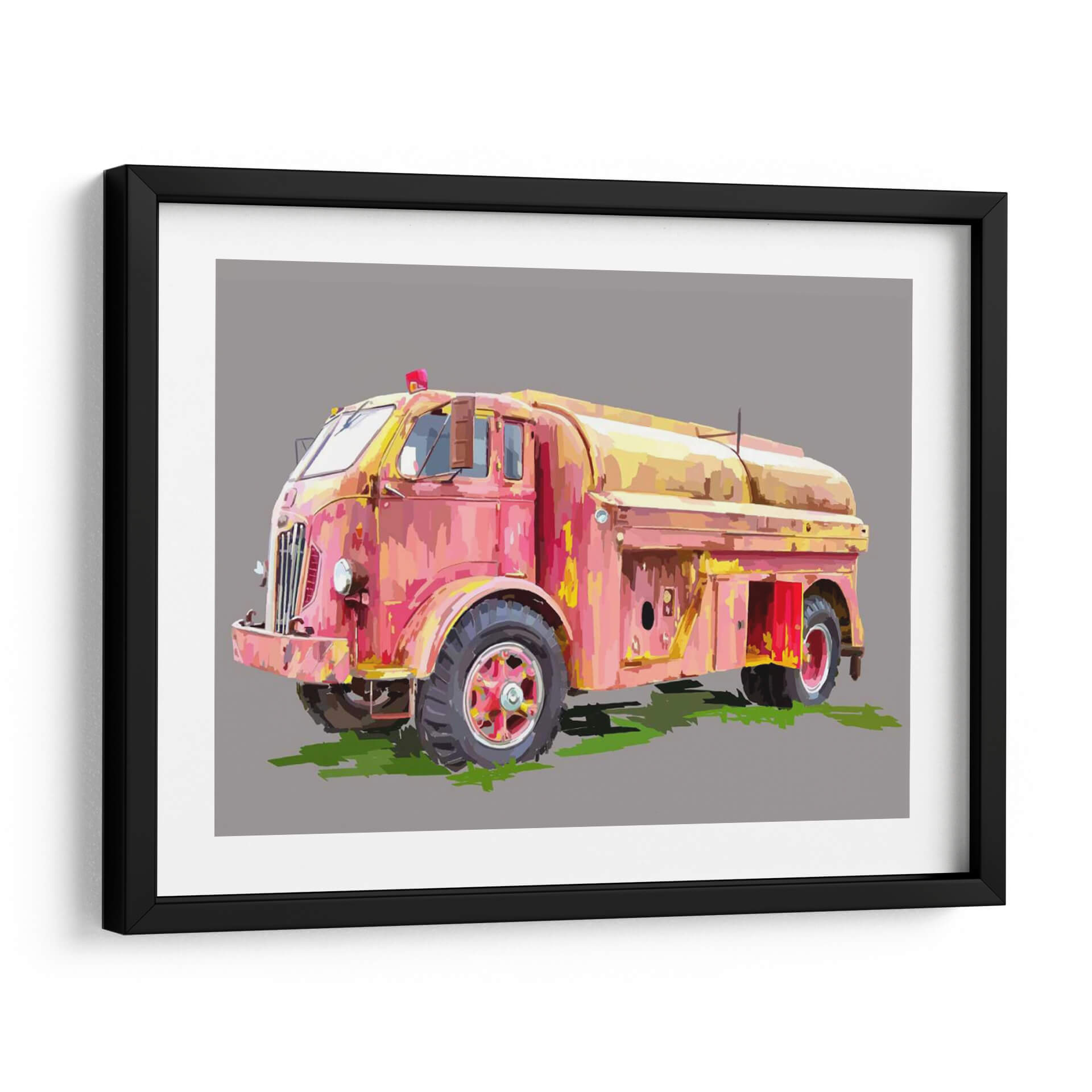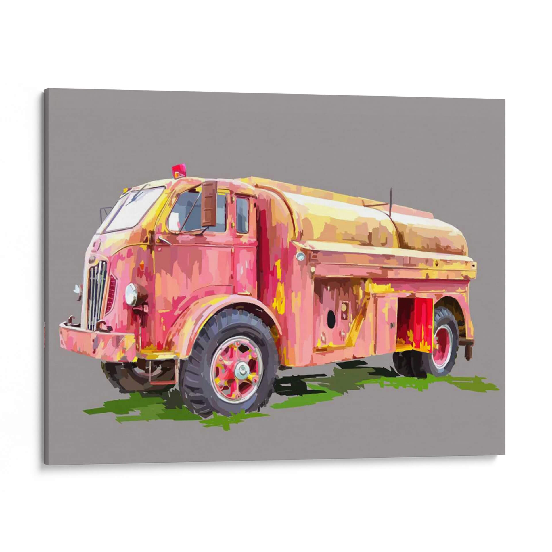 Inyecta un toque de nostalgia y color a tu espacio con 'Firetruck Pinterly', una cautivadora obra de arte digital de Emily Kalina. Este cuadro decorativo captura la esencia de un camión de bomberos vintage, reinterpretado con un estilo que evoca la textura y la pincelada expresiva de la pintura al óleo. La paleta de colores, dominada por tonos vibrantes de rosa, rojo y amarillo, crea una atmósfera energética y audaz, a pesar de la aparente pátina del tiempo en el vehículo. La composición se centra en el vehículo, destacando sus formas robustas y detalles icónicos, mientras que el fondo neutro en gris permite que la obra sea el punto focal indiscutible. Es una pieza perfecta para quienes aprecian el arte con carácter y desean añadir un elemento distintivo y lleno de personalidad a su hogar u oficina. Ideal para salas de estar modernas, estudios o cualquier rincón que necesite un acento retro y vibrante, este cuadro invitara a la conversación y será un reflejo de un gusto único.