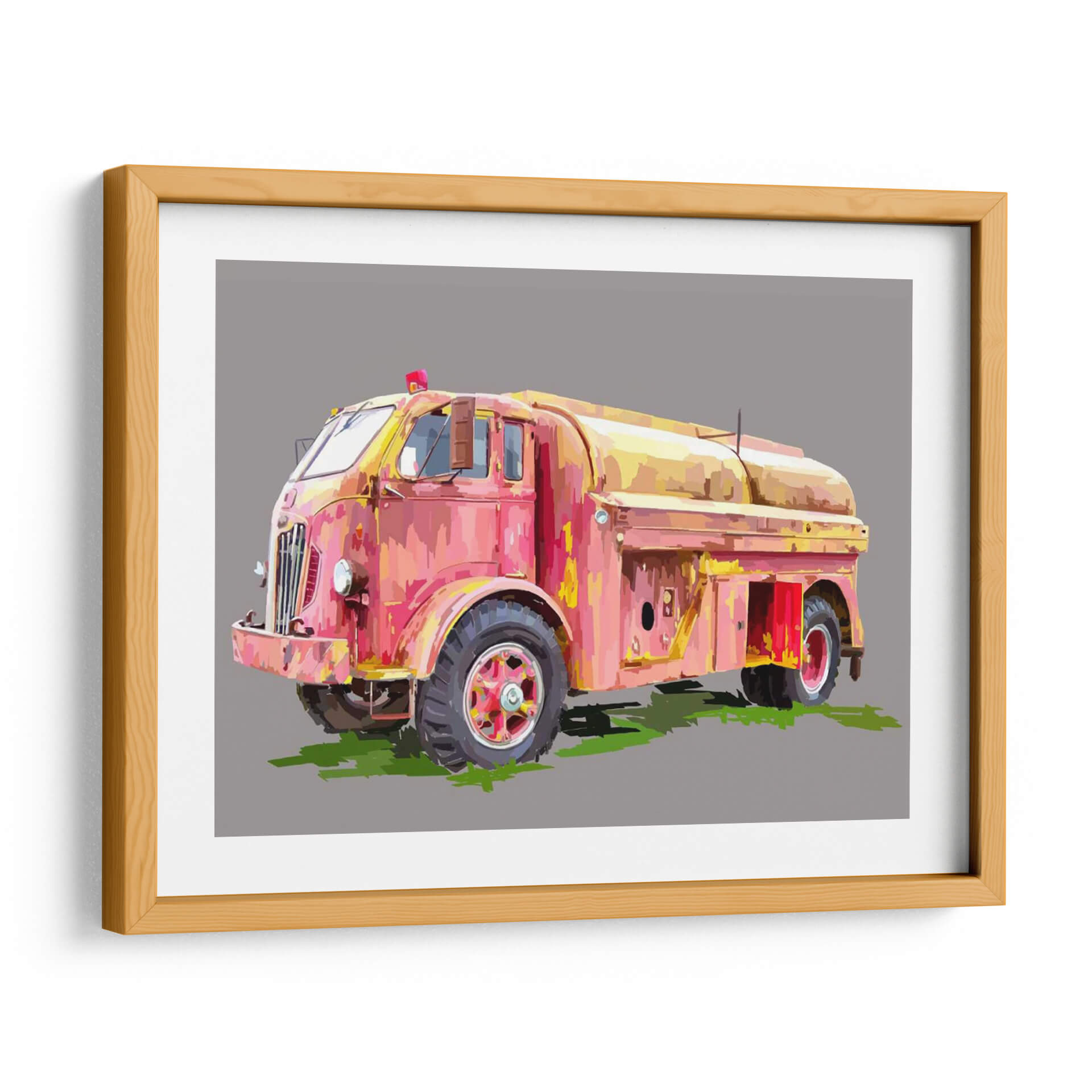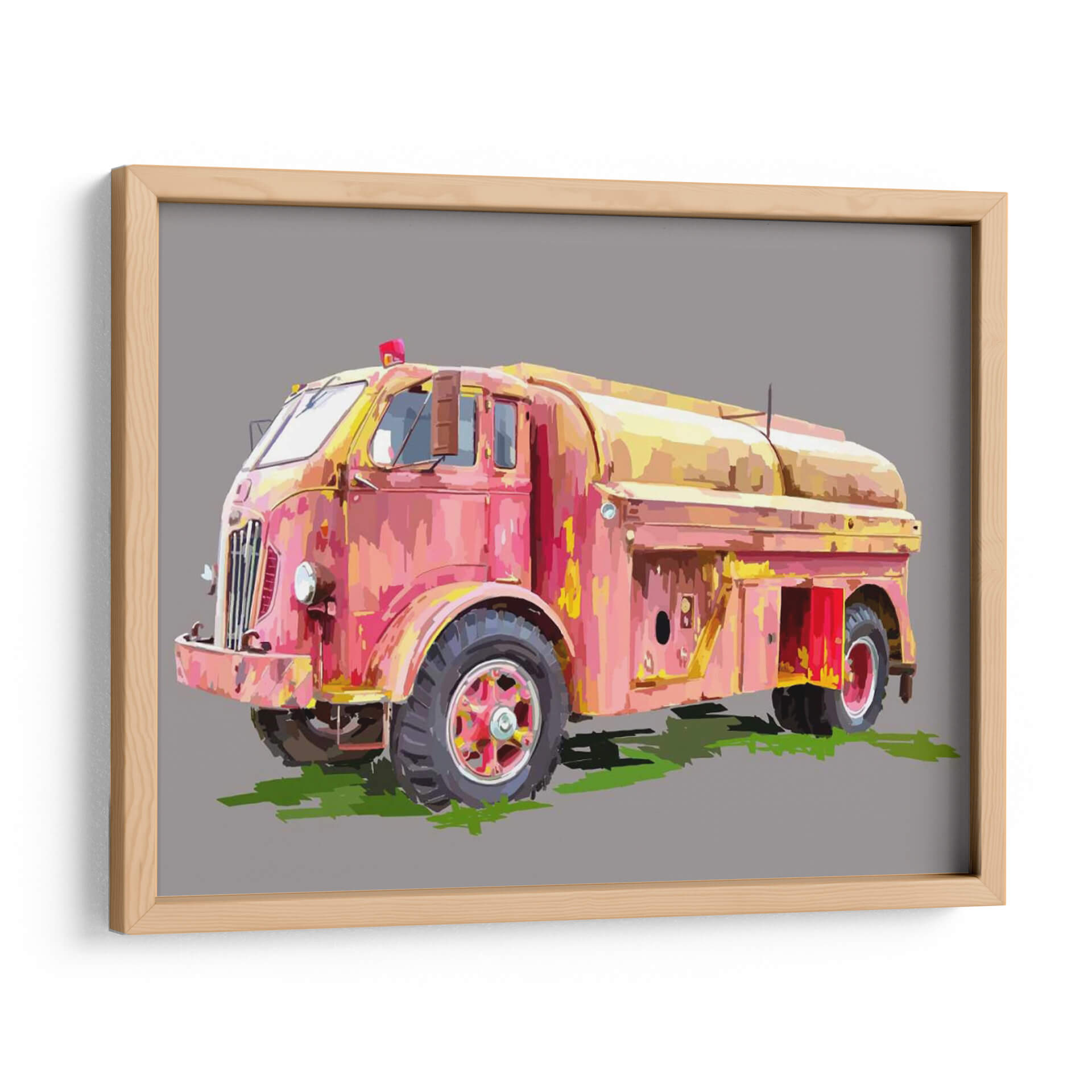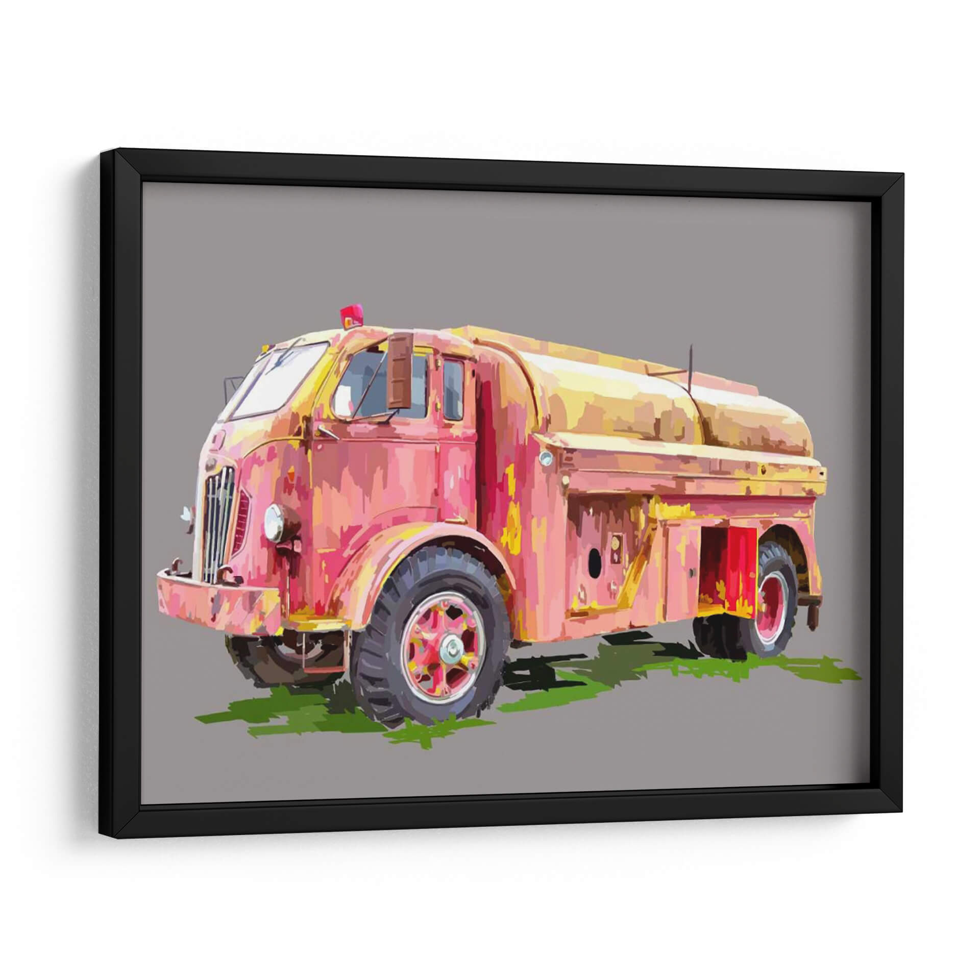 Inyecta un toque de nostalgia y color a tu espacio con 'Firetruck Pinterly', una cautivadora obra de arte digital de Emily Kalina. Este cuadro decorativo captura la esencia de un camión de bomberos vintage, reinterpretado con un estilo que evoca la textura y la pincelada expresiva de la pintura al óleo. La paleta de colores, dominada por tonos vibrantes de rosa, rojo y amarillo, crea una atmósfera energética y audaz, a pesar de la aparente pátina del tiempo en el vehículo. La composición se centra en el vehículo, destacando sus formas robustas y detalles icónicos, mientras que el fondo neutro en gris permite que la obra sea el punto focal indiscutible. Es una pieza perfecta para quienes aprecian el arte con carácter y desean añadir un elemento distintivo y lleno de personalidad a su hogar u oficina. Ideal para salas de estar modernas, estudios o cualquier rincón que necesite un acento retro y vibrante, este cuadro invitara a la conversación y será un reflejo de un gusto único.