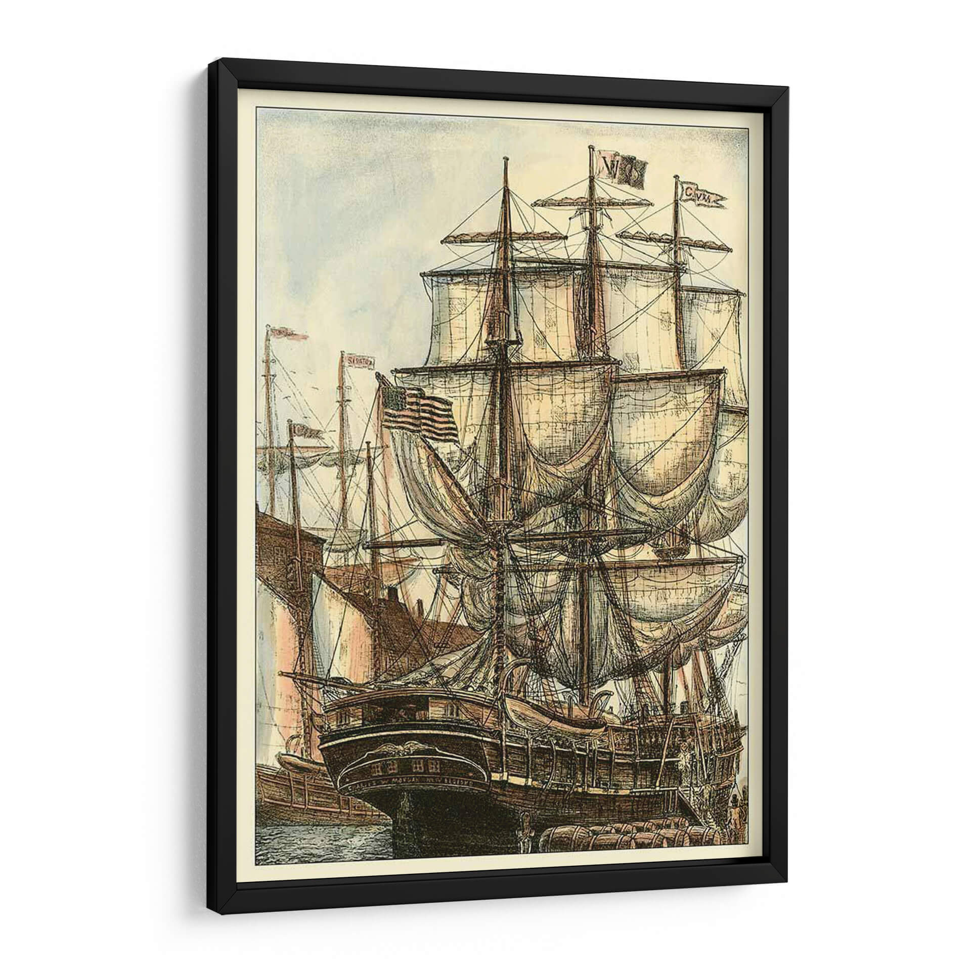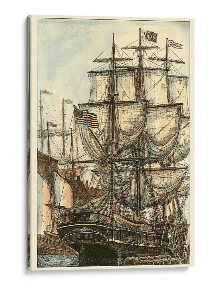 Navega hacia la grandeza con el cuadro decorativo "Impreso Majestuoso Barco I" de Vision Studio. Esta cautivadora obra de arte evoca la era dorada de la navegación, presentando un imponente velero de tres mástiles con sus velas desplegadas, listo para surcar los mares. La detallada ilustración, con un estilo que recuerda a los grabados clásicos, captura la majestuosidad y la aventura inherentes a los viajes marítimos. La paleta de colores se centra en tonos tierra, marrones profundos y blancos crudos de las velas, complementados por sutiles toques de azul en el agua y el cielo, creando una atmósfera serena pero llena de carácter. La composición pone el foco en el barco principal, destacando la complejidad de su aparejo y la robustez de su casco, mientras otros veleros se vislumbran en el fondo, sugiriendo una flotilla en movimiento. Este cuadro decorativo es perfecto para añadir un toque de historia, aventura y sofisticación a cualquier espacio, ya sea una sala de estar moderna, un estudio de oficina o un dormitorio temático. Transmite una sensación de poder, exploración y un legado perdurable, invitando a la contemplación y al asombro.