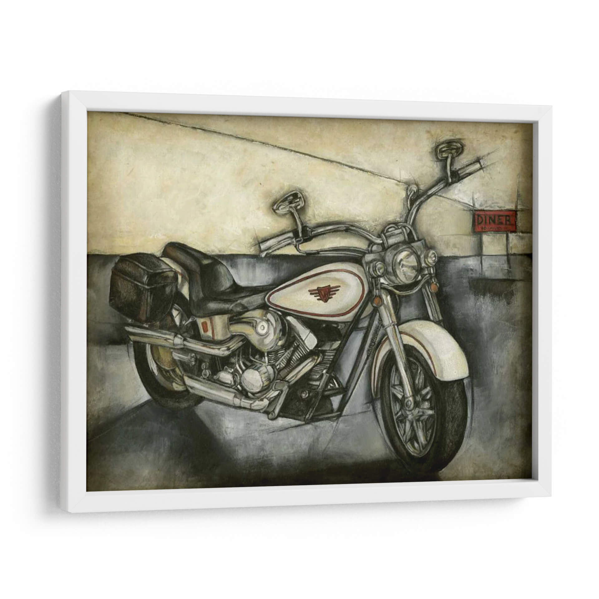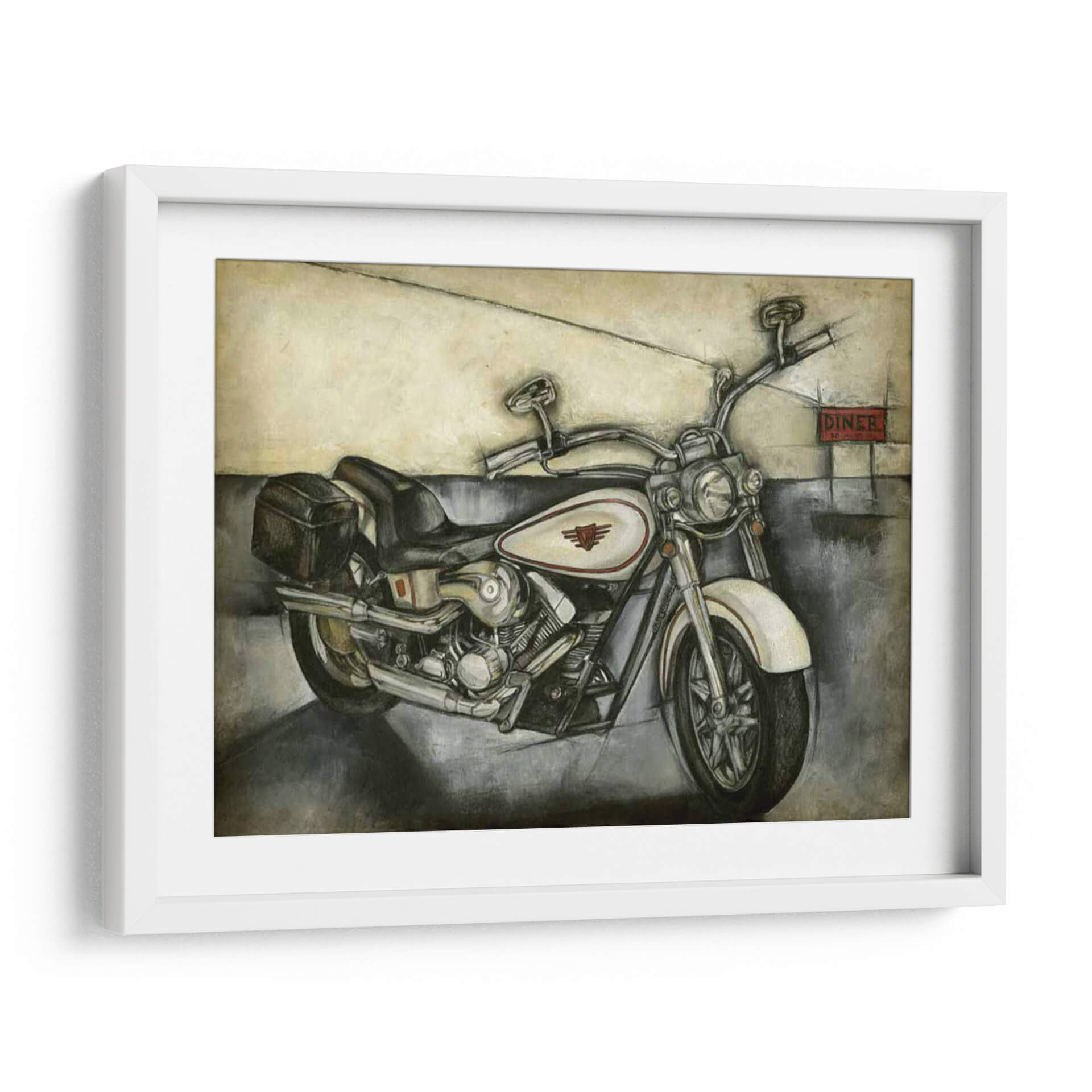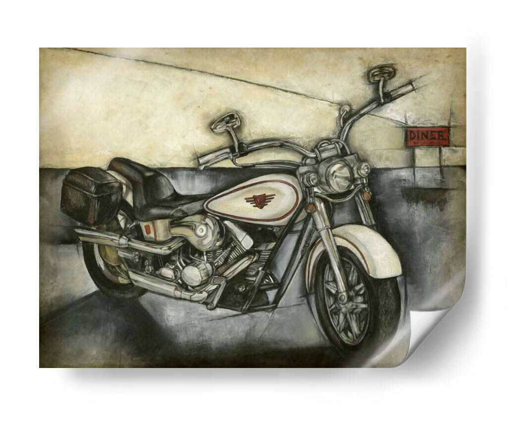 Revive la nostalgia y el espíritu de la carretera abierta con "Memorias De Motocicleta I", una cautivadora obra de arte de Jennifer Goldberger. Esta pieza captura la esencia de una motocicleta clásica, detallada con trazos expresivos y una paleta de colores terrosos y cálidos que evocan una atmósfera vintage y nostálgica. La composición centrada en la motocicleta, junto con el fondo sutilmente texturizado y el letrero 'Diner' al fondo, crea una narrativa visual que invita a imaginar historias de viajes y libertad. Ideal para los amantes de las motocicletas, la cultura retro o para quienes buscan un cuadro decorativo que inyecte carácter y personalidad a su hogar u oficina. El estilo artístico, que combina elementos de ilustración y pintura, le confiere una profundidad única, convirtiéndola en un punto focal interesante para cualquier espacio que busque un toque de autenticidad y aventura. Añade esta pieza a tu colección y deja que evoque conversaciones y recuerdos.