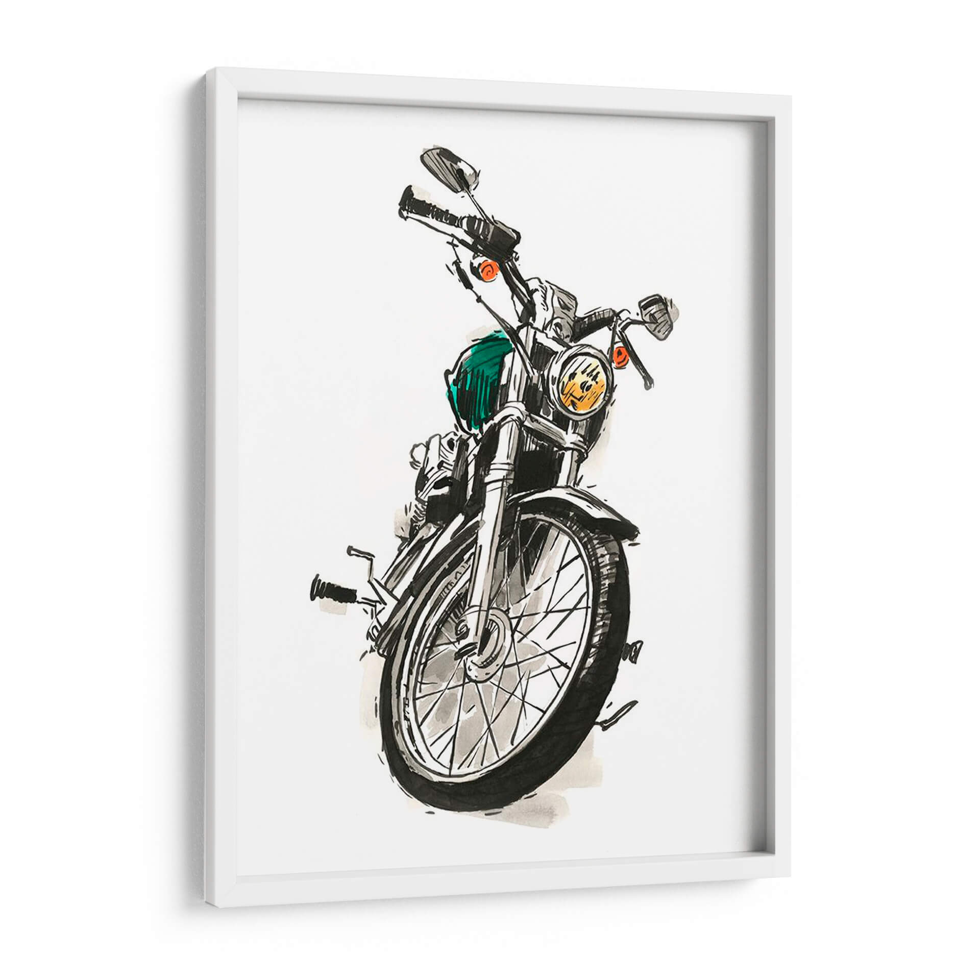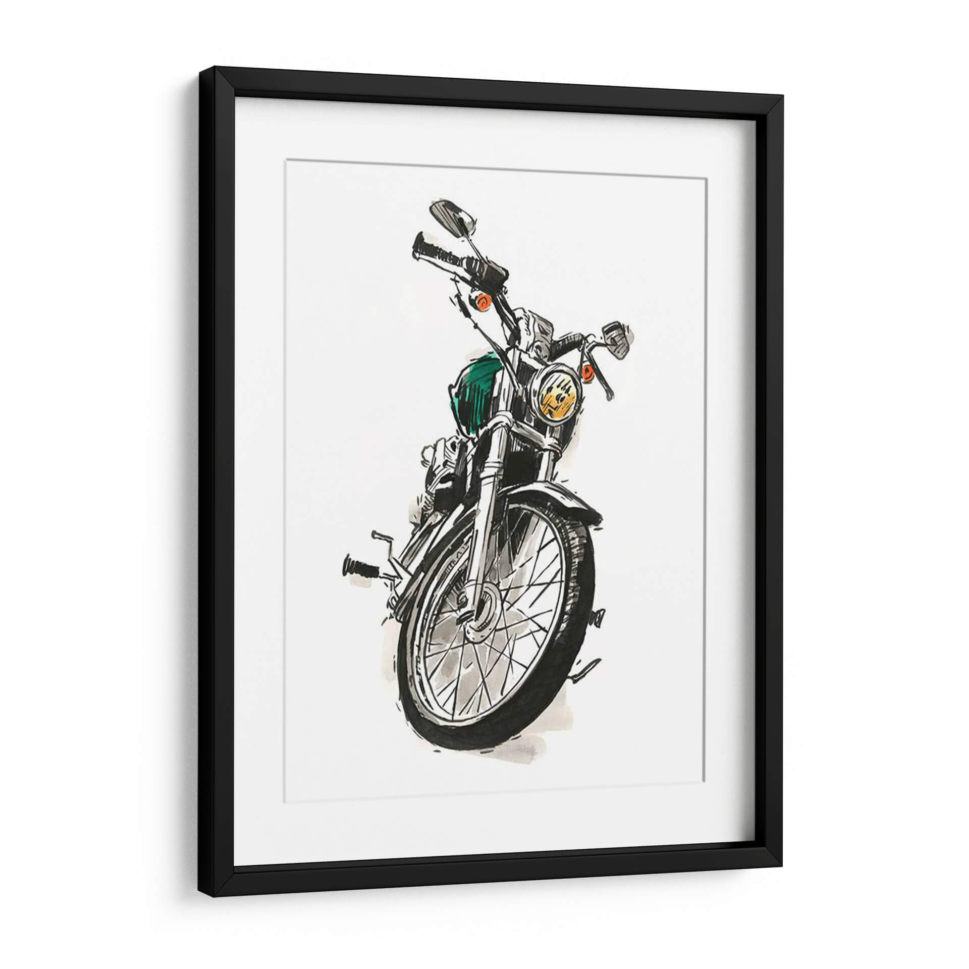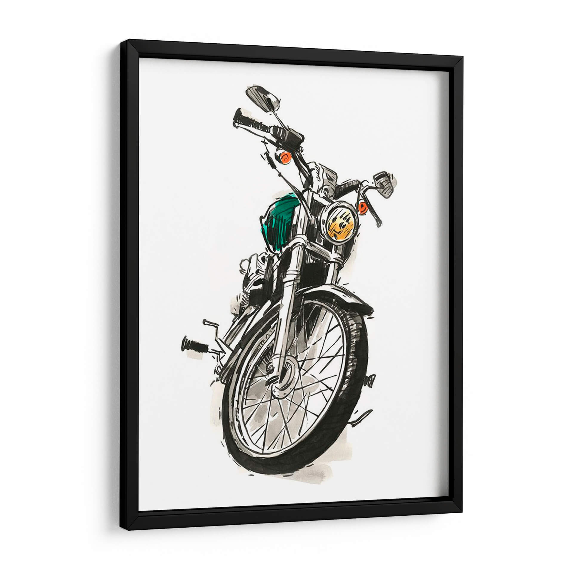 Captura la esencia de la velocidad y el estilo con 'Motocicletas En Tinta I', una obra de arte original del talentoso artista Jacob Green. Esta pieza presenta un detallado boceto a tinta de una motocicleta clásica, enfocándose en la rueda delantera y el manillar, con toques de color vibrante que le otorgan vida. La técnica de tinta, con sus líneas audaces y sombreados expresivos, evoca una sensación de dinamismo y nostalgia, perfecta para los amantes de las dos ruedas y el arte con carácter. El contraste entre el blanco del fondo y los trazos en negro, junto con el sutil acento verde y los detalles anaranjados de las luces, crea una composición visualmente impactante. Ideal para espacios que buscan un toque de rebeldía y sofisticación, como una oficina en casa, un garaje o una sala de estar moderna. Este cuadro decorativo es más que una imagen; es una declaración de estilo y una invitación a la aventura, añadiendo profundidad y personalidad a tu decoración.