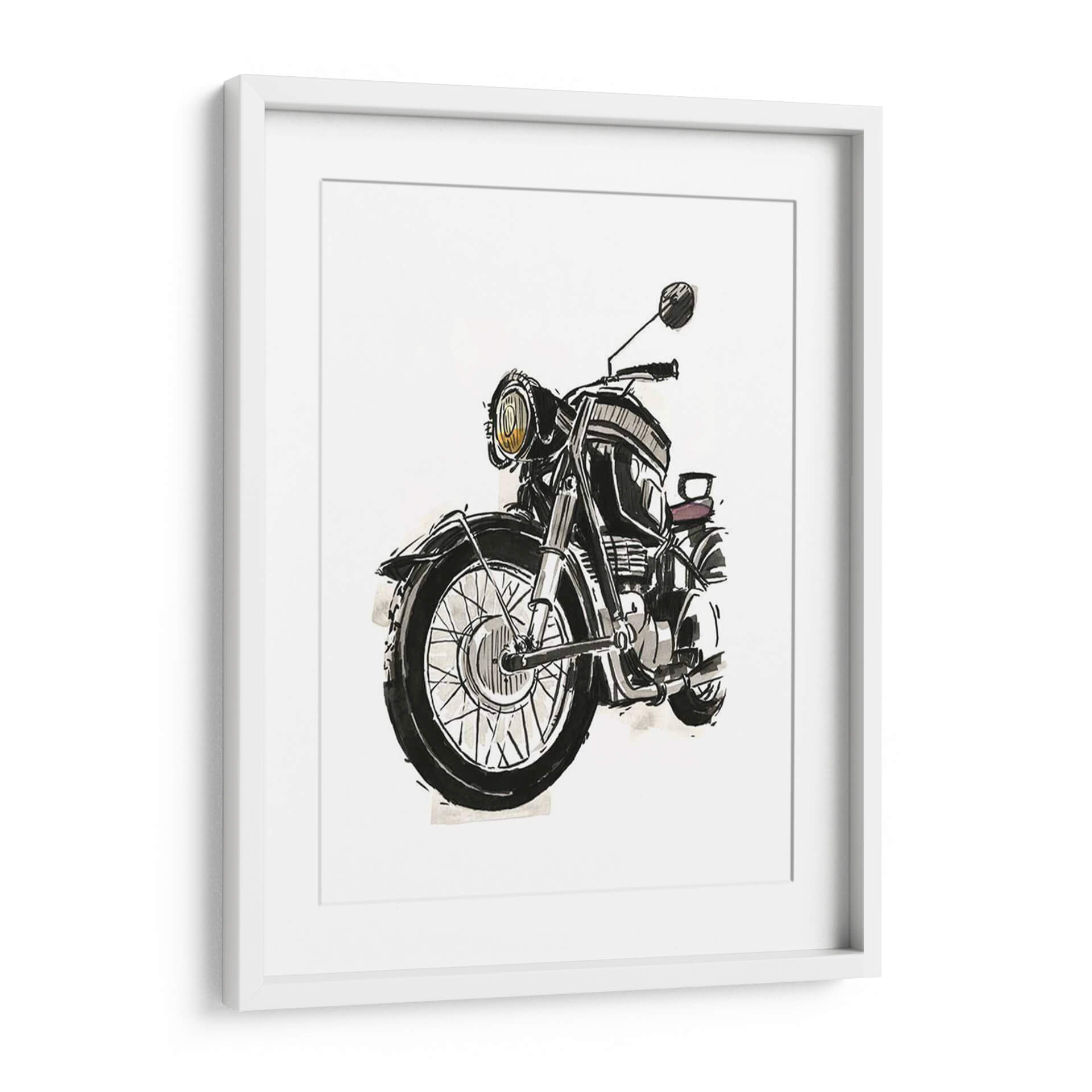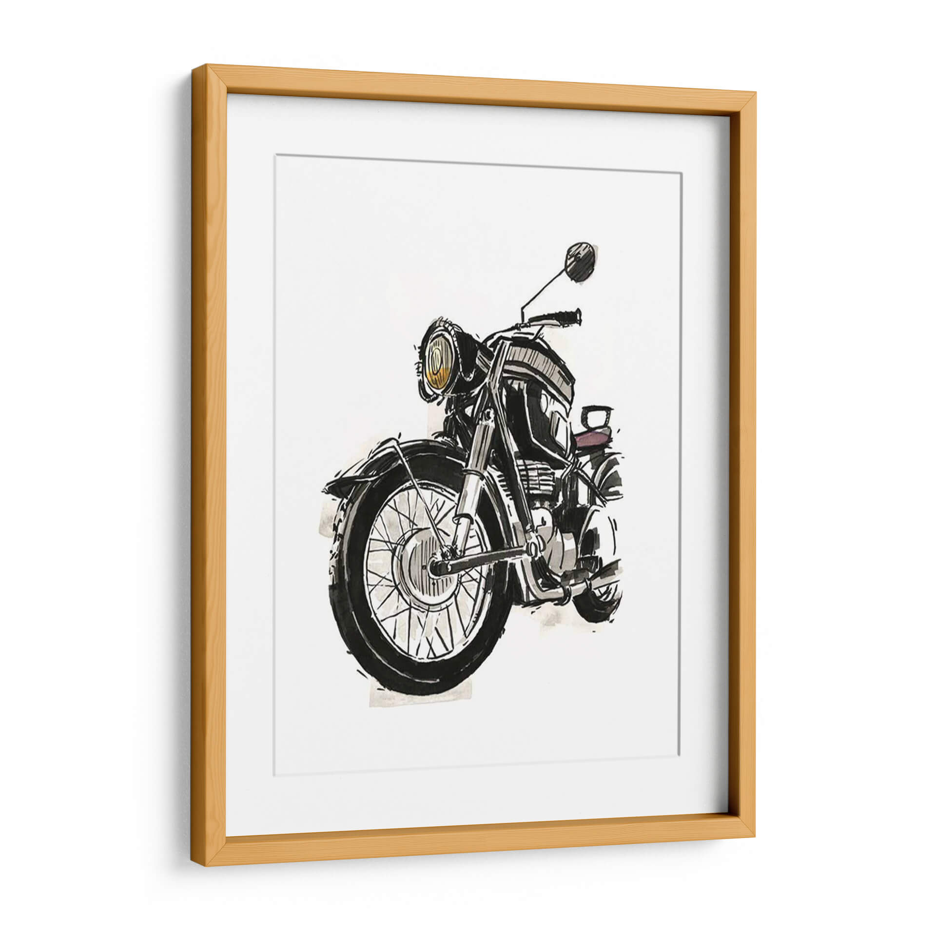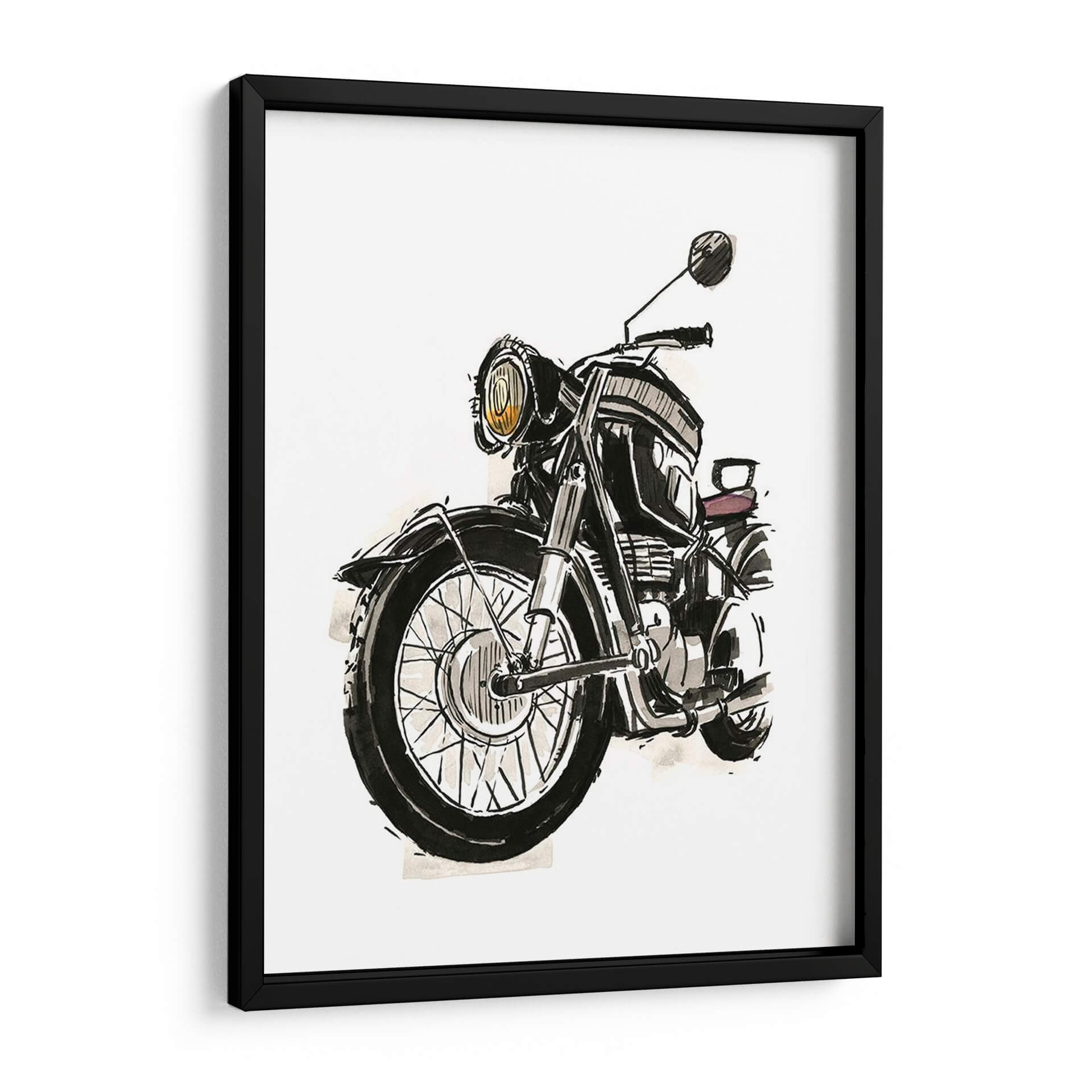 Este cautivador cuadro decorativo, titulado 'Motocicletas En Tinta IV' del artista Jacob Green, captura la esencia de la libertad y la aventura con un estilo de ilustración audaz y dinámico. La obra presenta una detallada representación de una motocicleta clásica, dibujada con trazos de tinta negros y grises que aportan profundidad y textura. Los sutiles toques de color, especialmente el cálido tono ámbar en el faro y un discreto acento rojizo en el asiento, añaden un punto focal y un matiz de calidez a la composición predominantemente monocromática. El fondo blanco o de muy bajo contraste permite que la motocicleta sea la protagonista indiscutible, creando una atmósfera de elegancia desenfadada y un espíritu retro que atraerá a los amantes de la velocidad y el diseño atemporal. Ideal para espacios masculinos, estudios, garajes convertidos o cualquier rincón que busque un toque de carácter y originalidad. Este cuadro es perfecto para añadir personalidad a una sala de estar moderna, un despacho o un dormitorio con un estilo industrial o vintage. Su impacto visual reside en la habilidad del artista para dar vida a la máquina, evocando sensaciones de potencia contenida y un viaje inminente. Una pieza que celebra la estética icónica de las motocicletas.