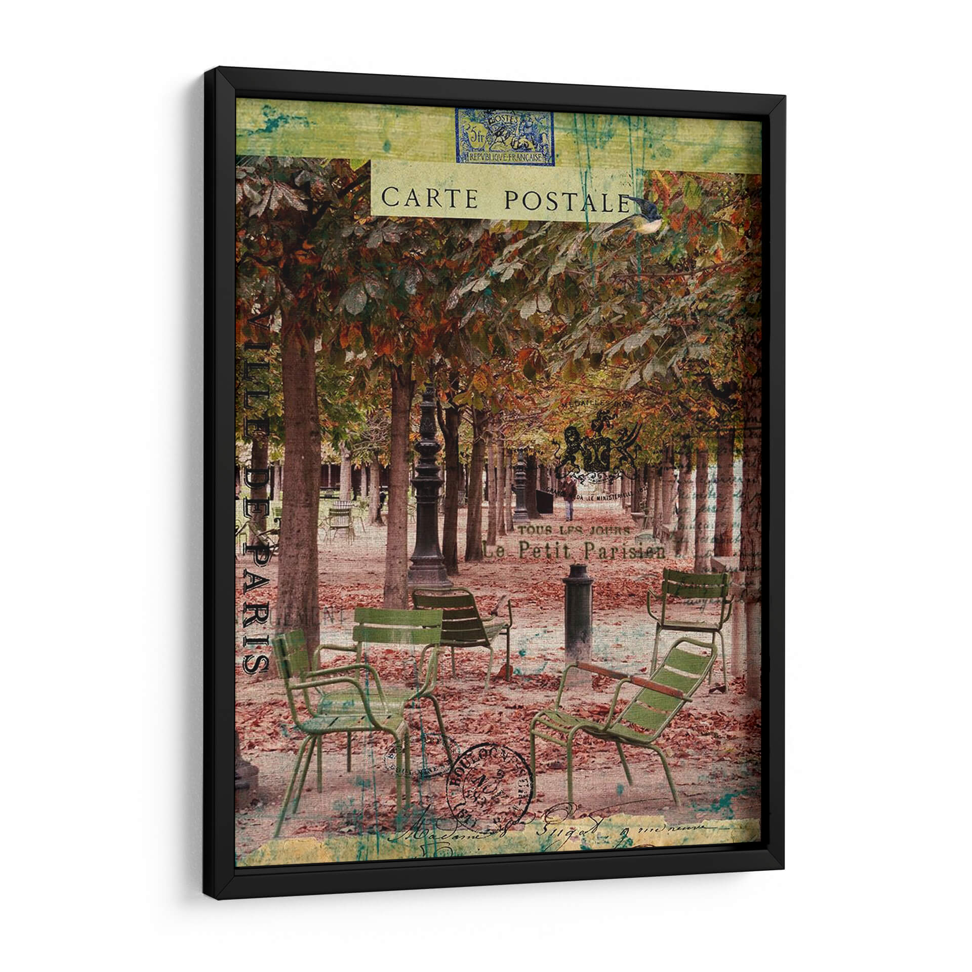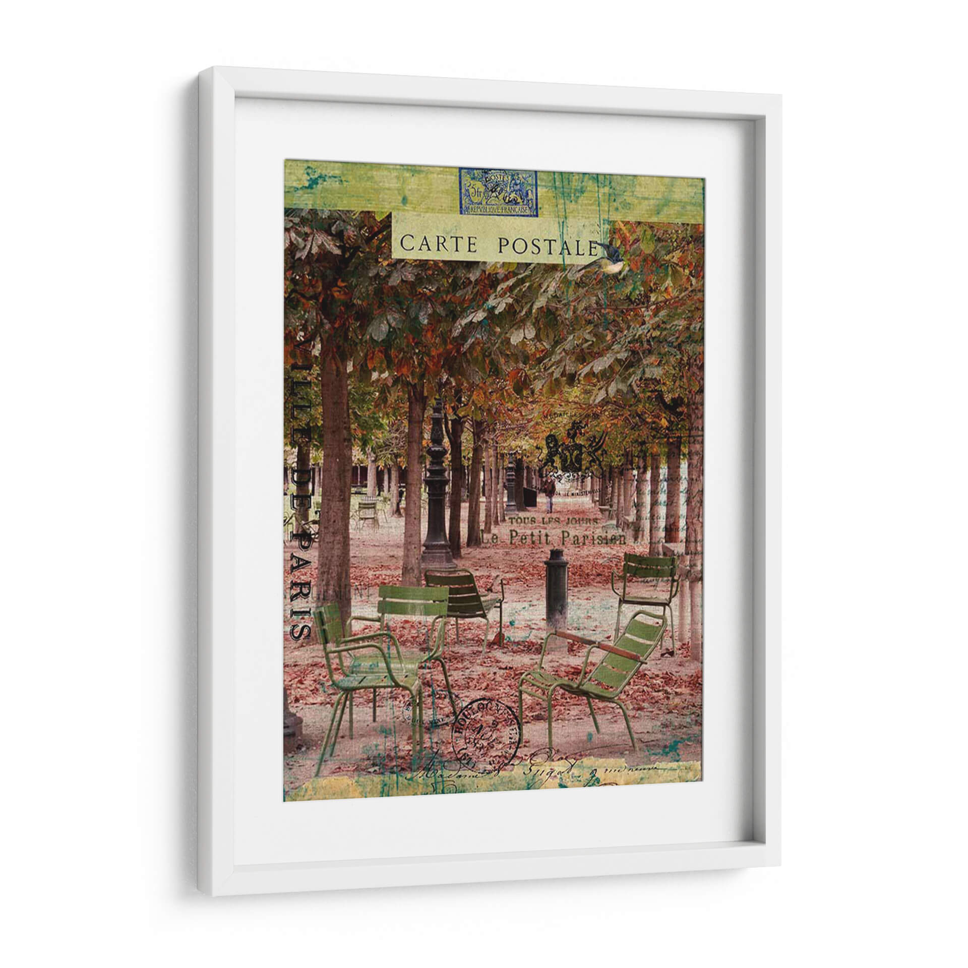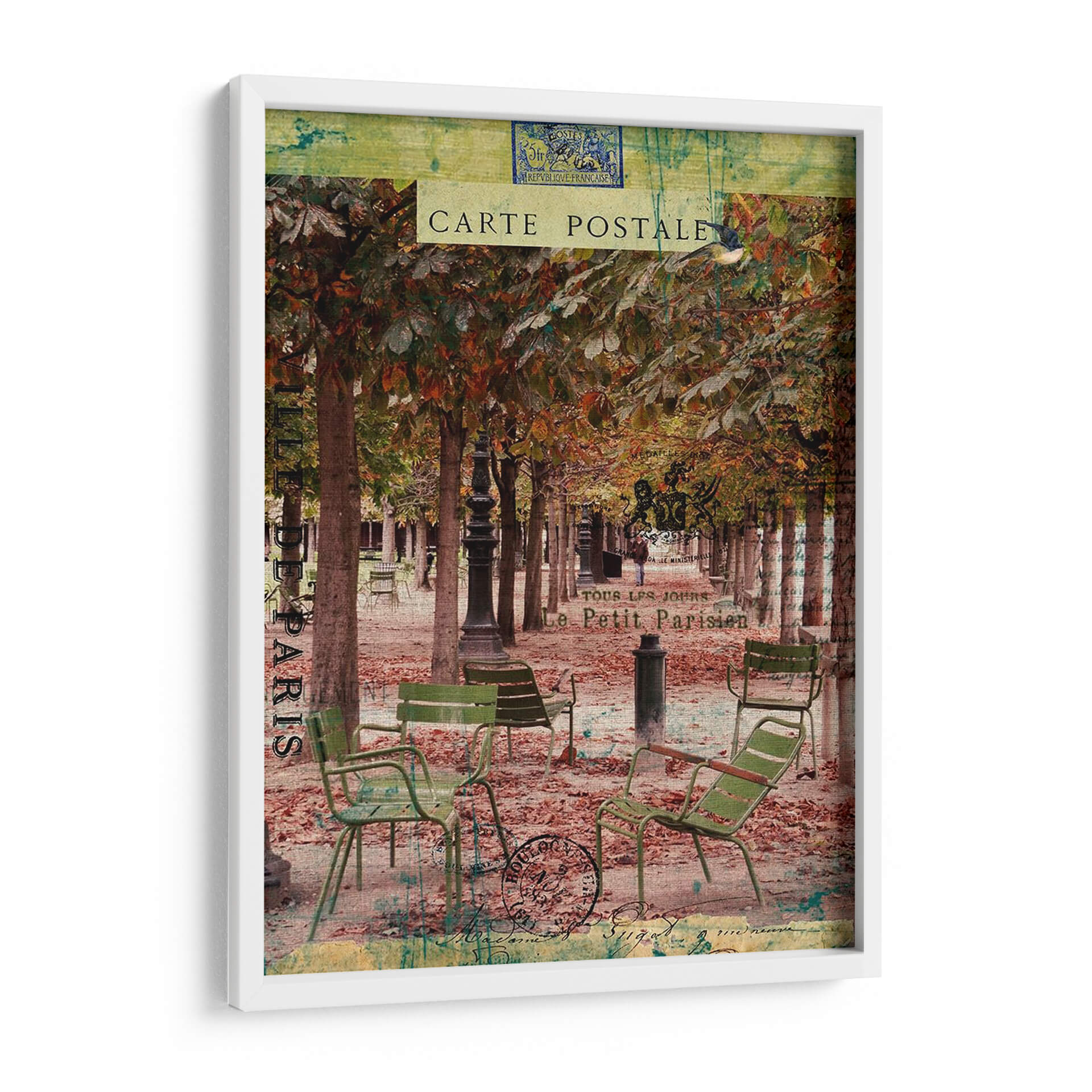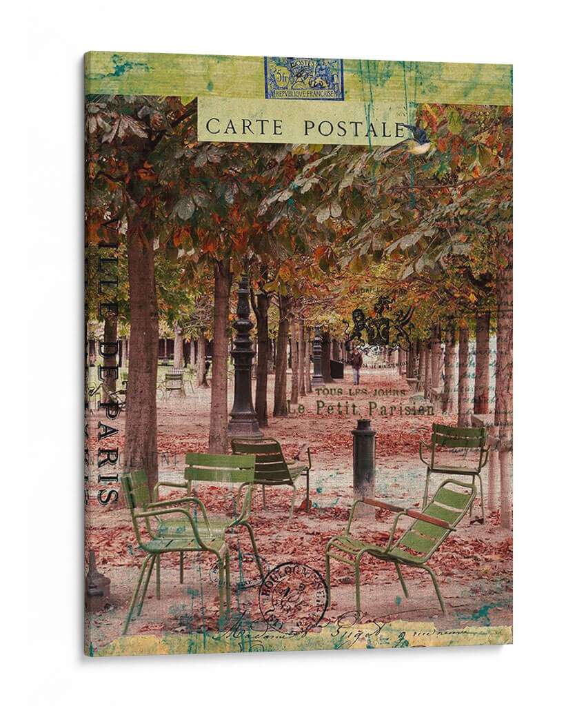 Sumérgete en la evocadora atmósfera de París con "Paris Bistro Iv", una obra de arte que captura la esencia de un café al aire libre en una tarde otoñal. La composición presenta una hilera de árboles con follaje en tonos ocres y dorados, creando un dosel natural sobre un camino cubierto de hojas caídas. Sillas de bistró verdes, desgastadas por el tiempo, invitan a la contemplación, sugiriendo momentos de pausa y conversación. La paleta de colores, rica en marrones, verdes apagados y toques de verde azulado, transmite una sensación de nostalgia y calidez. Elementos superpuestos como sellos postales y texto francés, reminiscentes de antiguas cartas, añaden una capa de textura y profundidad, transportándote a una época pasada. Este cuadro decorativo es perfecto para añadir un toque de sofisticación y encanto parisino a tu salón, comedor o incluso a un espacio de trabajo que busque inspiración y serenidad. "Paris Bistro Iv" no es solo una imagen, es una invitación a disfrutar de la vida con estilo.