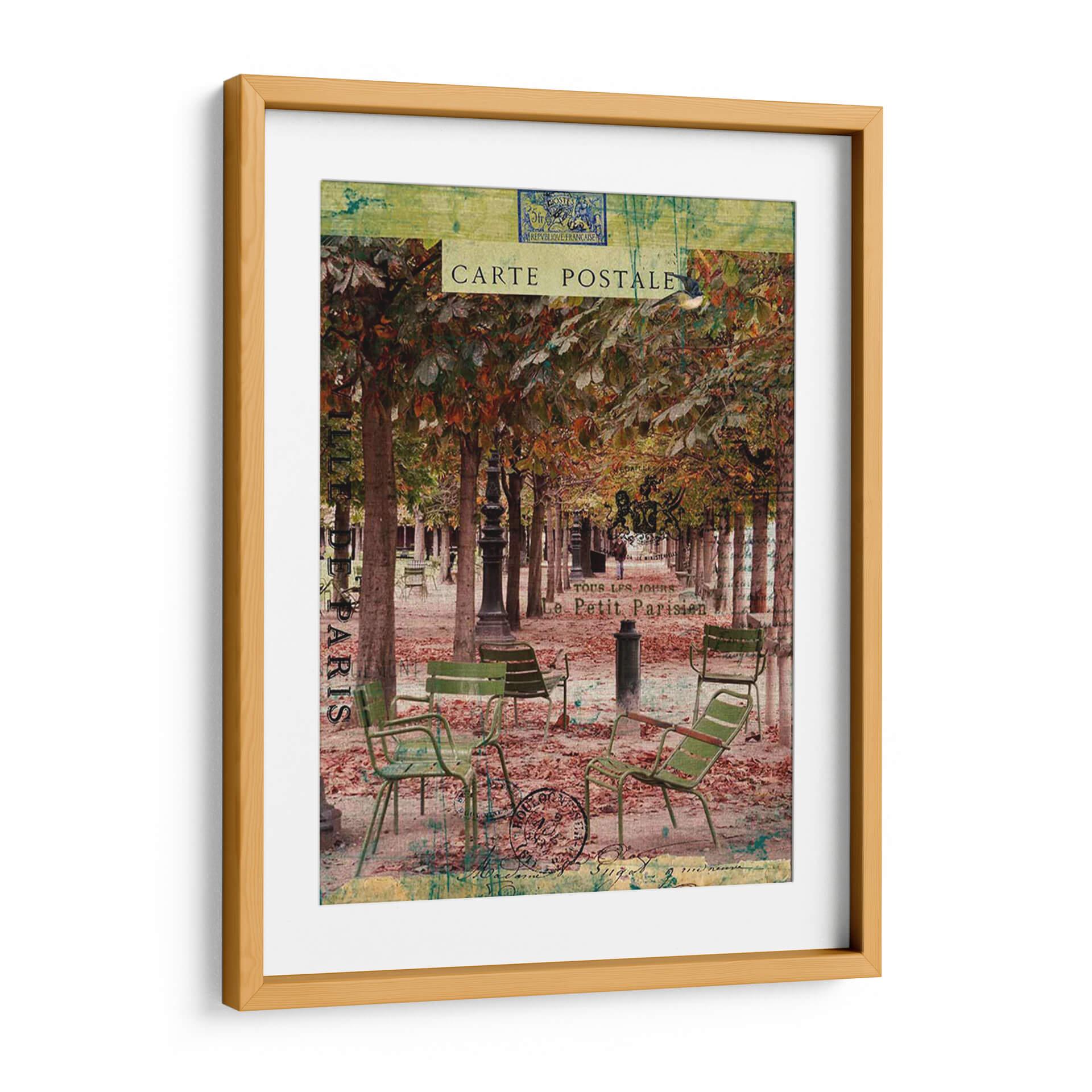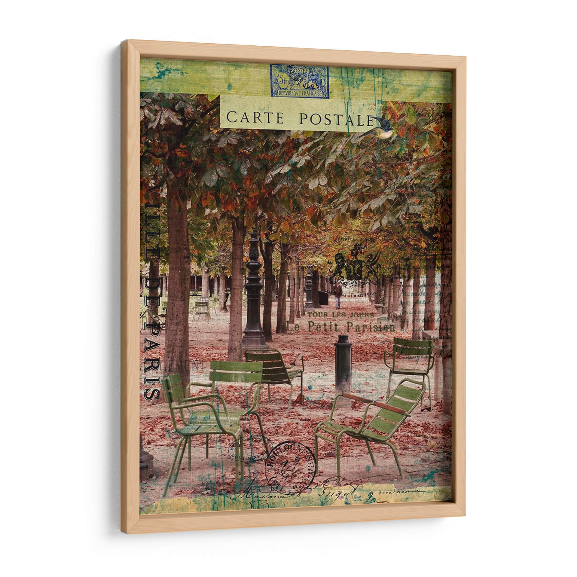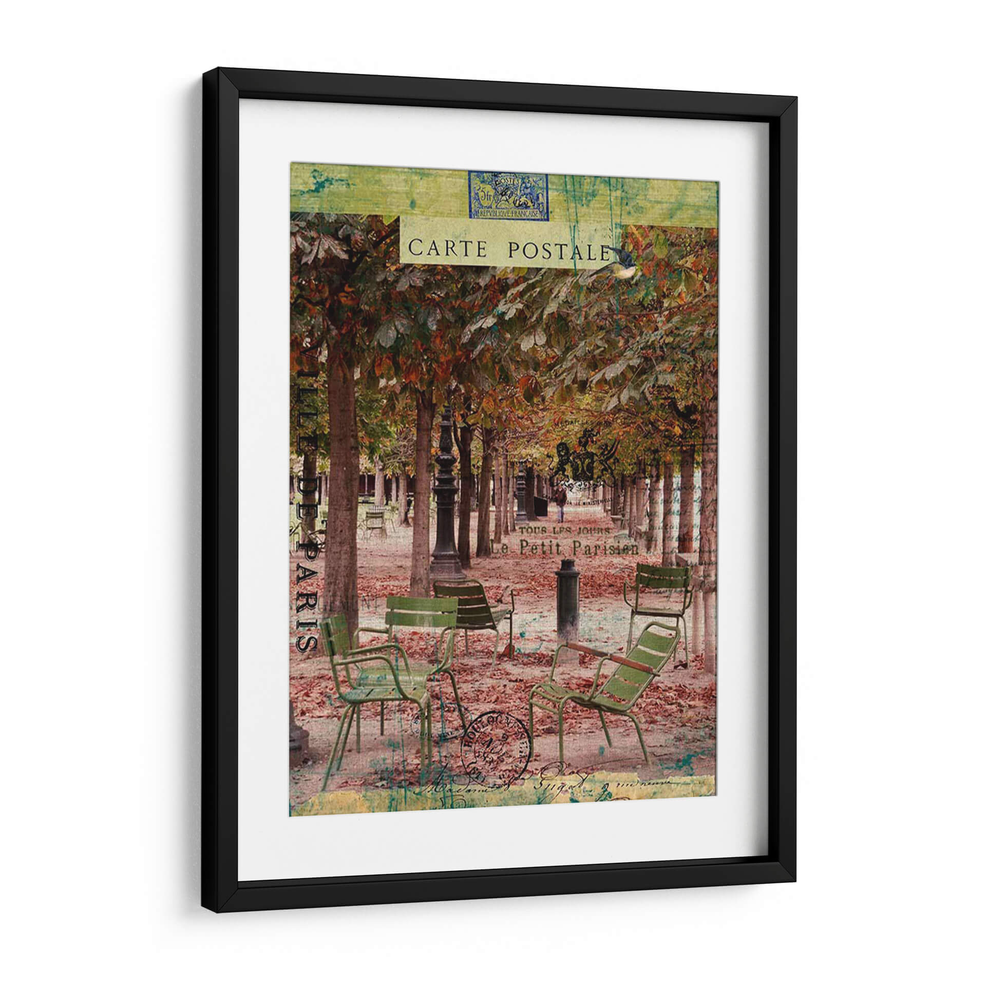 Sumérgete en la evocadora atmósfera de París con "Paris Bistro Iv", una obra de arte que captura la esencia de un café al aire libre en una tarde otoñal. La composición presenta una hilera de árboles con follaje en tonos ocres y dorados, creando un dosel natural sobre un camino cubierto de hojas caídas. Sillas de bistró verdes, desgastadas por el tiempo, invitan a la contemplación, sugiriendo momentos de pausa y conversación. La paleta de colores, rica en marrones, verdes apagados y toques de verde azulado, transmite una sensación de nostalgia y calidez. Elementos superpuestos como sellos postales y texto francés, reminiscentes de antiguas cartas, añaden una capa de textura y profundidad, transportándote a una época pasada. Este cuadro decorativo es perfecto para añadir un toque de sofisticación y encanto parisino a tu salón, comedor o incluso a un espacio de trabajo que busque inspiración y serenidad. "Paris Bistro Iv" no es solo una imagen, es una invitación a disfrutar de la vida con estilo.