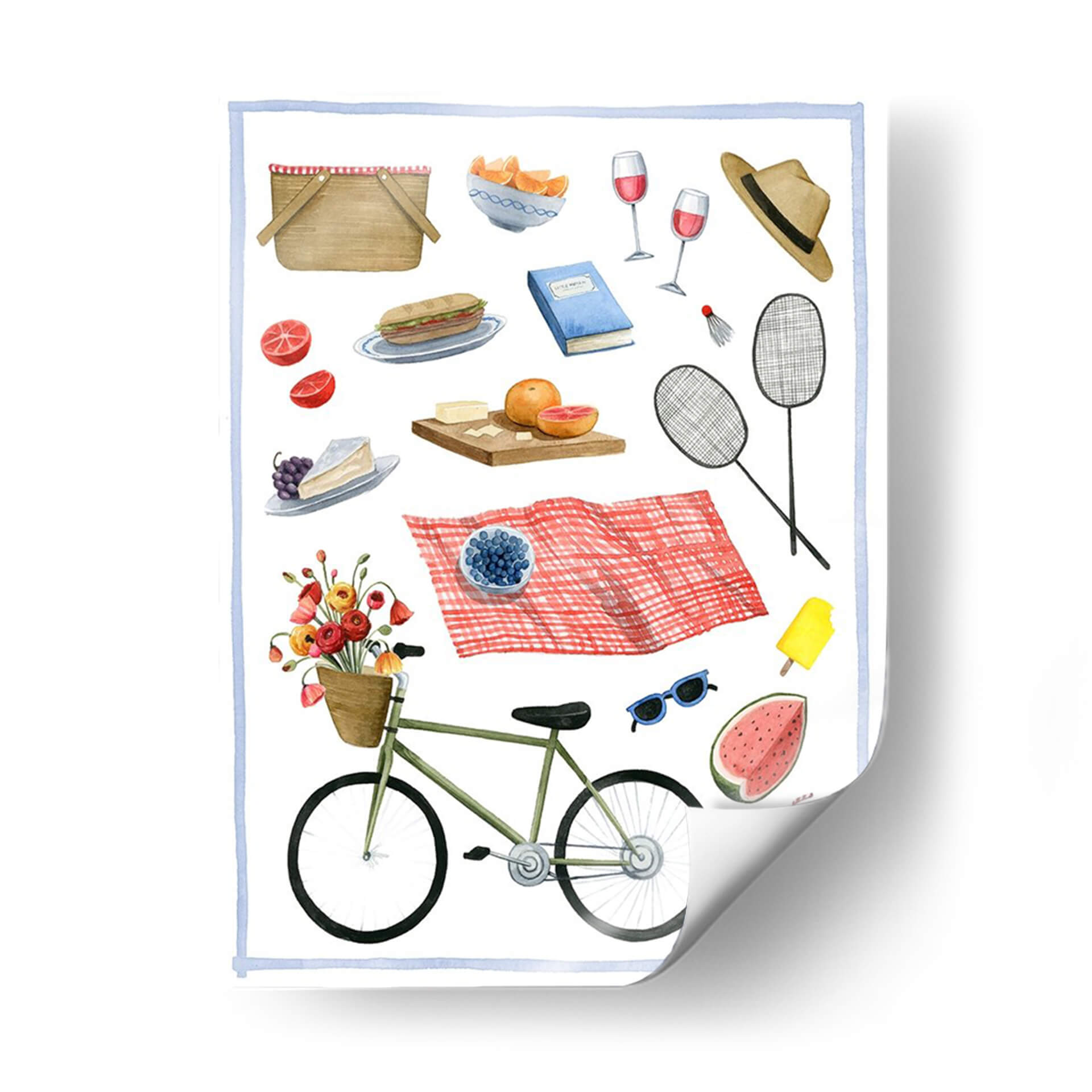 Captura la esencia del verano y la alegría de un día perfecto con "Parque Picnic I" de Grace Popp. Esta encantadora obra de arte digital presenta una escena vibrante y detallada de un picnic idílico. Observa la bicicleta vintage con un canasto rebosante de flores coloridas, lista para llevarte a un día de relax. Los elementos clásicos de picnic, como una cesta de mimbre, un delicioso sándwich, quesos, frutas frescas como naranjas y pomelos, y un bol de arándanos, evocan una sensación de sencillez y disfrute. El mantel a cuadros rojos y blancos, junto a unas copas de vino tinto, un libro y un sombrero, completan la escena, invitando a la contemplación y al deleite. La paleta de colores cálidos y alegres, junto con el estilo ilustrativo y juguetón, infunde una atmósfera de optimismo y despreocupación. Este cuadro decorativo es perfecto para añadir un toque de frescura y vitalidad a cualquier espacio, desde la sala de estar hasta un comedor o incluso una cocina. "Parque Picnic I" es más que una simple decoración; es una invitación a crear tus propios momentos de felicidad y a revivir la magia de un día soleado.