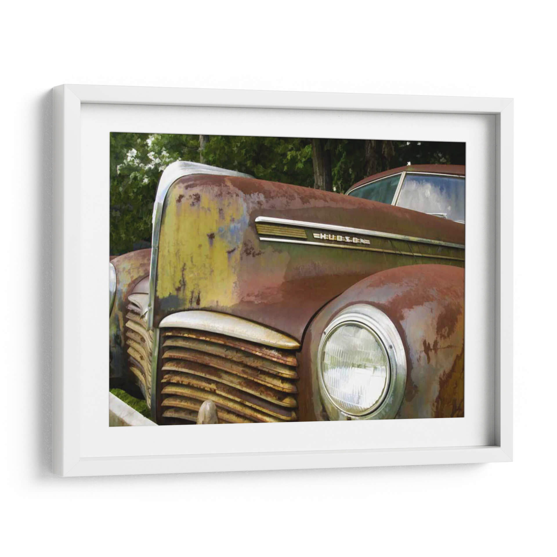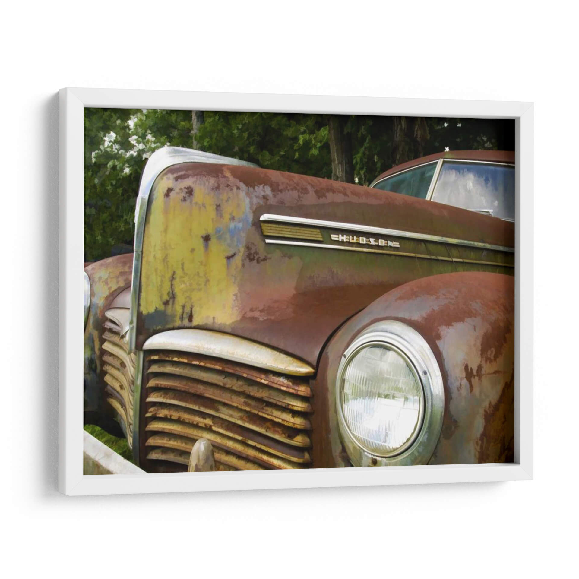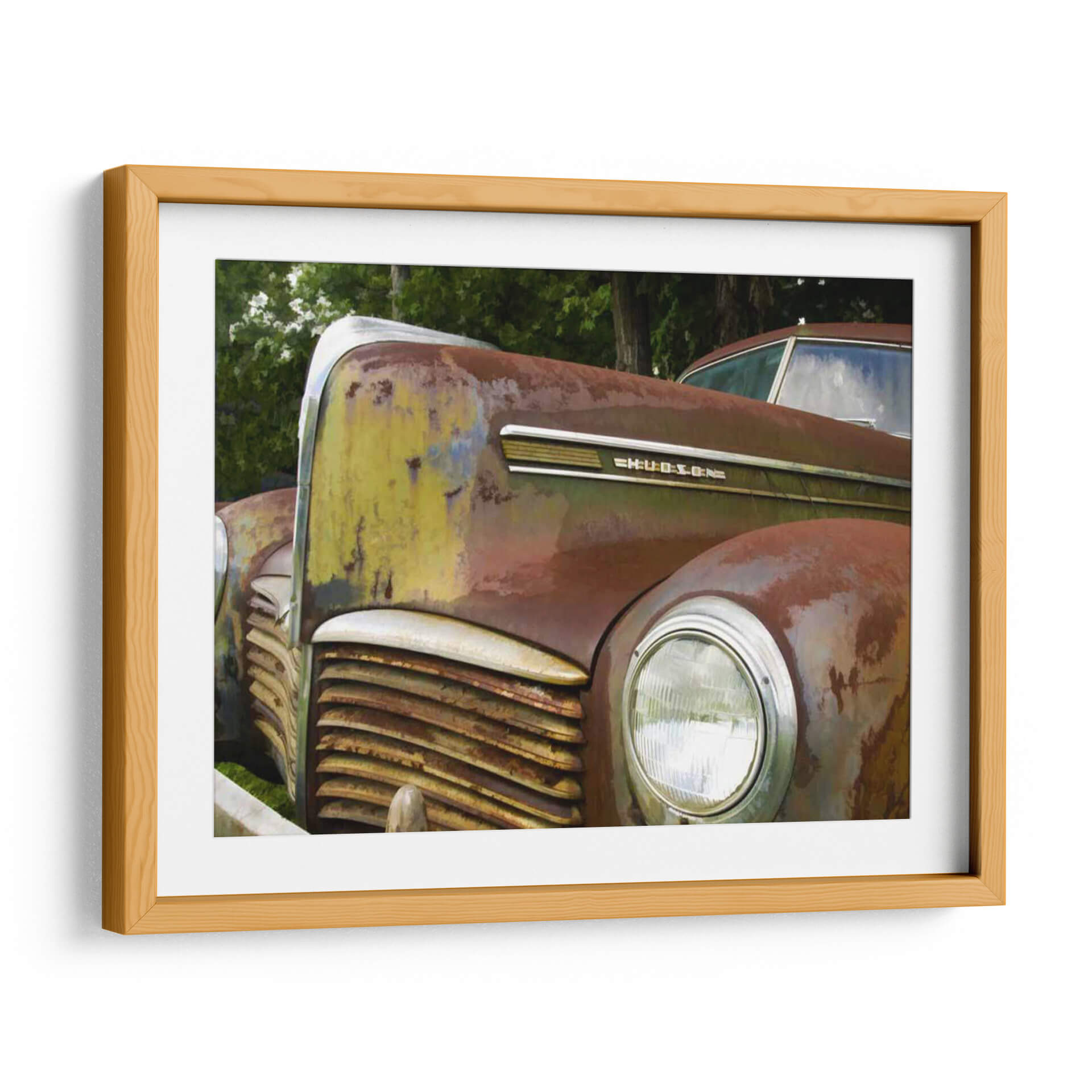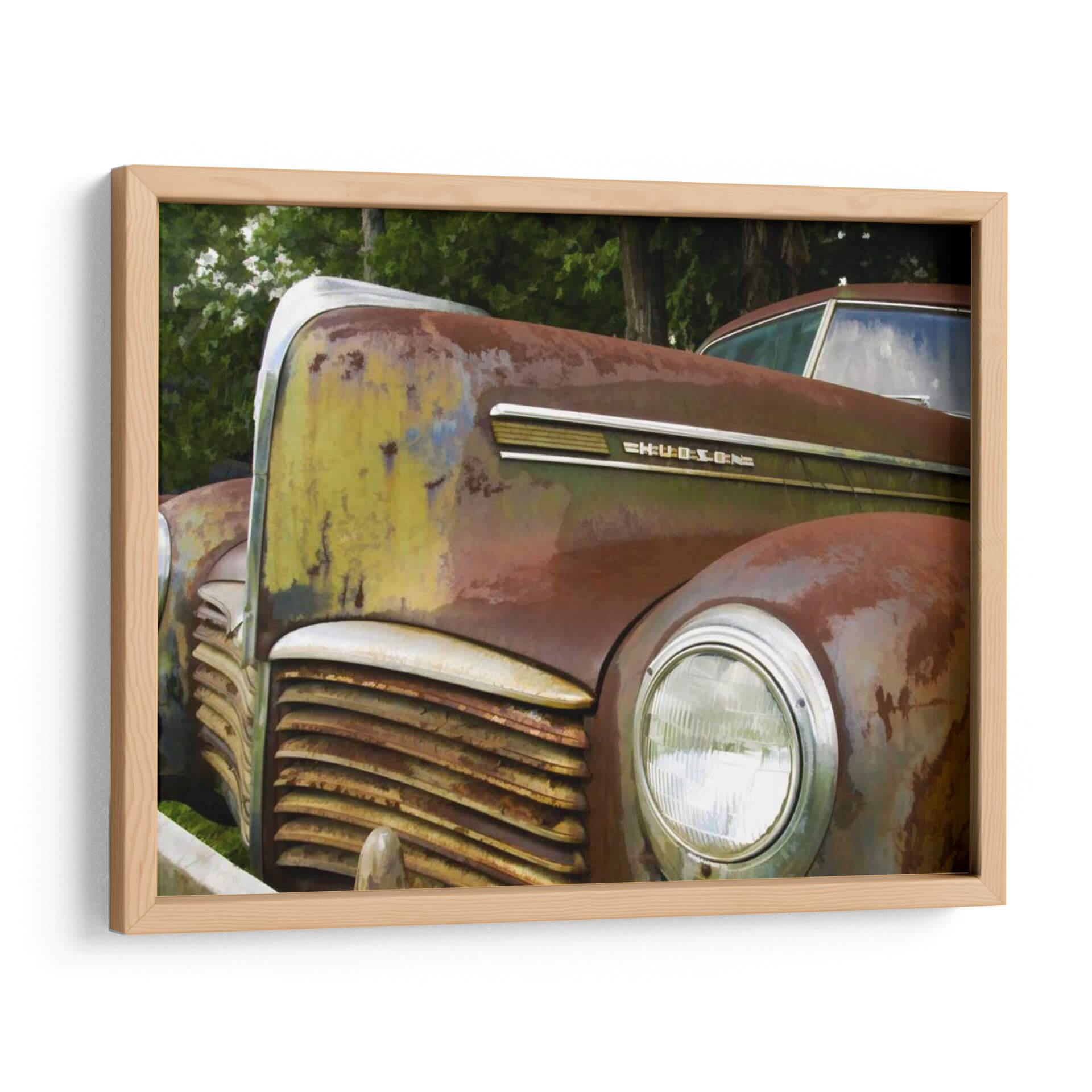 Sumérgete en la nostalgia y el encanto industrial con "Pequeño Oxidado Hudson II" de Danny Head. Esta obra de arte captura la esencia de un clásico automóvil Hudson, mostrando la belleza del paso del tiempo a través de su carrocería oxidada y texturizada. Los tonos cálidos del óxido, el amarillo desgastado y los sutiles toques de verde del follaje de fondo crean una paleta de colores rica y evocadora. La composición detallada, centrada en el distintivo frontal del vehículo, resalta las líneas icónicas y el emblema "Hudson", invitando a una contemplación profunda. Ideal para amantes de los coches vintage, entusiastas de la estética industrial o para quienes buscan añadir un toque de carácter y una historia visual a sus espacios. Este cuadro decorativo es perfecto para salas de estar, estudios o garajes, aportando una atmósfera de autenticidad y un estilo retro inconfundible. Descubre la armonía entre lo antiguo y lo moderno con esta pieza única que celebra la durabilidad y el diseño atemporal.