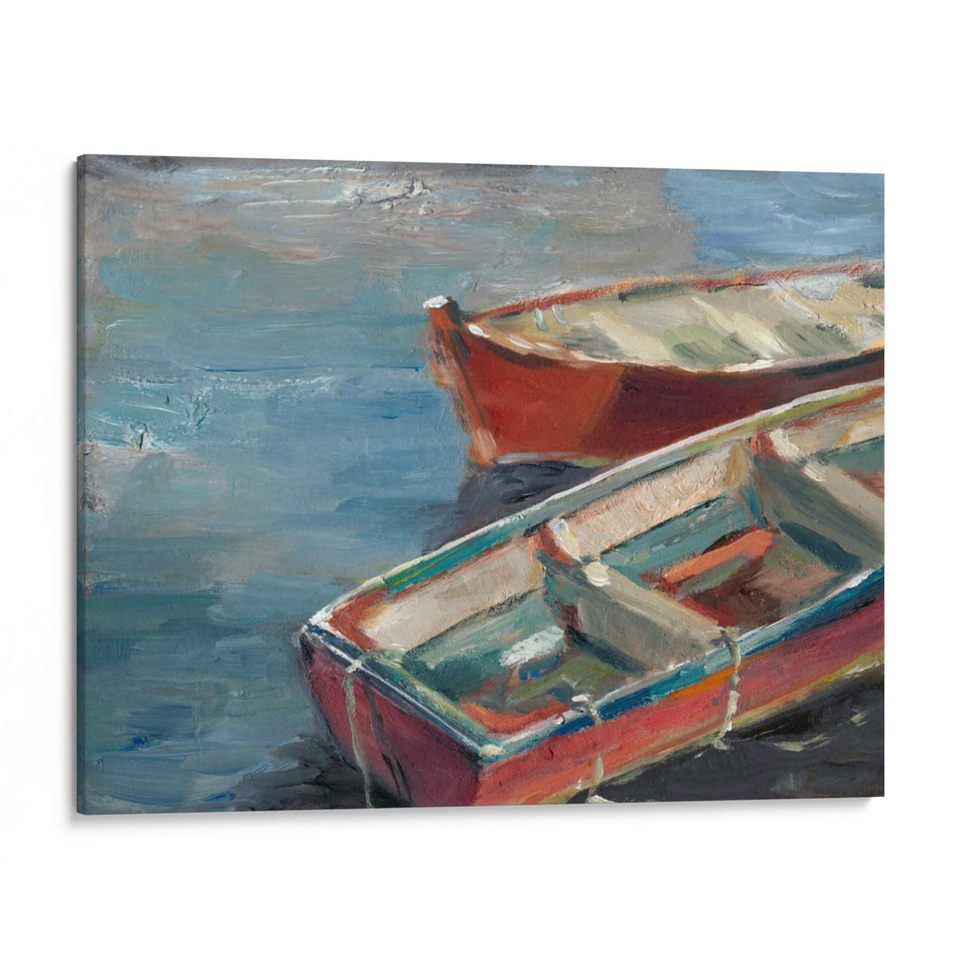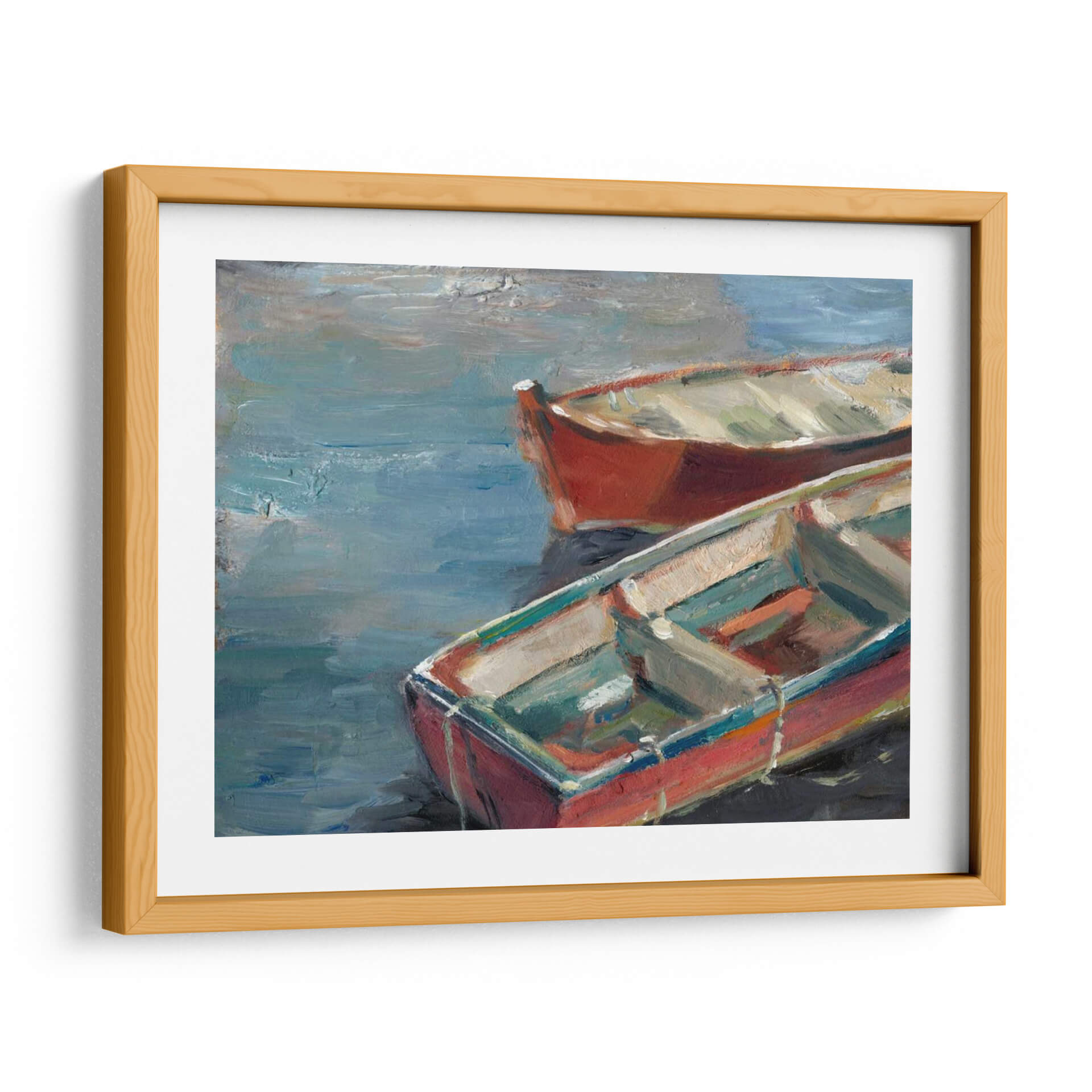 Sumérgete en la serena belleza de "Por El Lago I", una cautivadora obra de arte de Ethan Harper que captura la tranquilidad de un día junto al agua. Este cuadro decorativo presenta dos barcas ancladas, pintadas en vibrantes tonos rojos y con detalles en verde y ocre, que descansan pacíficamente sobre un reflejo acuático de azules y grises profundos. La pincelada suelta y expresiva del artista aporta una cualidad impresionista a la escena, invitando al espectador a sentir la brisa suave y la calma del entorno. Los colores, aunque audaces en las embarcaciones, se fusionan armoniosamente con el agua, creando una atmósfera de paz y contemplación. Es una pieza ideal para añadir un toque de color y sosiego a cualquier sala de estar, estudio u oficina, transformando el espacio en un oasis de tranquilidad. "Por El Lago I" no es solo una decoración, sino una invitación a la reflexión y al disfrute de los momentos sencillos de la vida. Su estilo pictórico y su temática evocadora la convierten en una adición versátil y atemporal a cualquier colección de arte contemporáneo, perfecta para quienes buscan inspiración marina o simplemente una pieza que aporte serenidad.