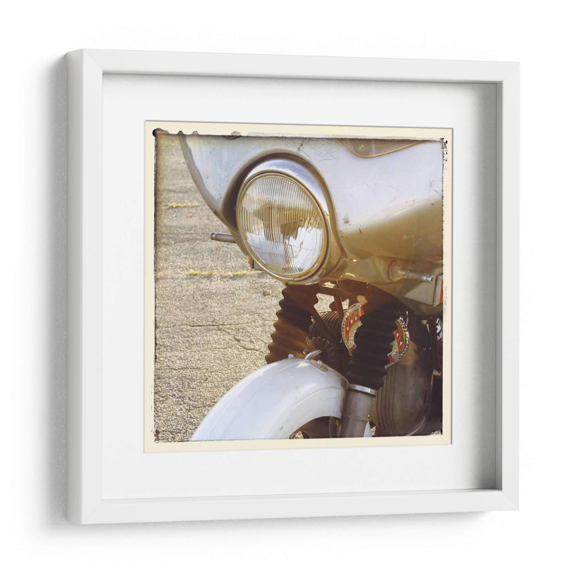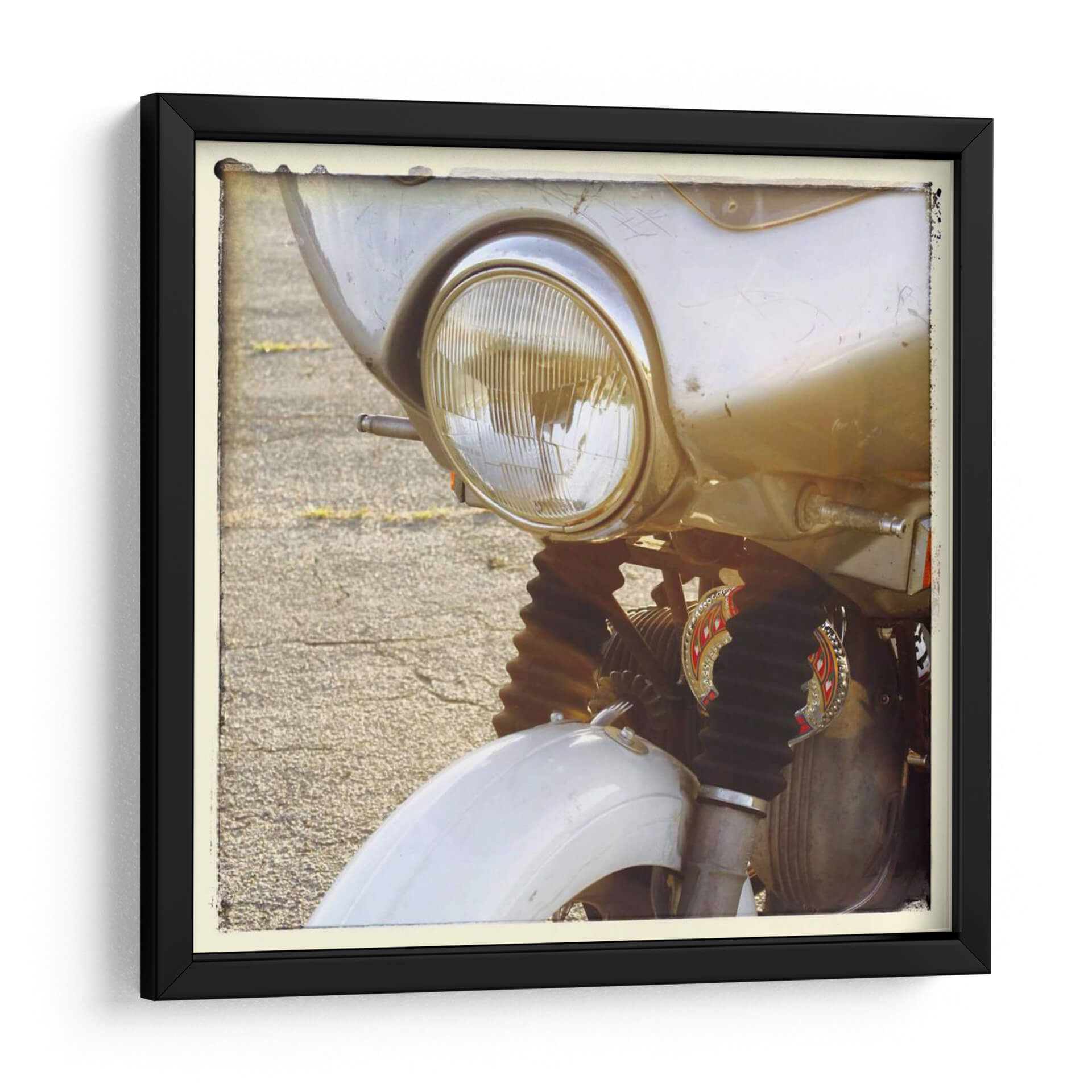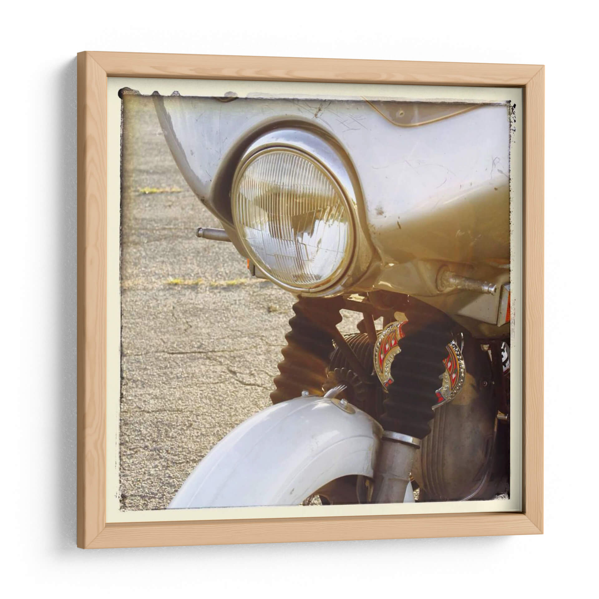 Captura la esencia de la nostalgia y la potencia con "Puesta Del Atardecer Ii", una obra de arte que rinde homenaje a la icónica ingeniería de motocicletas. Este cuadro decorativo se centra en los detalles intrincados de una motocicleta clásica, destacando el faro brillante, el guardabarros blanco pulido y los resortes de suspensión texturizados. La paleta de colores, dominada por tonos metálicos, blancos cremosos y acentos de rojo y dorado en los emblemas, evoca una sensación de atemporalidad y elegancia vintage. La composición fotográfica, que se adentra en un primer plano detallado, invita a la contemplación de la artesanía y el diseño que definieron una era. Ideal para los entusiastas de las motocicletas, los amantes de lo retro o cualquiera que busque añadir un toque de carácter y sofisticación a su hogar u oficina. Este cuadro decorativo es una pieza que habla de aventura, libertad y un aprecio por la maquinaria bien hecha, convirtiéndose en un punto focal cautivador en cualquier espacio moderno o de inspiración industrial.