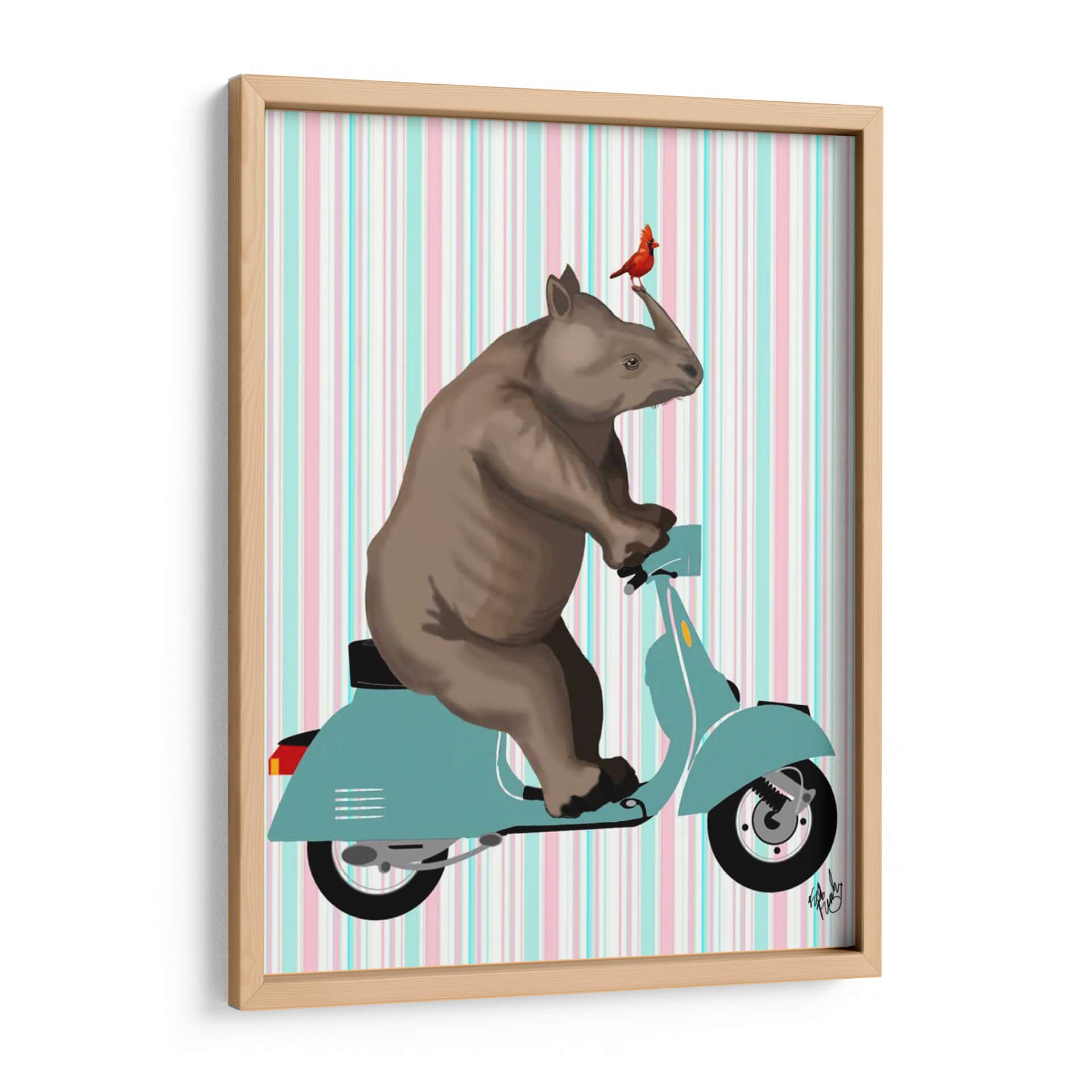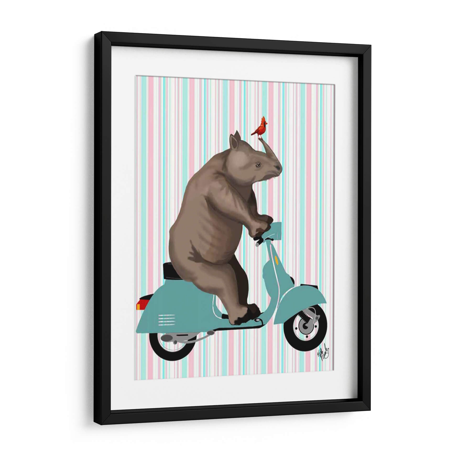 Embárcate en un viaje imaginativo con "Rinoceronte en Ciclomotor", una obra de arte digital vibrante y caprichosa del artista Fab Funky. Esta pieza llamativa presenta a un rinoceronte con un estilo caricaturesco, montando con destreza un ciclomotor de color turquesa. Un pequeño pájaro rojo, posado con audacia en el cuerno del rinoceronte, añade un toque de color inesperado y encanto. El fondo, adornado con rayas verticales en tonos pastel de rosa, azul y blanco, crea una atmósfera juguetona y ligera que contrasta maravillosamente con la solidez del animal. El estilo gráfico y la paleta de colores pastel hacen de este cuadro decorativo una elección perfecta para espacios que buscan un toque de originalidad y alegría. Ideal para una sala de estar moderna, una oficina creativa o una habitación infantil con personalidad, este cuadro decorativo es una invitación a la diversión y la aventura. Su composición equilibrada y sus personajes singulares aseguran que se convierta en un punto focal que inspire conversaciones y sonrisas. Añade un toque de surrealismo amigable a tu decoración con esta pieza única de arte contemporáneo.