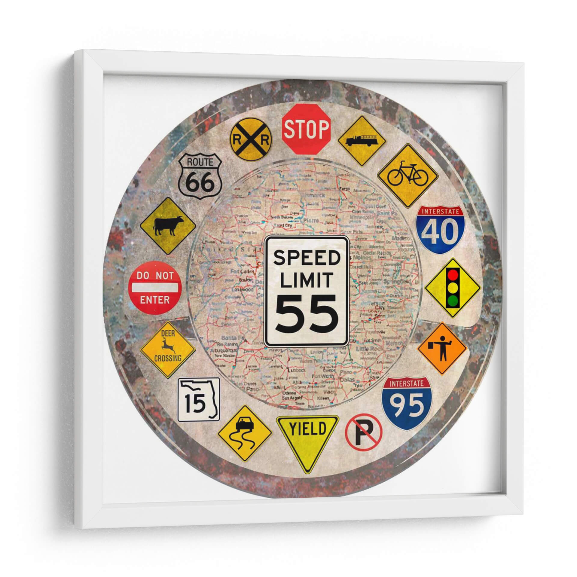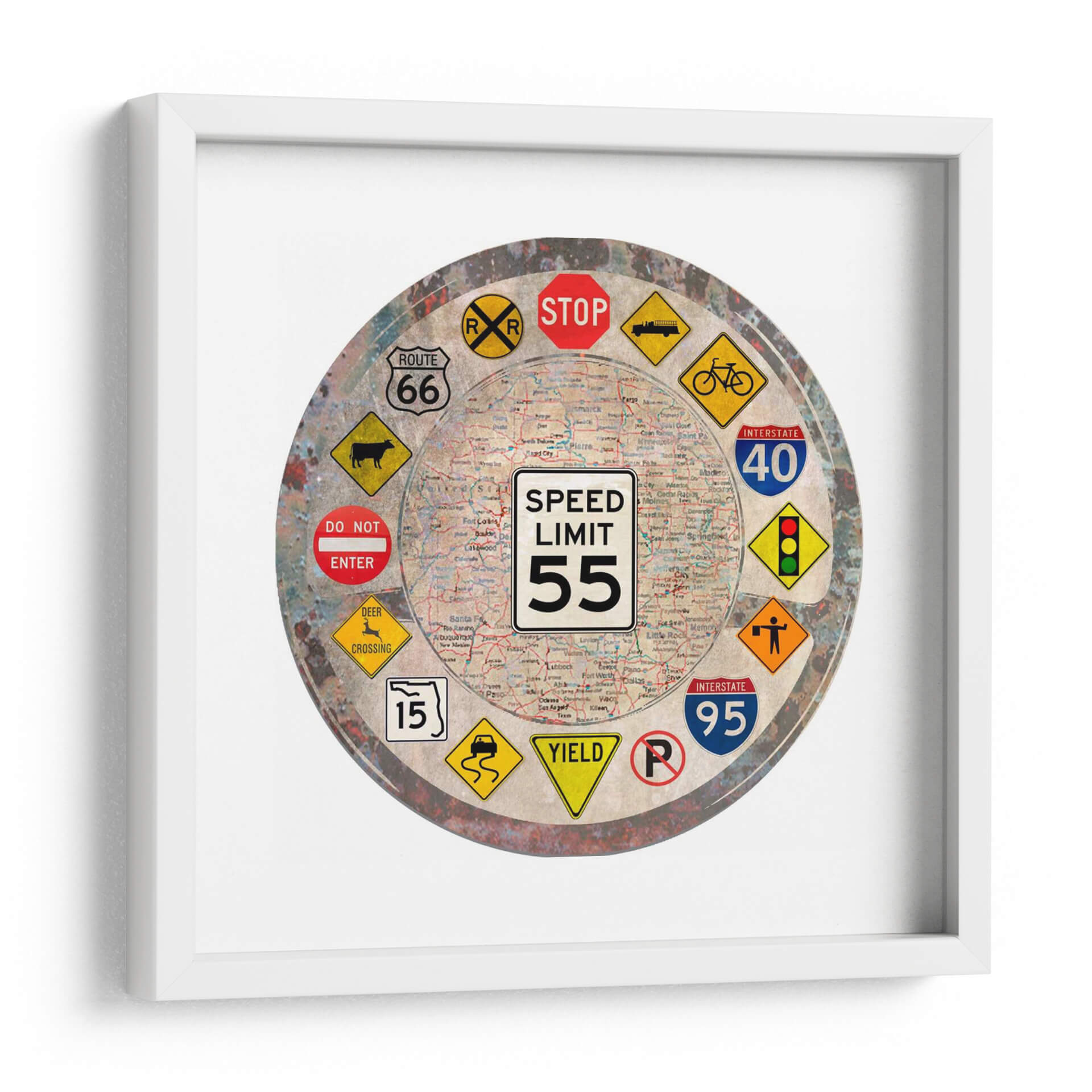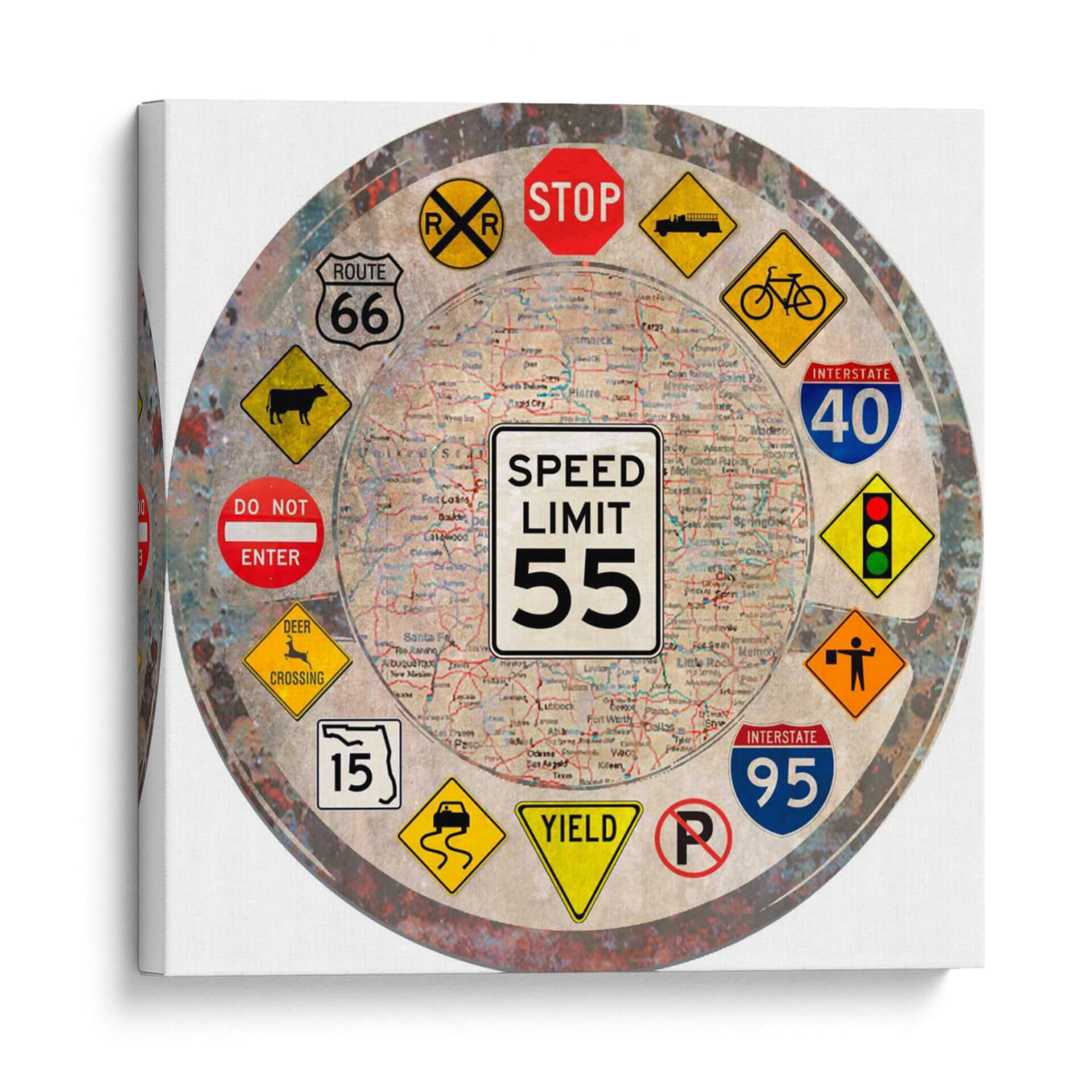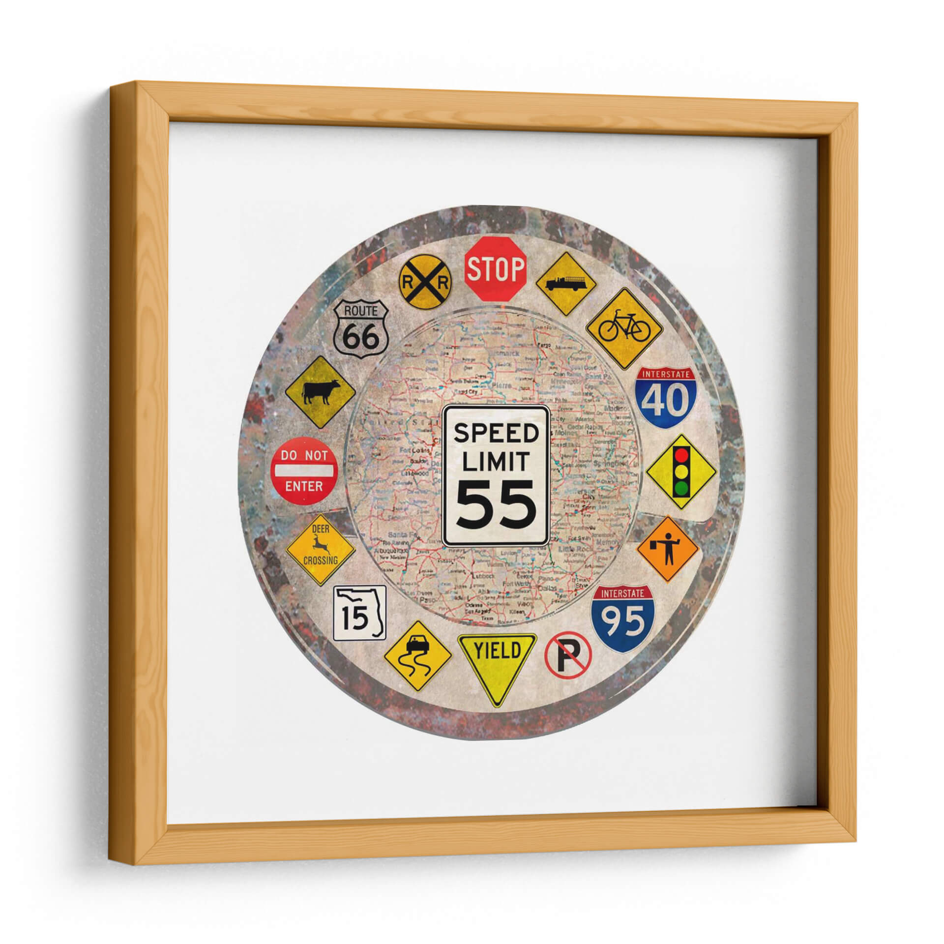 Sumérgete en la nostalgia y la aventura del camino con "Signo De Garaje Vi" de Studio W. Esta obra de arte es un collage vibrante y dinámico que captura la esencia de la cultura automovilística y las carreteras de Estados Unidos. La composición circular presenta una amalgama de icónicos señales de tráfico, desde el clásico "STOP" y "SPEED LIMIT 55" hasta advertencias como "DEER CROSSING" y "YIELD", entrelazadas con un mapa de Estados Unidos que evoca viajes y exploración. Los colores, aunque dominados por los amarillos, rojos y azules de las señales, se combinan con un fondo texturizado que añade profundidad y carácter, creando una pieza visualmente atractiva que estimula la imaginación. Es el cuadro decorativo perfecto para aquellos que aman los viajes por carretera, la historia de las rutas icónicas como la Route 66, o simplemente aprecian un diseño audaz y gráfico. Ideal para espacios masculinos, garajes, oficinas temáticas o como un punto focal de conversación en una sala de estar moderna, este cuadro decorativo de pared aporta un aire de retro y aventura a cualquier ambiente, invitando a soñar con horizontes lejanos y libertad en la carretera. Transforma tu espacio con esta pieza única que celebra el espíritu del viaje.