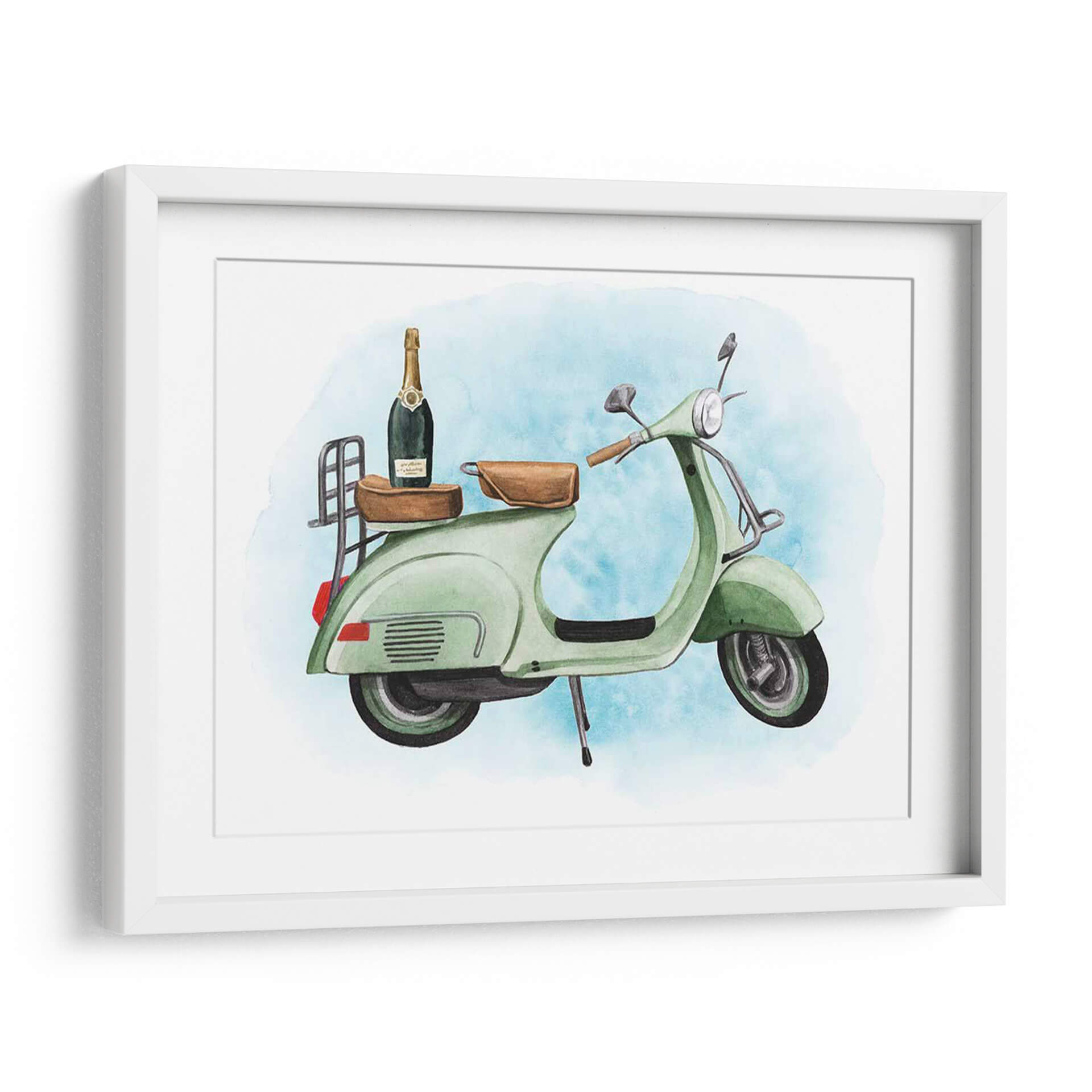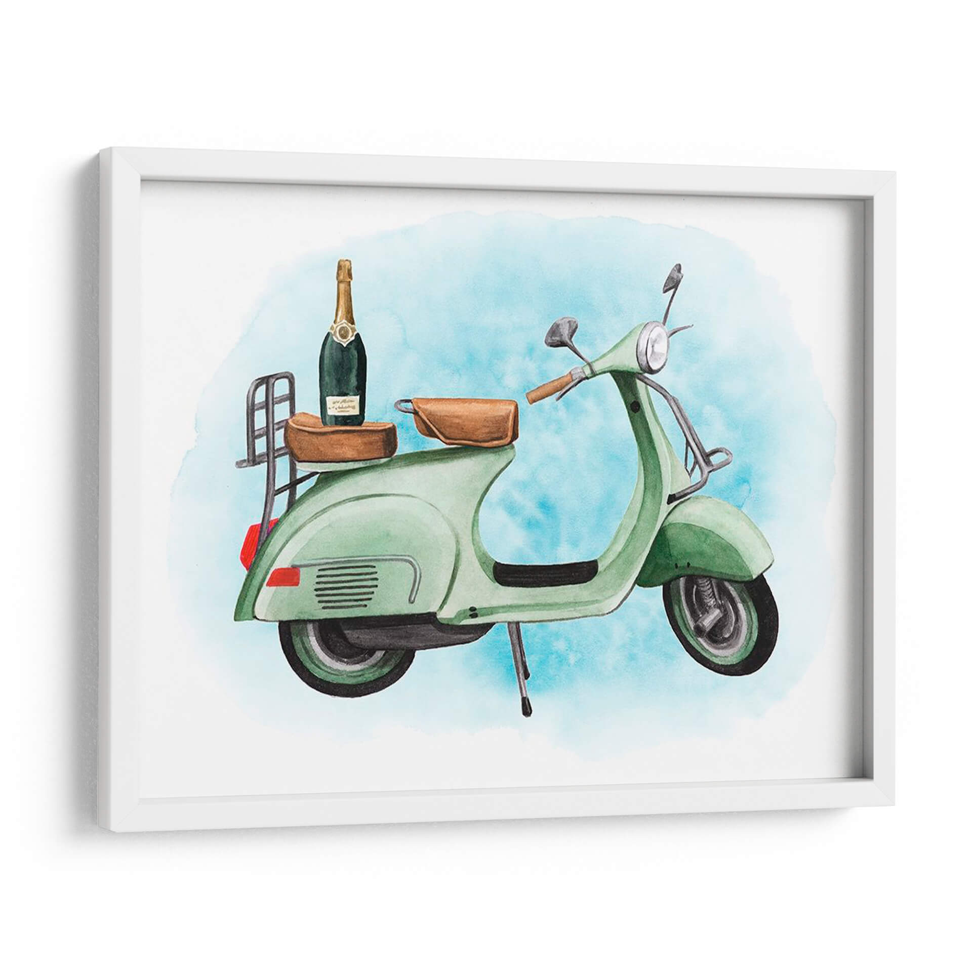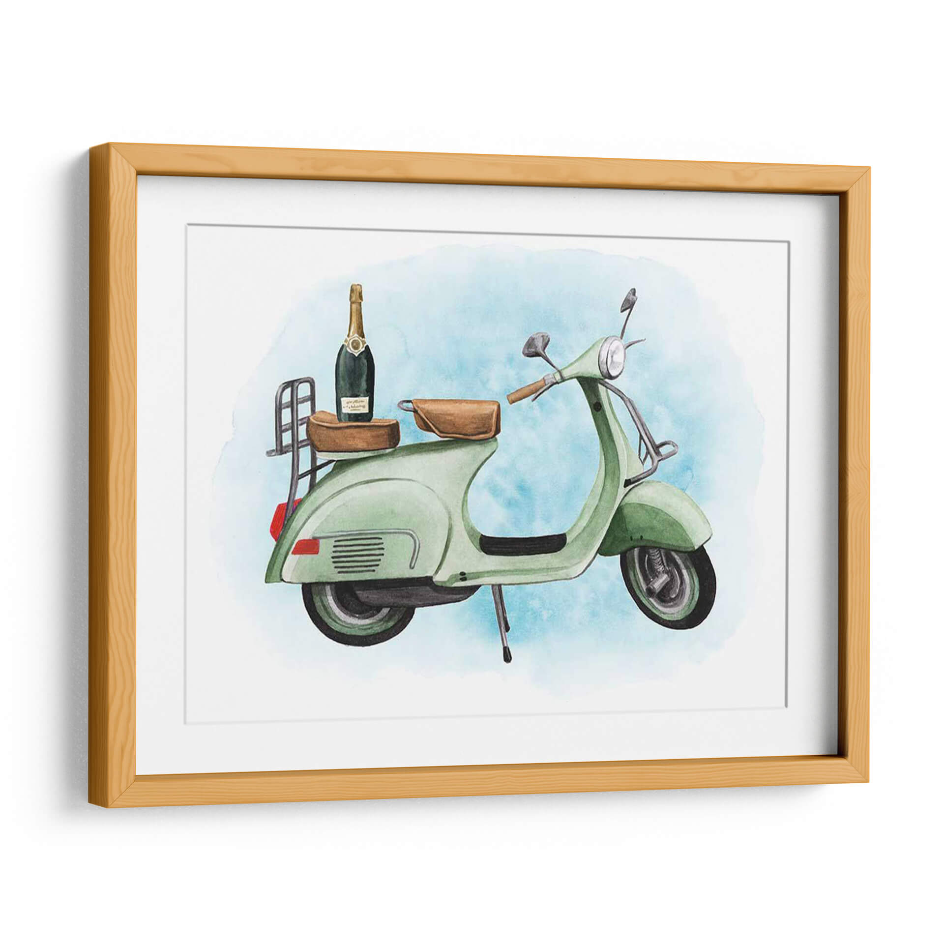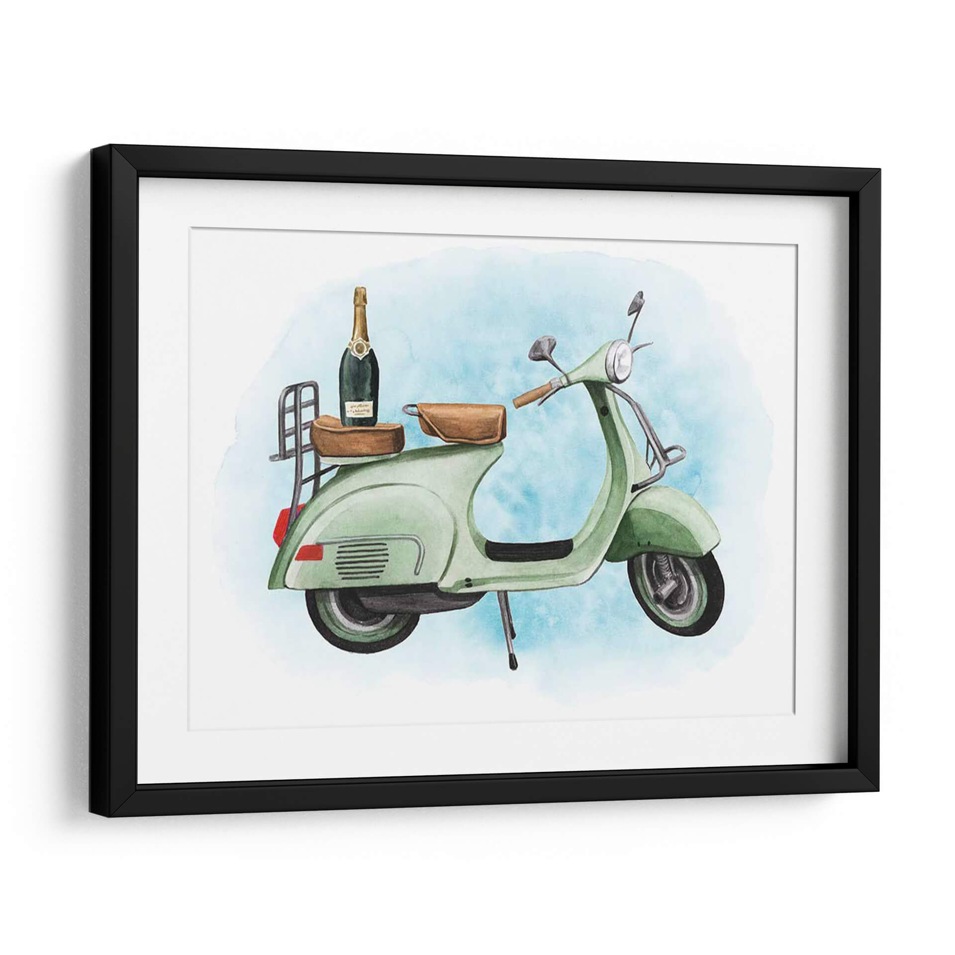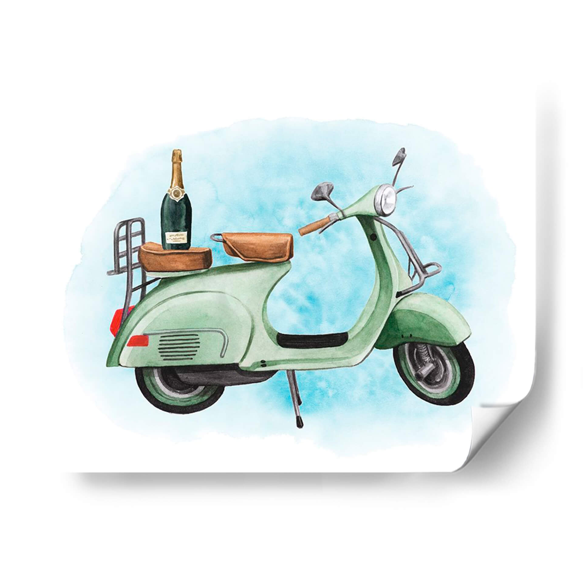 Embárquese en un viaje visual con 'Venice Voyage I', una cautivadora obra de arte que evoca la esencia de una escapada italiana. Esta pieza presenta una encantadora Vespa verde menta, un símbolo icónico de la Dolce Vita, adornada con una botella de champán espumoso, sugiriendo celebración y aventura. El estilo de acuarela suave y etéreo, con pinceladas fluidas y una paleta de colores vibrantes pero serenos que combina el verde pastel con un cielo azul aguado, crea una atmósfera de alegría despreocupada y elegancia retro. La composición centra la atención en la Vespa, invitando al espectador a imaginar un paseo pintoresco a lo largo de la costa mediterránea o por las encantadoras calles de Venecia. 'Venice Voyage I' es más que un simple cuadro decorativo; es una invitación a la ensoñación, perfecta para añadir un toque de sofisticación y un espíritu vacacional a cualquier sala de estar, dormitorio u oficina. Ideal para quienes aprecian el arte con un toque de nostalgia y un aire de romance italiano.