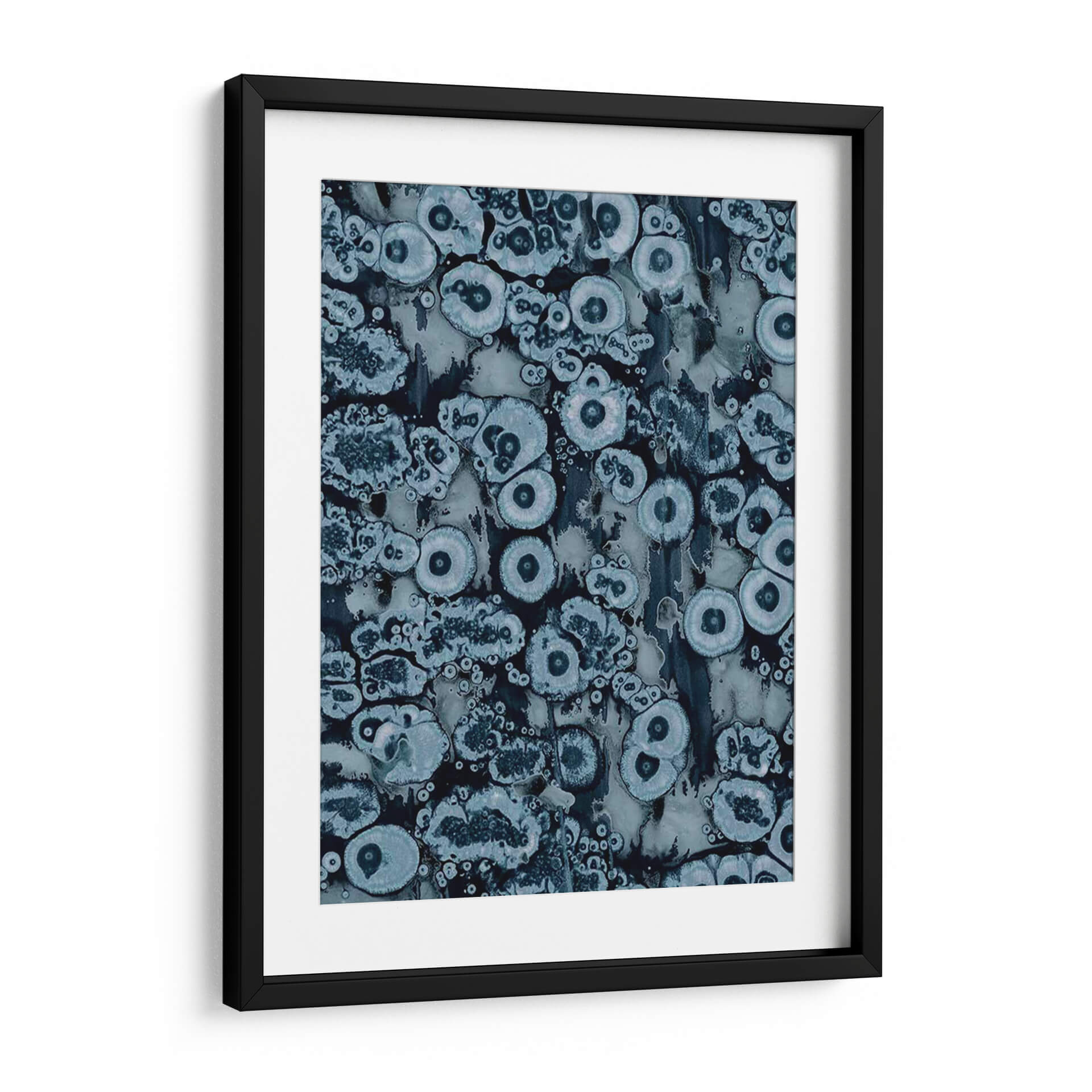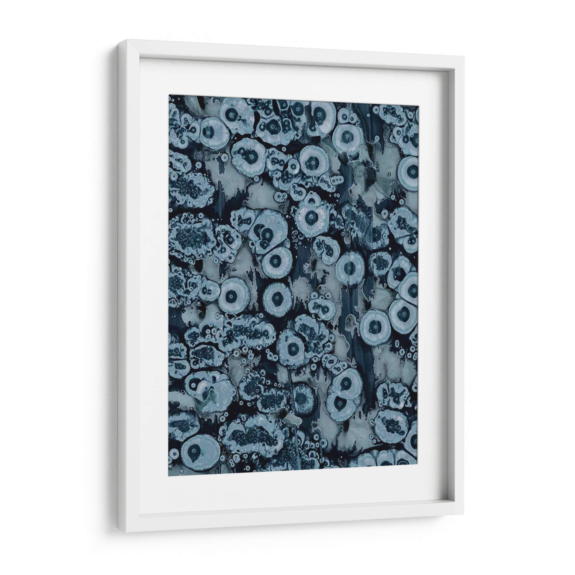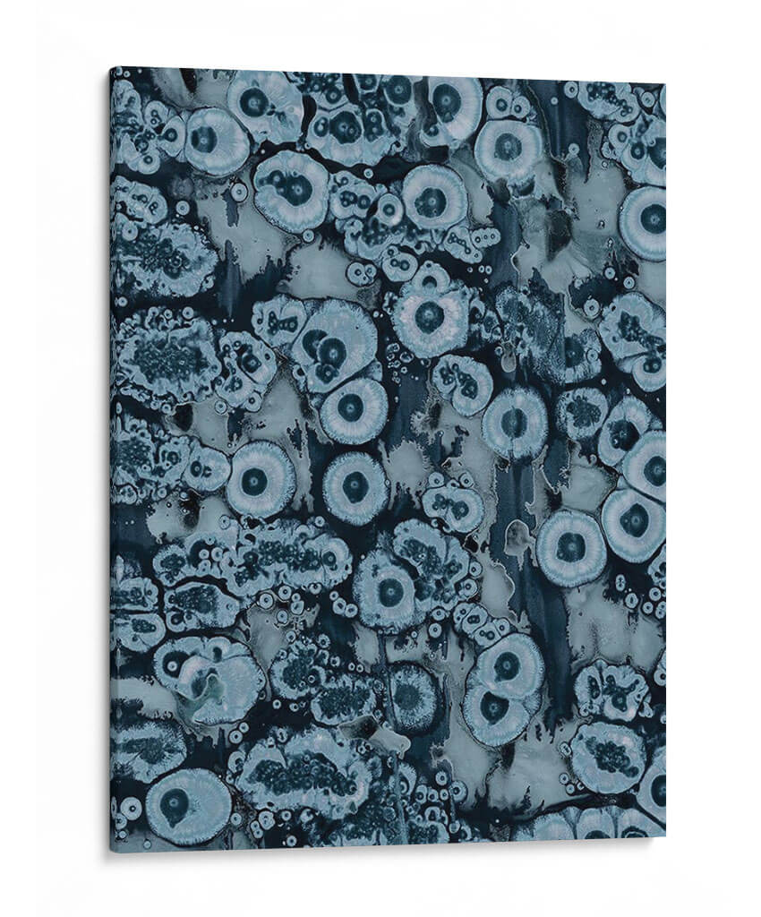 Sumérgete en la profundidad hipnótica de "Afijo II", una obra abstracta de Jenna Guthrie que evoca la belleza intrincada de las formaciones naturales. Este cuadro decorativo presenta una fascinante composición de formas orgánicas y circulares, reminiscentes de células bajo un microscopio o patrones geológicos sutiles, entrelazadas en un tapiz visual cautivador. La paleta de colores, dominada por una gama de azules profundos, grises apagados y toques de blanco luminoso, crea una atmósfera de serenidad y contemplación. Cada elemento visual parece pulsar con una vida propia, invitando al espectador a perderse en sus texturas detalladas y su diseño envolvente. "Afijo II" es una pieza versátil, ideal para añadir un toque de sofisticación y misterio a cualquier espacio, ya sea un salón moderno, una oficina tranquila o un dormitorio que busque un punto focal evocador. Su estética abstracta y su ejecución experta la convierten en una adición excepcional para amantes del arte contemporáneo que valoran la profundidad y la intriga en sus decoraciones de pared.