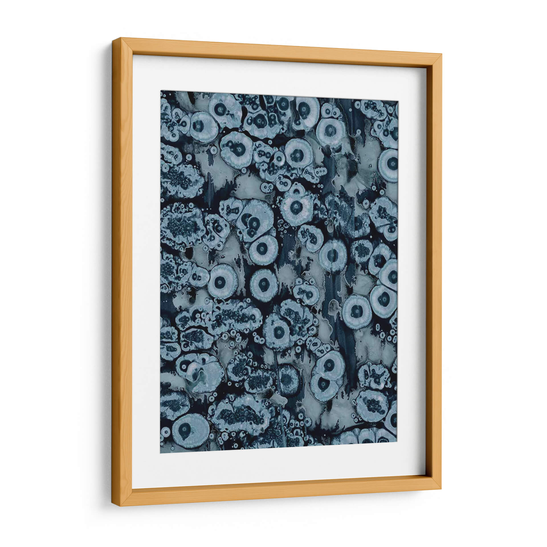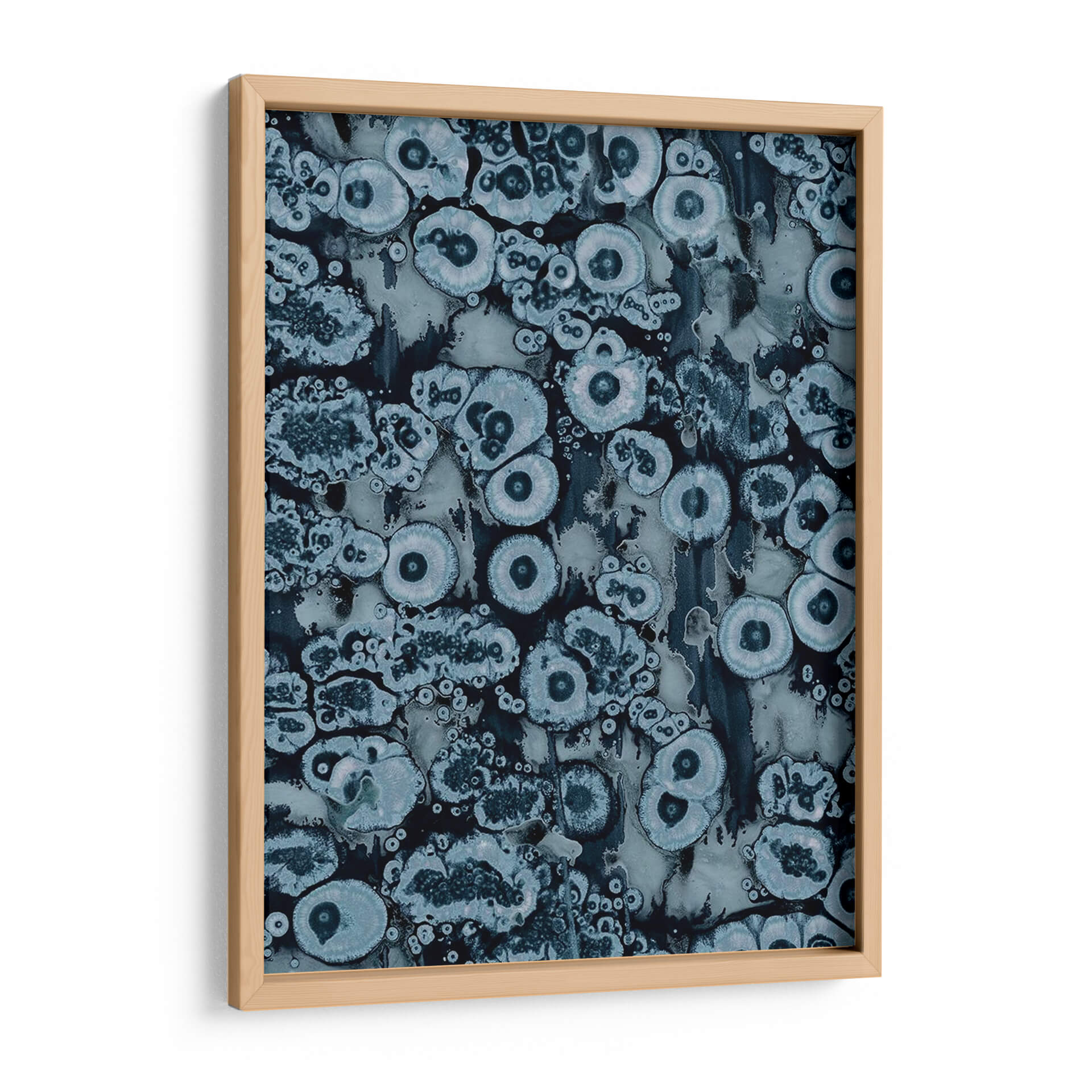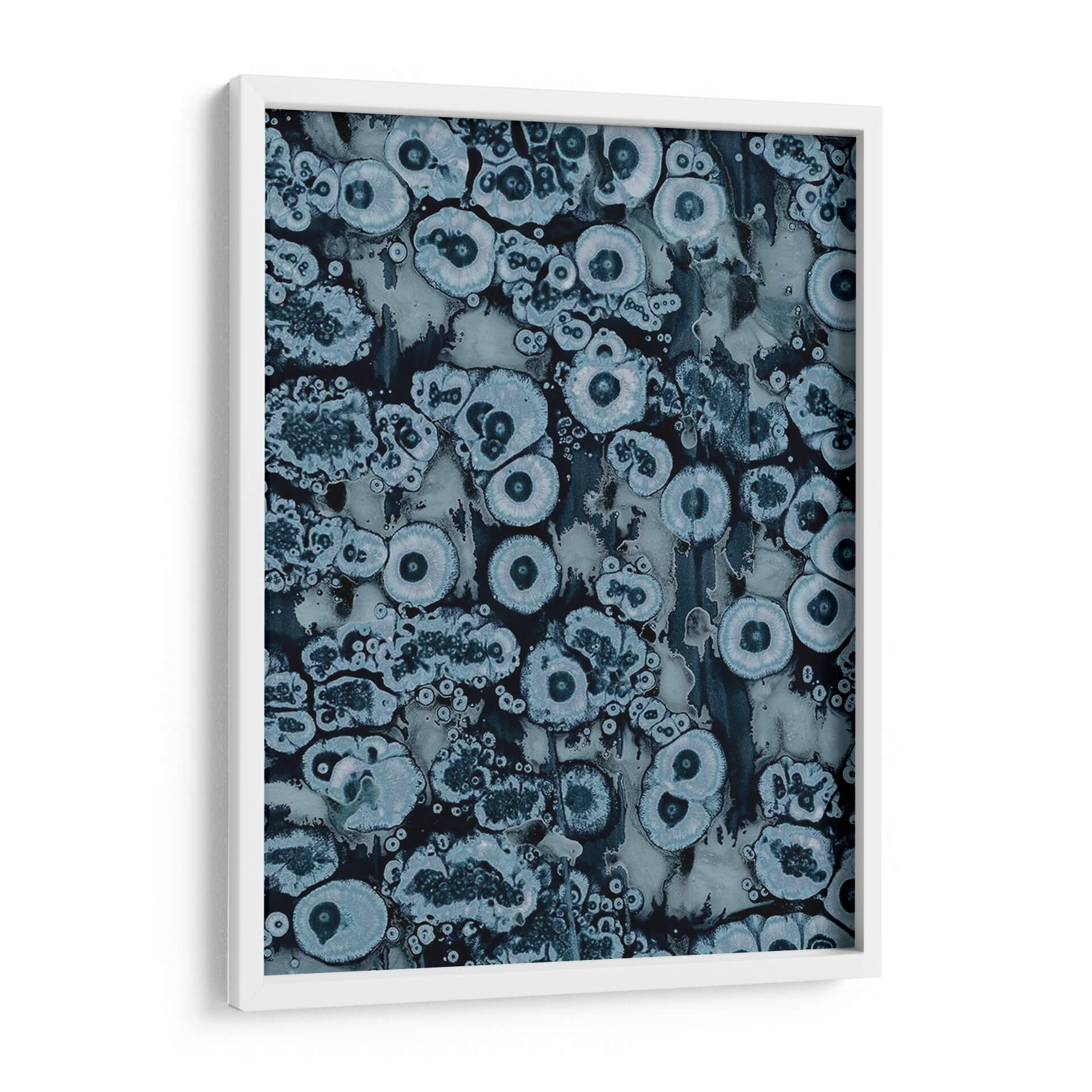 Sumérgete en la profundidad hipnótica de "Afijo II", una obra abstracta de Jenna Guthrie que evoca la belleza intrincada de las formaciones naturales. Este cuadro decorativo presenta una fascinante composición de formas orgánicas y circulares, reminiscentes de células bajo un microscopio o patrones geológicos sutiles, entrelazadas en un tapiz visual cautivador. La paleta de colores, dominada por una gama de azules profundos, grises apagados y toques de blanco luminoso, crea una atmósfera de serenidad y contemplación. Cada elemento visual parece pulsar con una vida propia, invitando al espectador a perderse en sus texturas detalladas y su diseño envolvente. "Afijo II" es una pieza versátil, ideal para añadir un toque de sofisticación y misterio a cualquier espacio, ya sea un salón moderno, una oficina tranquila o un dormitorio que busque un punto focal evocador. Su estética abstracta y su ejecución experta la convierten en una adición excepcional para amantes del arte contemporáneo que valoran la profundidad y la intriga en sus decoraciones de pared.