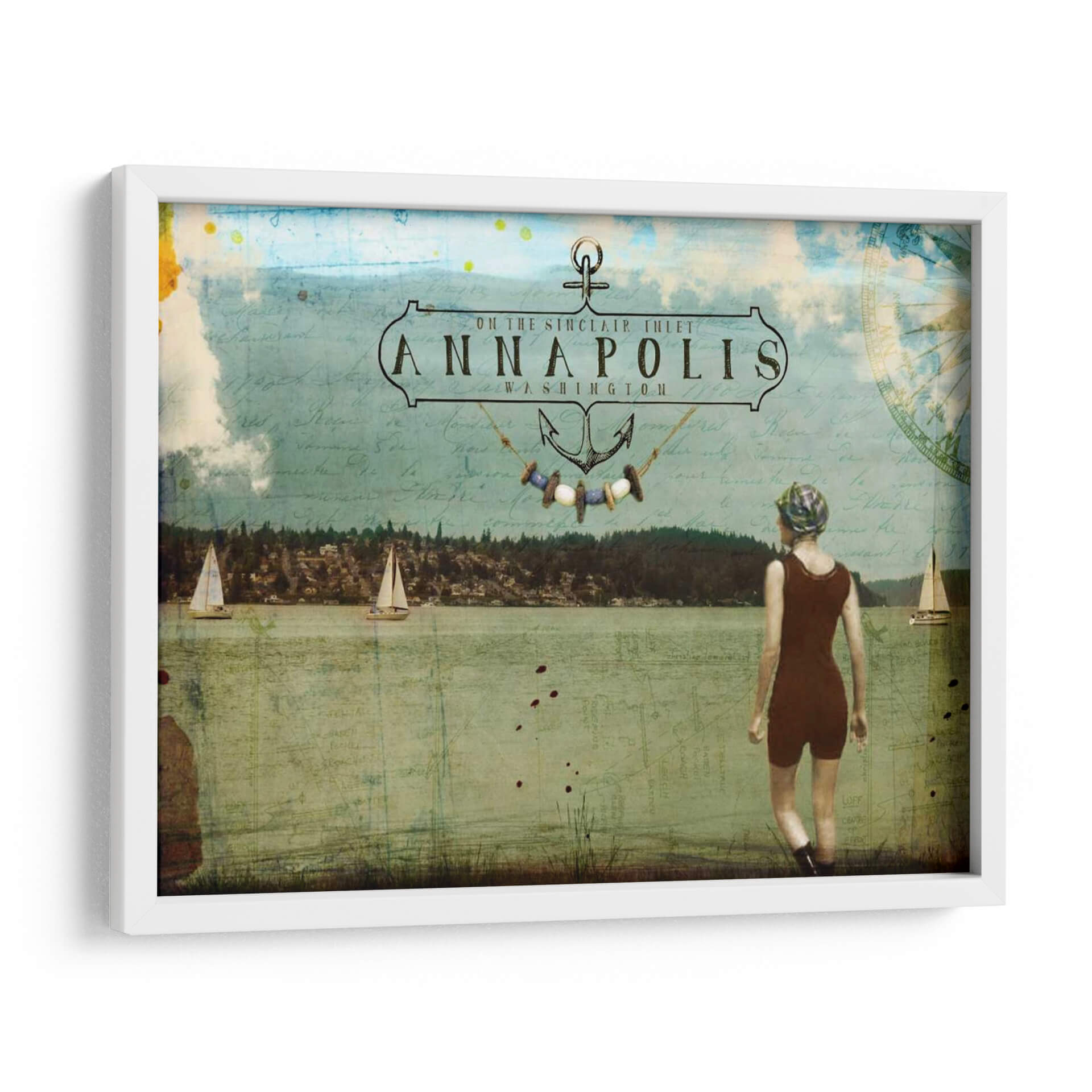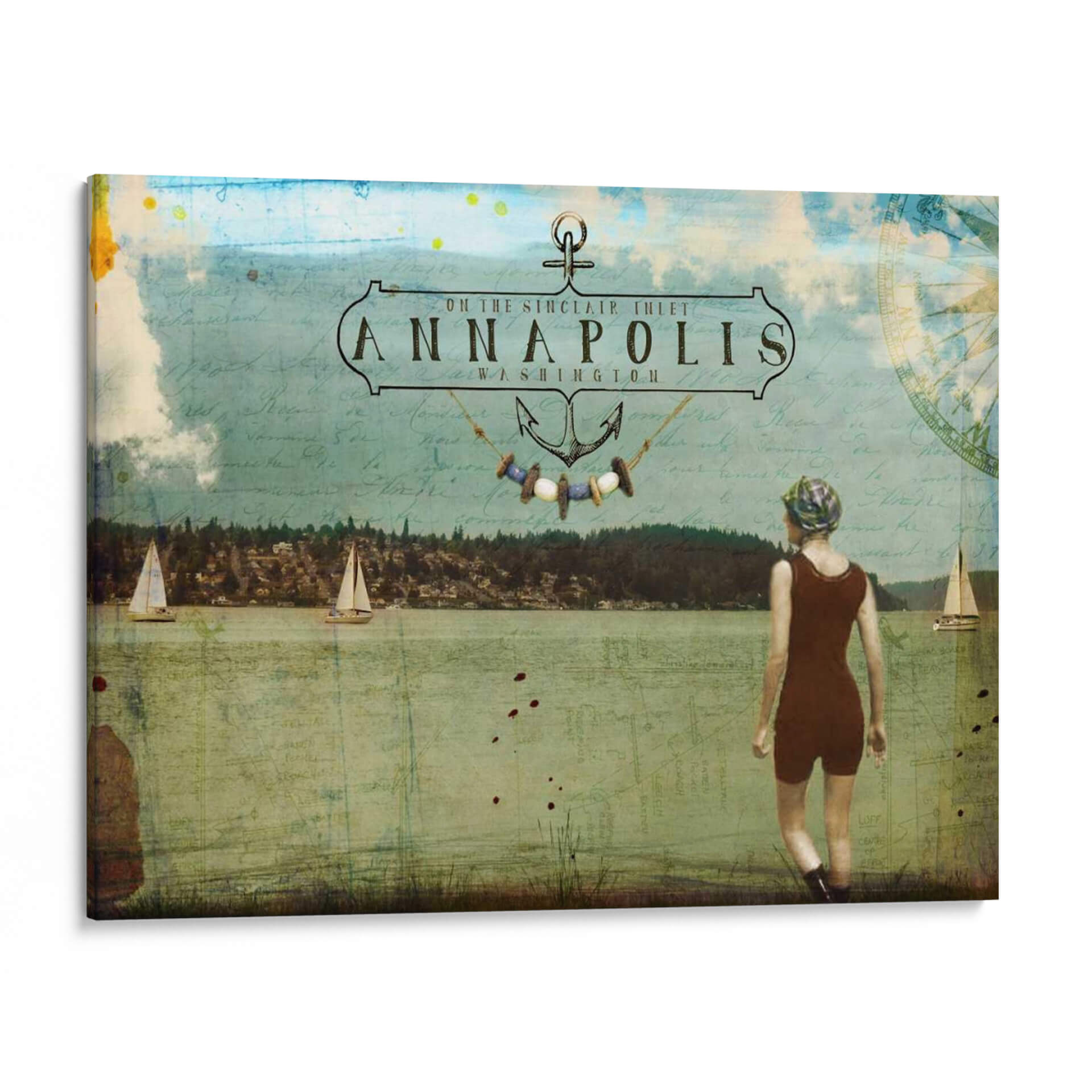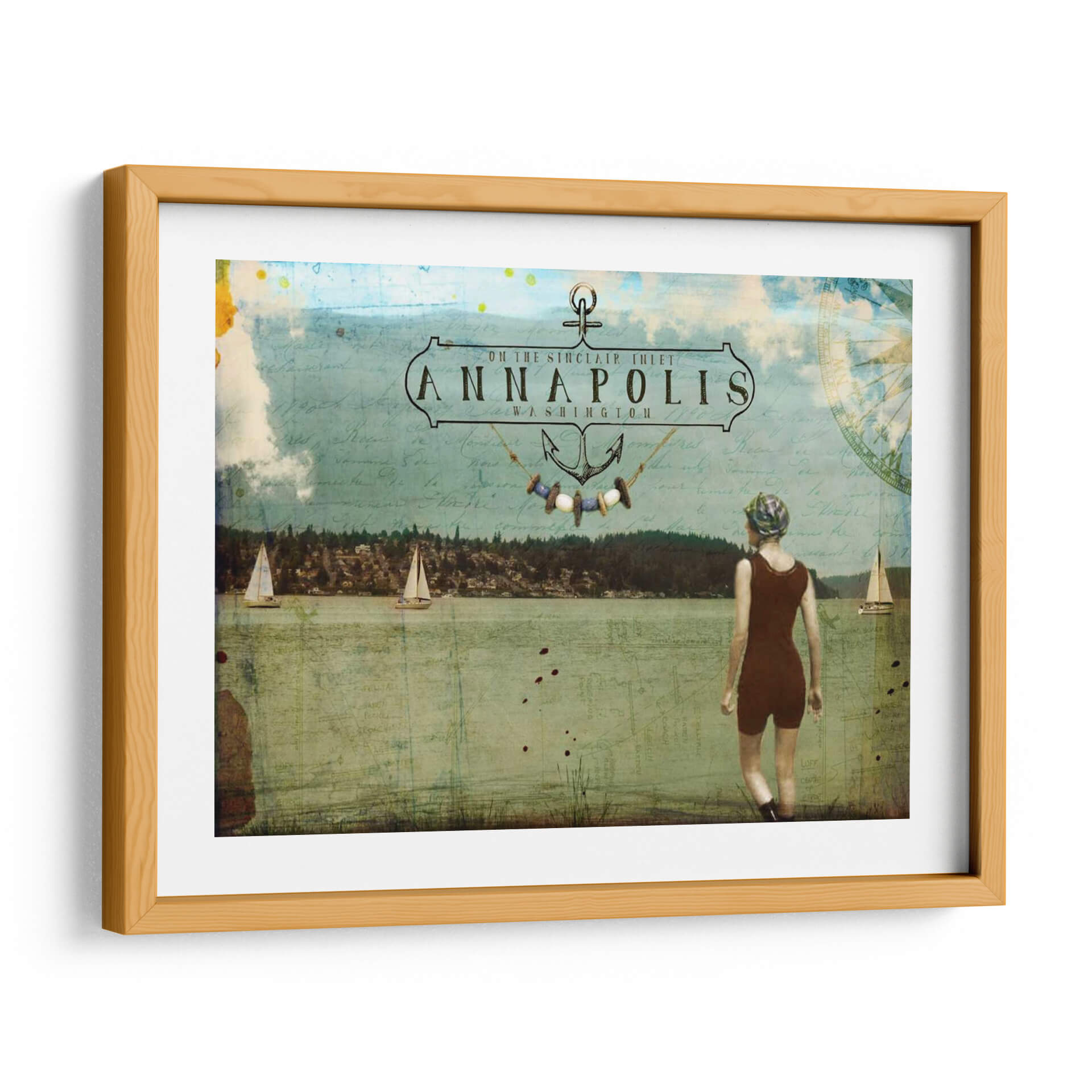 Embárquese en un viaje nostálgico con este cautivador cuadro decorativo titulado 'Annapolis', una obra de Sandy Lloyd que evoca la serenidad de una brisa marina y la elegancia de épocas pasadas. La pieza presenta una vista panorámica de una bahía tranquila, con veleros navegando apaciblemente sobre aguas de tonalidad aguamarina. Una figura femenina de espaldas, vestida con un traje de baño de estilo retro, añade un toque de misterio y contemplación, mirando hacia el horizonte boscoso. La composición se enriquece con sutiles capas de mapas antiguos y escritura a mano, evocando una sensación de historia y descubrimiento. La paleta de colores, dominada por tonos verdes y azules serenos con toques de tierra y amarillo, crea una atmósfera de calma y evasión. Este cuadro decorativo es ideal para añadir un aire de sofisticación y tranquilidad a salas de estar, dormitorios o estudios. Su estilo único, que fusiona lo vintage con elementos gráficos, lo convierte en una pieza destacada para quienes aprecian el arte con narrativa y encanto atemporal. 'Annapolis' no es solo una imagen, es una invitación a soñar con escapadas costeras y momentos de paz.