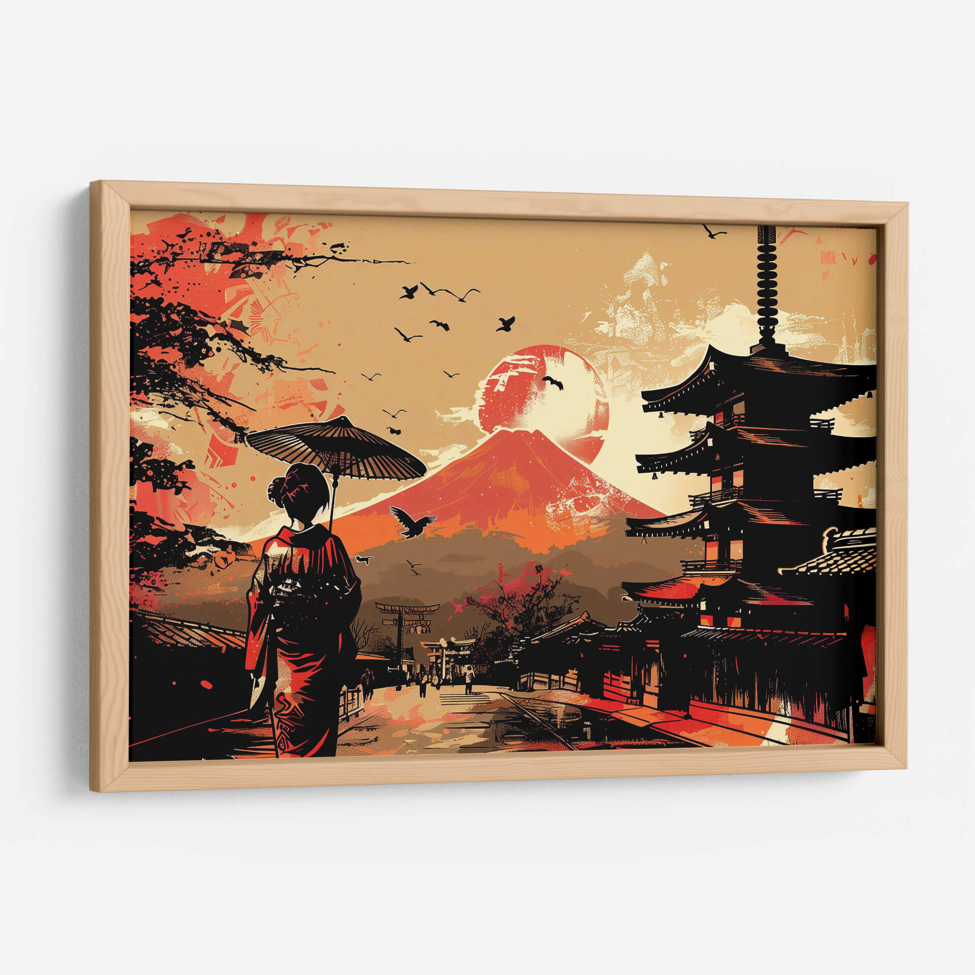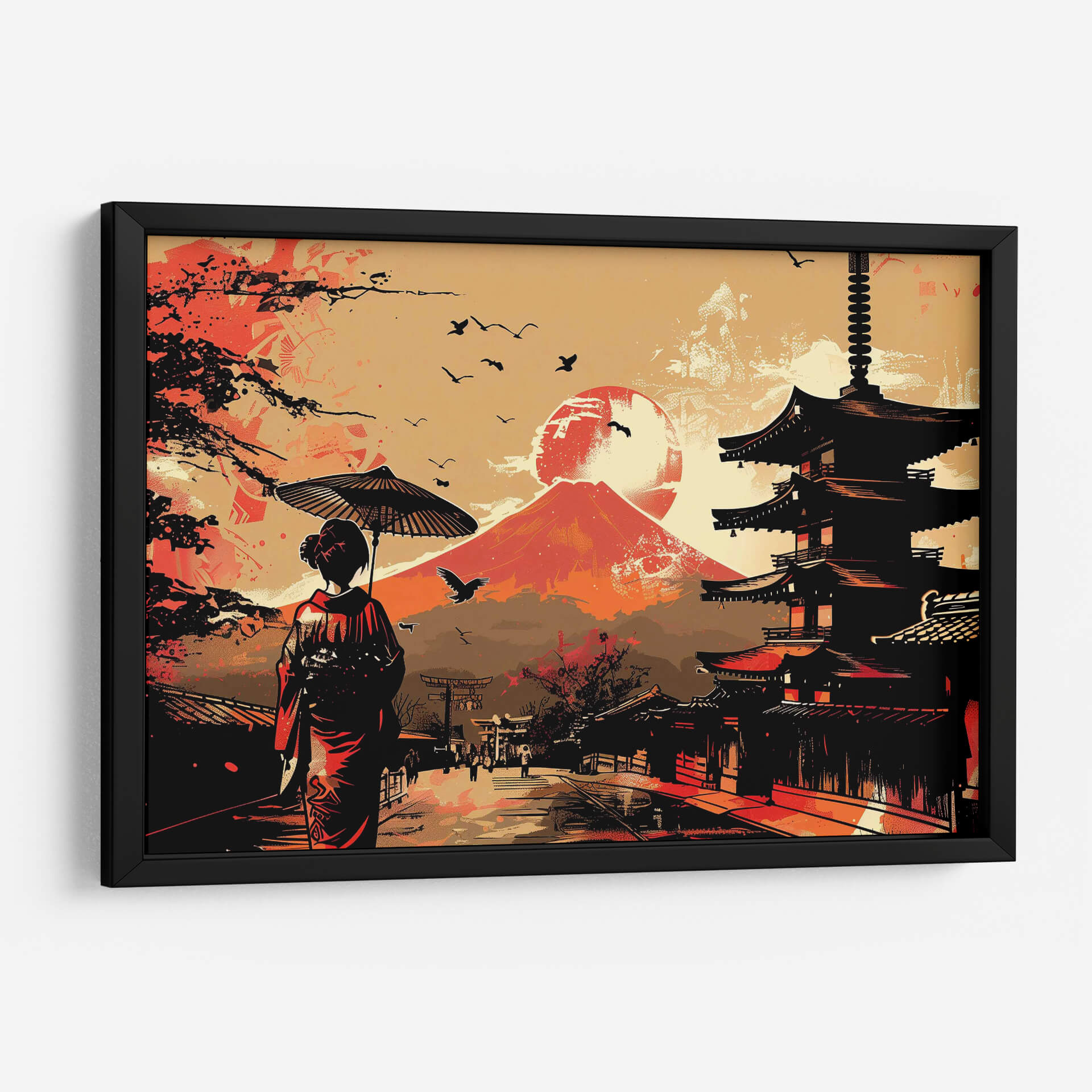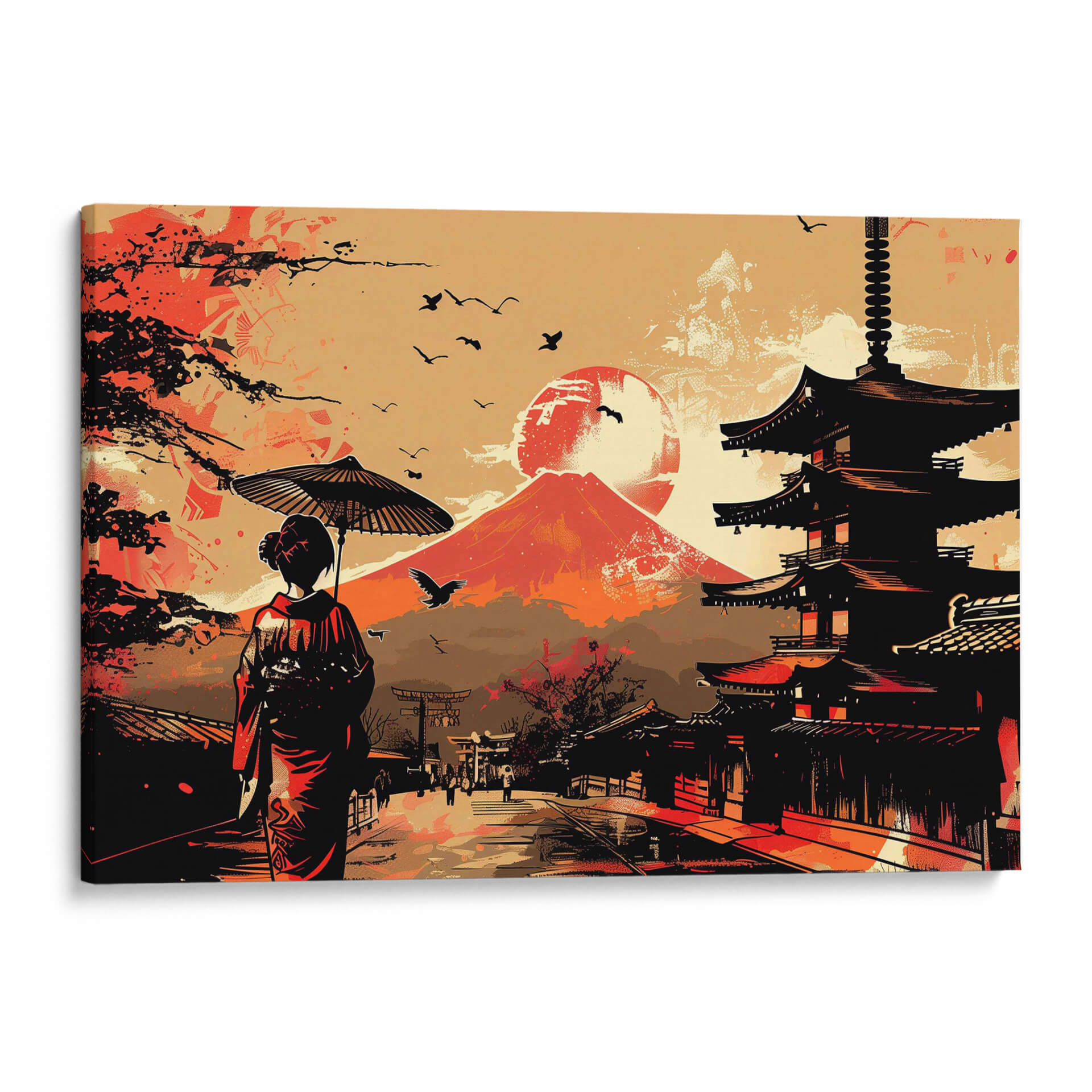 Sumérgete en la serenidad y el misterio del Lejano Oriente con este evocador cuadro decorativo inspirado en el arte japonés. La obra presenta una escena icónica con el majestuoso Monte Fuji en el fondo, bañado por un sol naciente o poniente de intensos tonos anaranjados y rojizos. En primer plano, una figura femenina ataviada con un kimono tradicional y sosteniendo un paraguas, se adentra en un camino flanqueado por templos y pagodas de arquitectura oriental. El estilo artístico, que combina elementos gráficos con una paleta de colores cálidos y contrastes audaces, crea una atmósfera de paz y contemplación. Las siluetas de aves volando añaden un toque de dinamismo a la composición. Este cuadro decorativo es perfecto para añadir un punto de sofisticación y tranquilidad a cualquier espacio, ya sea un salón, un dormitorio o una oficina, invitando a la reflexión y al disfrute de la belleza estética. Su diseño contemporáneo con toques tradicionales lo convierte en una pieza versátil que puede complementar diversos estilos decorativos, desde el minimalista hasta el más ecléctico, aportando carácter y una narrativa visual única. Descubre la esencia del Japón a través de esta impresionante obra de arte.