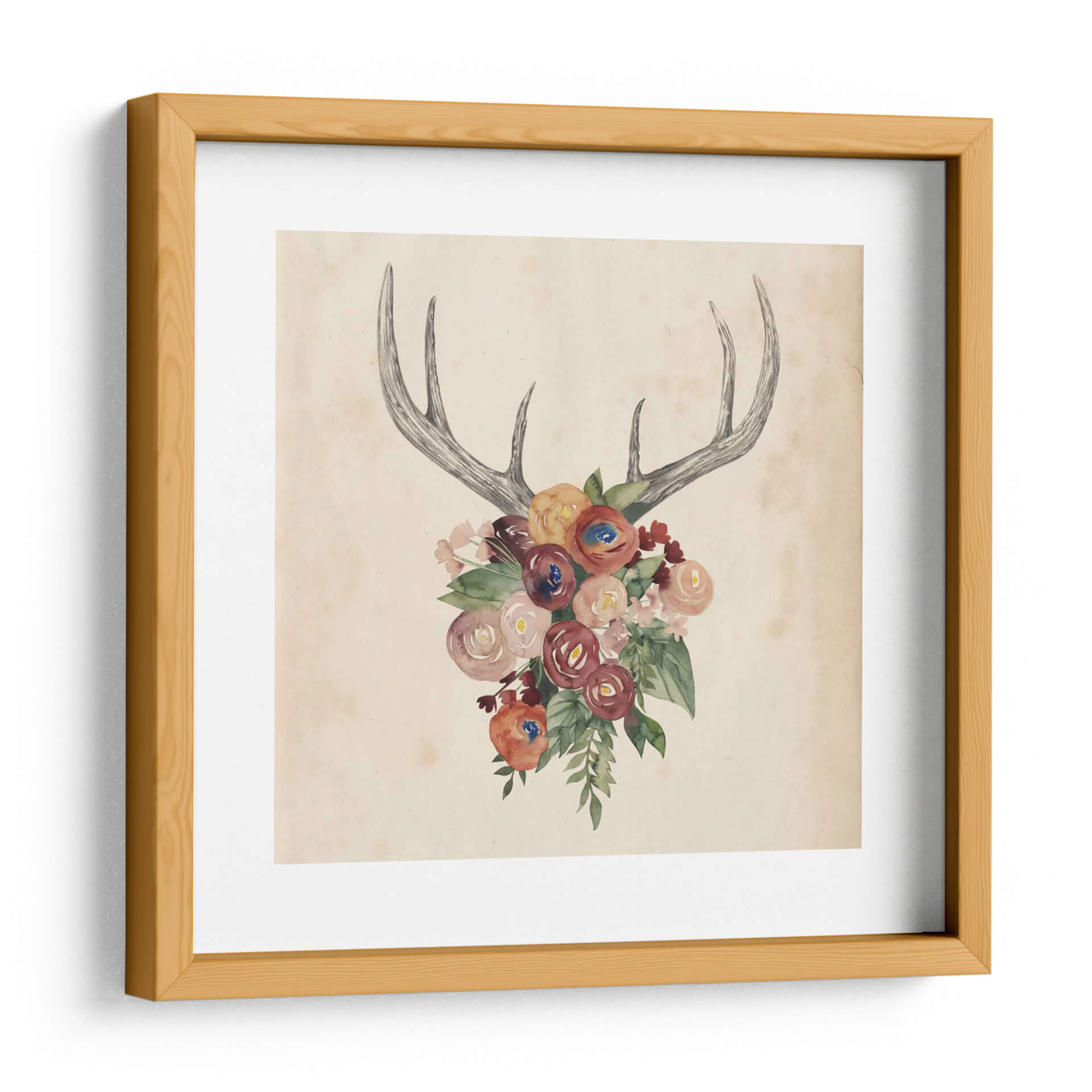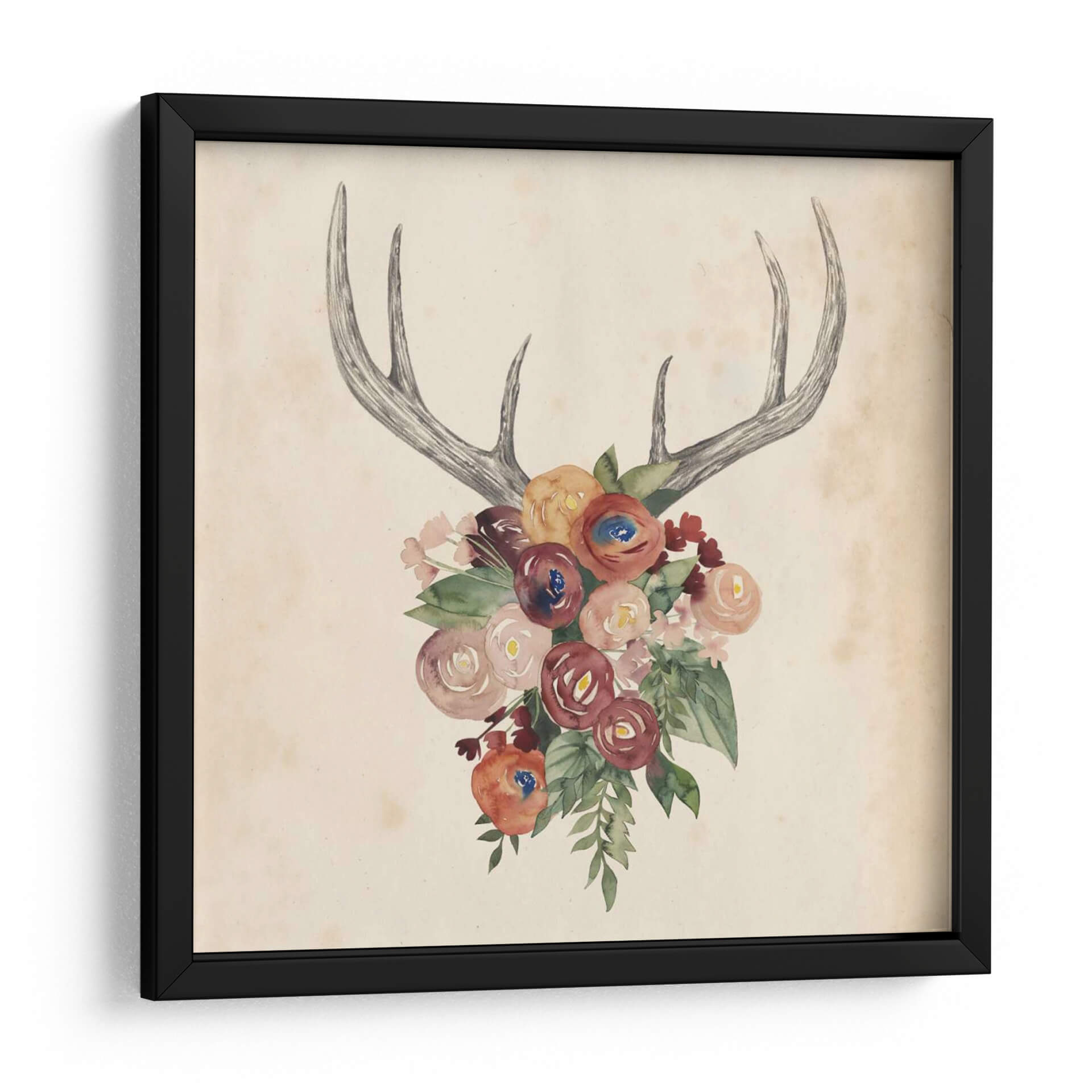 Embellece tu hogar con la delicada obra de arte "Astas De Flores I" de Grace Popp. Este cautivador cuadro decorativo fusiona la fuerza de unas astas de ciervo con la suavidad de un vibrante ramo de flores pintadas en acuarela. Los tonos tierra del fondo, combinados con los matices rojizos, rosados y anaranjados de las flores, crean una atmósfera acogedora y llena de vida. Las astas, representadas con trazos finos y detallados en un estilo que recuerda a ilustraciones botánicas clásicas, contrastan sutilmente con la fluidez y el color de la composición floral. Es una pieza que evoca la naturaleza en su máxima expresión, combinando elementos salvajes con la delicadeza de la flora. Ideal para espacios que buscan un toque de elegancia rústica o un acento bohemio y sofisticado. Este cuadro decorativo es perfecto para añadir personalidad a salas de estar, dormitorios o incluso estudios, aportando una dosis de color y serenidad. Su estilo único lo convierte en un punto focal que atraerá miradas y conversaciones, celebrando la armonía entre la fauna y la flora en un lienzo lleno de encanto.