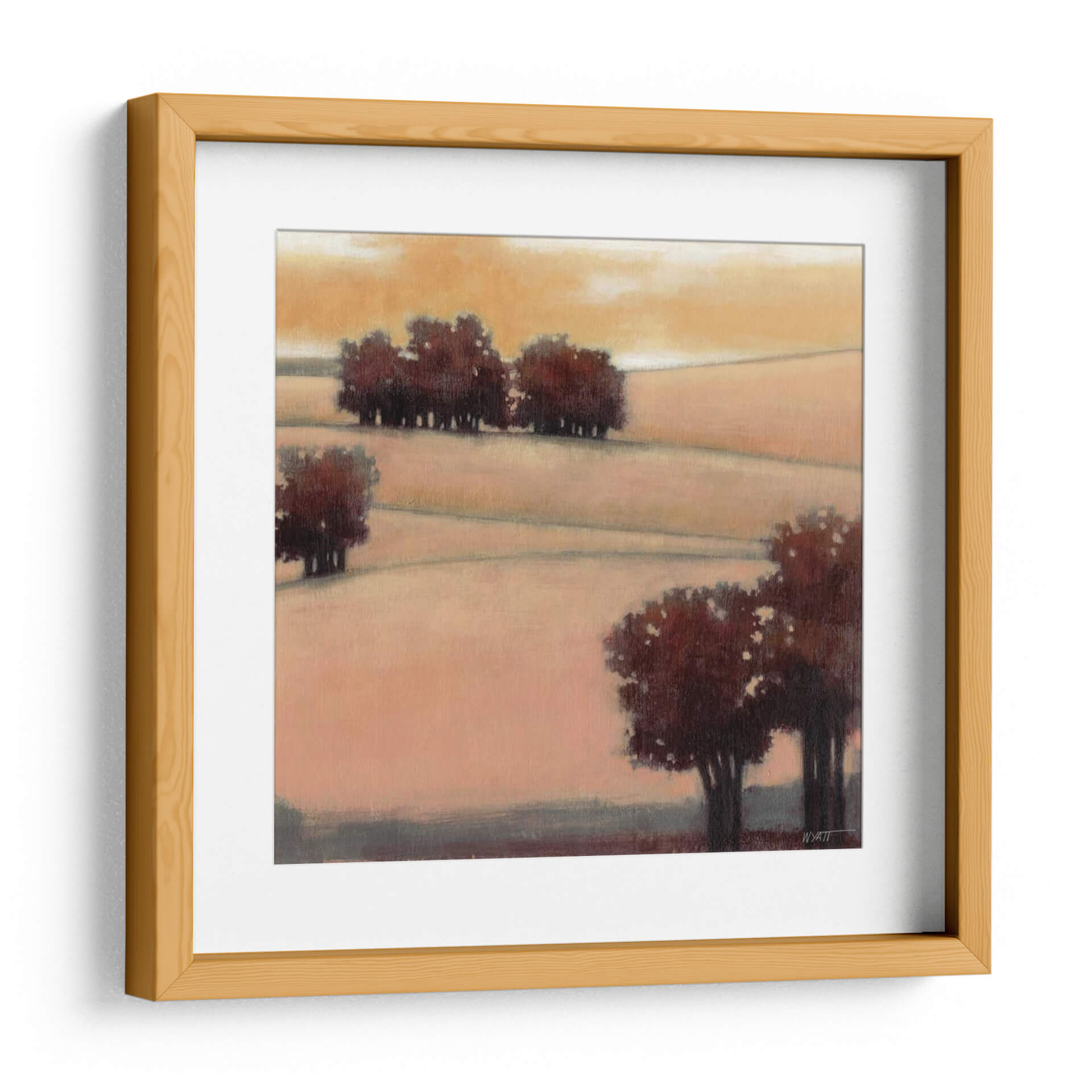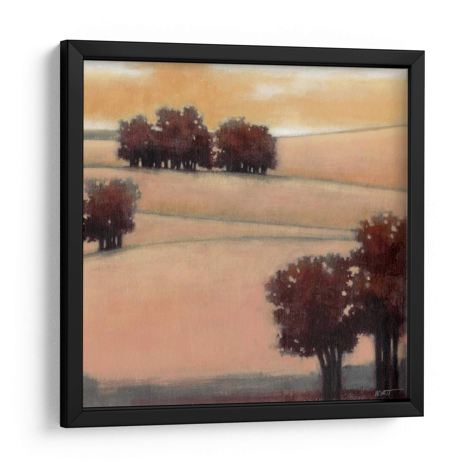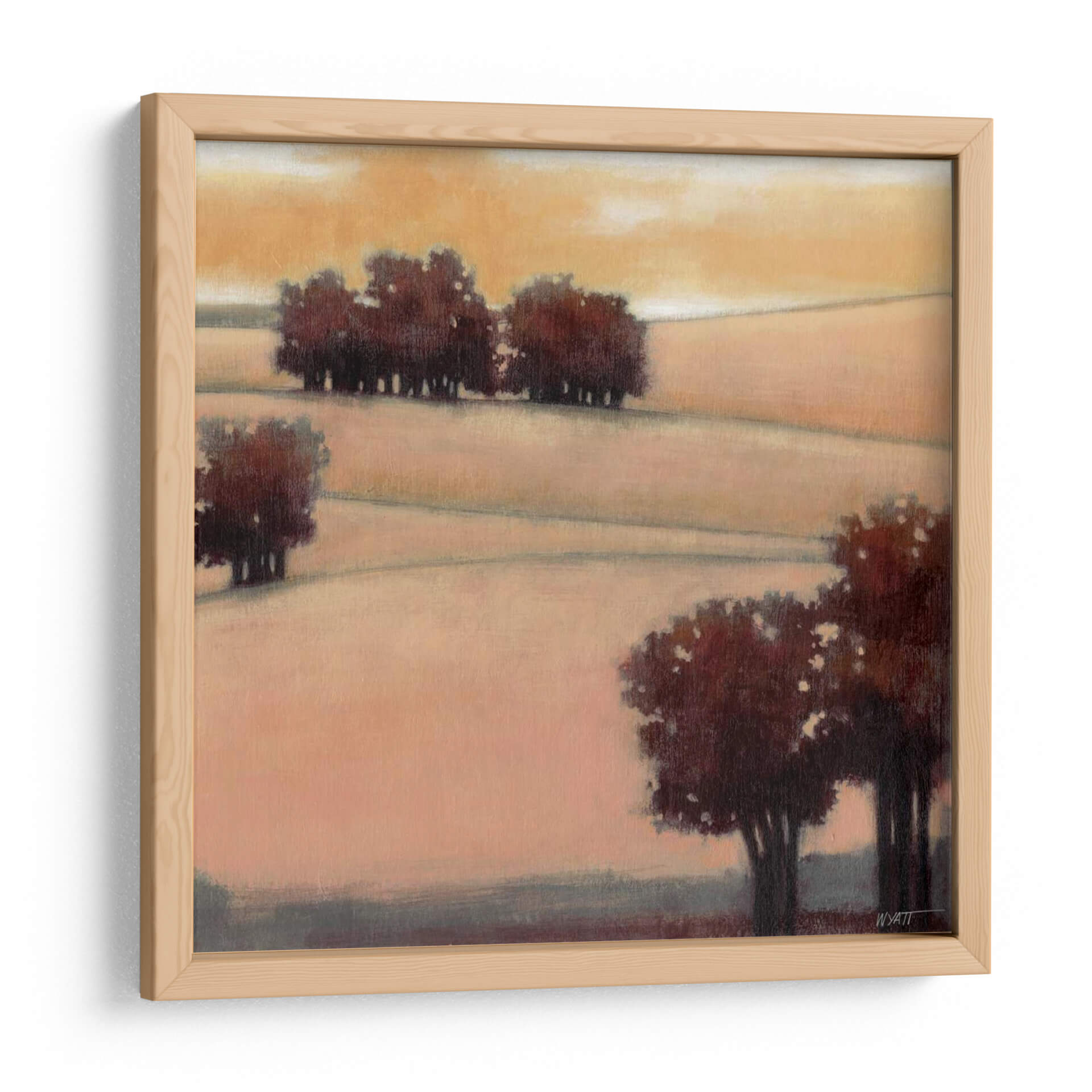 Sumérgete en la serena belleza de "Blushing Hills I", una obra de arte evocadora de Norman Wyatt Jr. que captura la esencia de un paisaje al atardecer con una paleta de colores cálidos y envolventes. Los tonos rosados y naranjas del cielo se funden suavemente con las colinas ondulantes, creando una atmósfera de calma y contemplación. Los árboles oscuros, con sus siluetas definidas, añaden profundidad y contraste a la composición, invitando al espectador a perderse en la tranquilidad de la escena. Este cuadro decorativo es perfecto para añadir un toque de sofisticación y paz a cualquier espacio, ya sea una sala de estar moderna, un dormitorio acogedor o una oficina que busque un refugio visual. La pincelada sutil y el estilo semi-abstracto de Wyatt Jr. logran transmitir una sensación de nostalgia y serenidad, haciendo de "Blushing Hills I" una pieza que resuena emocionalmente y embellece tu hogar con un arte contemporáneo de calidad. Transforma tu pared con esta ventana a un mundo de paz y belleza natural.