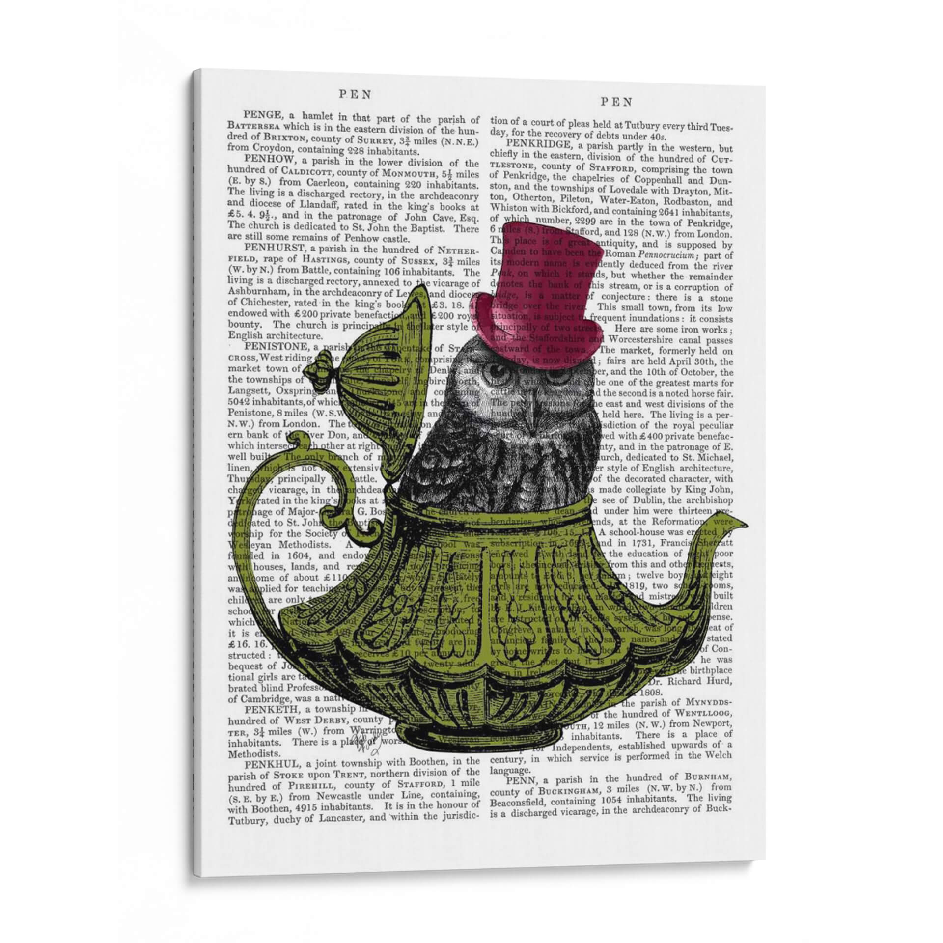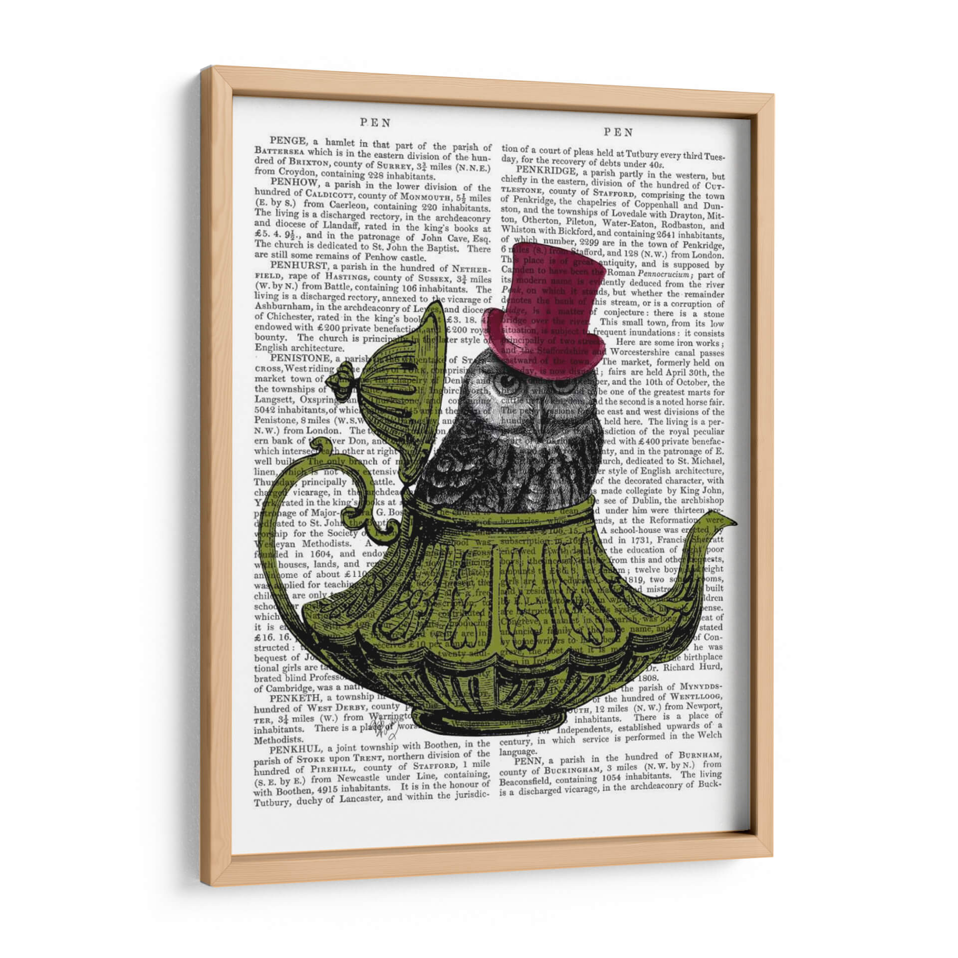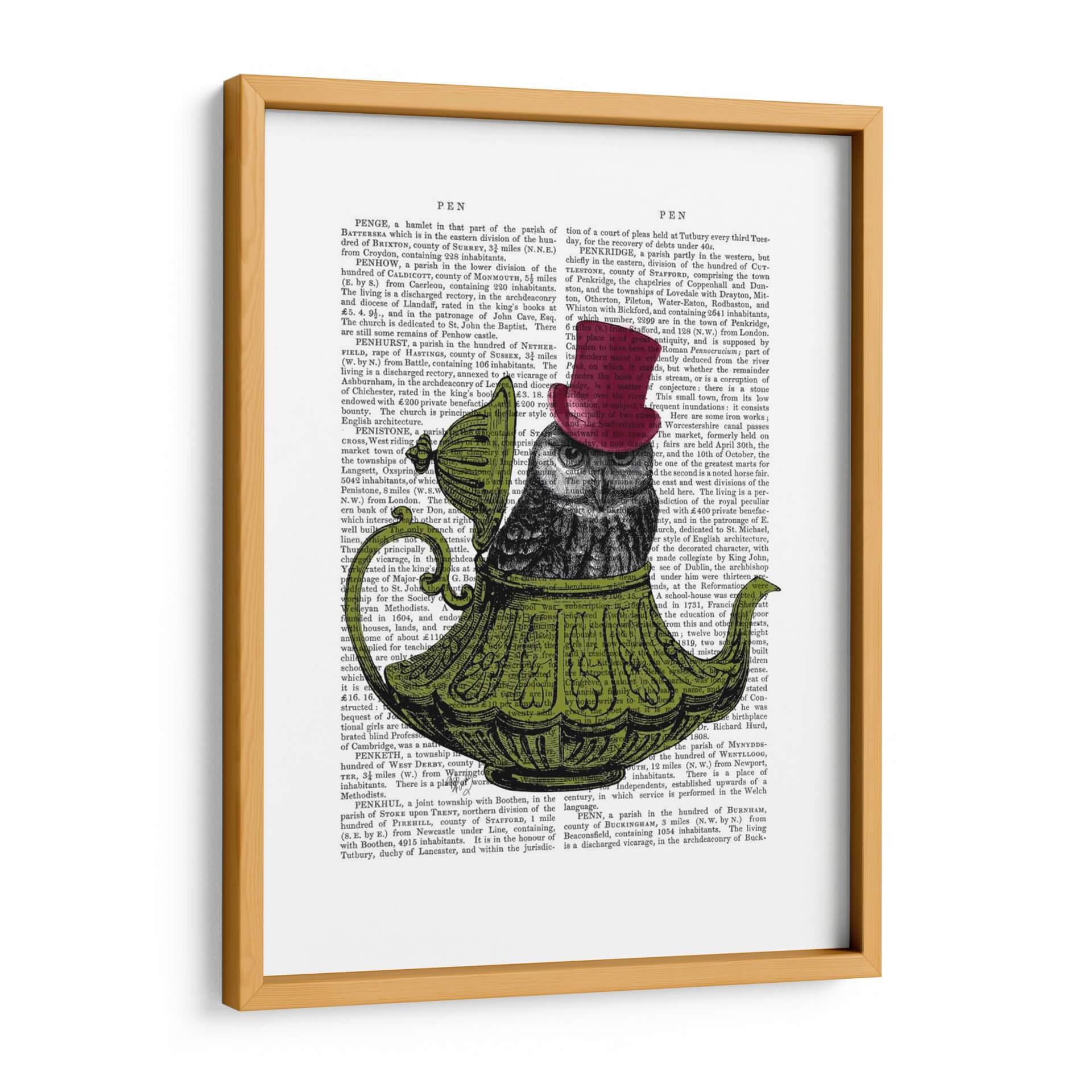 Sumérgete en la fascinante obra de arte "Búho En Tetera" del artista Fab Funky. Esta pieza captura la imaginación con su representación surrealista de un búho elegantemente posado dentro de una tetera ornamentada, coronado con un llamativo sombrero rojo. Los detalles intrincados de la tetera verde, con sus grabados y volutas, contrastan maravillosamente con la mirada penetrante y sabia del búho. La paleta de colores, dominada por verdes profundos y el vibrante rojo del sombrero, crea una atmósfera de misterio y fantasía, con un toque de humor inesperado. El estilo único de Fab Funky, que fusiona elementos clásicos con un giro contemporáneo, hace de este cuadro decorativo una pieza verdaderamente distintiva. "Búho En Tetera" es ideal para espacios que buscan un toque de originalidad y carácter, ya sea una sala de estar, un estudio o una oficina. Aporta una conversación visual intrigante y un aire de sofisticación juguetona a cualquier ambiente. Es perfecto para aquellos que aprecian el arte con un toque de surrealismo y un encanto peculiar, añadiendo profundidad y personalidad a tu decoración de pared.