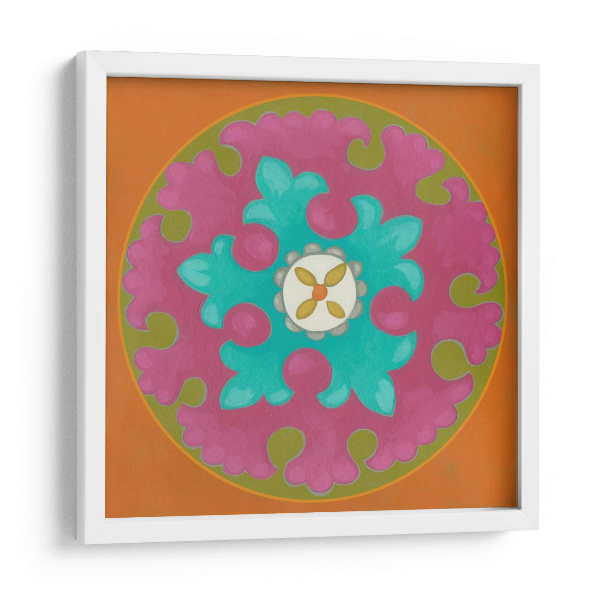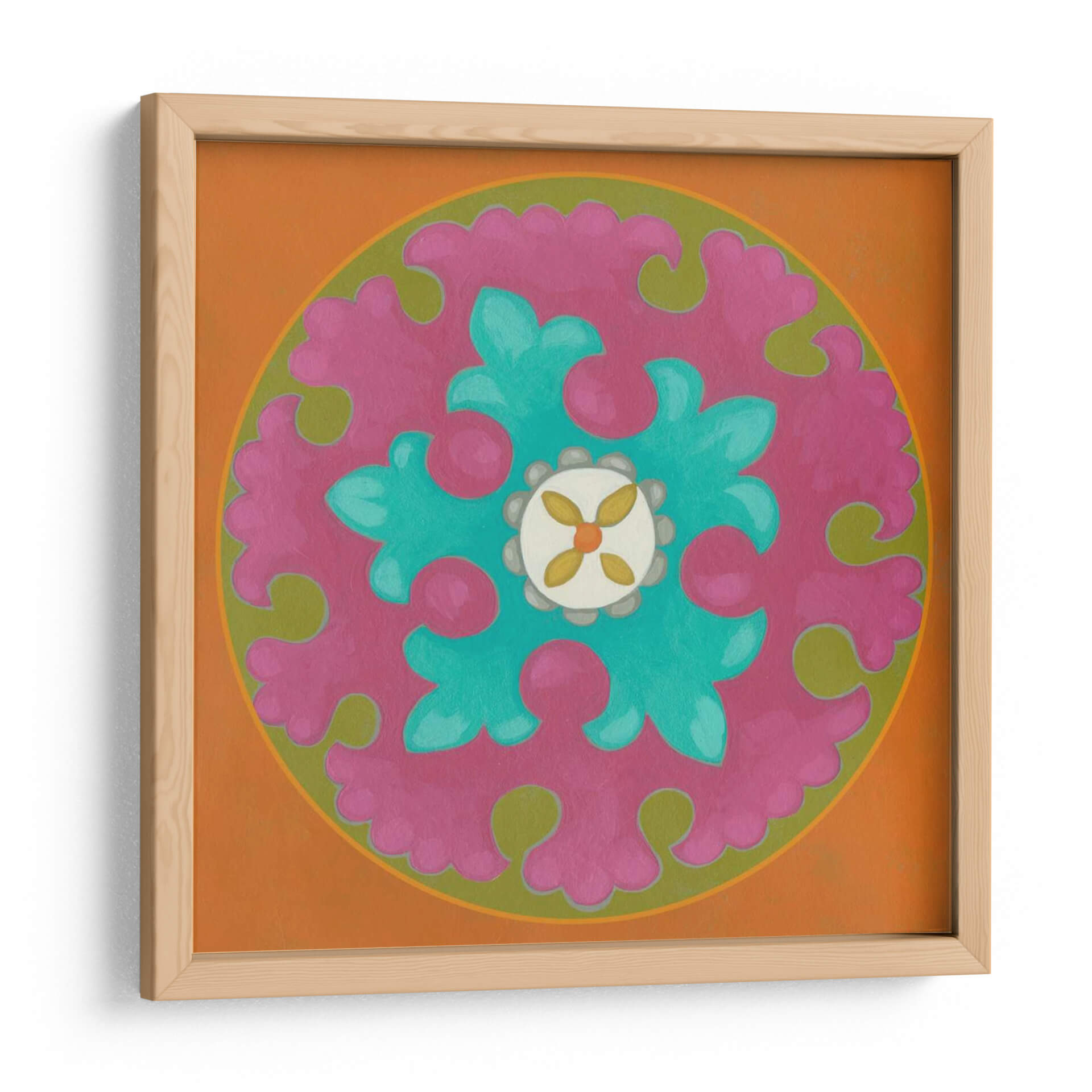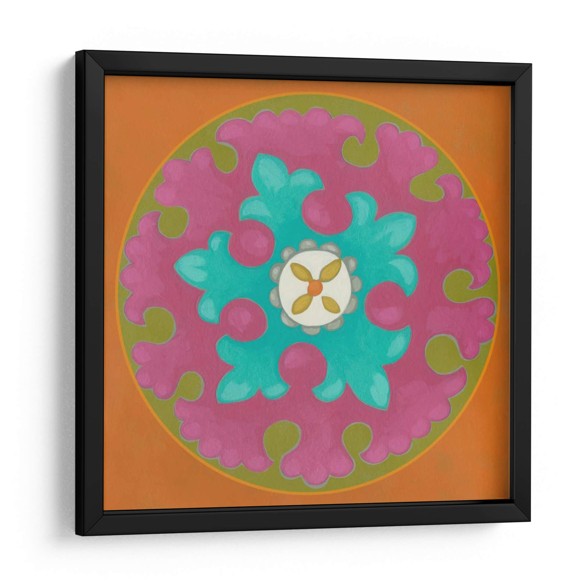 Sumérgete en la vibrante 'Celebración Suzani IV', una obra de arte que irradia alegría y energía positiva a través de su audaz diseño floral y su rica paleta de colores. Inspirada en los tradicionales textiles Suzani, esta pieza contemporánea reinterpreta un motivo clásico con un toque moderno y juguetón. El fondo naranja intenso crea un contraste llamativo con los pétalos en tonos fucsia y turquesa, realzados por sutiles toques de verde oliva y un centro delicado en blanco y dorado. La composición simétrica y los contornos suaves invitan a la contemplación, aportando una sensación de armonía y equilibrio a cualquier espacio. Este cuadro decorativo es perfecto para infundir vitalidad y un estilo bohemio o ecléctico en salones, comedores o incluso estudios. Su diseño intrincado pero accesible lo convierte en un punto focal cautivador, ideal para quienes buscan añadir personalidad y un toque artístico único a su hogar u oficina. Descubre cómo esta celebración de color y forma puede transformar tu ambiente y reflejar tu espíritu vibrante.