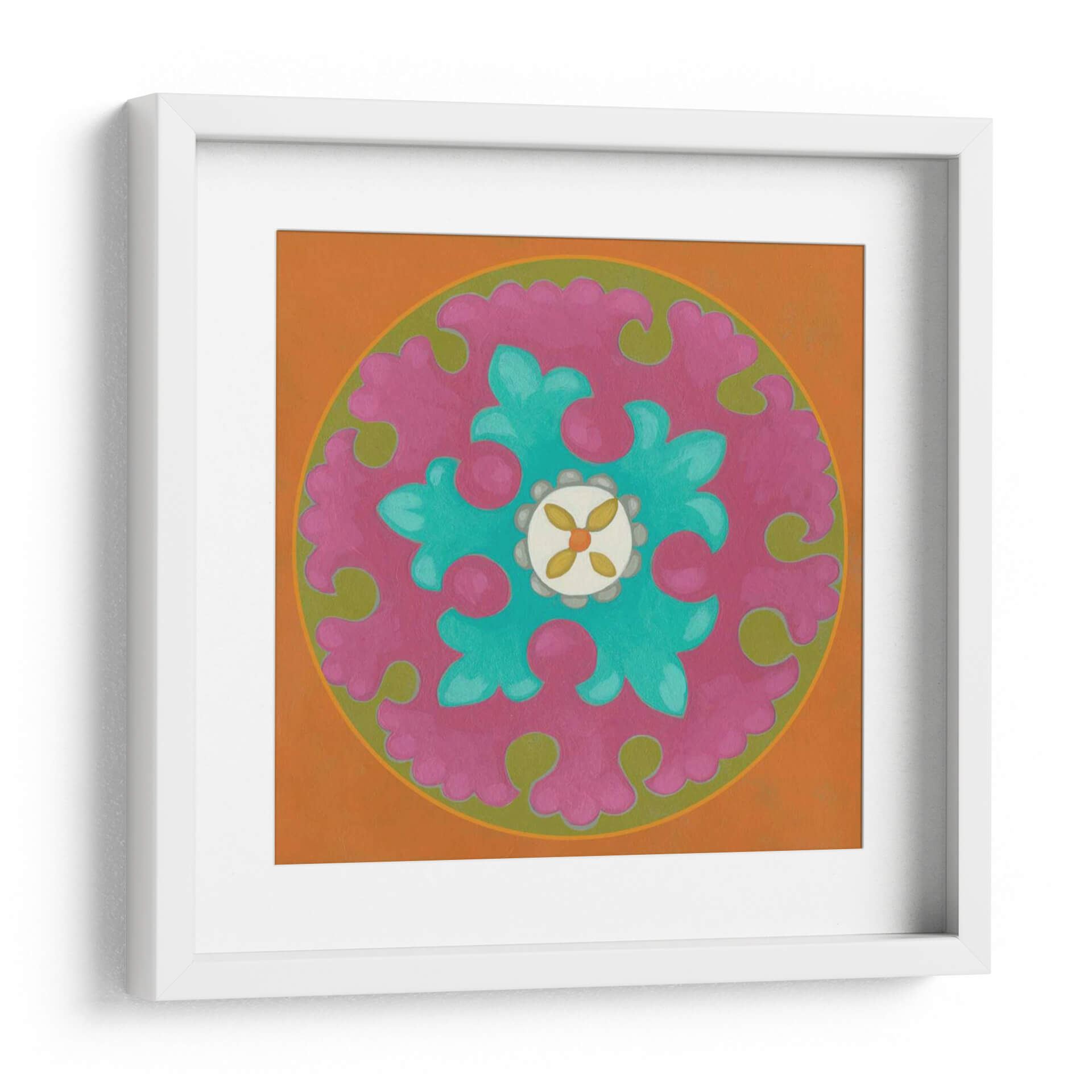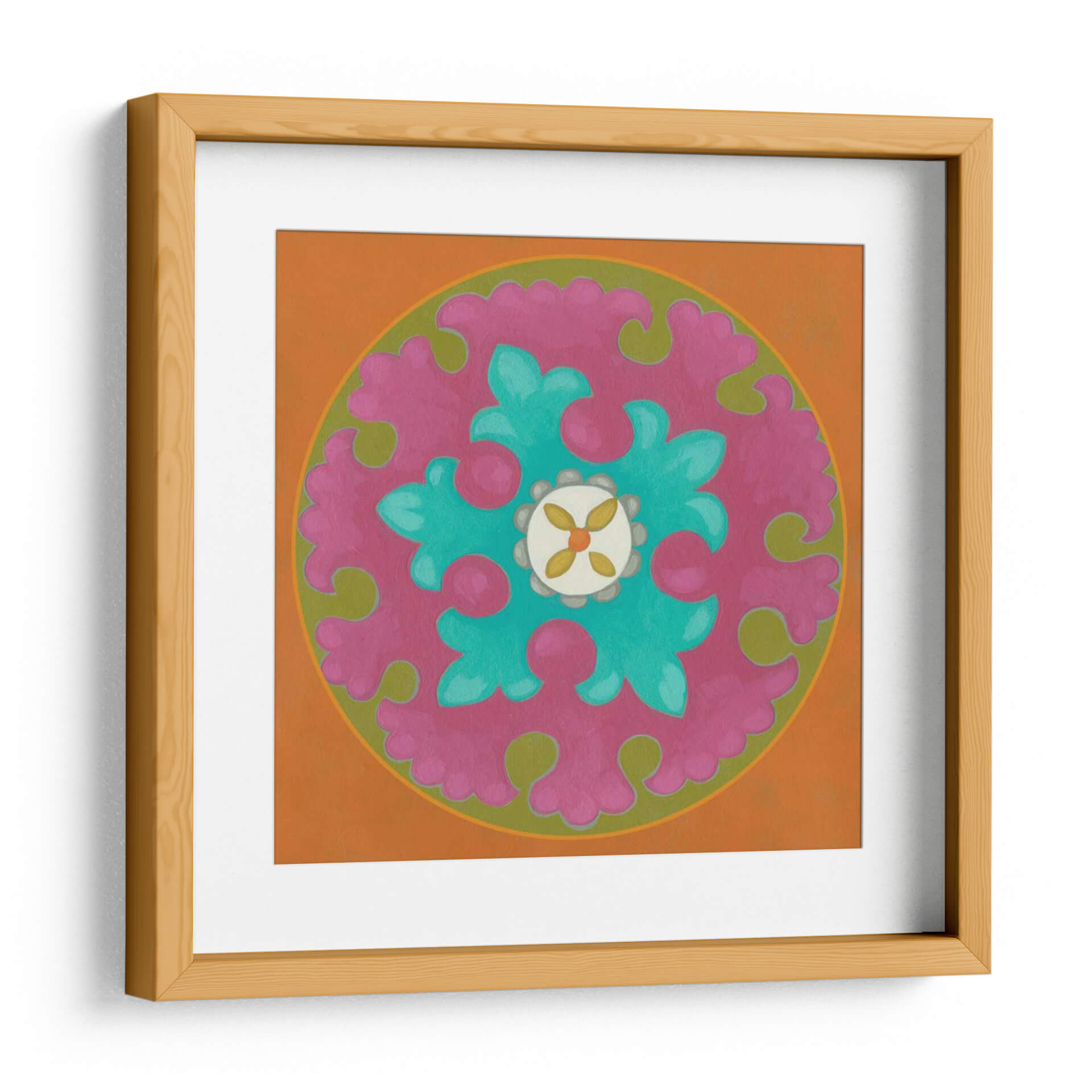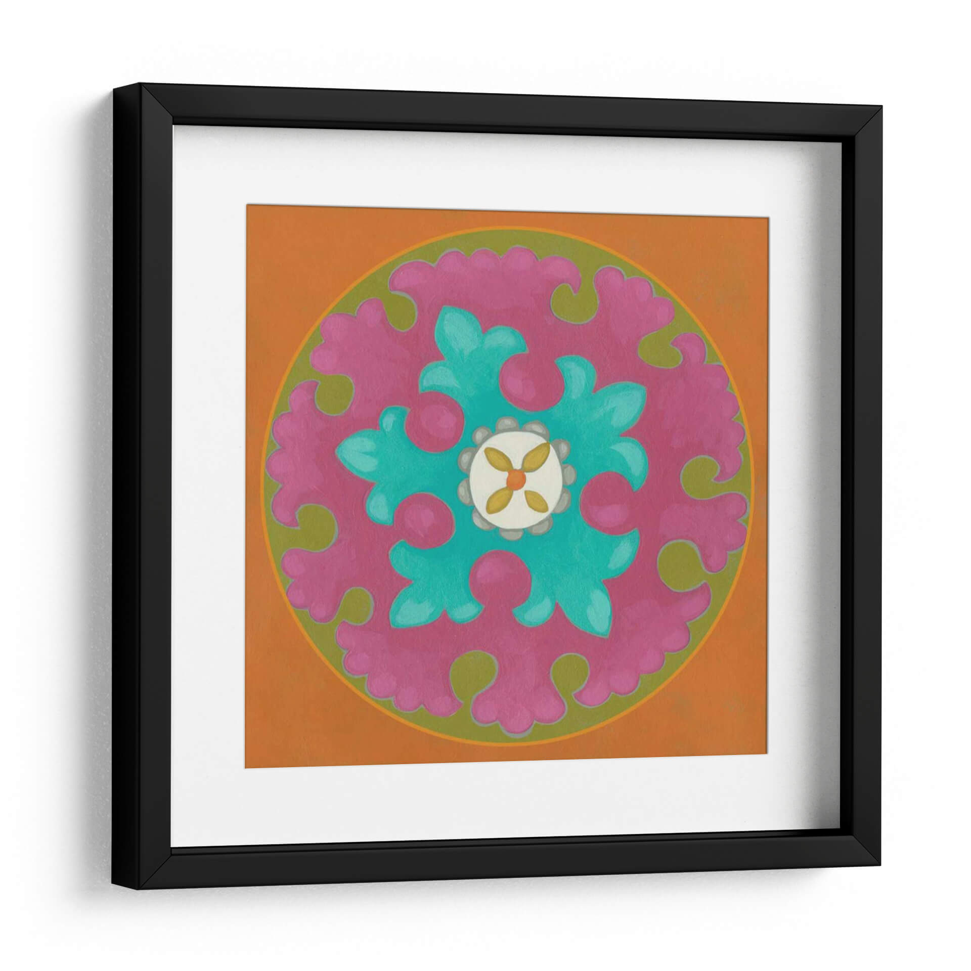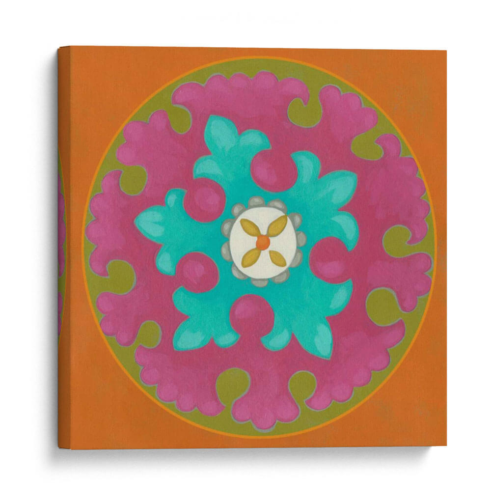 Sumérgete en la vibrante 'Celebración Suzani IV', una obra de arte que irradia alegría y energía positiva a través de su audaz diseño floral y su rica paleta de colores. Inspirada en los tradicionales textiles Suzani, esta pieza contemporánea reinterpreta un motivo clásico con un toque moderno y juguetón. El fondo naranja intenso crea un contraste llamativo con los pétalos en tonos fucsia y turquesa, realzados por sutiles toques de verde oliva y un centro delicado en blanco y dorado. La composición simétrica y los contornos suaves invitan a la contemplación, aportando una sensación de armonía y equilibrio a cualquier espacio. Este cuadro decorativo es perfecto para infundir vitalidad y un estilo bohemio o ecléctico en salones, comedores o incluso estudios. Su diseño intrincado pero accesible lo convierte en un punto focal cautivador, ideal para quienes buscan añadir personalidad y un toque artístico único a su hogar u oficina. Descubre cómo esta celebración de color y forma puede transformar tu ambiente y reflejar tu espíritu vibrante.