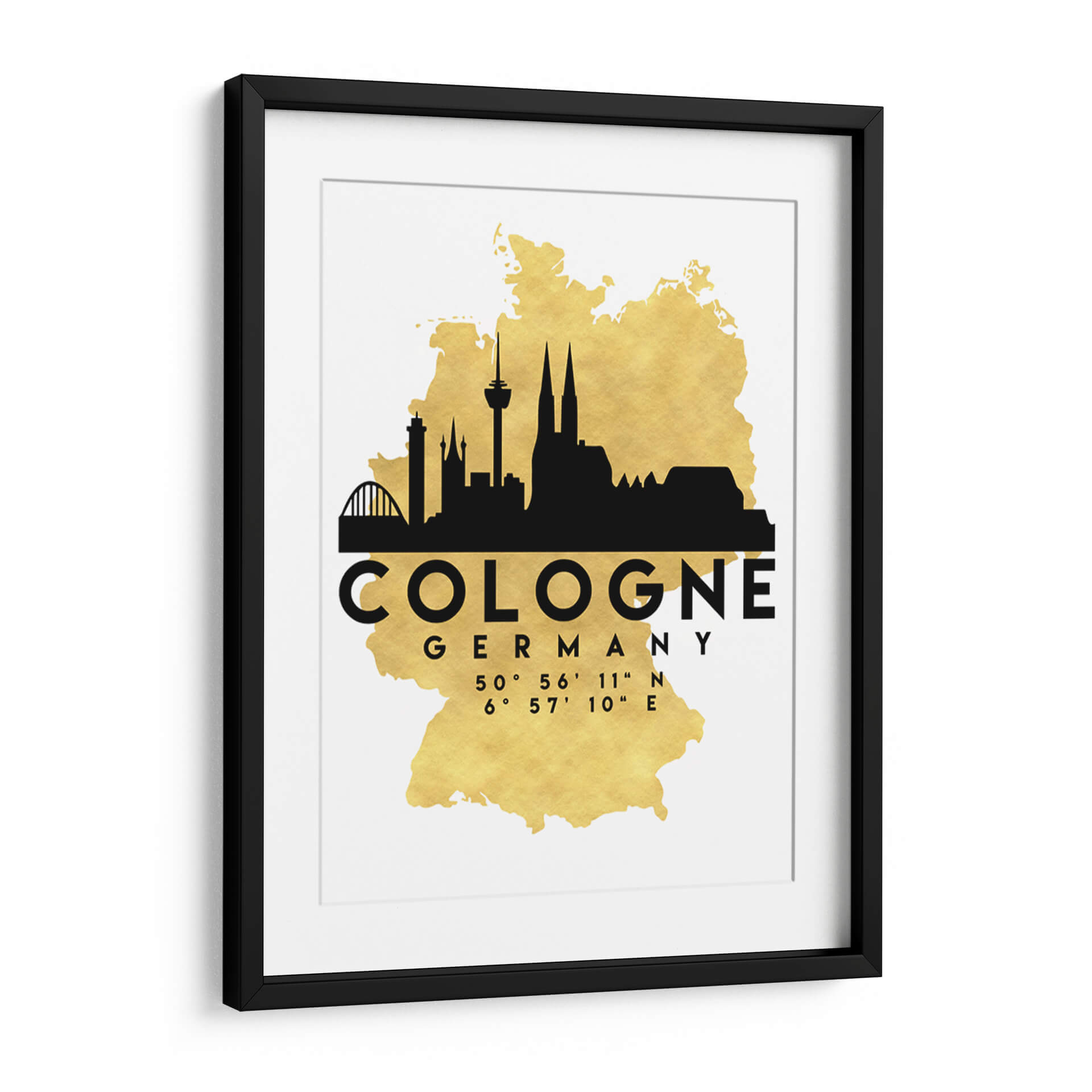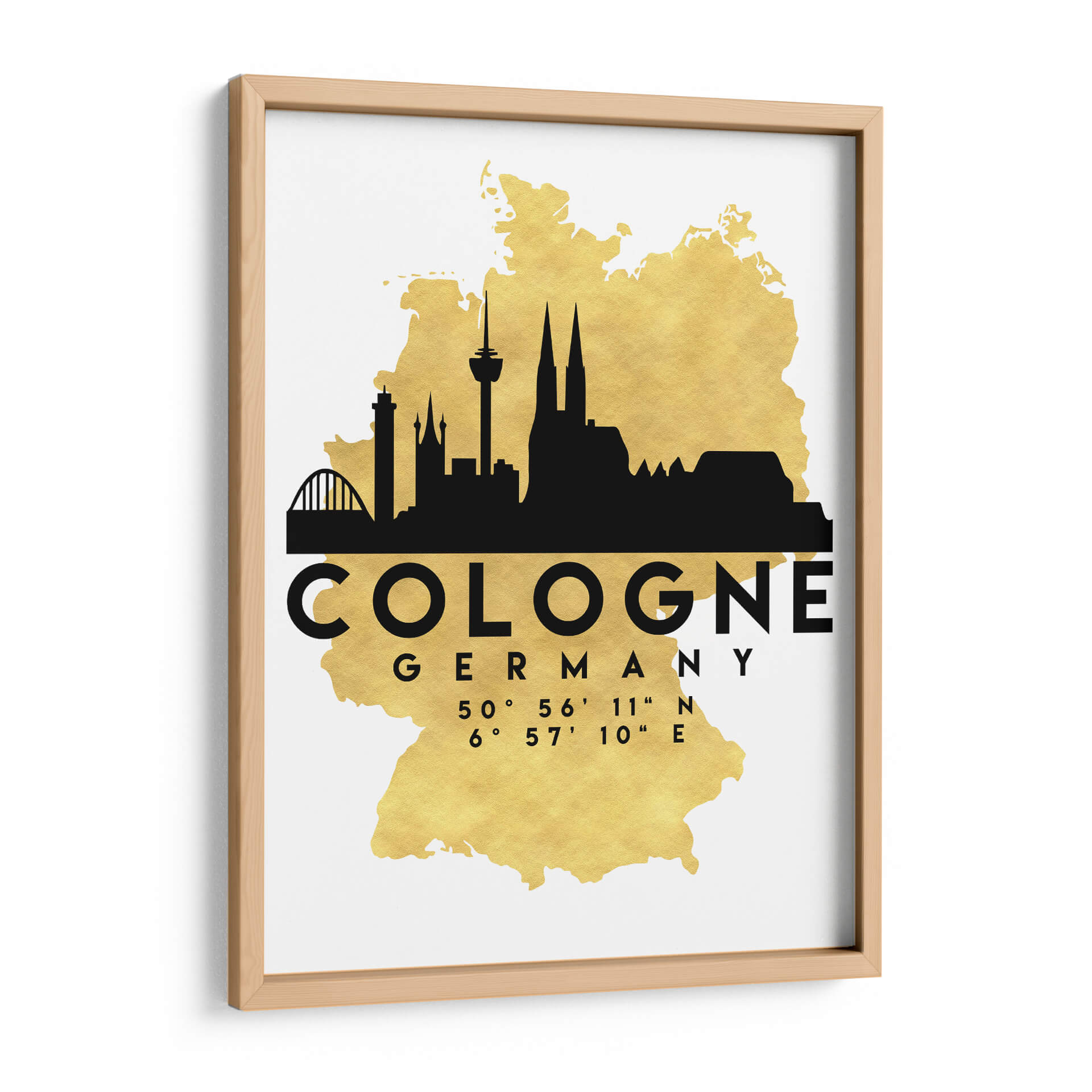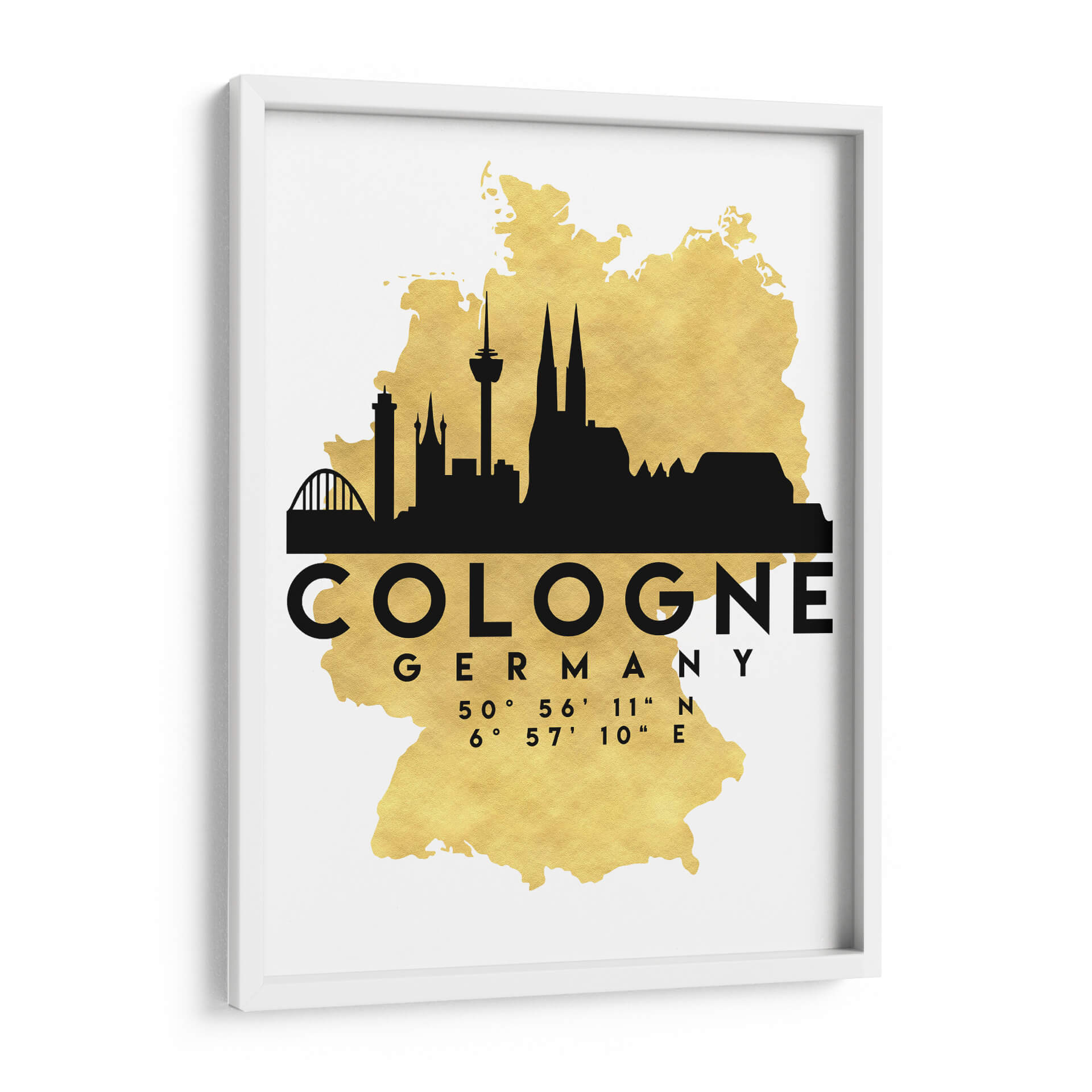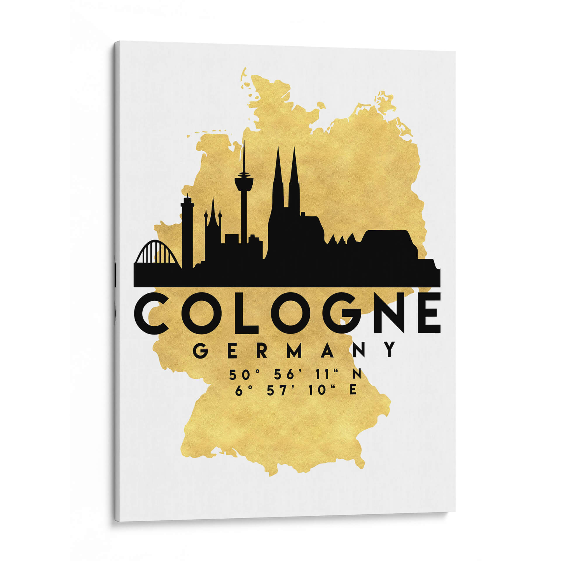 Transforma tu espacio con este impactante cuadro decorativo que captura la esencia de Colonia, Alemania. La obra presenta una silueta urbana en negro intenso superpuesta sobre un mapa estilizado de Alemania, con un llamativo acabado dorado que añade un toque de elegancia y sofisticación. Los icónicos rascacielos y la majestuosa catedral de Colonia se recortan contra este fondo brillante, creando una composición moderna y cautivadora. Los datos de latitud y longitud de la ciudad se presentan de forma discreta pero significativa, añadiendo un elemento geográfico y de detalle. Este cuadro es ideal para amantes de los viajes, arquitectos, diseñadores de interiores o cualquiera que aprecie la estética urbana y el diseño contemporáneo. Su paleta de colores, basada en el contraste del negro y el dorado sobre un fondo blanco limpio, lo hace versátil para integrarse en una amplia gama de decoraciones, desde oficinas modernas hasta salas de estar minimalistas o entradas con estilo. Aporta un aire de descubrimiento y conexión global a tu hogar u oficina con esta pieza única que celebra la arquitectura y la identidad de Colonia.