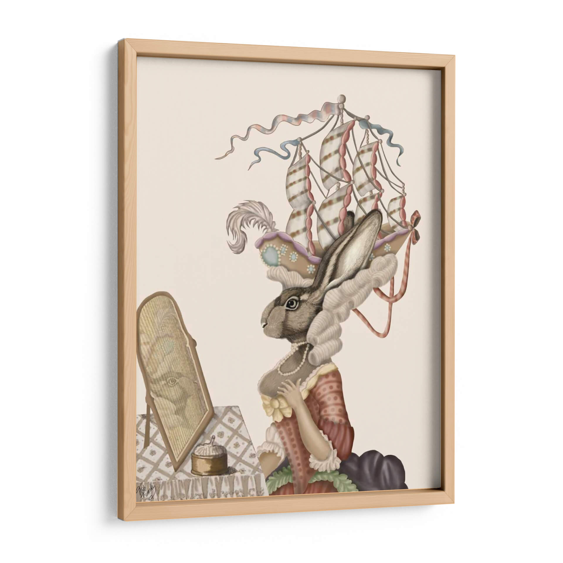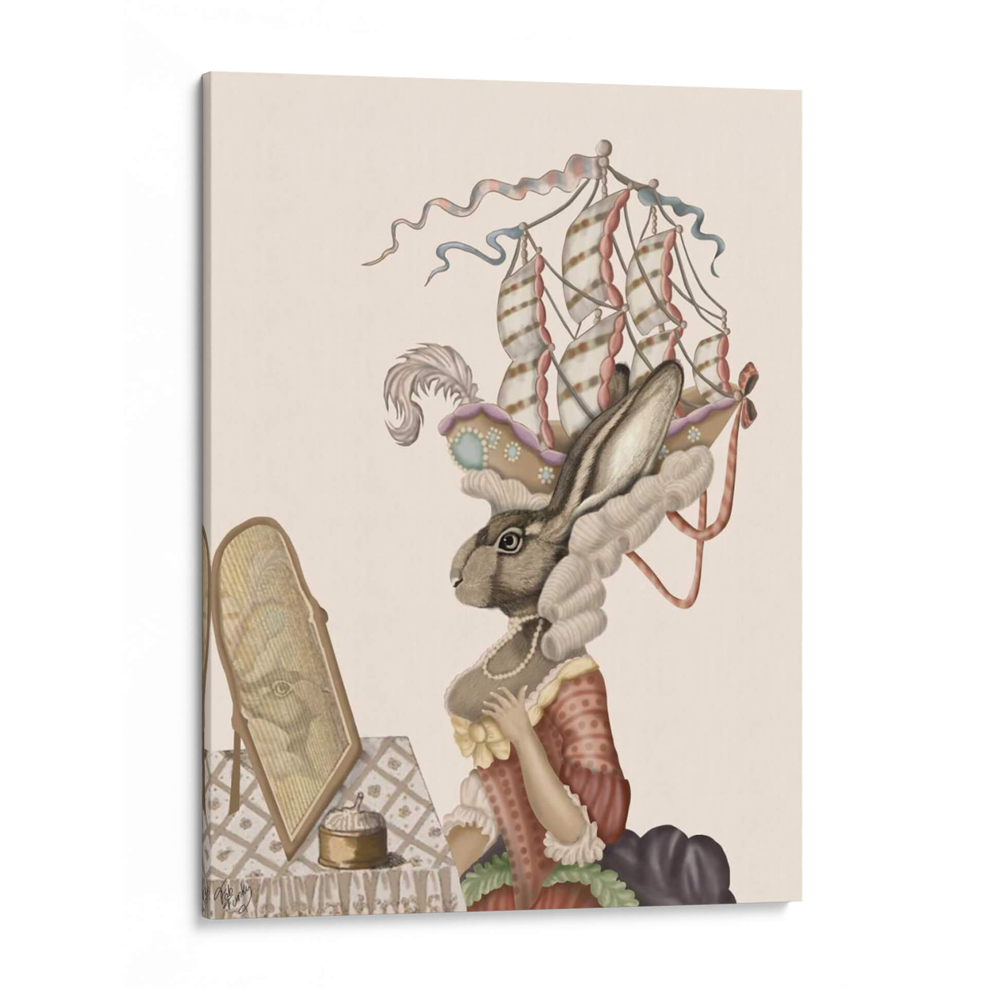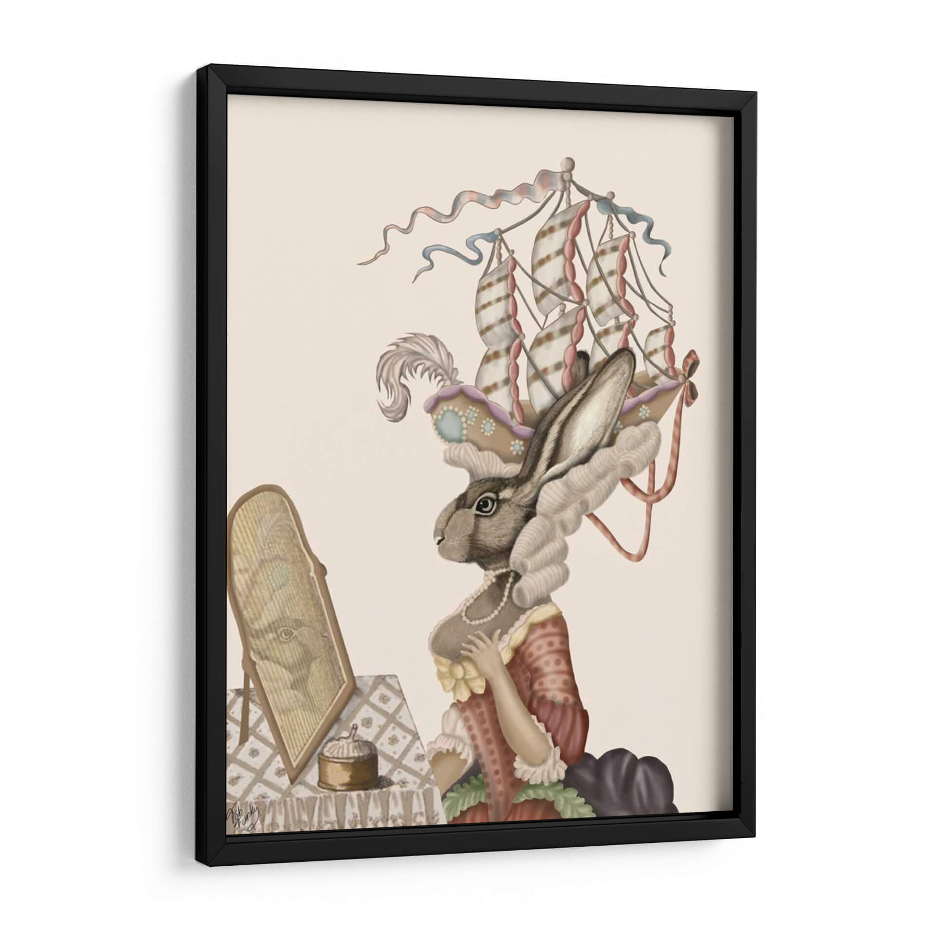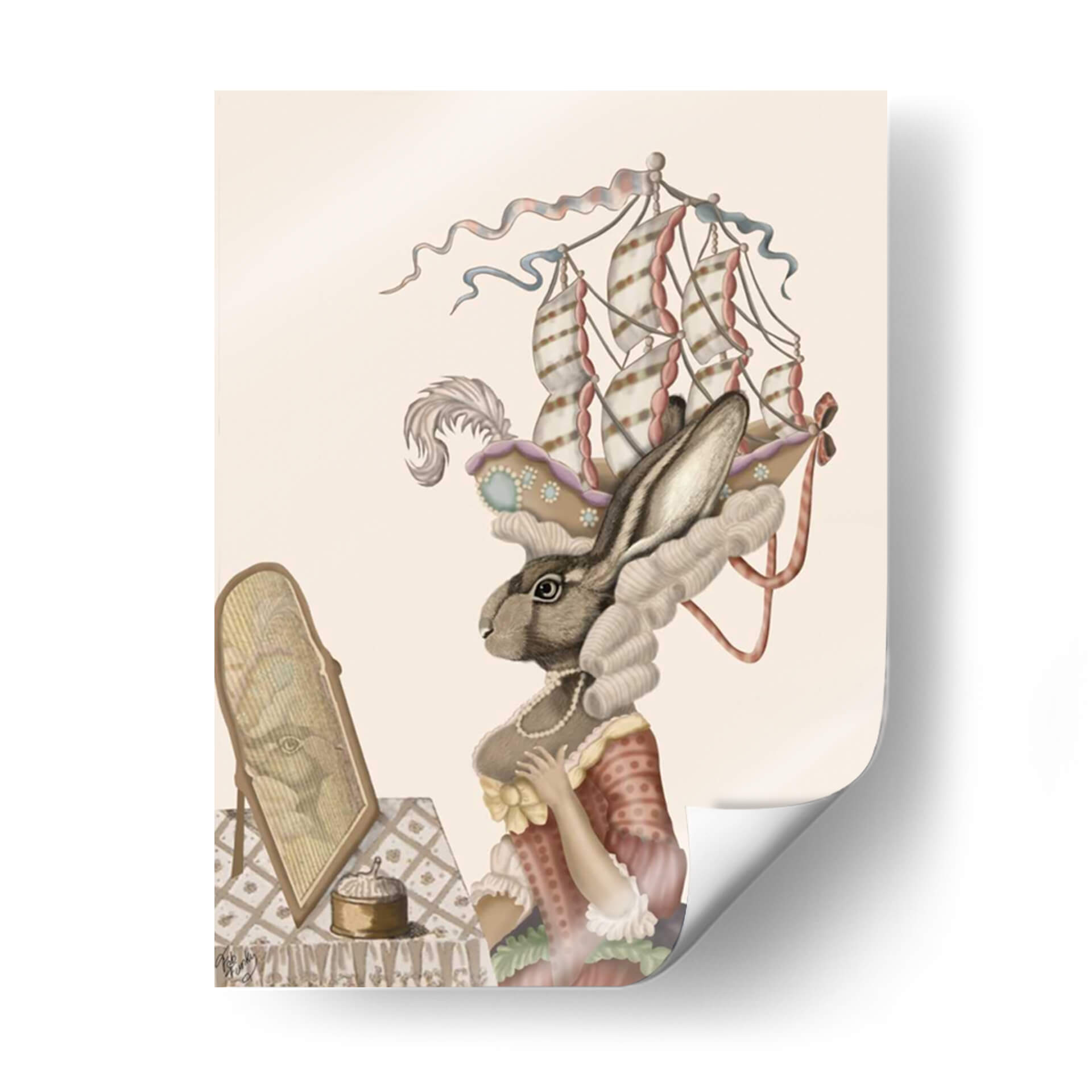Sumérgete en la fantasía con "Conejito Antoinette", una obra de arte digital que reinterpreta la elegancia del siglo XVIII a través de una lente juguetona y surrealista. Este cuadro decorativo presenta a un conejito con una vestimenta de época elaborada, coronado por un tocado que evoca la forma de un barco de vela, mientras se mira en un espejo antiguo. La paleta de colores suaves, dominada por tonos crema, rosa pálido y toques dorados, crea una atmósfera delicada y soñadora, perfecta para añadir un toque de encanto y originalidad a cualquier espacio. El estilo detallado y la composición centrada en el personaje invitan a la contemplación y la imaginación, haciendo de esta pieza un punto focal intrigante para salones, dormitorios o estudios. "Conejito Antoinette" es ideal para quienes buscan una decoración de pared que combine lo clásico con lo caprichoso, aportando un aire de sofisticación y un toque de humor sutil. Transforma tu hogar en una galería personal con este fascinante cuadro que sin duda será tema de conversación.
