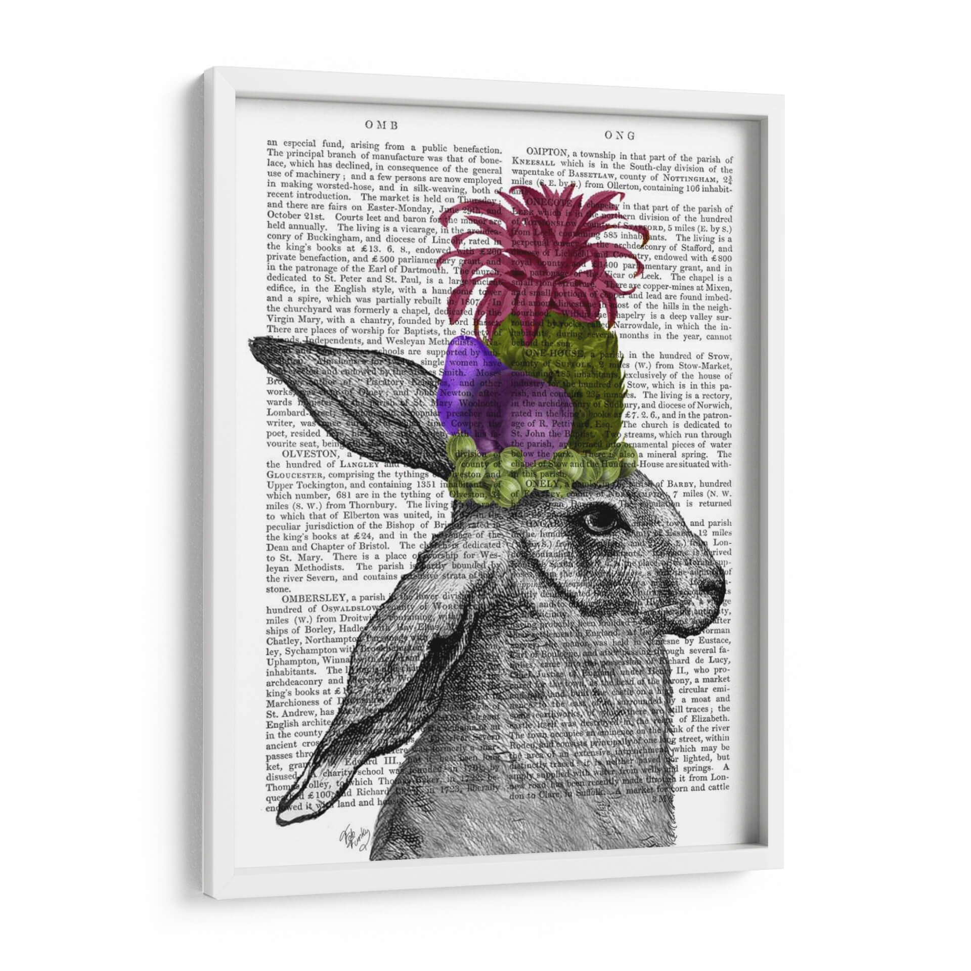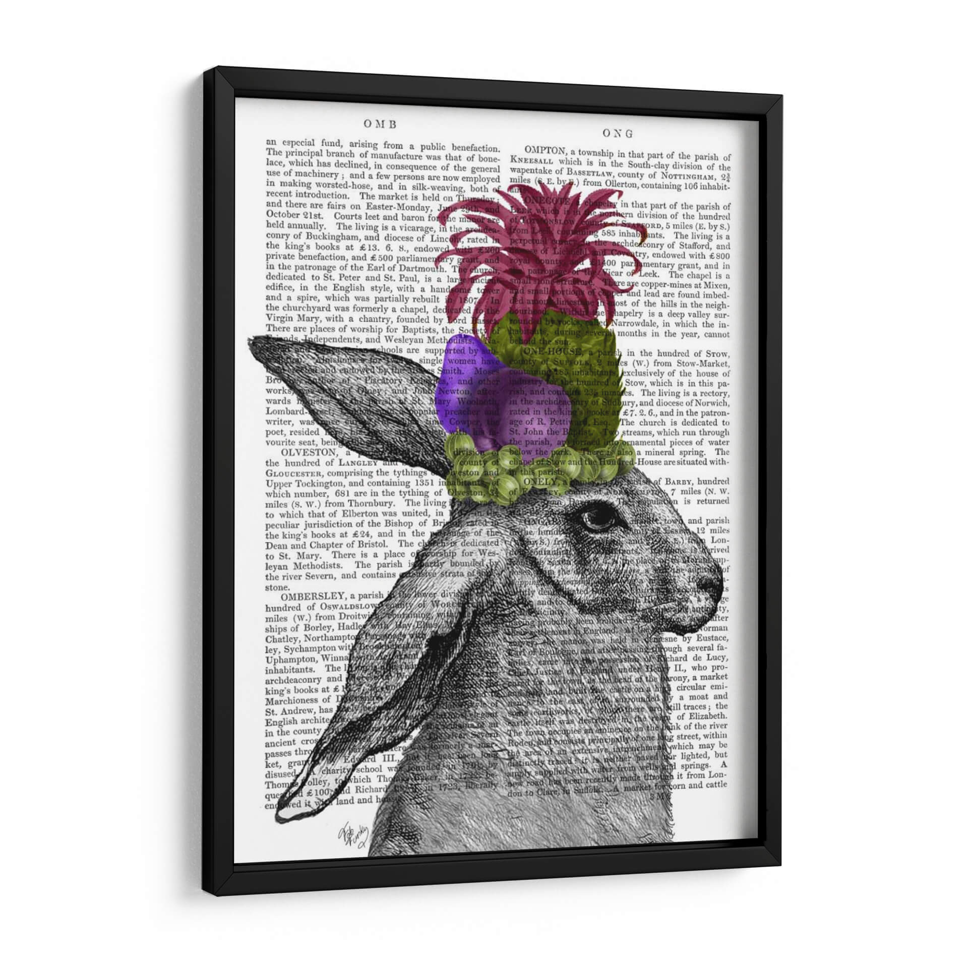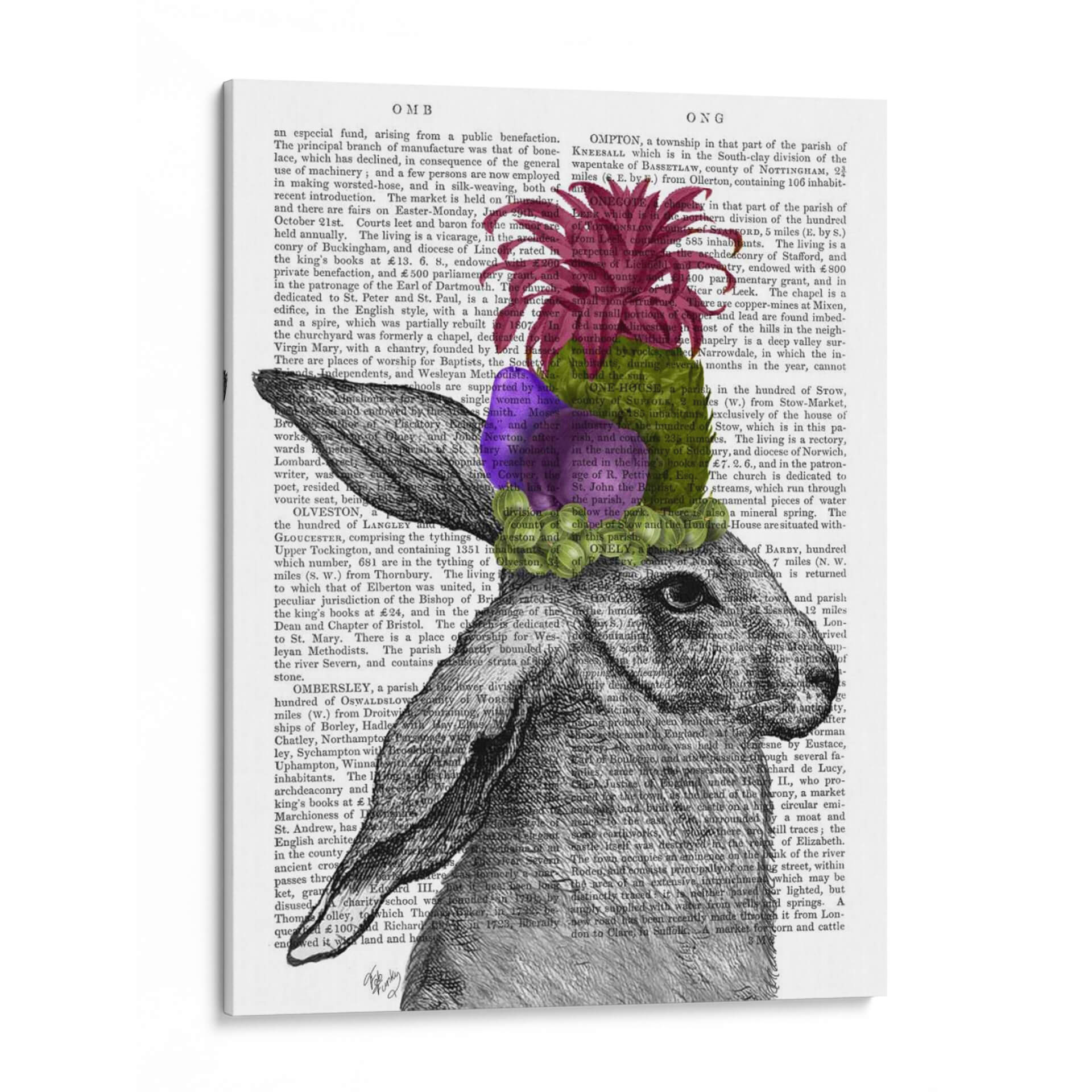 Este cautivador cuadro decorativo, titulado "Conejo, Tocado De Frutas" del artista Fab Funky, presenta una audaz y surrealista fusión de la naturaleza y la fantasía. Un conejo detallado en blanco y negro emerge de un fondo textual de aspecto antiguo, pero lo que realmente roba el protagonismo es su exuberante tocado de frutas tropicales y púrpuras vibrantes. Las piñas, granadas y otras delicias frutales se entrelazan creando un contraste visual fascinante con la paleta monocromática del animal. La composición, que combina realismo y elementos imaginativos, crea una pieza que es a la vez juguetona y sofisticada. Ideal para añadir un toque de originalidad y color a cualquier espacio, desde una sala de estar moderna hasta un estudio creativo u oficina. Este cuadro decorativo es perfecto para quienes buscan arte que dialogue, que provoque una sonrisa y que capture la atención con su singularidad. La técnica mixta, con la base de texto y la figura central detallada, ofrece una profundidad textural que enriquece la experiencia visual. Añade una dimensión inesperada a tu decoración con esta obra que celebra la imaginación y la belleza inesperada.