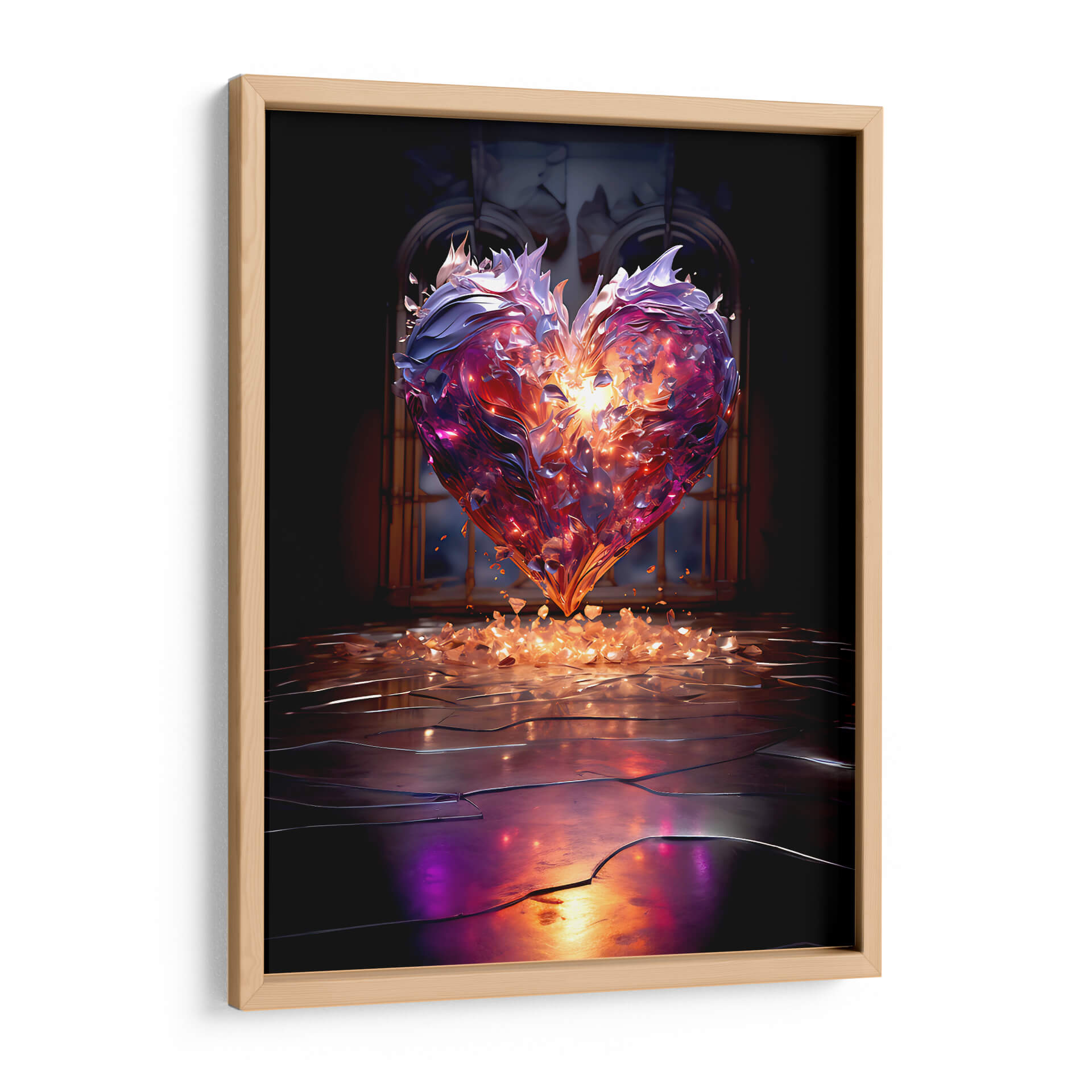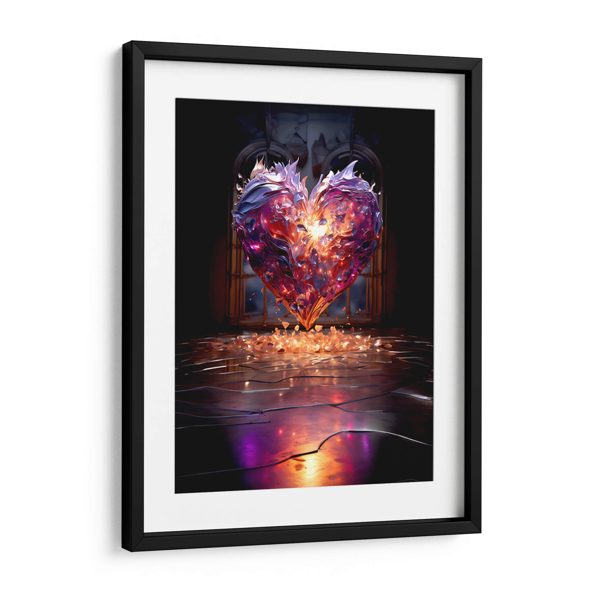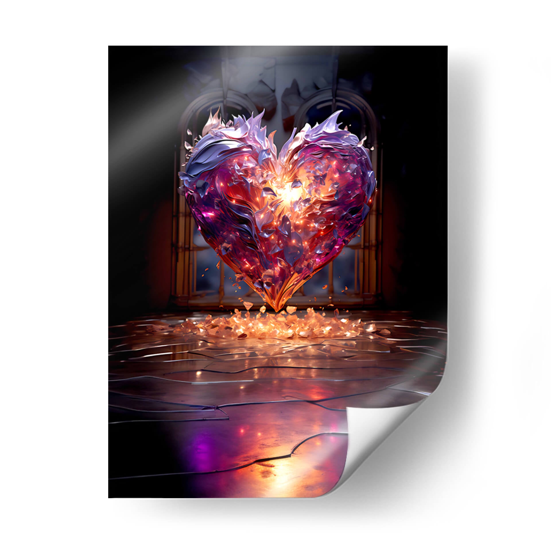 Sumérgete en la hipnotizante 'Corazón Púrpura de Cristal Roto', una obra de arte digital que trasciende lo ordinario para convertirse en un poderoso símbolo de transformación y resiliencia. La pieza presenta un corazón detallado, que parece estar hecho de cristales rotos o fragmentos de gemas, emitiendo una luz interior cálida y dorada que contrasta con los tonos fríos y profundos de púrpura y azul que lo rodean. La composición, con un fondo oscuro y arquitectónico que evoca una sensación de misterio y grandiosidad, dirige toda la atención hacia el corazón central. Pequeños fragmentos luminosos se desprenden de la figura principal, cayendo sobre una superficie reflectante que añade profundidad y un toque etéreo a la escena. El estilo digital y abstracto de DeLaVegaGaming captura la complejidad de las emociones humanas, sugiriendo que incluso en la fragmentación, existe una belleza intrínseca y una fuerza renovada. Este cuadro decorativo es perfecto para inspirar reflexión y añadir un toque de dramatismo y elegancia a cualquier espacio, ya sea una sala de estar moderna, un estudio personal o una oficina que busque un punto focal distintivo y evocador. "Corazón Púrpura de Cristal Roto" no es solo una imagen, es una experiencia visual que invita a la introspección y celebra la fuerza que emerge de la adversidad, convirtiéndose en una adición única y significativa a tu decoración.