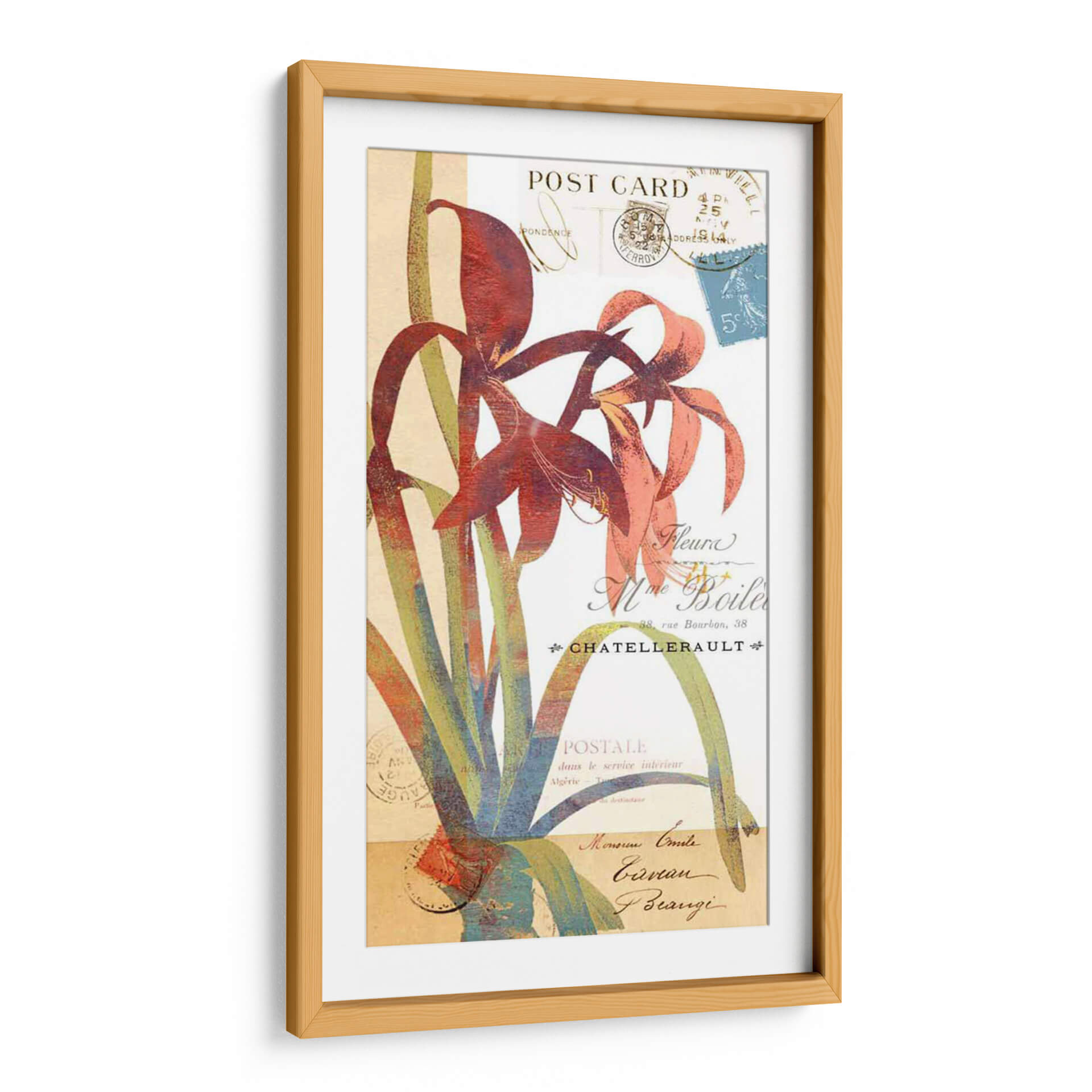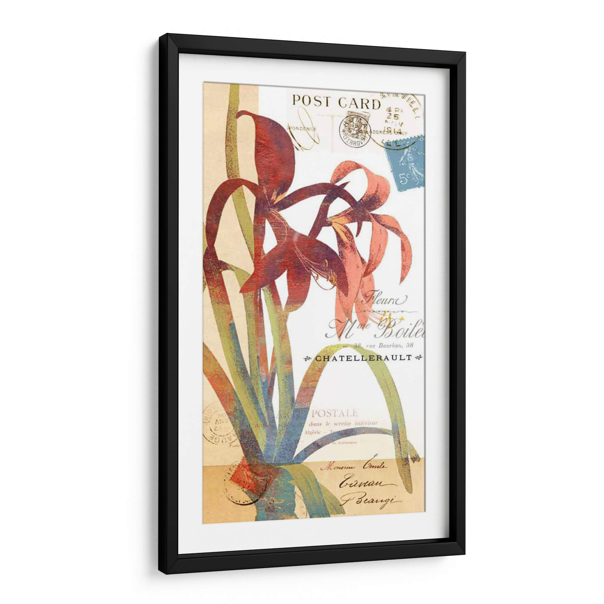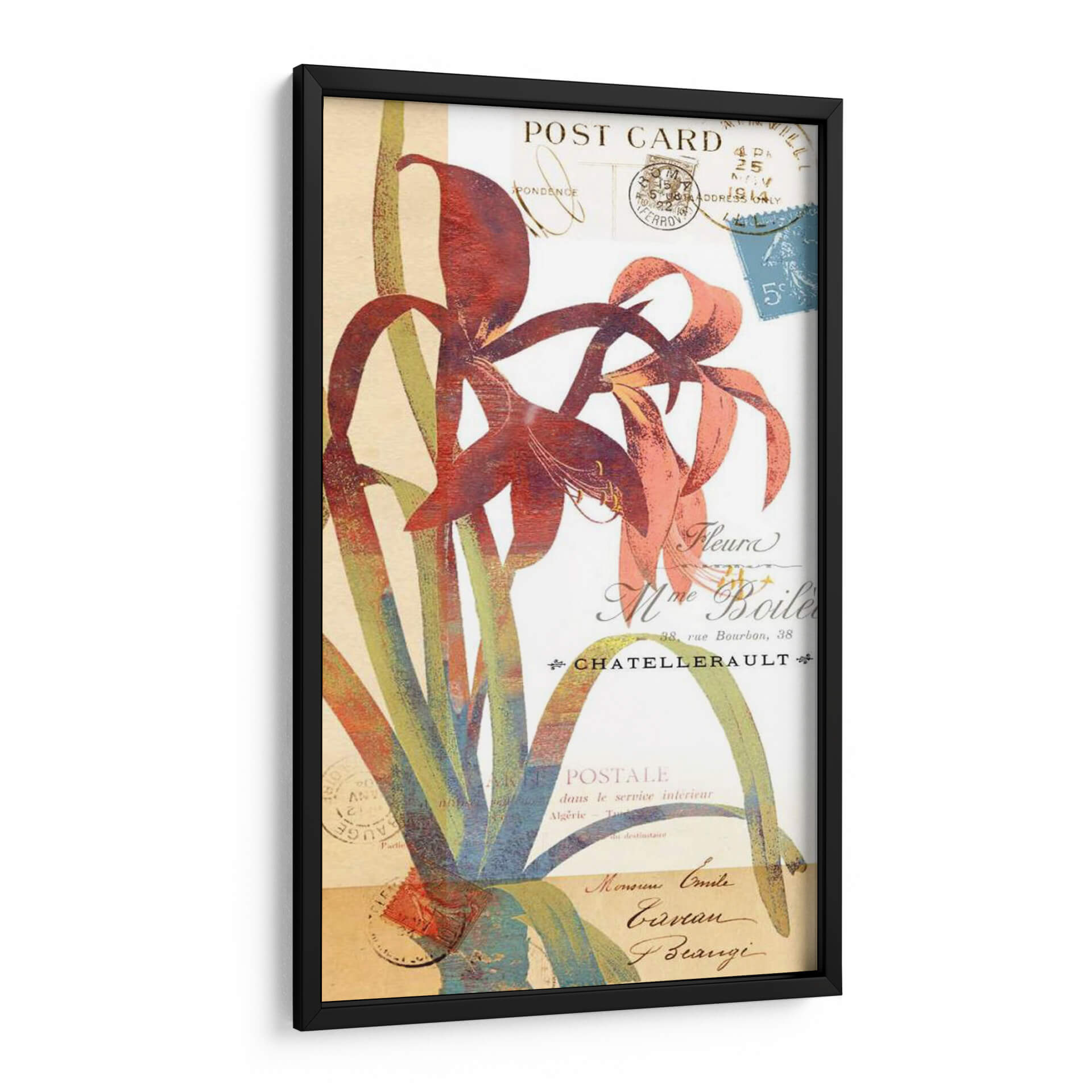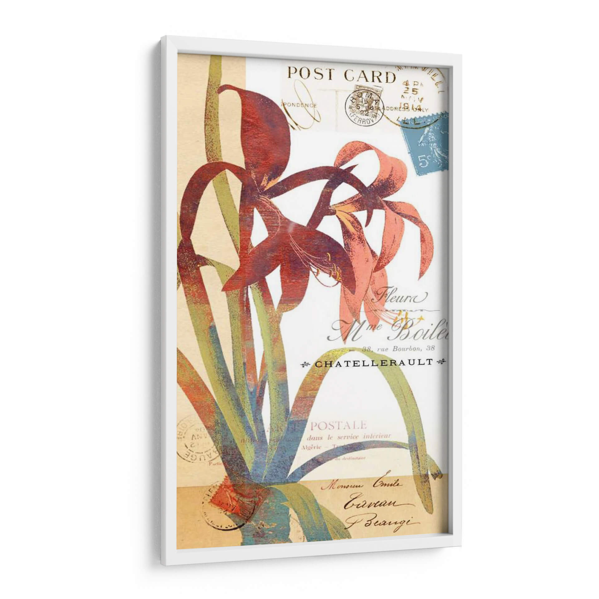 Embellece tu espacio con "Coronando Gloria II", una obra de arte que fusiona la delicadeza floral con la nostalgia de las postales antiguas. Este cuadro decorativo presenta una interpretación vibrante y estilizada de lirios en tonos rojos intensos y rosados, rodeados por un follaje verde y azulado que añade profundidad y contraste. El fondo, imitando el aspecto de una carta o postal antigua, está adornado con sellos postales y caligrafía francesa desvanecida, evocando un sentido de historia y romance. La composición, con sus líneas fluidas y colores audaces, crea un punto focal cautivador que aporta elegancia y un toque de sofisticación a cualquier habitación. Ideal para salones modernos, comedores o estudios, esta pieza inspirada en la naturaleza y la epístola transformará tu decoración, añadiendo un aire de distinción y belleza atemporal. Permite que la "Gloria" de esta obra florezca en tu hogar, creando un ambiente acogedor y lleno de carácter. Una elección perfecta para quienes aprecian el arte floral con un giro vintage y contemporáneo.
