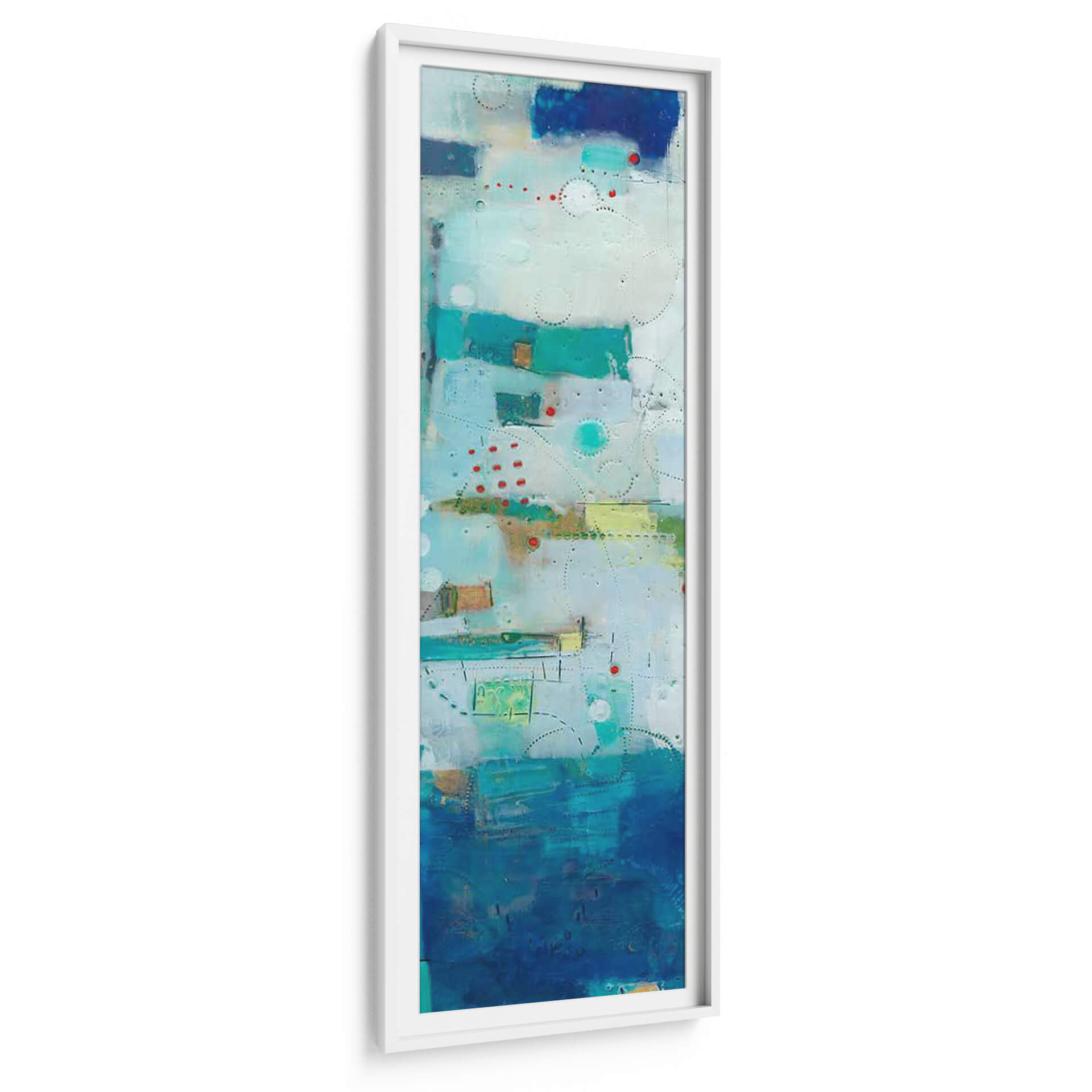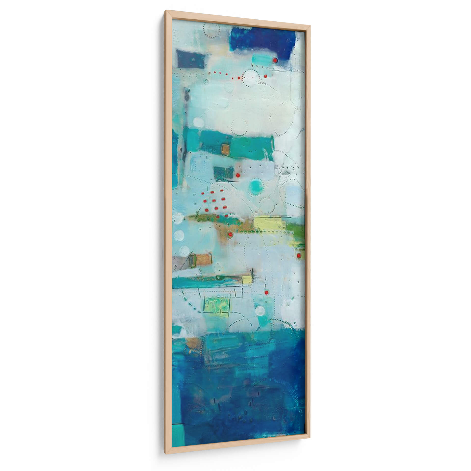 Sumérgete en la serena belleza de 'Crore I', una obra abstracta de Sue Jachimiec que captura la esencia de la tranquilidad acuática y la delicadeza. Este cuadro decorativo presenta una cautivadora paleta de azules profundos y turquesas vibrantes, salpicada con toques de blanco etéreo y sutiles acentos de color óxido y rojo intenso. Las texturas sutiles y las formas superpuestas invitan a la contemplación, mientras que los delicados puntos y líneas discontinuas añaden un elemento lúdico y dinámico a la composición. 'Crore I' evoca una sensación de calma y fluidez, como si observaras un paisaje marino abstracto o la danza de la luz sobre el agua. Su formato vertical y su composición equilibrada la hacen perfecta para añadir un toque de sofisticación moderna a cualquier espacio, desde una sala de estar luminosa hasta un sereno dormitorio o una oficina tranquila. Integra esta pieza única en tu decoración para crear un ambiente de paz y armonía, transformando tu hogar en un oasis de arte contemporáneo.