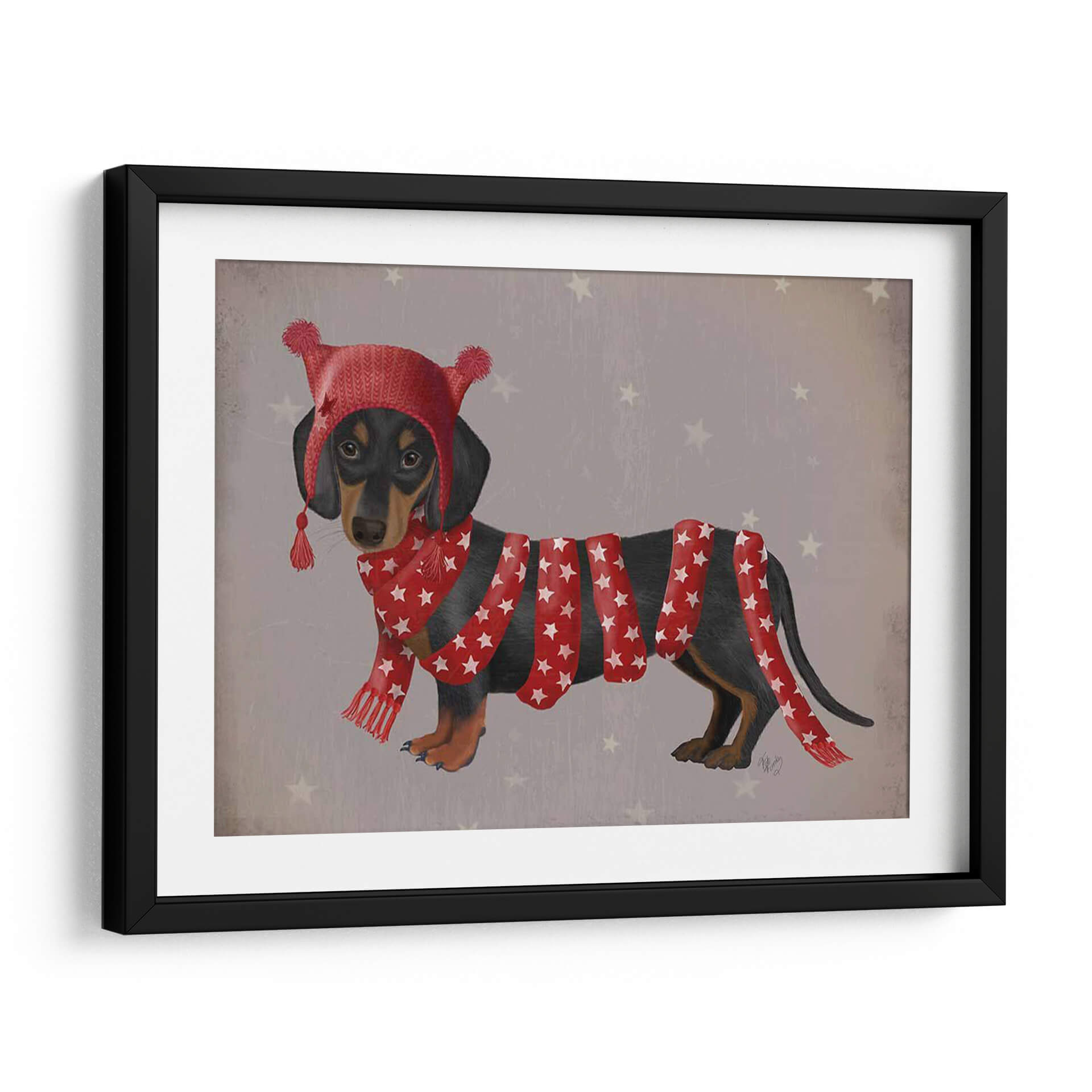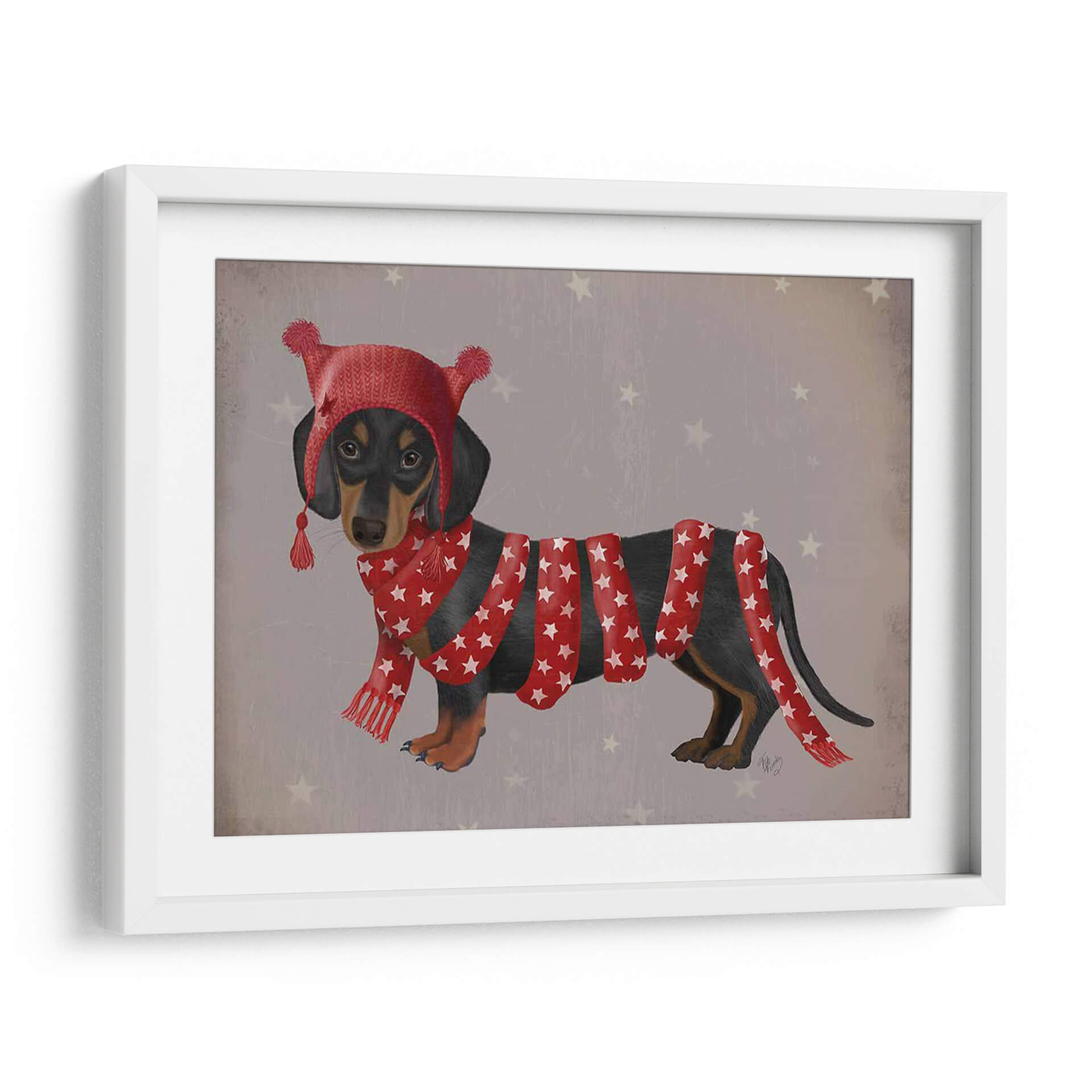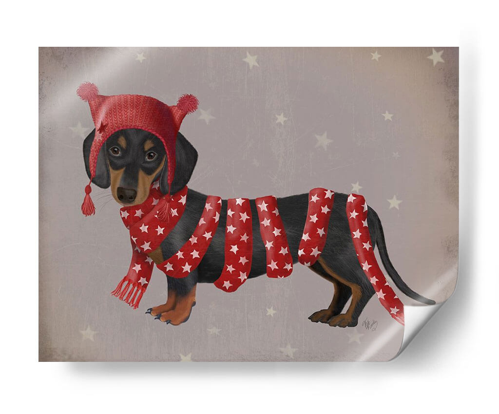 Celebra la ternura y el estilo con nuestro cuadro decorativo 'Dachshund y Larga Bufanda', una obra de arte vibrante del artista Fab Funky. Esta pieza captura la esencia juguetona y encantadora de un perro salchicha vestido con un gorro y una bufanda a juego, adornados con estrellas rojas sobre un fondo gris texturizado salpicado de estrellas pálidas. La paleta de colores, dominada por el rojo festivo y el contraste con el pelaje oscuro del dachsund y el fondo neutro, crea un ambiente alegre y acogedor. El estilo detallado y ligeramente estilizado, junto con la composición centrada en el animal, hacen de esta obra una adición cautivadora para cualquier espacio que necesite un toque de personalidad y calidez. Ideal para amantes de los animales, decoradores que buscan piezas únicas o para añadir un elemento divertido a una sala de estar, dormitorio o incluso una oficina. Este cuadro decorativo no solo embellece, sino que también evoca sentimientos de alegría y confort, convirtiéndose en un punto focal que invita a la conversación y a la sonrisa.