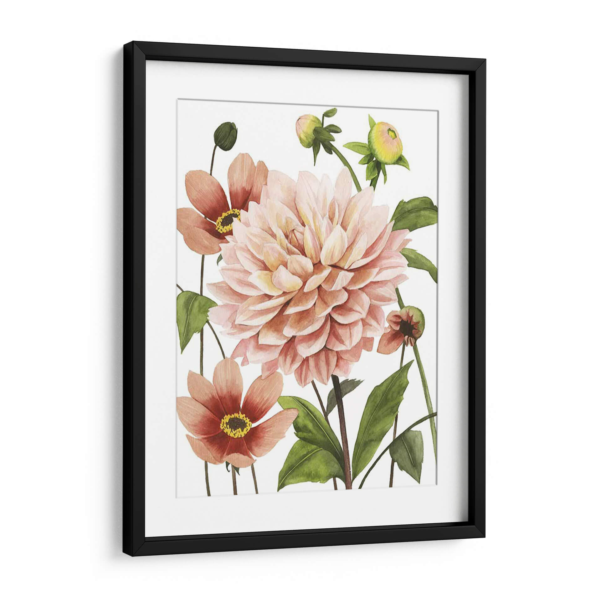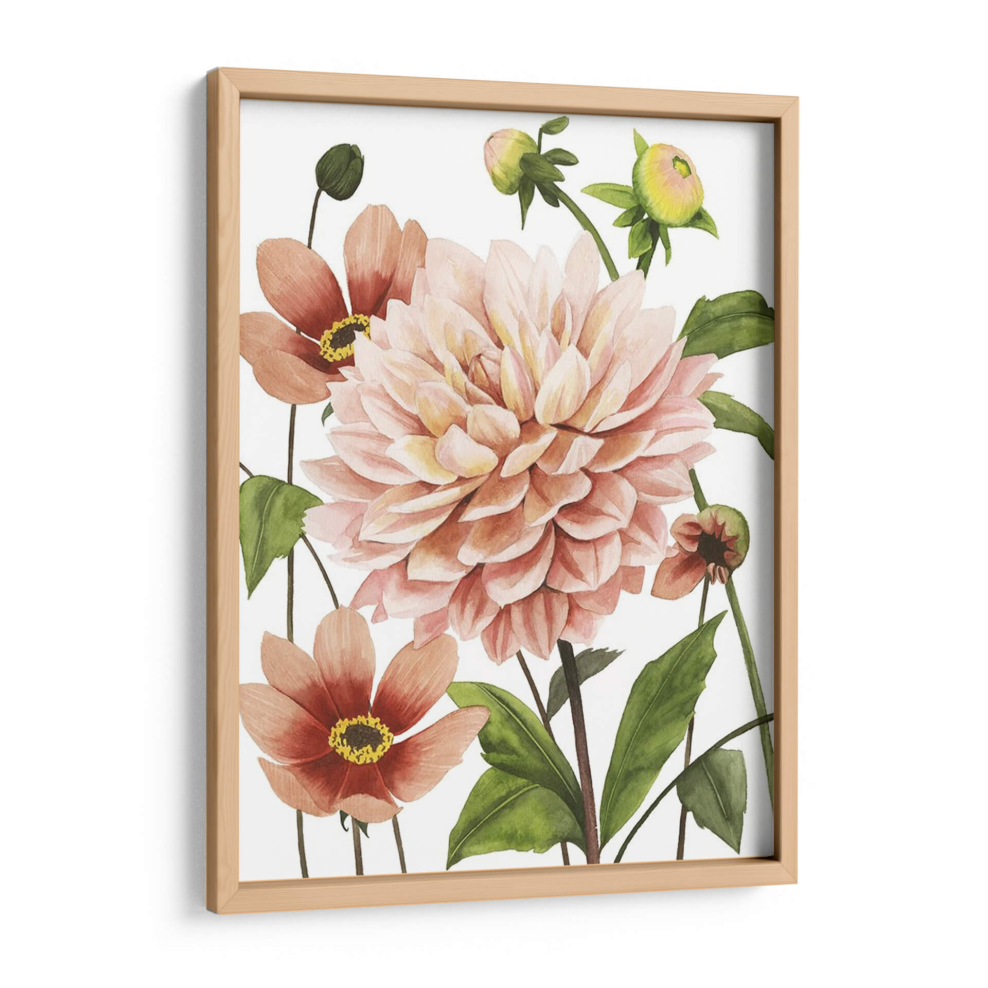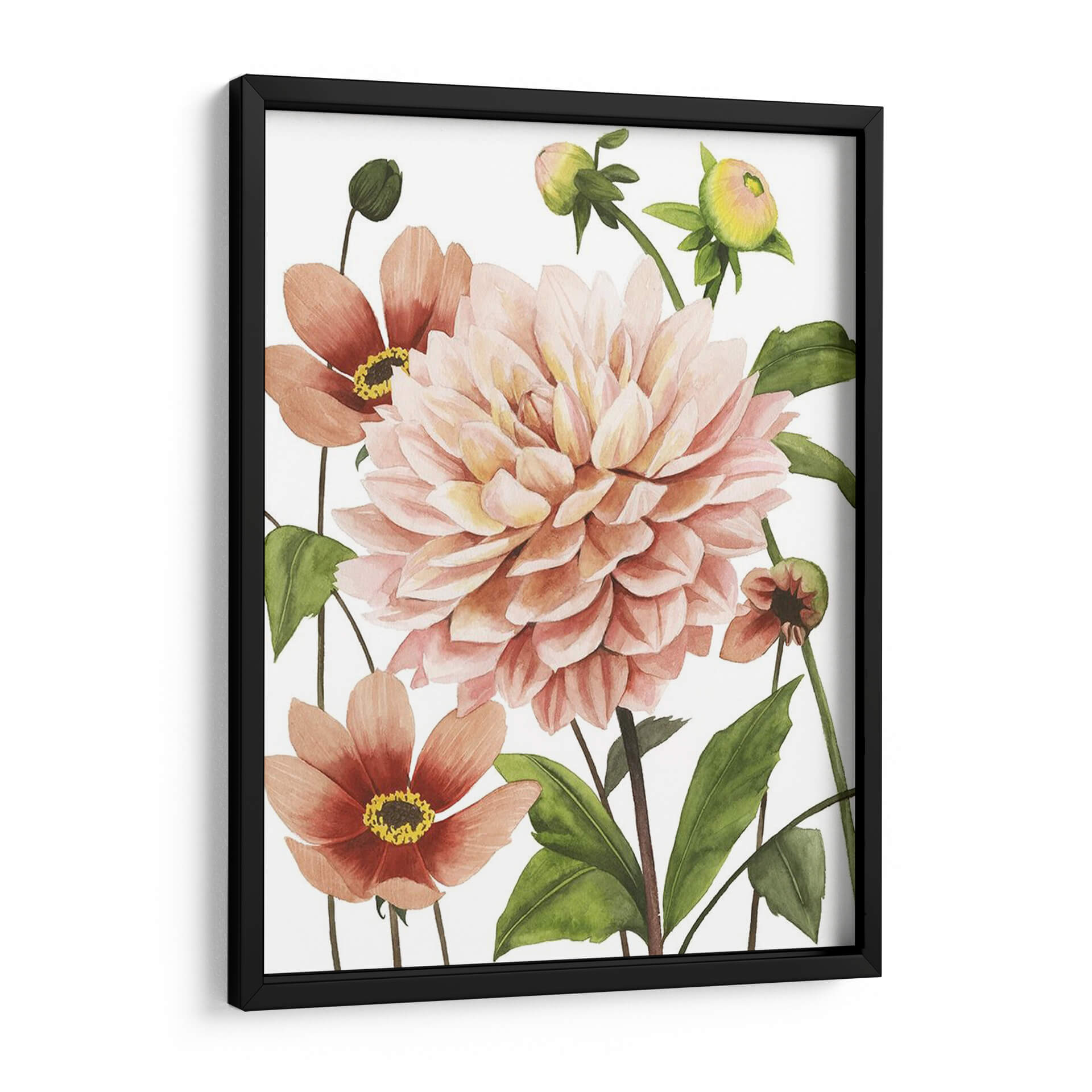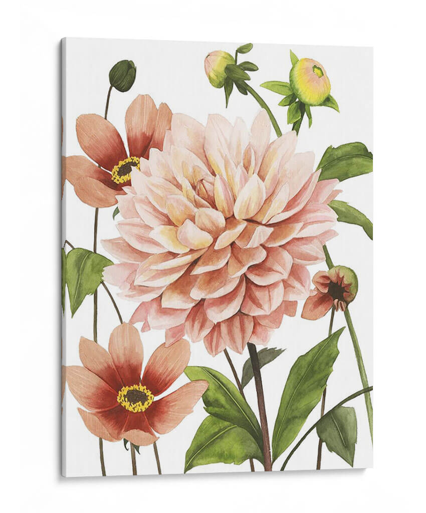 Sumérgete en la delicada belleza de "Dahlia Spell I", una obra de arte floral que captura la esencia de la naturaleza con un toque contemporáneo. Este cuadro decorativo presenta una exuberante dahlia en tonos melocotón y rosa pálido, rodeada de capullos y flores secundarias en vibrantes tonos terracota. Las hojas verdes intensas añaden profundidad y contraste, creando una composición armoniosa y llena de vida. El estilo, inspirado en la acuarela botánica, aporta una sensación de ligereza y elegancia, con pinceladas suaves que definen la forma y textura de los pétalos. La atmósfera que evoca es de serenidad, frescura y un sutil encanto primaveral. "Dahlia Spell I" es una pieza versátil, ideal para infundir calma y un toque de color orgánico en tu dormitorio, sala de estar o incluso en un espacio de trabajo que necesite un respiro natural. Este cuadro decorativo es perfecto para quienes buscan añadir un elemento botánico sofisticado y lleno de dulzura a su decoración, atrayendo miradas y generando conversaciones.