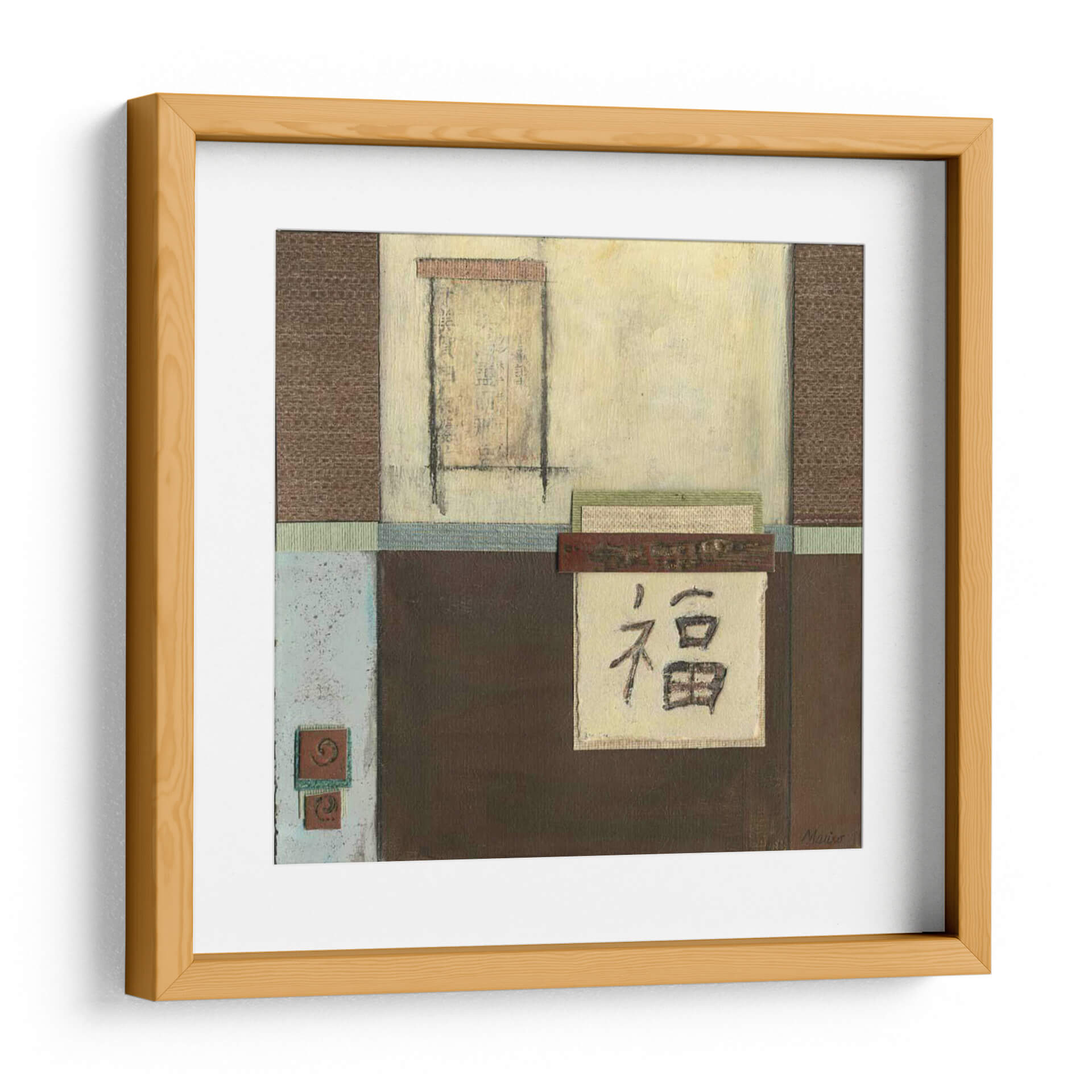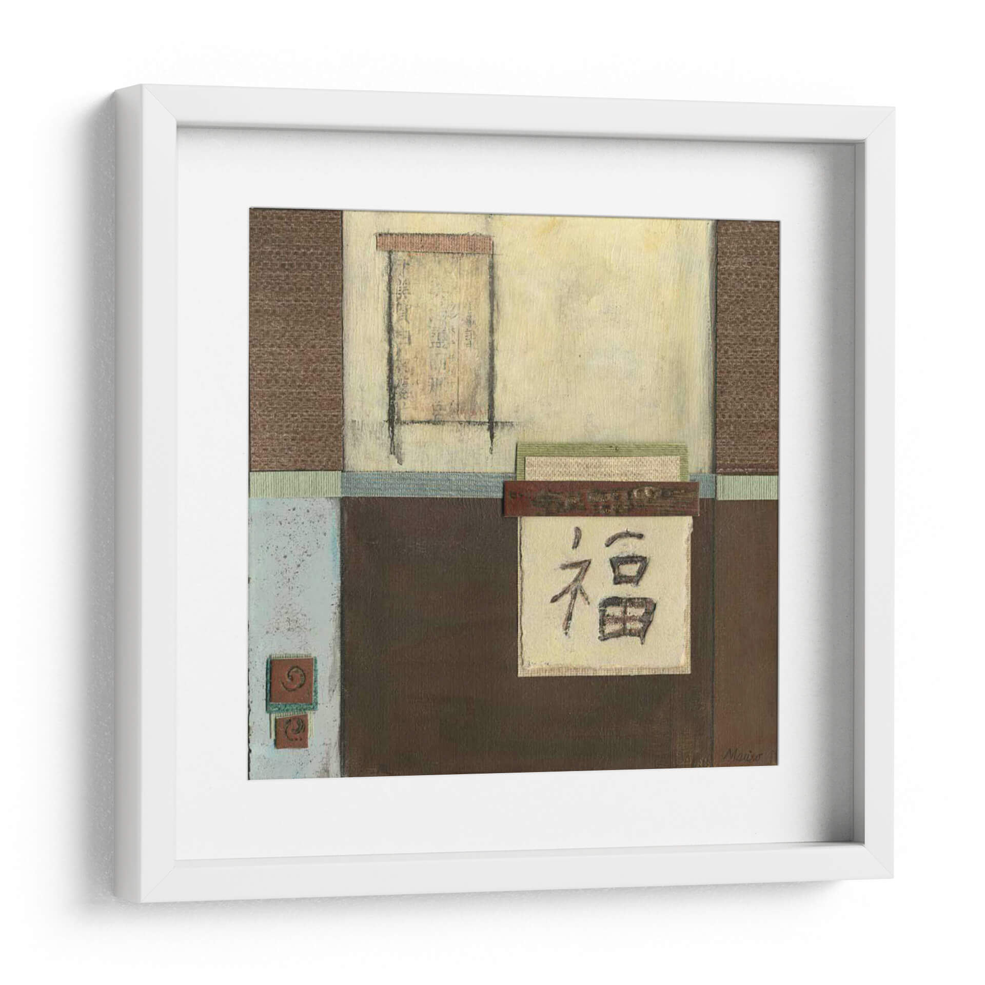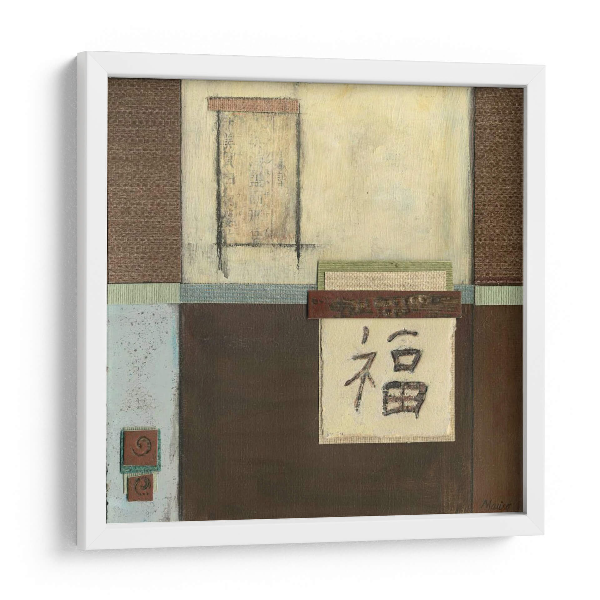 Sumérgete en la serenidad y la elegancia cultural con este cautivador cuadro decorativo "Desplazamiento Chino En Azul Ii" del artista Mauro. La obra presenta una composición abstracta inspirada en la estética oriental, con un delicado juego de texturas y colores que evocan tranquilidad y sabiduría. Predominan los tonos tierra, marrones profundos y toques de azul y crema, creando una atmósfera de calma y contemplación. El elemento central, un texto en caligrafía china (posiblemente el carácter 'fu' que significa 'felicidad' o 'fortuna'), se presenta sobre un fondo texturizado, añadiendo un toque de misterio y profundidad. Las líneas geométricas y los rectángulos superpuestos aportan una estructura sutil a la pieza, mientras que las capas de pintura y tela simulada le otorgan una riqueza visual. Este cuadro es ideal para espacios que buscan un acento de paz y un guiño a la cultura asiática, como un estudio, una sala de estar o un dormitorio minimalista. Su diseño versátil se integra a la perfección con decoraciones contemporáneas y zen, aportando un punto de interés sofisticado y atemporal. Descubre la armonía visual y el significado profundo que "Desplazamiento Chino En Azul Ii" puede aportar a tu hogar.