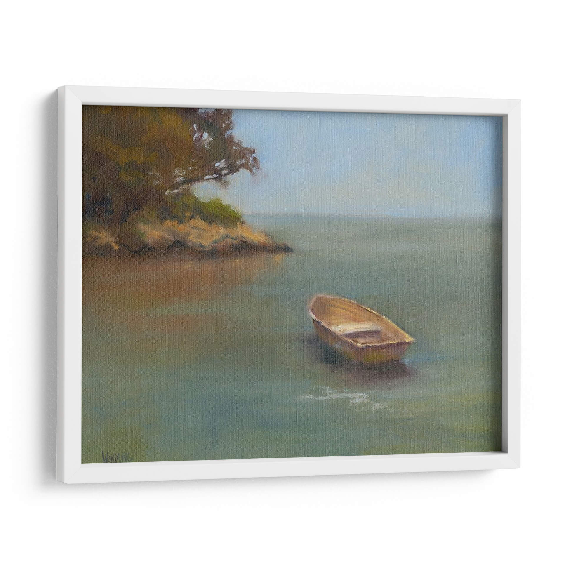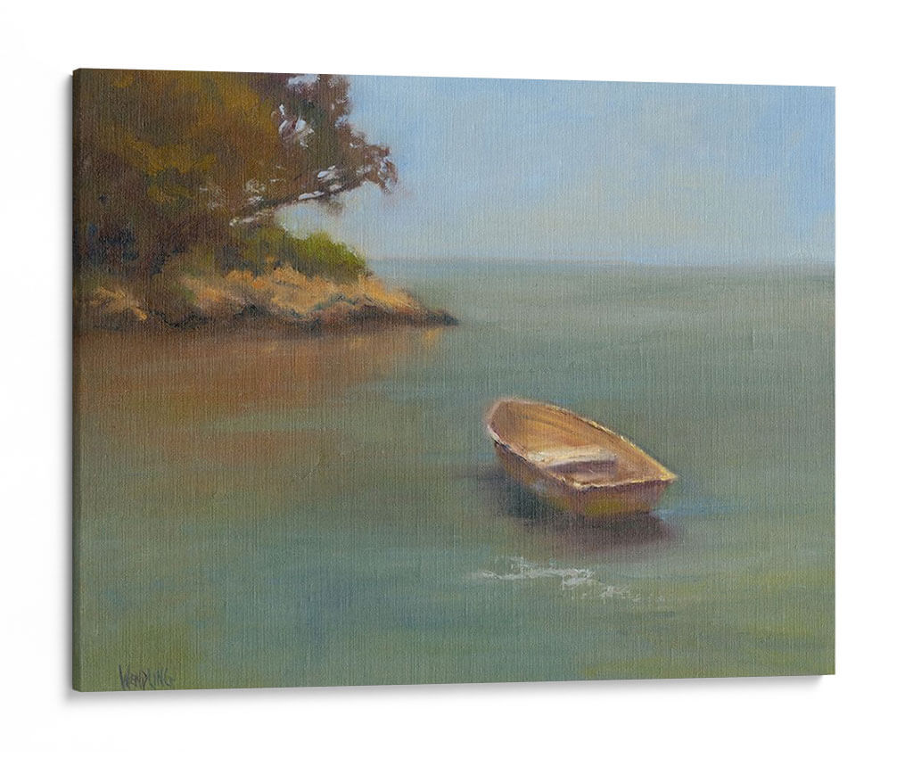 Sumérgete en la serenidad y el misterio de "Dories Albergue II", una cautivadora obra de arte de Marilyn Wendling que evoca la tranquilidad de un amanecer o atardecer en un lago sereno. La pintura presenta un bote solitario a la deriva sobre aguas calmas, reflejando una atmósfera de introspección y paz. La paleta de colores, dominada por suaves tonos verdes, azules y ocres terrosos, crea una sensación de armonía natural y una conexión profunda con la naturaleza. El estilo impresionista de Wendling se manifiesta en pinceladas sueltas que capturan la luz y la atmósfera, invitando al espectador a una experiencia contemplativa. Este cuadro decorativo es ideal para espacios que buscan transmitir calma y sofisticación, como dormitorios, estudios o salas de estar. Su composición minimalista, centrada en el bote y el paisaje sutil, ofrece un punto focal suave pero impactante, perfecto para añadir un toque de serenidad atemporal a cualquier decoración. "Dories Albergue II" no es solo una pieza decorativa, sino una ventana a un momento de quietud y reflexión, una invitación a pausar y apreciar la belleza sutil del mundo natural.