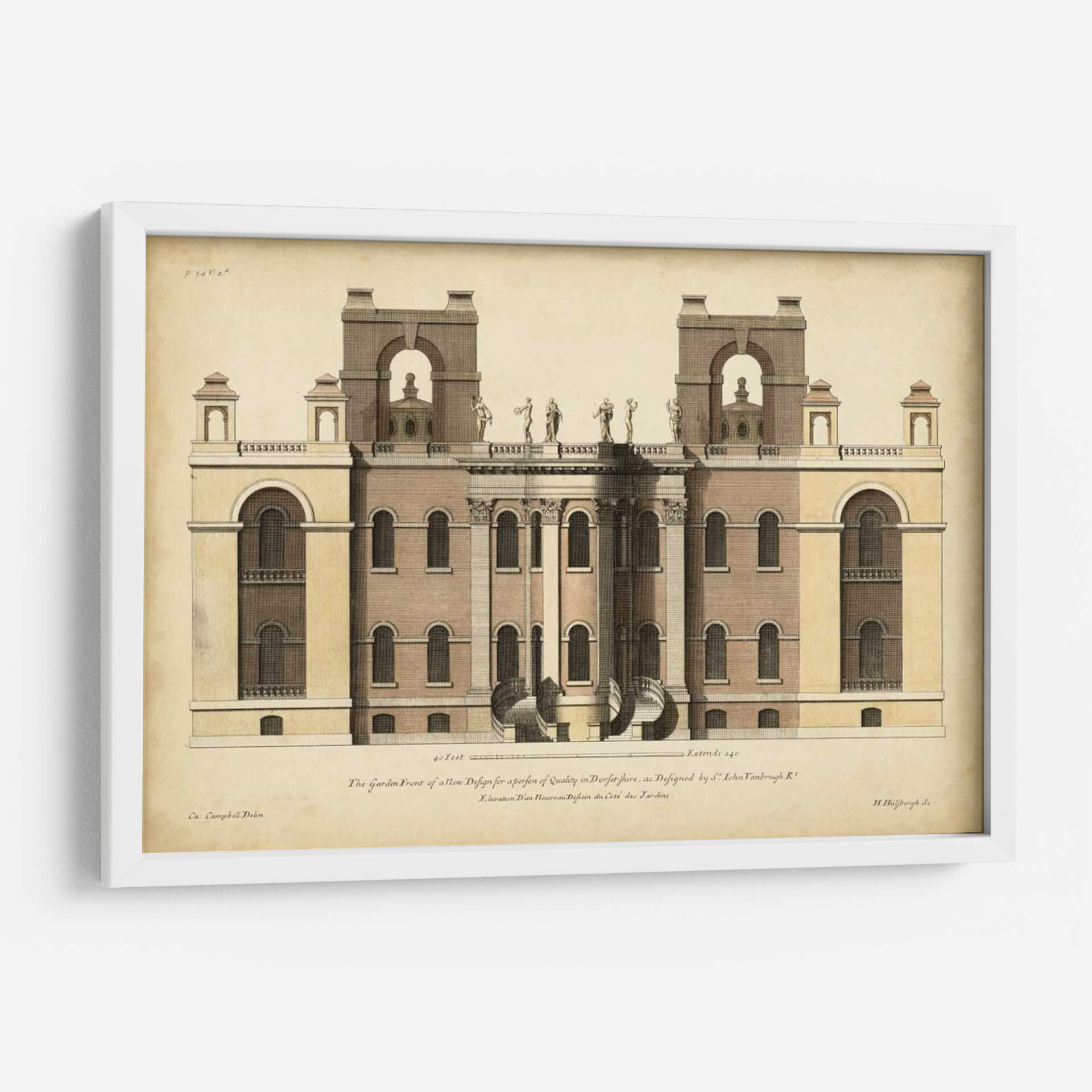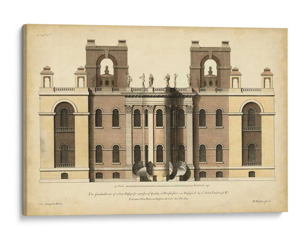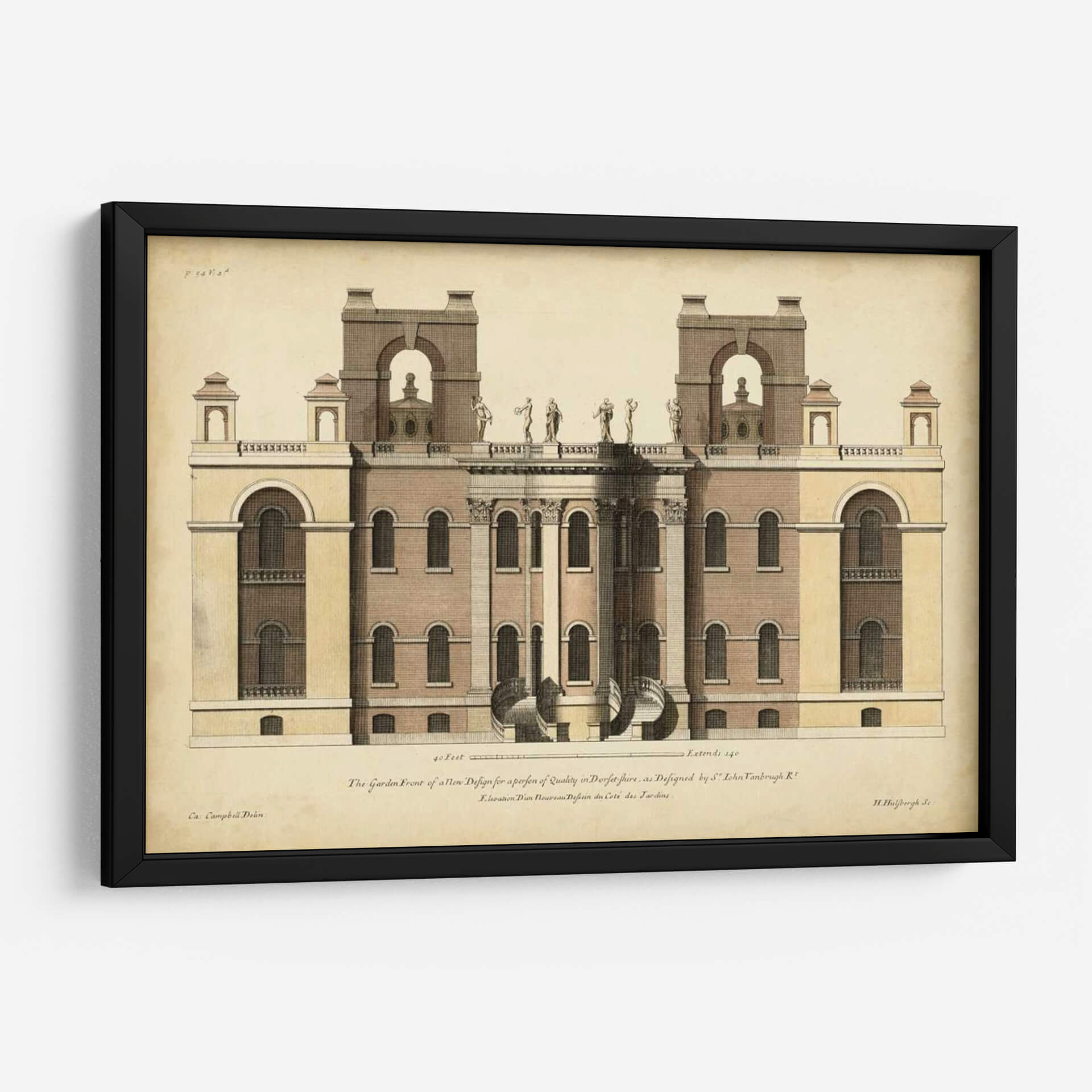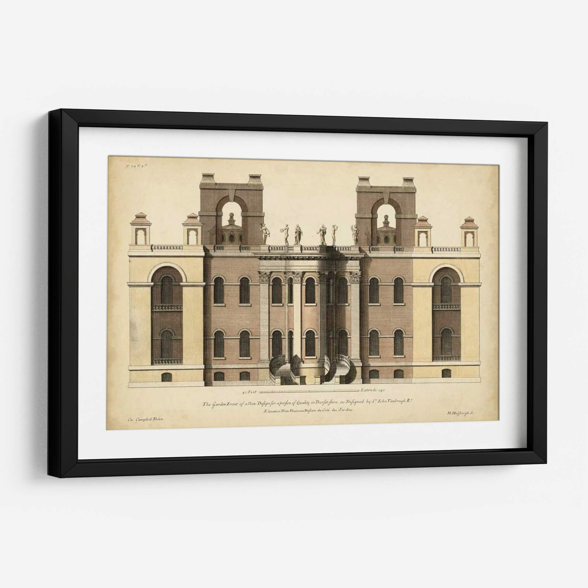 Este grabado arquitectónico detallado, titulado 'Elevación Para Un Nuevo Diseño' del artista Campbell, transporta al espectador a una era de magnificencia y diseño clásico. La obra presenta una fachada simétrica de un edificio imponente, con dos torres distintivas flanqueando una estructura central ricamente ornamentada. La paleta de colores, dominada por tonos tierra suaves, amarillos pálidos y detalles en ladrillo, evoca una sensación de historia y elegancia atemporal. Las líneas precisas y la perspectiva meticulosa resaltan la maestría del artista en la representación arquitectónica, invitando a contemplar la escala y la complejidad del diseño. Las pequeñas estatuas que coronan la cornisa añaden un toque de vida y detalle escultural, sugiriendo una conexión con el arte y la cultura. Ideal para espacios que buscan una declaración de sofisticación y un guiño a la historia de la arquitectura, este cuadro decorativo añade profundidad y carácter a cualquier sala de estar, estudio u oficina, sirviendo como un punto focal de inspiración y admiración.