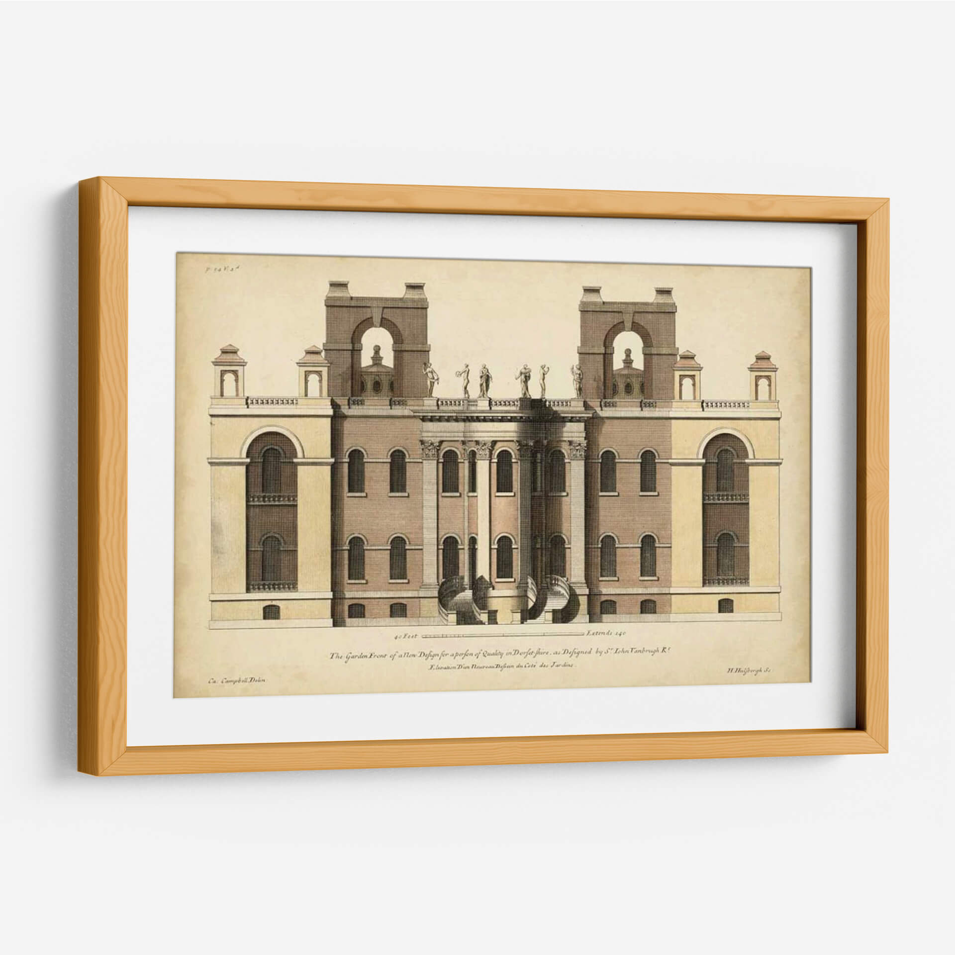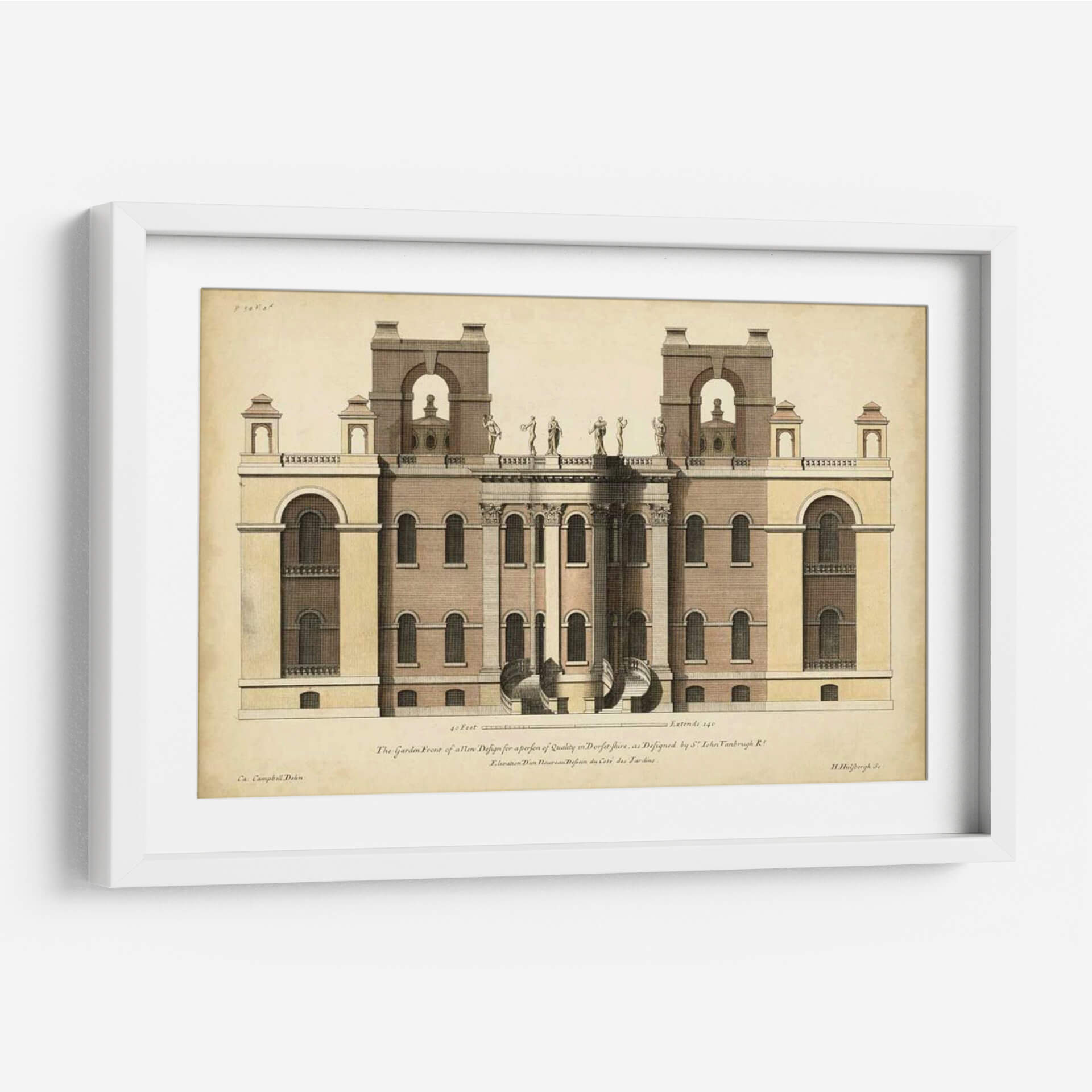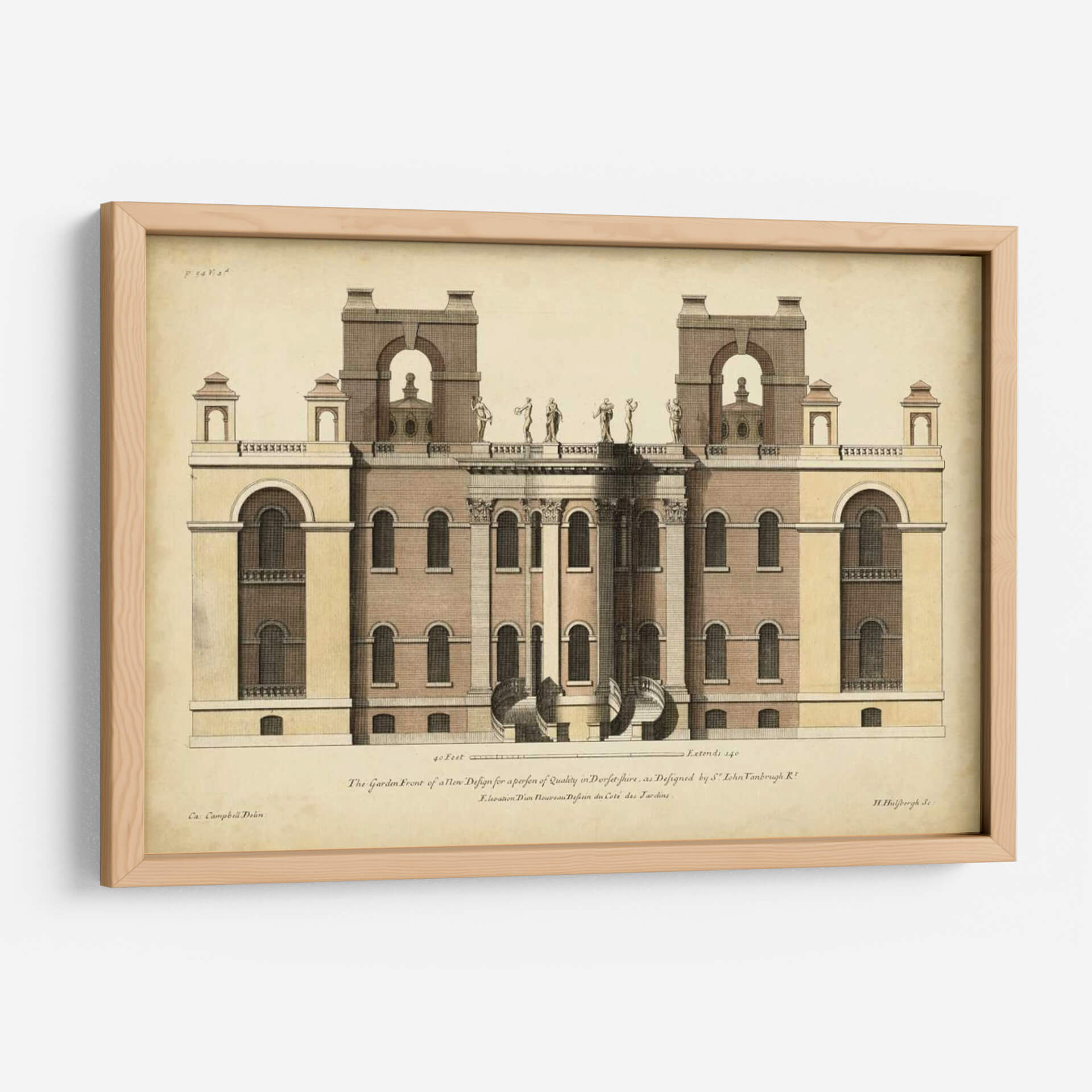 Este grabado arquitectónico detallado, titulado 'Elevación Para Un Nuevo Diseño' del artista Campbell, transporta al espectador a una era de magnificencia y diseño clásico. La obra presenta una fachada simétrica de un edificio imponente, con dos torres distintivas flanqueando una estructura central ricamente ornamentada. La paleta de colores, dominada por tonos tierra suaves, amarillos pálidos y detalles en ladrillo, evoca una sensación de historia y elegancia atemporal. Las líneas precisas y la perspectiva meticulosa resaltan la maestría del artista en la representación arquitectónica, invitando a contemplar la escala y la complejidad del diseño. Las pequeñas estatuas que coronan la cornisa añaden un toque de vida y detalle escultural, sugiriendo una conexión con el arte y la cultura. Ideal para espacios que buscan una declaración de sofisticación y un guiño a la historia de la arquitectura, este cuadro decorativo añade profundidad y carácter a cualquier sala de estar, estudio u oficina, sirviendo como un punto focal de inspiración y admiración.