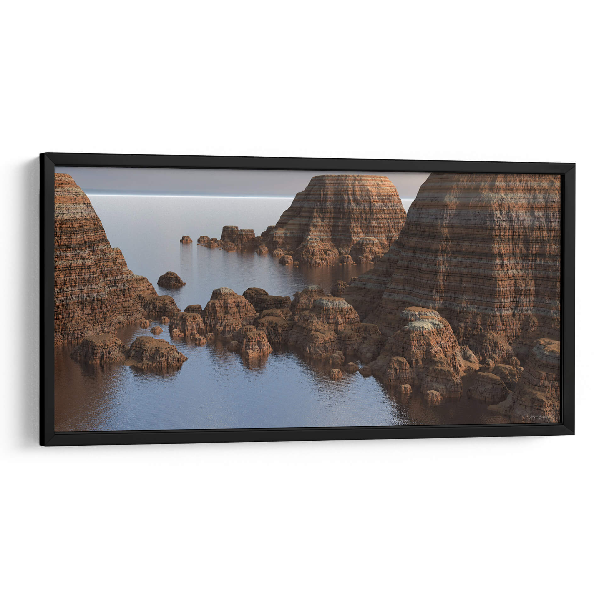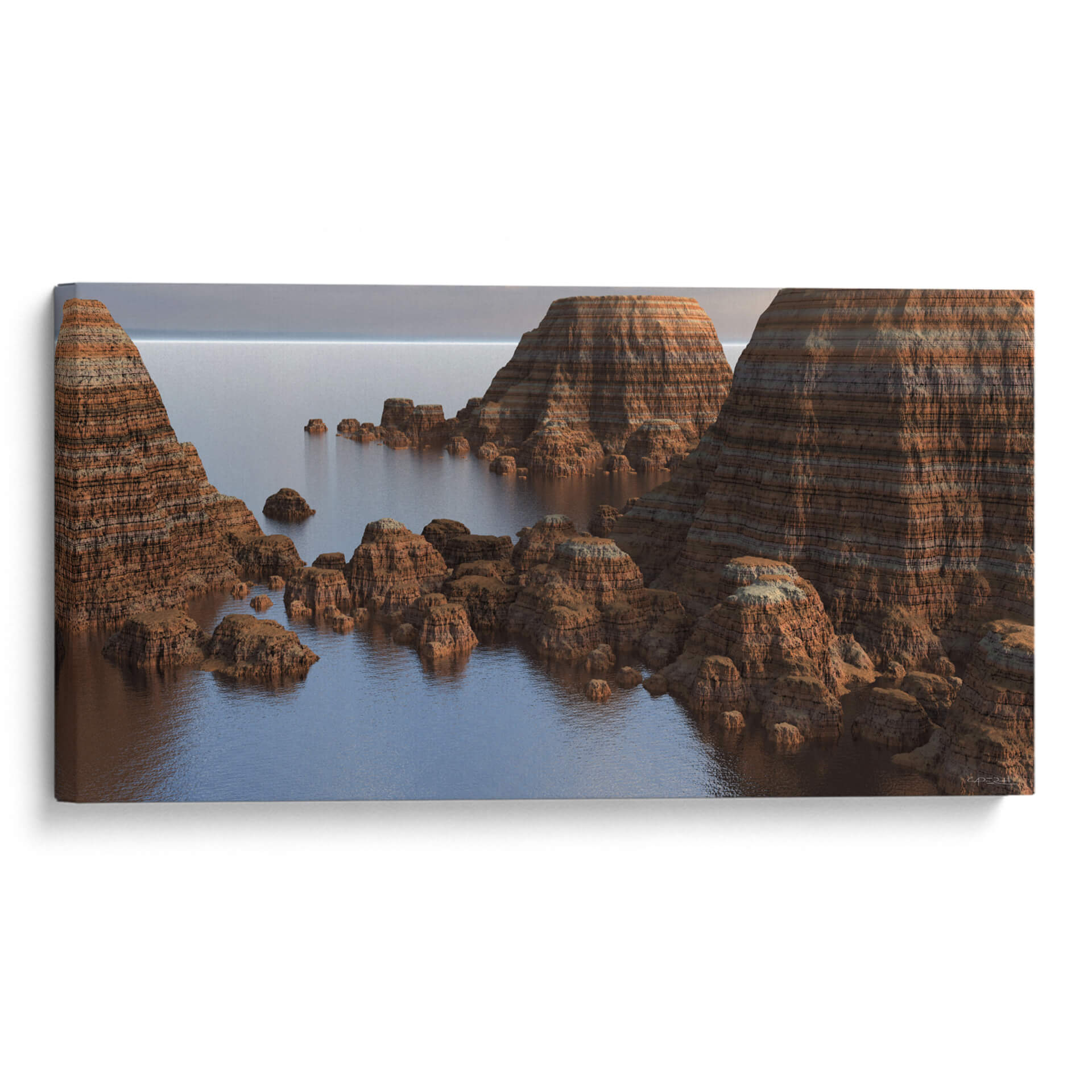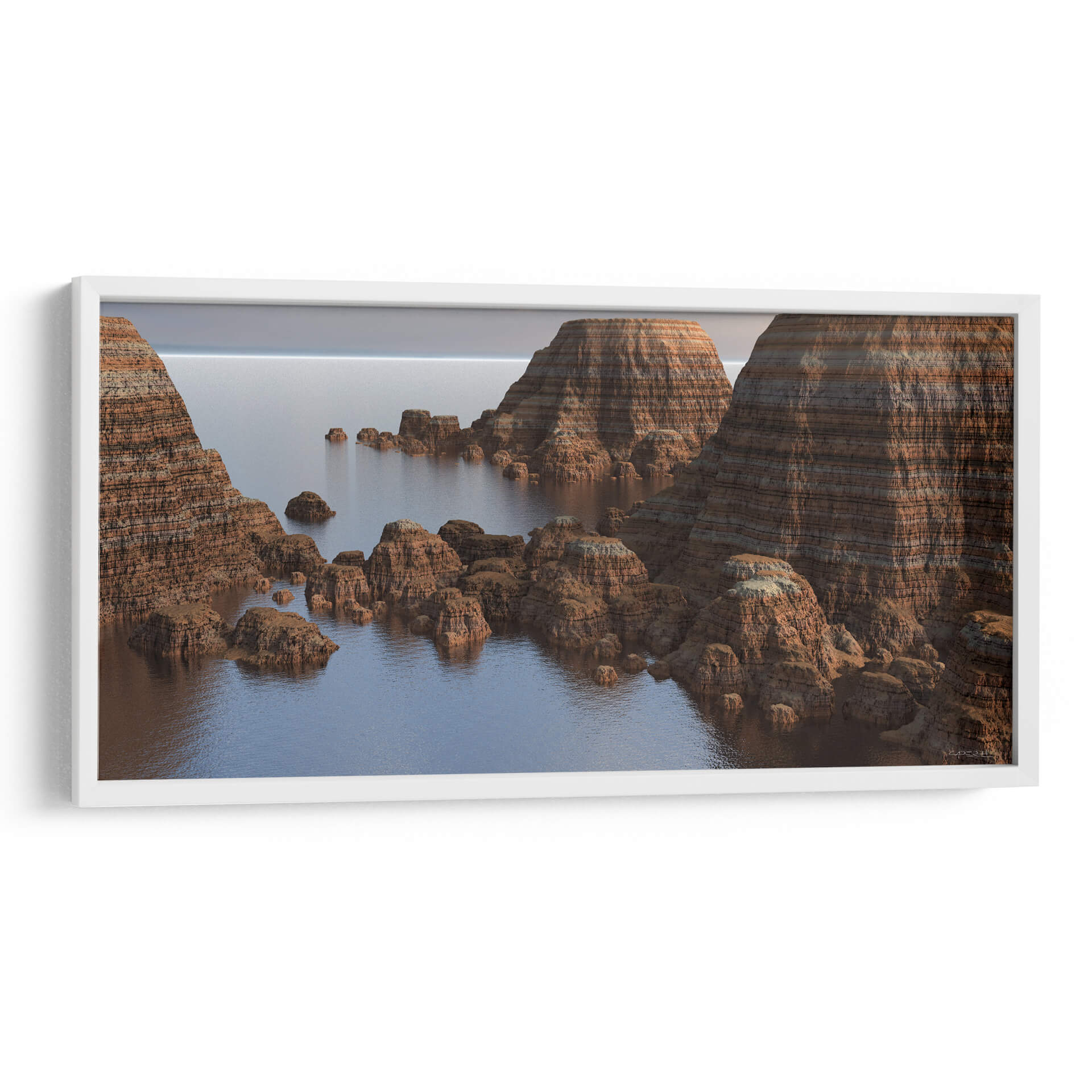 Adéntrate en un paisaje de ensueño con "En algún lugar del planeta", una obra de arte digital del artista Caperh. Este cuadro decorativo captura la majestuosidad de formaciones rocosas erosionadas emergiendo de un mar sereno. La paleta de colores, dominada por tonos tierra, ocres y grises, crea una atmósfera de calma y contemplación, invitando a la introspección. Las texturas detalladas de las rocas y el reflejo sutil en el agua añaden profundidad y realismo a esta escena etérea. Su composición panorámica, con las imponentes formaciones rocosas como protagonistas, es ideal para convertirse en el punto focal de cualquier espacio, aportando una sensación de tranquilidad y conexión con la naturaleza. Perfecto para salones, estudios u oficinas que buscan un toque de serenidad y elegancia. Este cuadro decorativo es una invitación a la exploración y al descubrimiento de lugares remotos, evocando la majestuosidad de paisajes inexplorados. El estilo abstracto-realista de Caperh permite una interpretación personal, haciendo de cada mirada una nueva experiencia. Añade una pieza de arte que inspire paz y asombro a tu hogar.