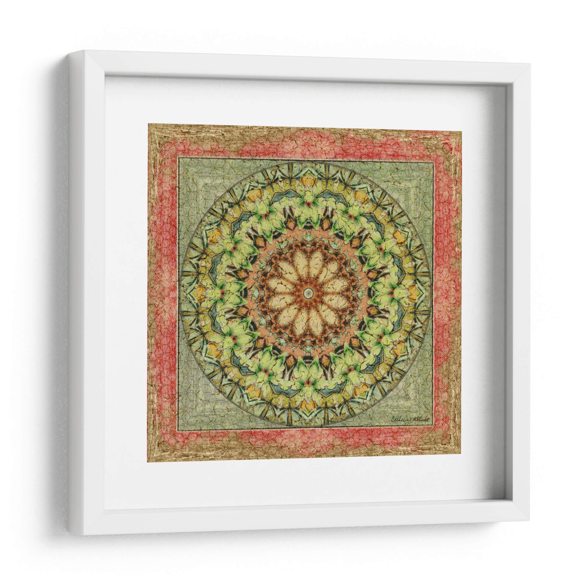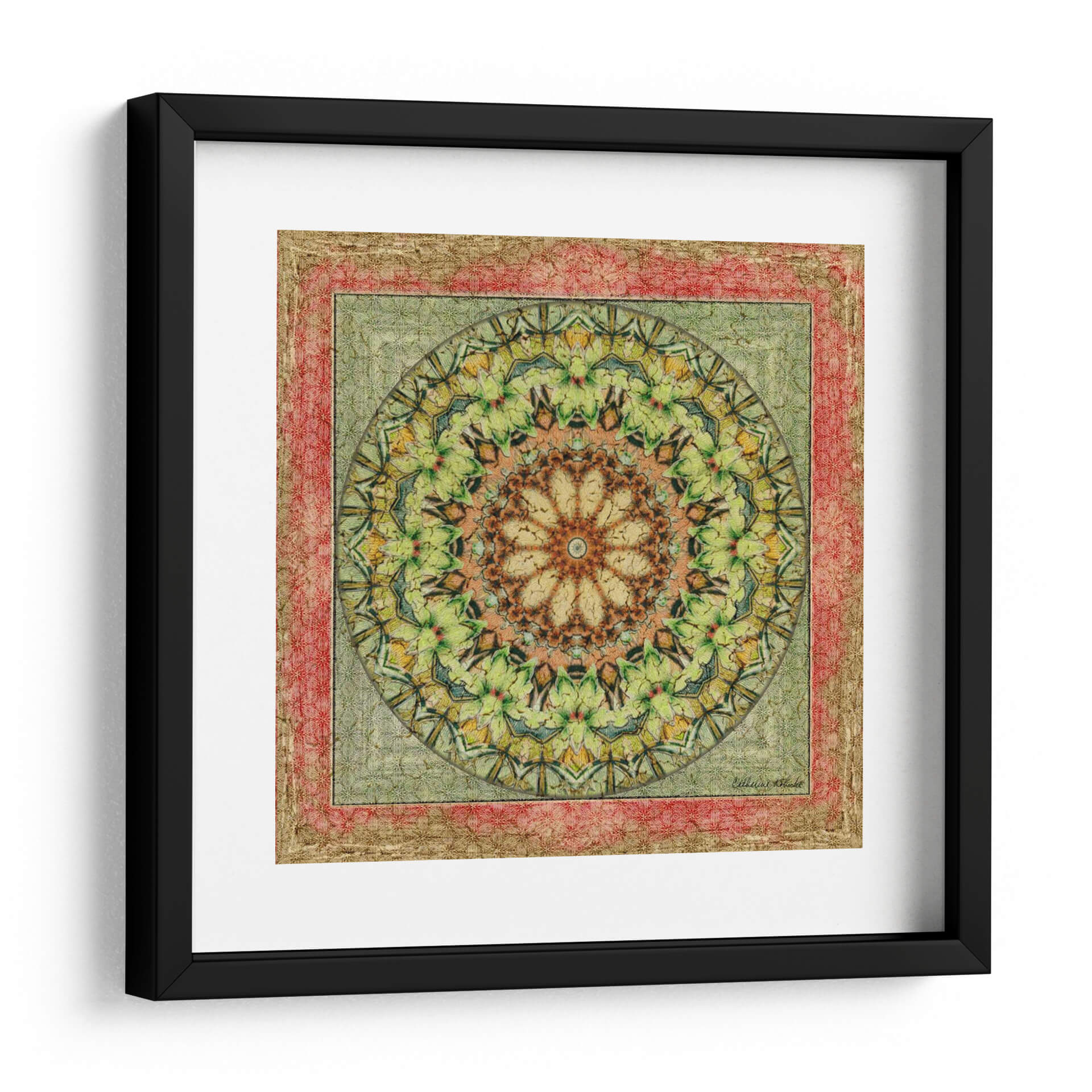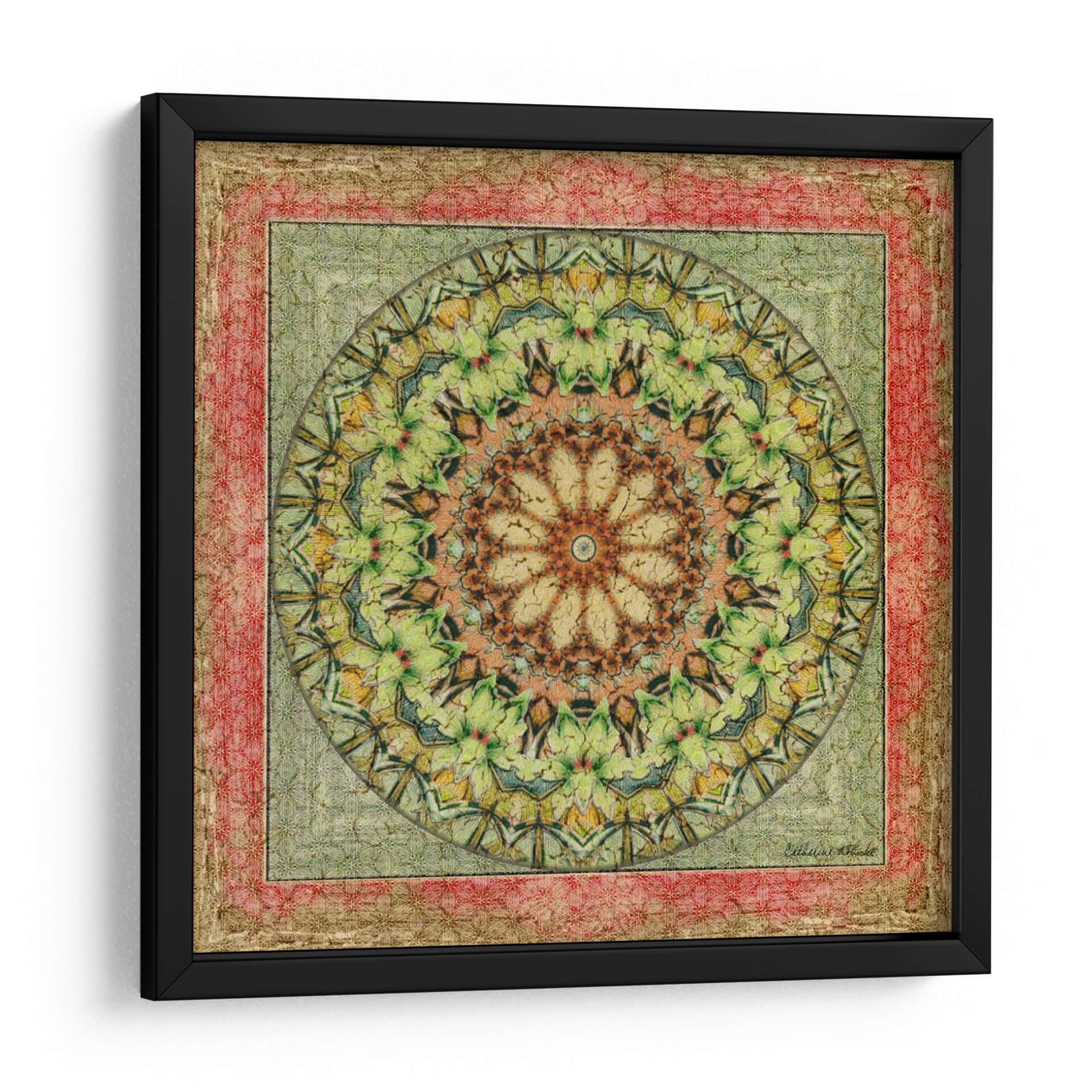 Sumérgete en la intrincada belleza de 'Floresis Mandala III', una obra de arte contemporáneo que evoca serenidad y un profundo sentido de conexión. Diseñada por la talentosa Catherine Kohnke, esta pieza presenta una vibrante mandala central, una explosión de patrones simétricos que recuerdan a flores estilizadas y elementos botánicos. La paleta de colores, dominada por tonos verdes, ocres y toques de rojo terracota, crea una atmósfera terrenal y armoniosa, invitando a la contemplación. Los detalles intrincados y las texturas sutiles añaden profundidad y riqueza visual, haciendo que cada observación revele nuevos matices. El diseño circular de la mandala, enmarcado por un patrón geométrico sutil en tonos verde pálido y bordes texturizados en rojo y dorado, proporciona un equilibrio visual perfecto. 'Floresis Mandala III' es más que una simple decoración; es una invitación a la calma y al equilibrio, ideal para espacios que buscan un toque de espiritualidad y sofisticación. Perfecta para salones modernos, dormitorios que invitan al descanso o estudios donde la concentración es clave, este cuadro decorativo transformará cualquier ambiente en un santuario de paz y estilo, aportando energía positiva y un diseño único.