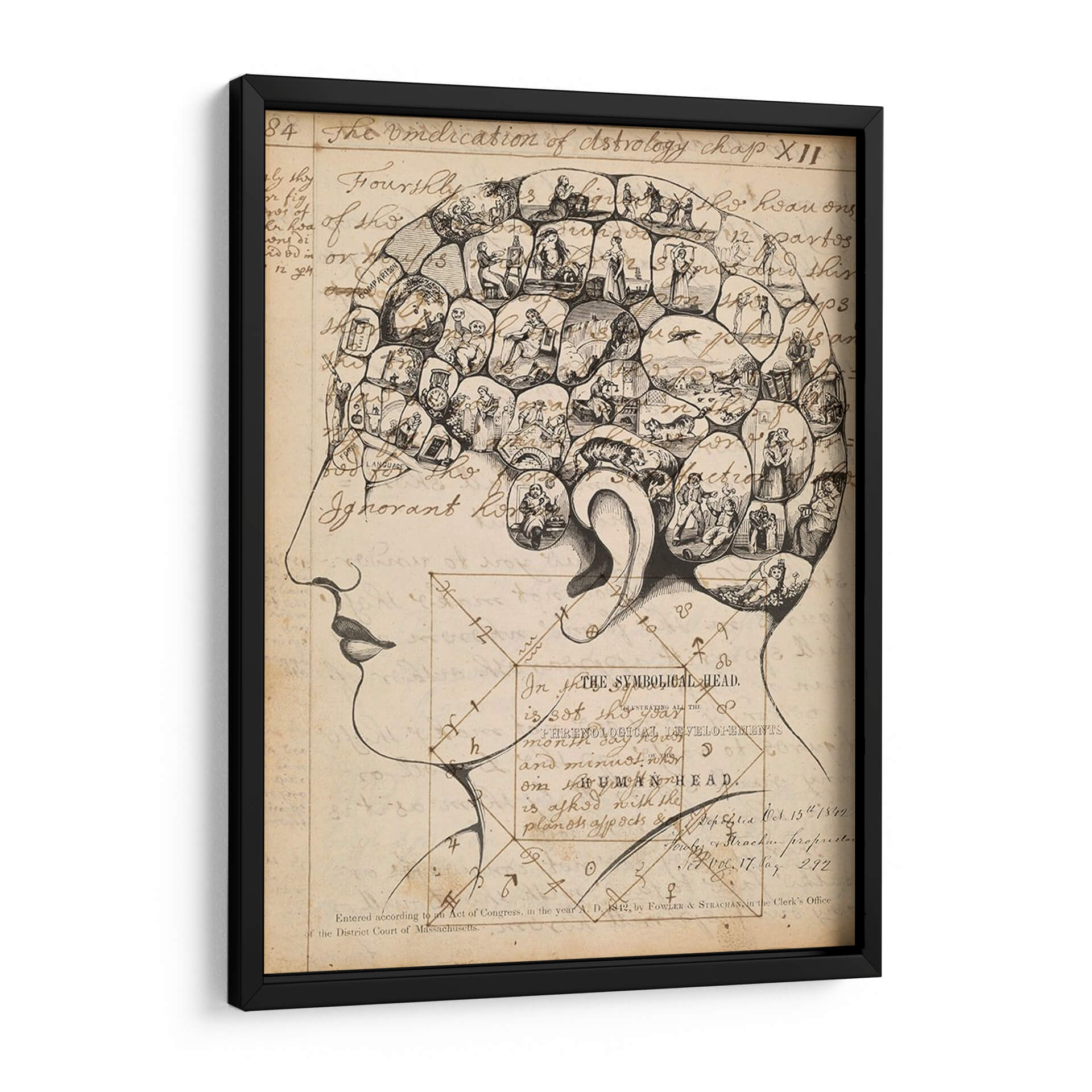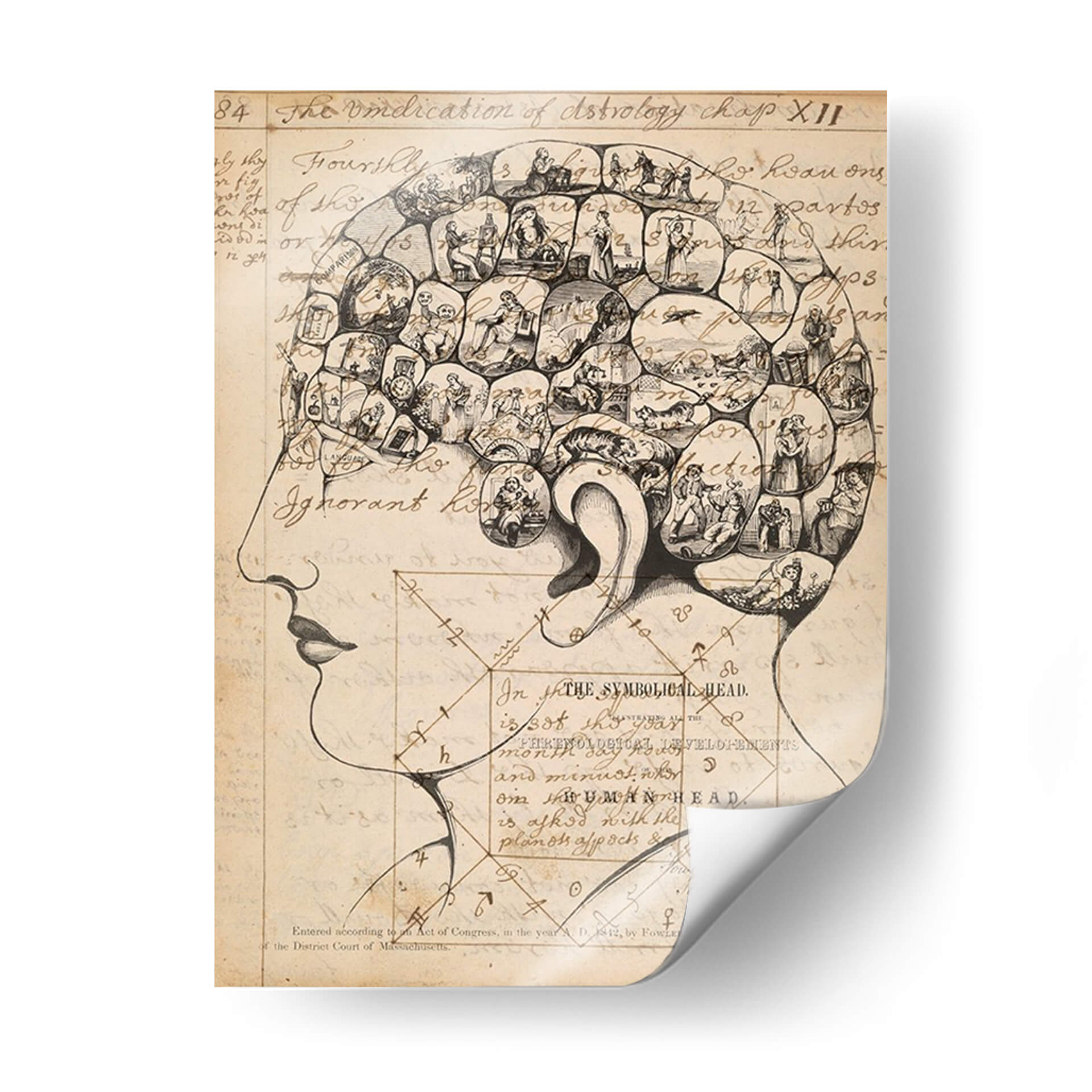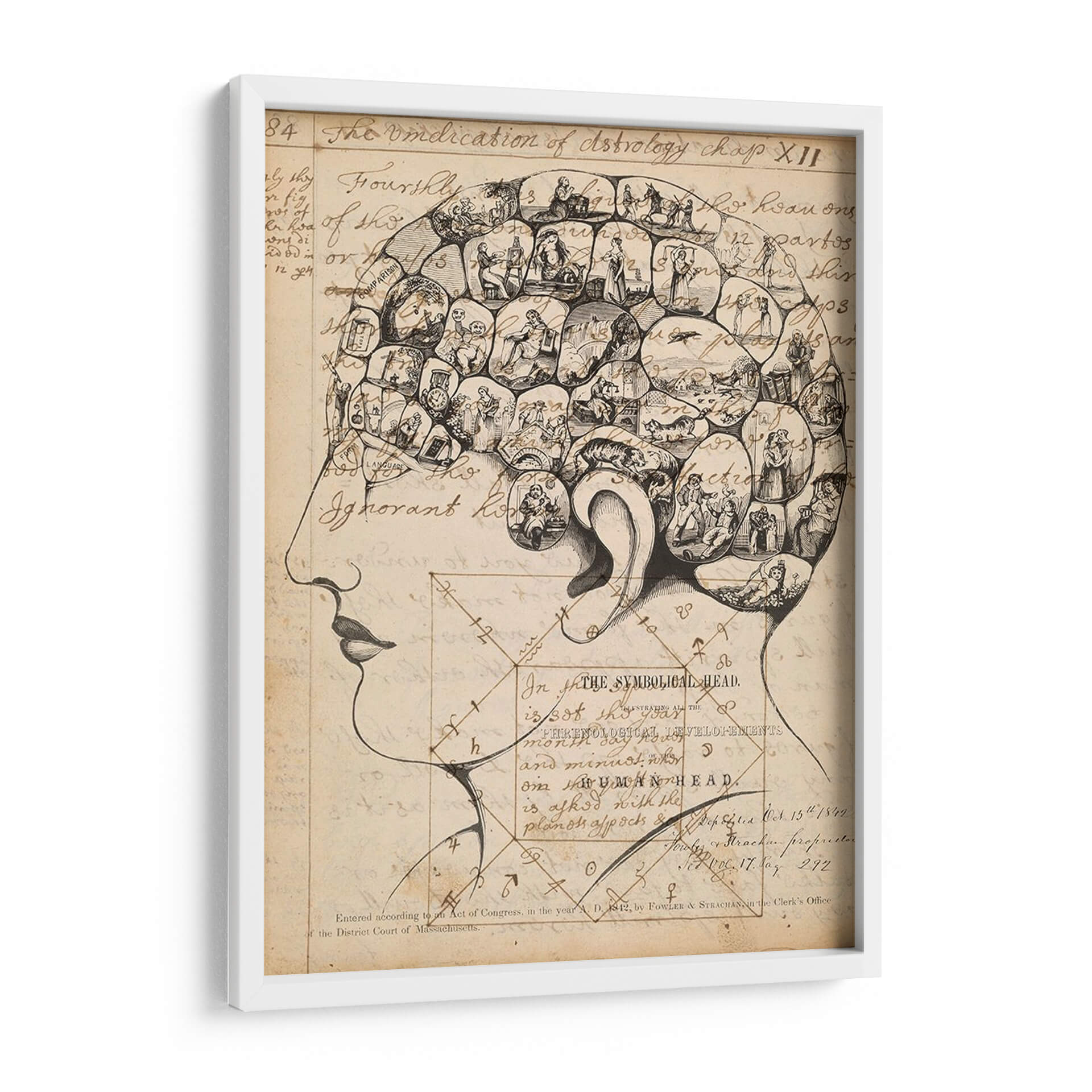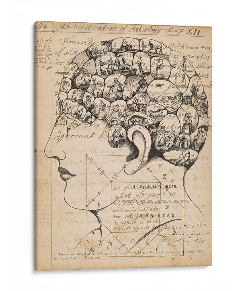 Adéntrate en el fascinante mundo de la frenología con esta cautivadora obra de arte, titulada "Footes De Frenología" del artista Jennifer Goldberger. Este cuadro decorativo es una representación intrincada de la cabeza humana, dividida en secciones que albergan pequeñas escenas y figuras detalladas. La paleta de colores se centra en tonos sepia y beige, evocando una sensación de antigüedad y misterio, similar a los grabados históricos. El estilo, reminiscentes de ilustraciones científicas del siglo XIX, combina el dibujo lineal con elementos de grabado para crear una textura visual rica. La composición, que detalla la silueta de un perfil humano, invita a la contemplación de la mente y sus complejidades. Esta pieza es ideal para quienes buscan un arte con profundidad intelectual y un toque vintage para su estudio, biblioteca u oficina, añadiendo un elemento de conversación y erudición a cualquier espacio. Es una pieza única que desafía la percepción y estimula la imaginación, perfecta para decorar con originalidad.