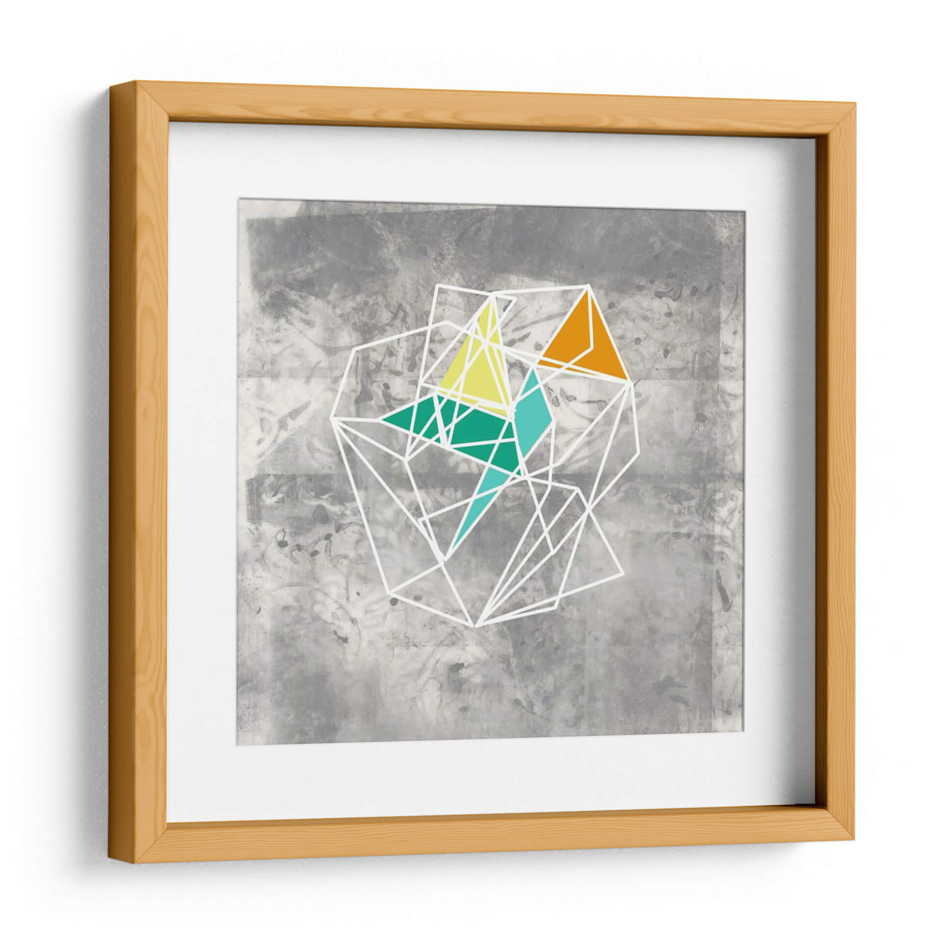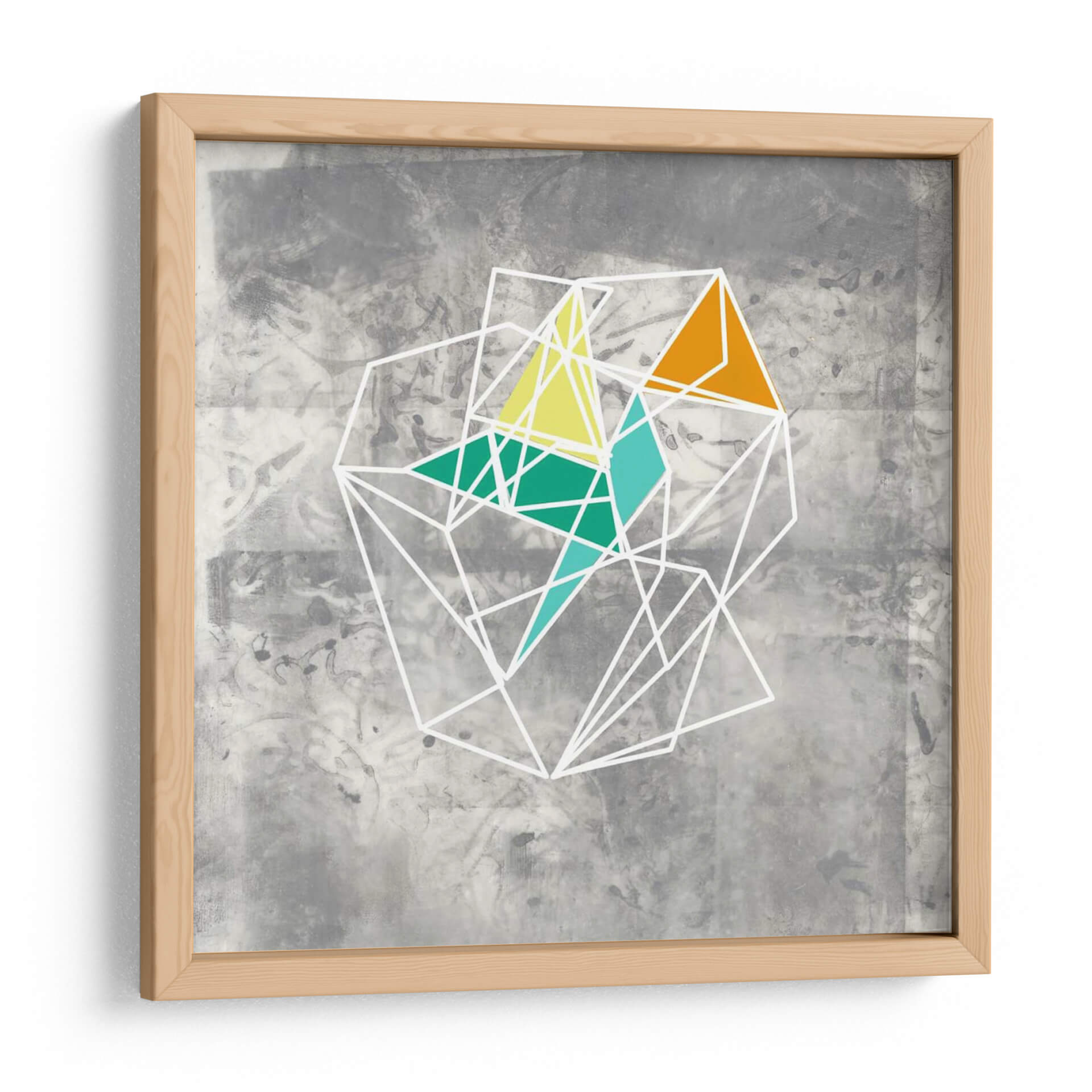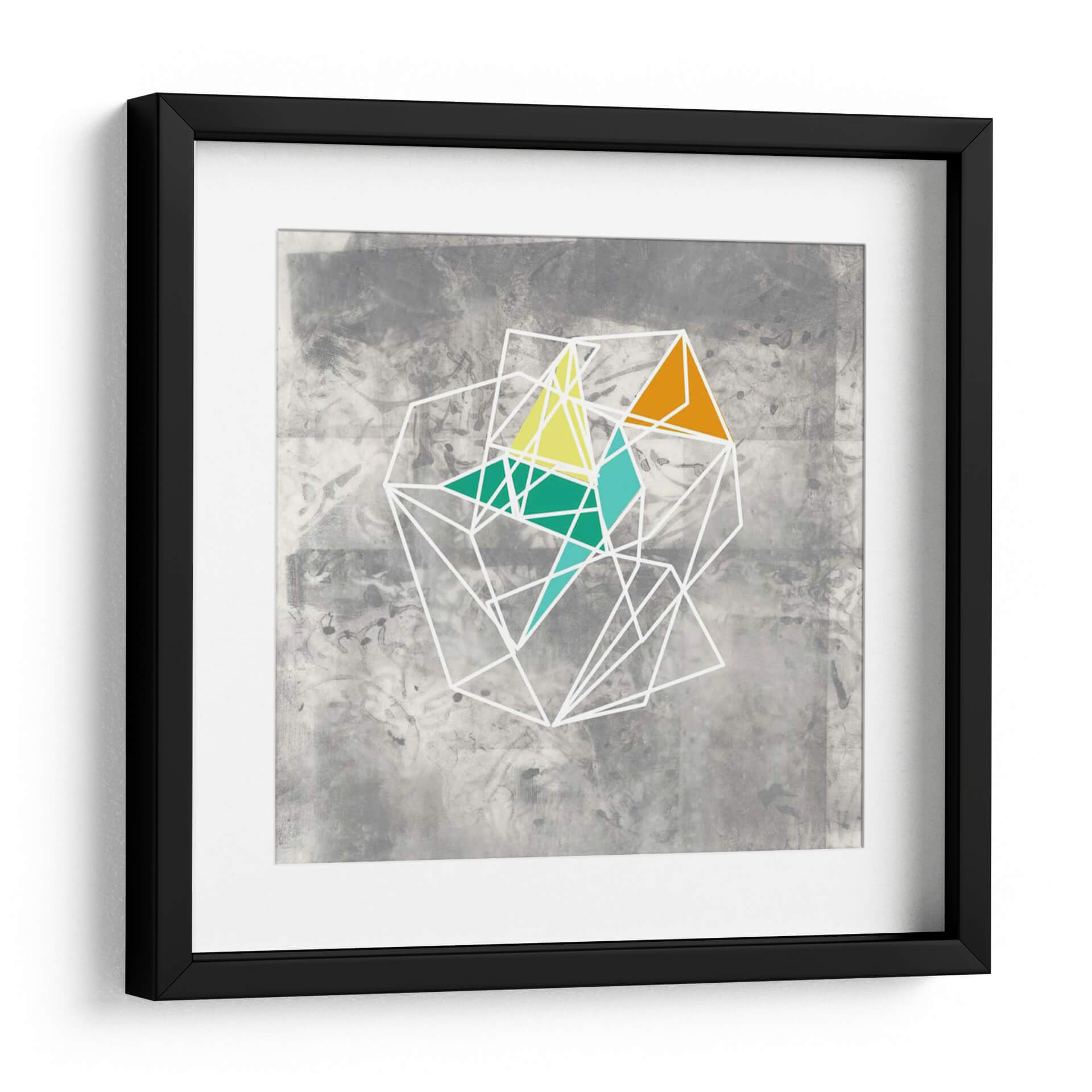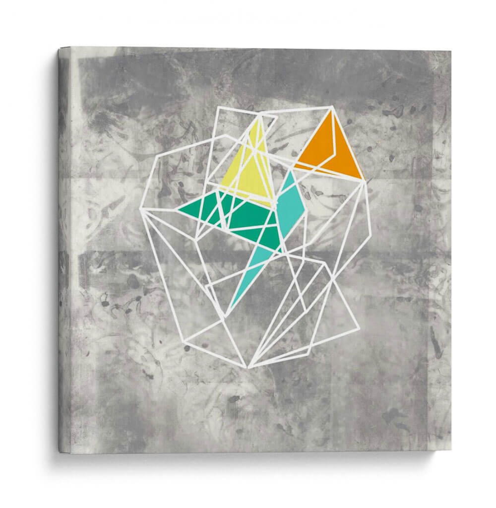 Sumérgete en la fascinante complejidad de 'Geomolecule IV', una obra de arte abstracto que desafía la percepción con su intrincada estructura geométrica. Jennifer Goldberger ha creado una pieza visualmente cautivadora donde finas líneas blancas delinean una red tridimensional, evocando la estructura de una molécula o un cristal. Dentro de esta estructura, vibrantes polígonos en tonos naranja, amarillo y verde azulado rompen la monocromía del fondo gris texturizado, añadiendo puntos de energía y dinamismo. El contraste entre la delicadeza de las líneas y la audacia de los colores crea una tensión visual que invita a la contemplación. Este cuadro decorativo es ideal para espacios que buscan un toque de modernidad y sofisticación, aportando un elemento de interés intelectual y estético. Perfecto para salas de estar contemporáneas, estudios o oficinas, 'Geomolecule IV' es una celebración de la forma y el color que estimula la conversación y enriquece cualquier ambiente con su diseño único.