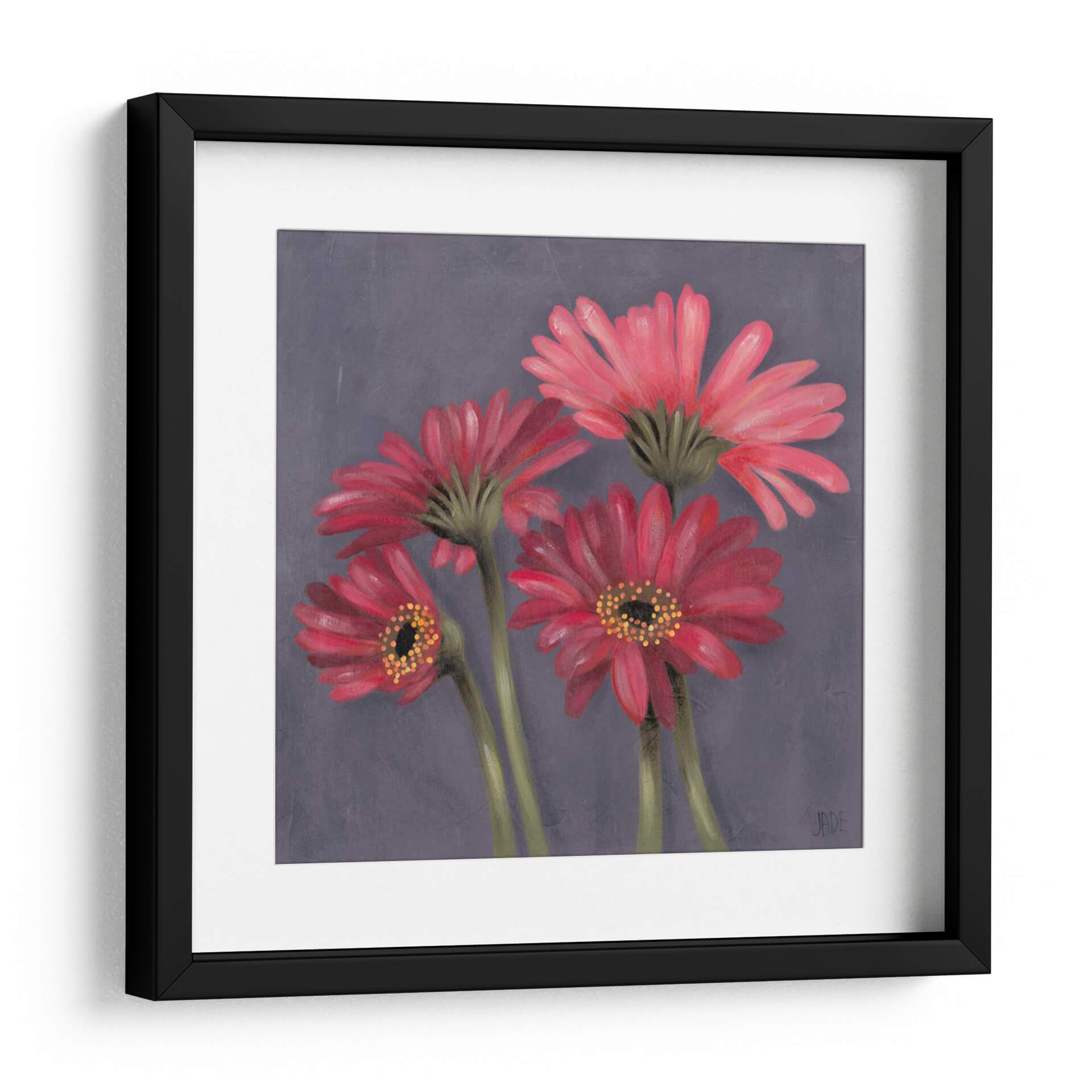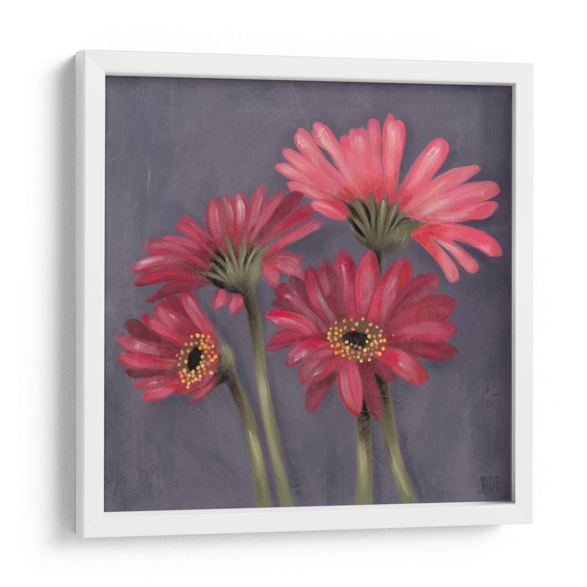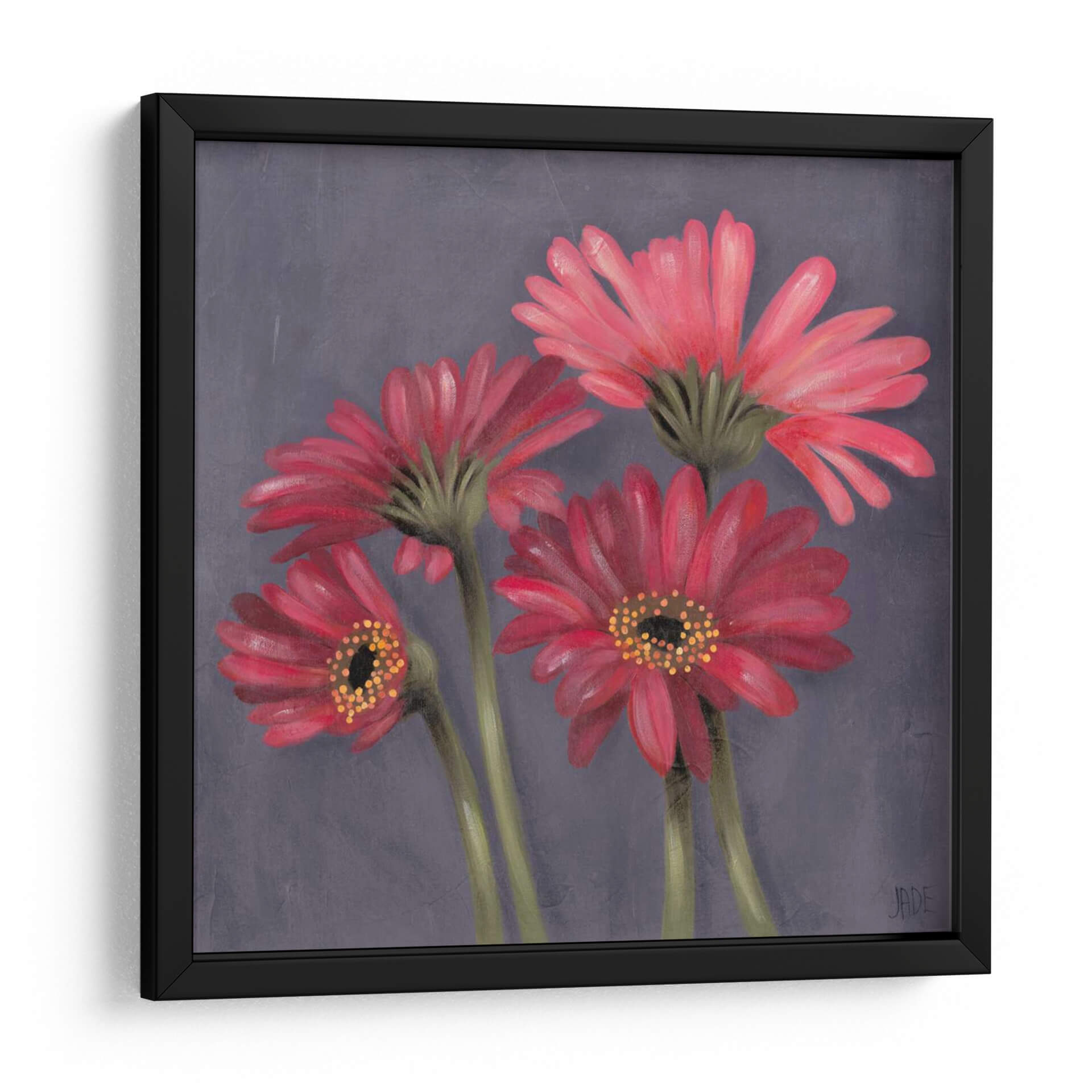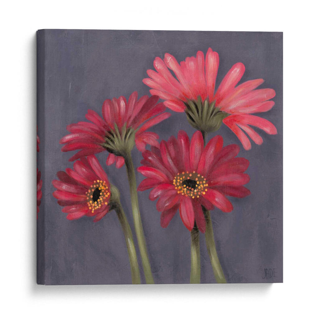 Sumérgete en la delicada belleza de 'Gerber Sobre El Grey I', una cautivadora obra de arte de Jade Reynolds que transforma un espacio con su vibrante pero serena representación floral. Este cuadro decorativo presenta un grupo íntimo de gerberas en tonos rojos y rosados intensos, sus pétalos capturados con un detalle exquisito y una suave textura que evoca la técnica de la pintura al óleo. El fondo grisáceo, sutilmente texturizado, permite que las flores rojas destaquen, creando un contraste visual impactante y una atmósfera de elegancia contemporánea. La composición, centrada en la forma natural de las flores, aporta una sensación de calma y aprecio por la naturaleza, haciendo de esta pieza una adición perfecta para cualquier hogar u oficina que busque un toque de color y sofisticación. Ideal para salas de estar, dormitorios o incluso espacios de trabajo que necesiten un foco de serenidad y belleza orgánica. 'Gerber Sobre El Grey I' no es solo una decoración, es una invitación a la contemplación y al disfrute de la estética floral en su máxima expresión.