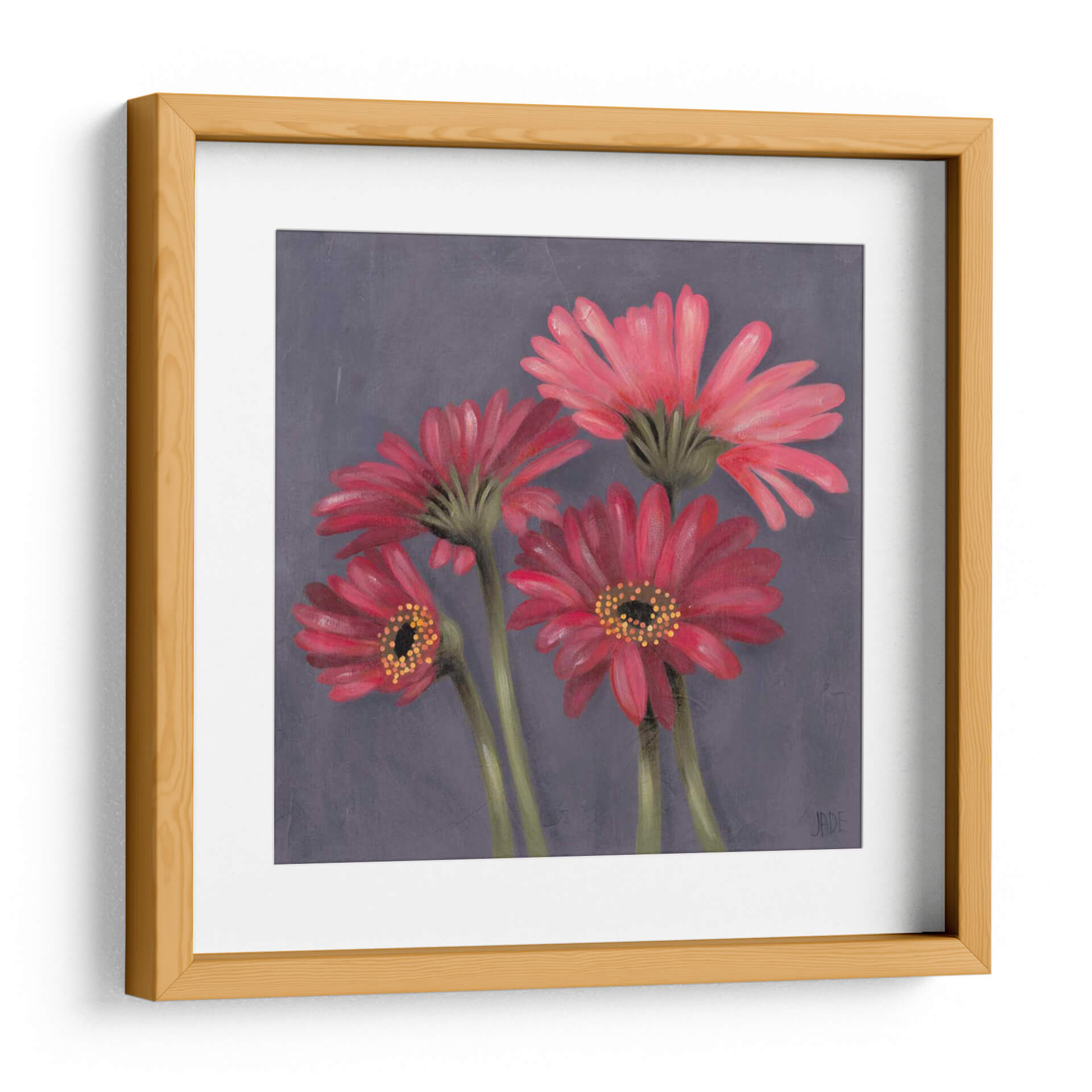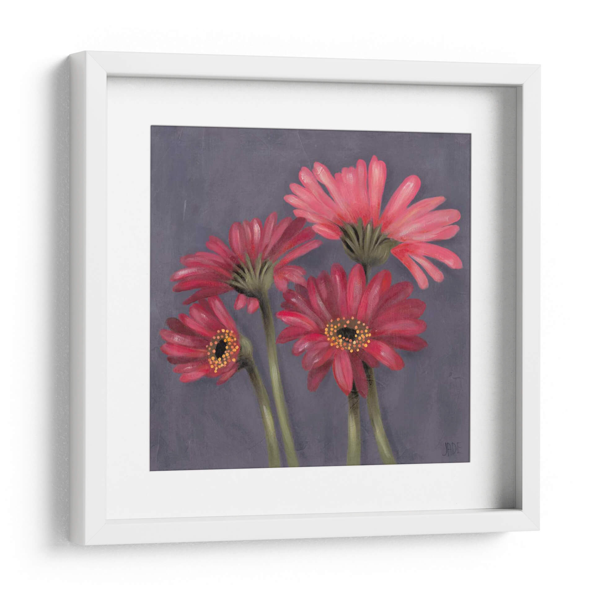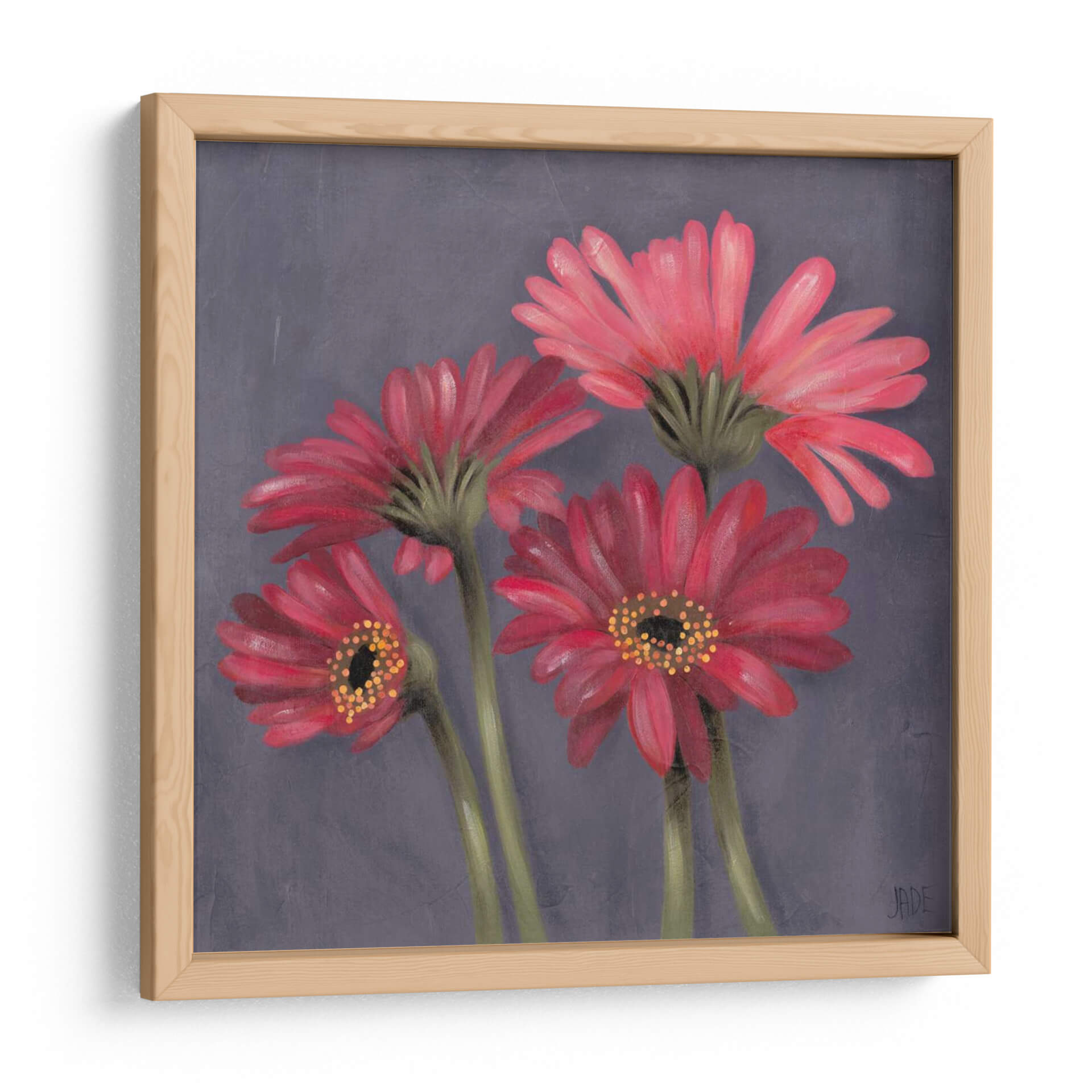 Sumérgete en la delicada belleza de 'Gerber Sobre El Grey I', una cautivadora obra de arte de Jade Reynolds que transforma un espacio con su vibrante pero serena representación floral. Este cuadro decorativo presenta un grupo íntimo de gerberas en tonos rojos y rosados intensos, sus pétalos capturados con un detalle exquisito y una suave textura que evoca la técnica de la pintura al óleo. El fondo grisáceo, sutilmente texturizado, permite que las flores rojas destaquen, creando un contraste visual impactante y una atmósfera de elegancia contemporánea. La composición, centrada en la forma natural de las flores, aporta una sensación de calma y aprecio por la naturaleza, haciendo de esta pieza una adición perfecta para cualquier hogar u oficina que busque un toque de color y sofisticación. Ideal para salas de estar, dormitorios o incluso espacios de trabajo que necesiten un foco de serenidad y belleza orgánica. 'Gerber Sobre El Grey I' no es solo una decoración, es una invitación a la contemplación y al disfrute de la estética floral en su máxima expresión.