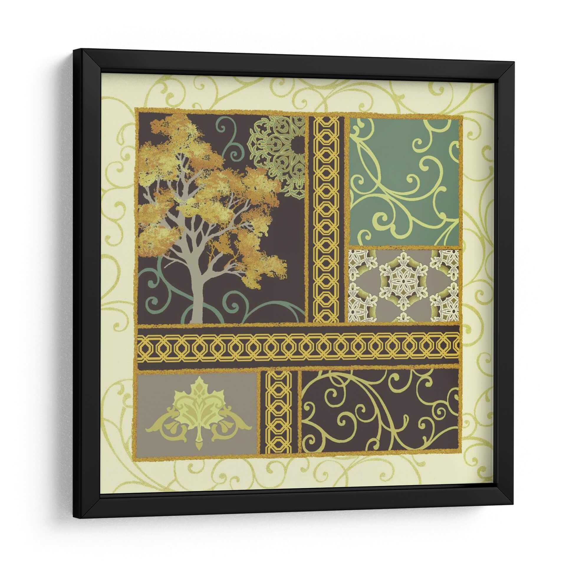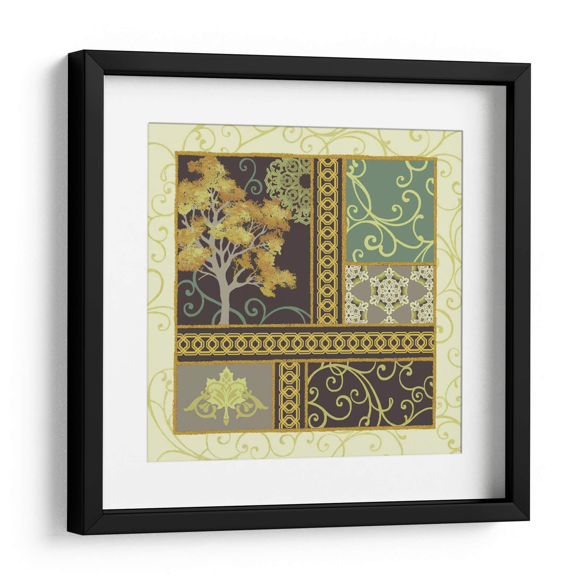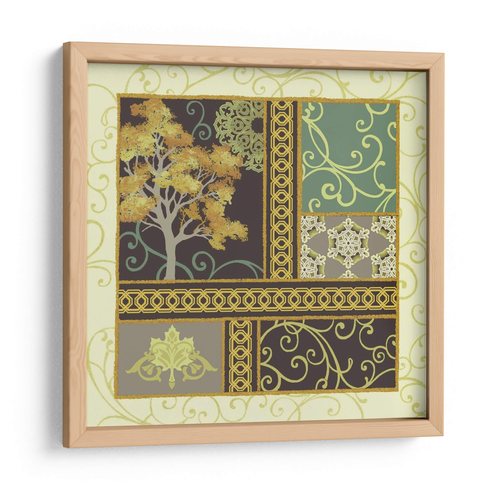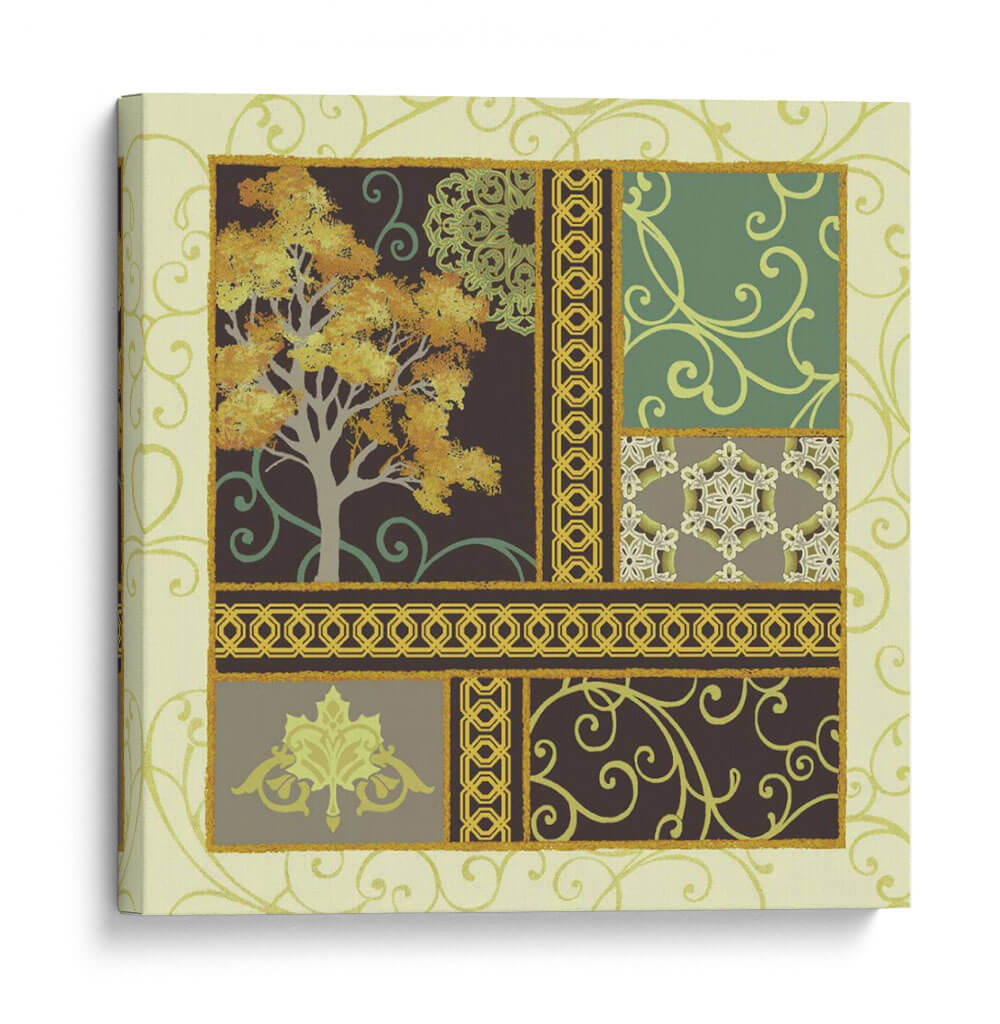 Sumérgete en la serenidad otoñal con "Historias De Arce II", una cautivadora obra de arte de Katia Hoffman que transforma tu espacio en un refugio de tranquilidad y estilo. Esta pieza presenta un árbol majestuoso en pleno esplendor otoñal, con hojas doradas y naranjas que capturan la esencia de la temporada. La composición se desglosa en un cautivador collage de patrones, que incluyen delicados motivos florales, intrincados bordes geométricos y suaves remolinos, todo ello enmarcado por un suave fondo de color crema y acentuado con toques de verde esmeralda y oro. El uso magistral del color crea una atmósfera de calma y reflexión, perfecta para dar vida a salones, comedores o estudios. "Historias De Arce II" es más que un simple cuadro decorativo; es una invitación a la contemplación, un diálogo visual entre la naturaleza y el diseño que añade profundidad y elegancia a cualquier decoración, fusionando lo orgánico con lo ornamental de manera sublime.