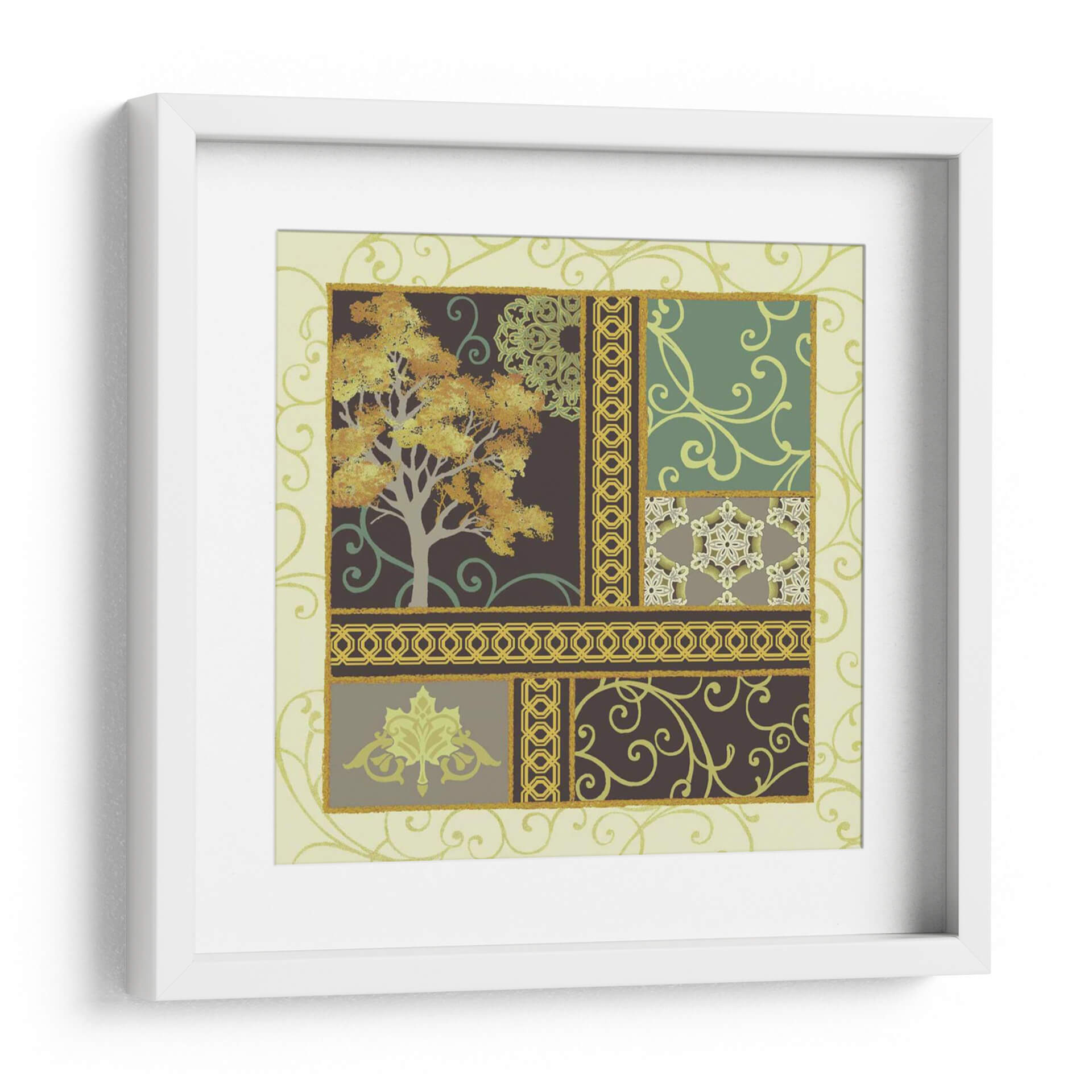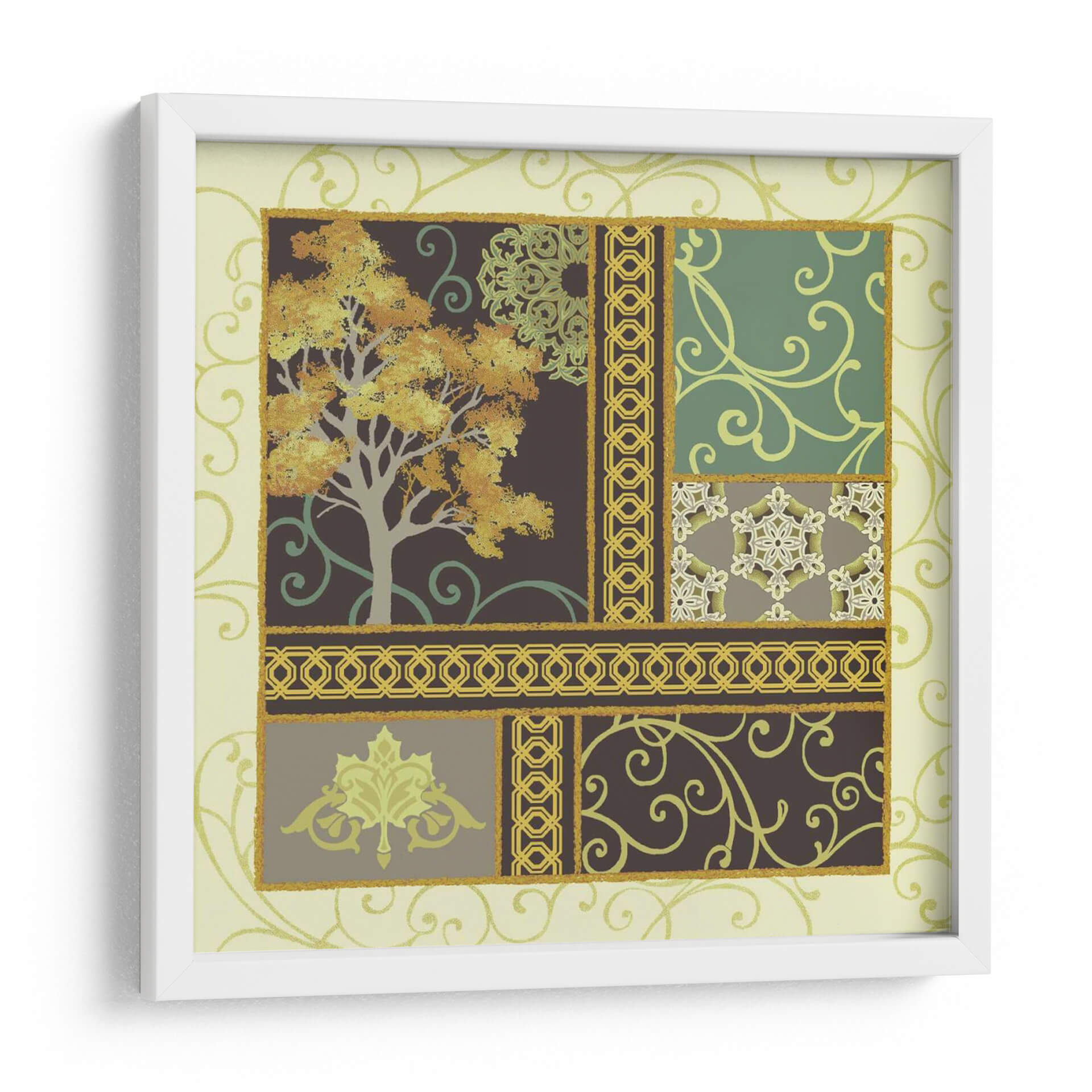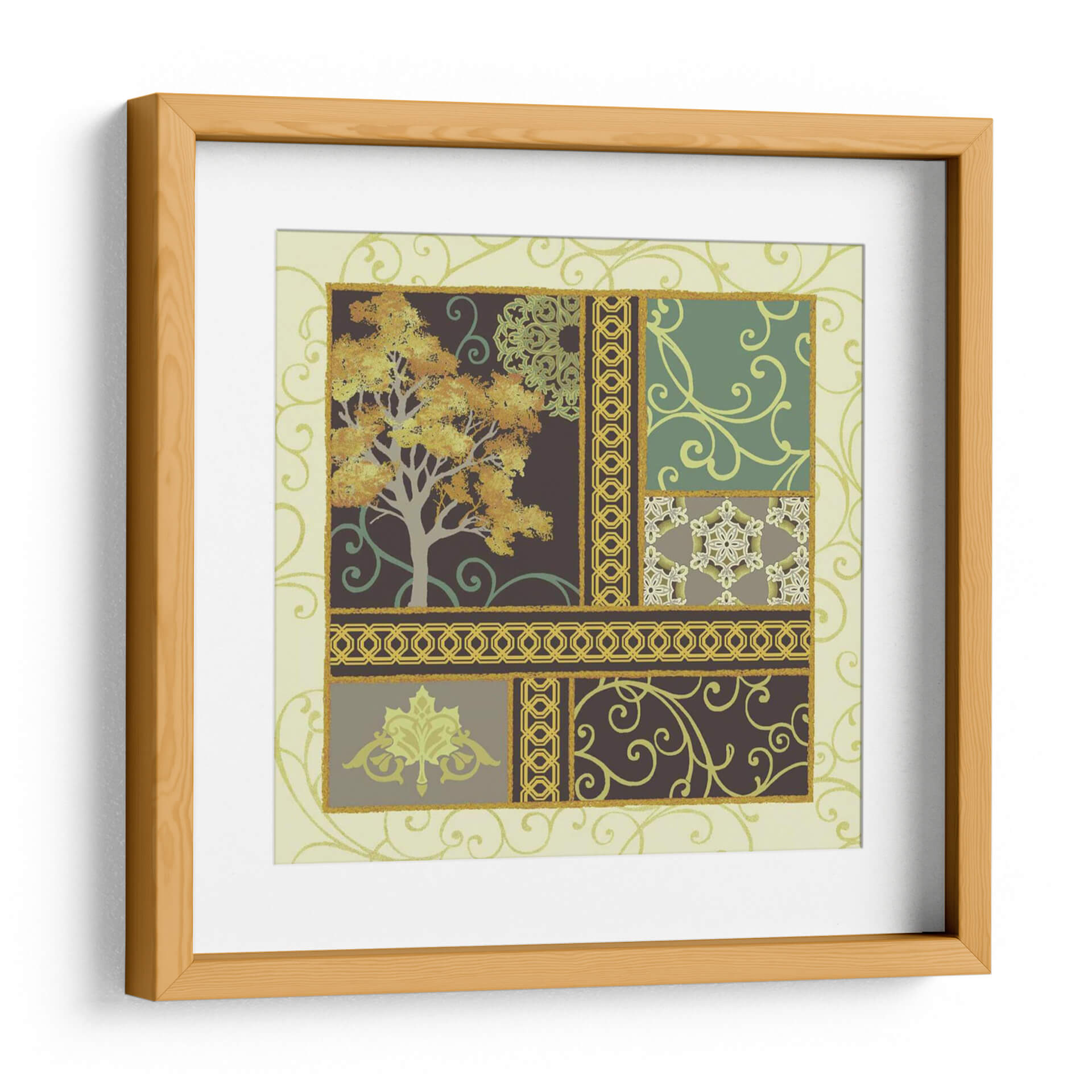 Sumérgete en la serenidad otoñal con "Historias De Arce II", una cautivadora obra de arte de Katia Hoffman que transforma tu espacio en un refugio de tranquilidad y estilo. Esta pieza presenta un árbol majestuoso en pleno esplendor otoñal, con hojas doradas y naranjas que capturan la esencia de la temporada. La composición se desglosa en un cautivador collage de patrones, que incluyen delicados motivos florales, intrincados bordes geométricos y suaves remolinos, todo ello enmarcado por un suave fondo de color crema y acentuado con toques de verde esmeralda y oro. El uso magistral del color crea una atmósfera de calma y reflexión, perfecta para dar vida a salones, comedores o estudios. "Historias De Arce II" es más que un simple cuadro decorativo; es una invitación a la contemplación, un diálogo visual entre la naturaleza y el diseño que añade profundidad y elegancia a cualquier decoración, fusionando lo orgánico con lo ornamental de manera sublime.
