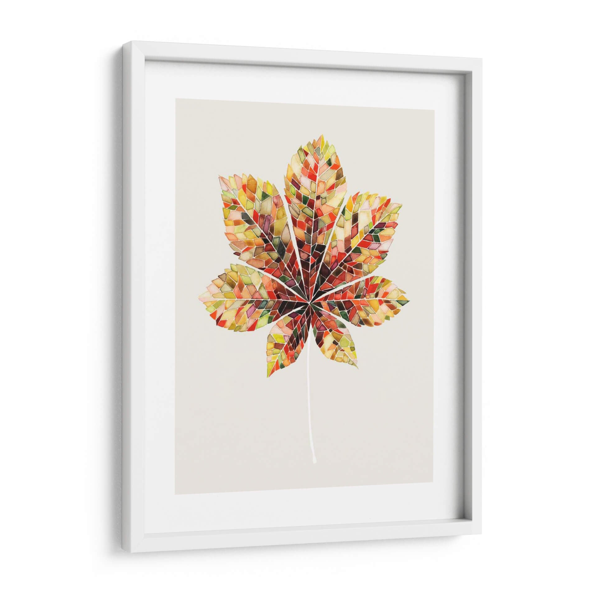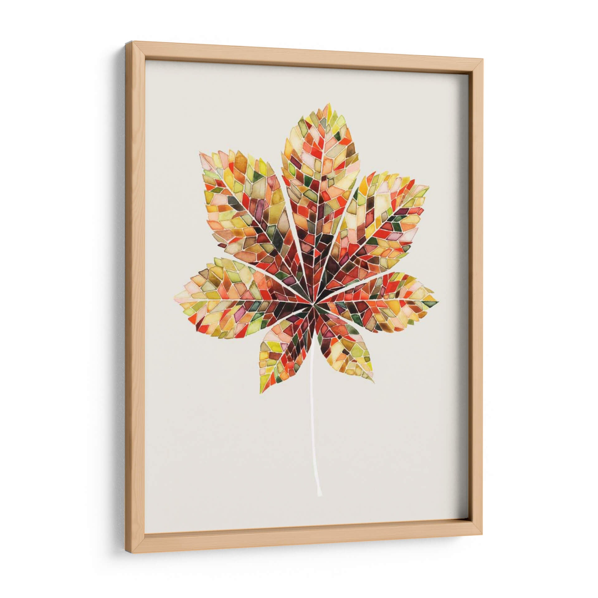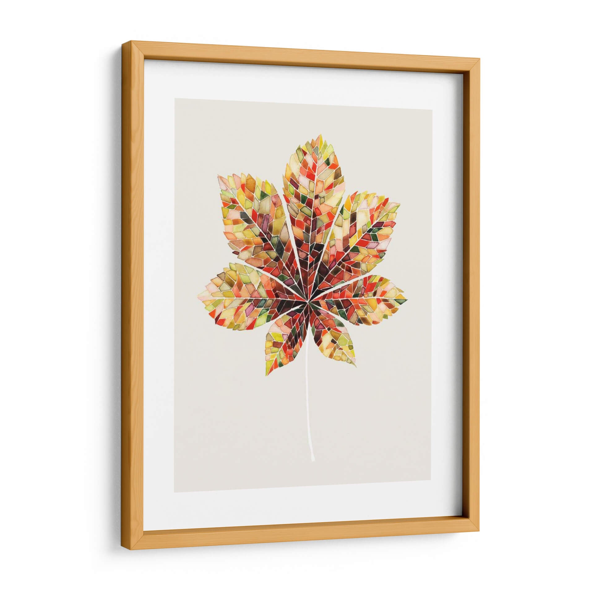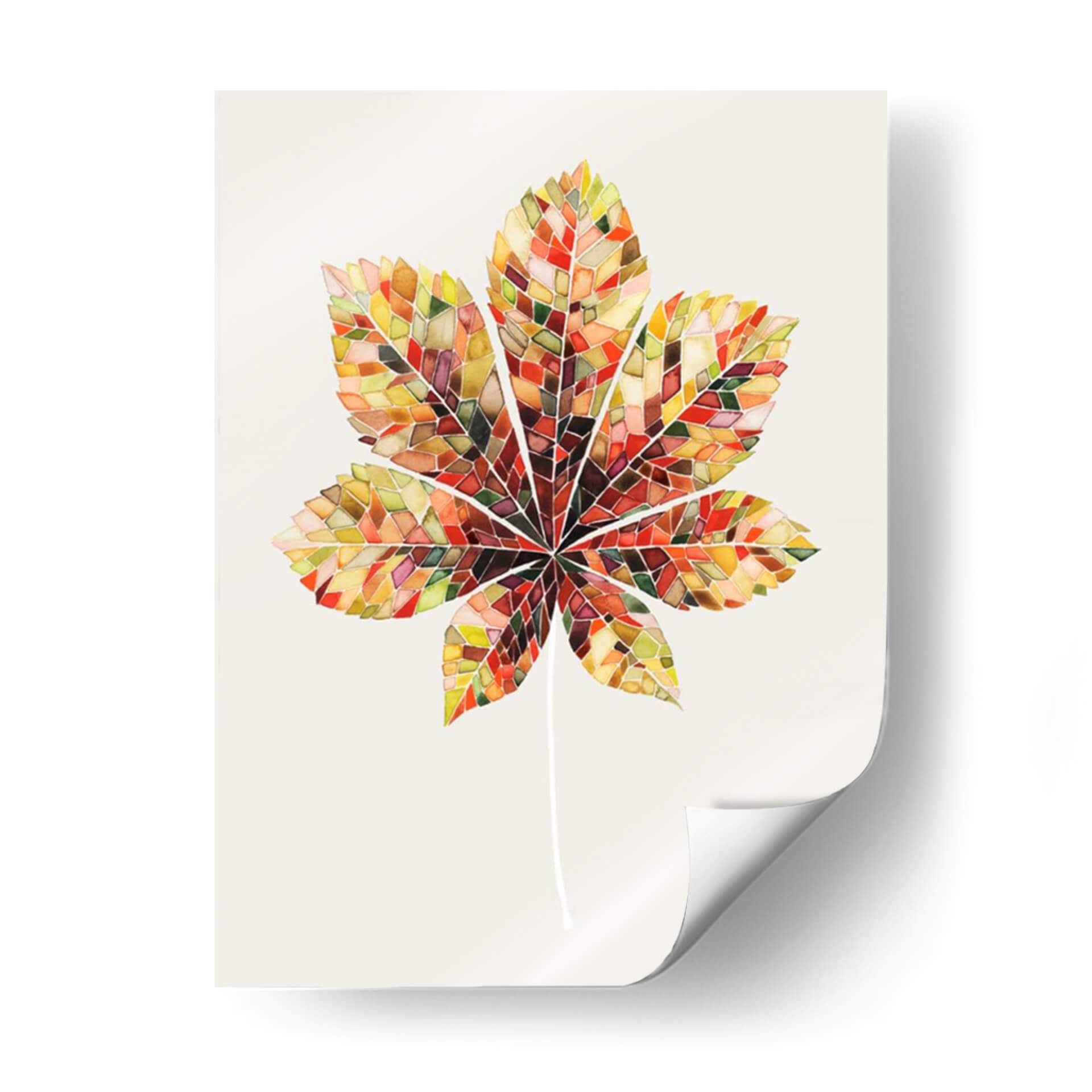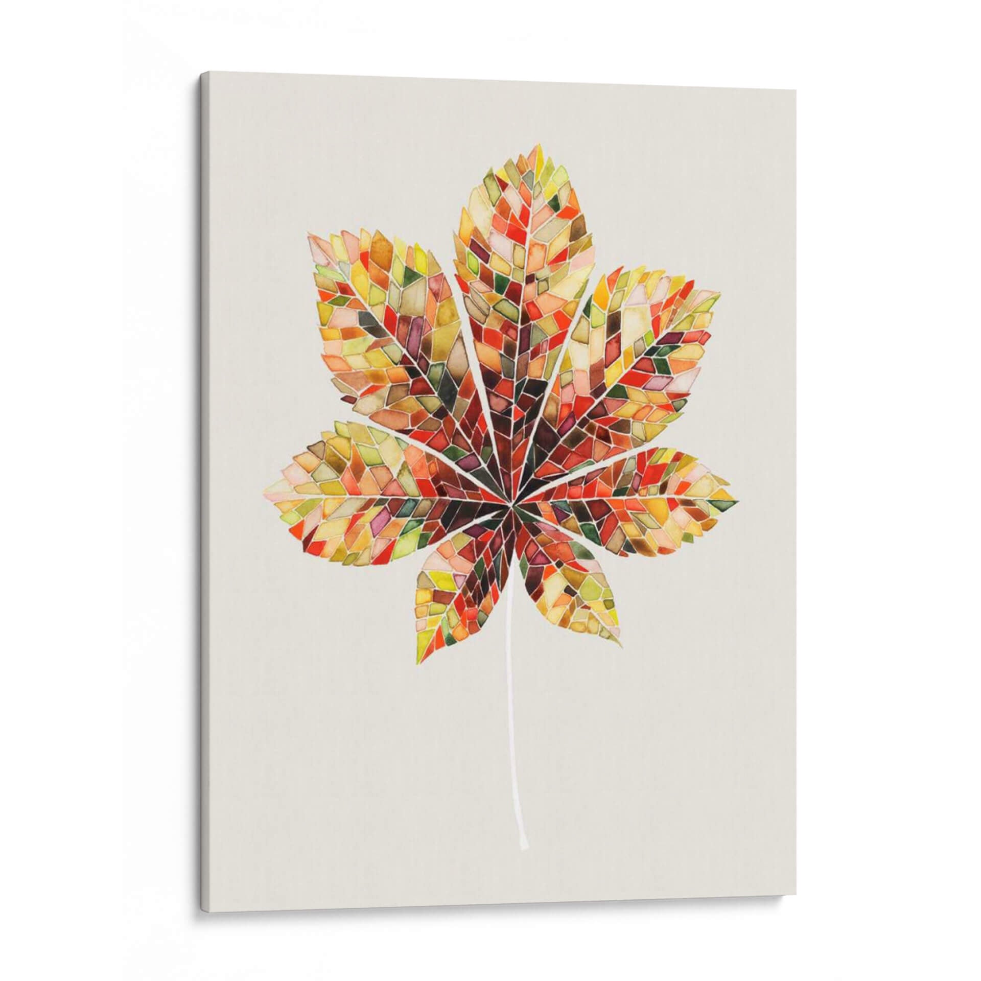 Transforma tu espacio con la cautivadora obra "Hoja de Mosaico de Otoño IV" de Grace Popp. Este cuadro decorativo captura la esencia vibrante del otoño a través de un diseño innovador que imita un mosaico de vidrieras. Cada segmento de la hoja se presenta con una paleta de colores rica y cálida, que va desde dorados profundos y naranjas ardientes hasta rojos intensos y toques de verde esmeralda y marrón tierra. La técnica, que recuerda a la delicadeza del arte en acuarela o vitral, aporta una textura visual única y una profundidad fascinante. La composición central de una hoja de castaño estilizada, con su tallo fino y elegante, crea un punto focal sereno pero dinámico. El fondo neutro y liso permite que la riqueza cromática de la hoja destaque, haciéndola una adición perfecta para cualquier decoración, desde la más moderna hasta la tradicional. Ideal para salas de estar, comedores, oficinas o cualquier habitación que busque un toque de naturaleza, arte y color. "Hoja de Mosaico de Otoño IV" es más que una simple decoración de pared; es una celebración de la belleza efímera de la naturaleza, reinterpretada con una sensibilidad artística contemporánea que invita a la contemplación y al disfrute visual. Añade esta pieza inspiradora a tu colección y experimenta la calidez y la vitalidad del otoño todo el año.