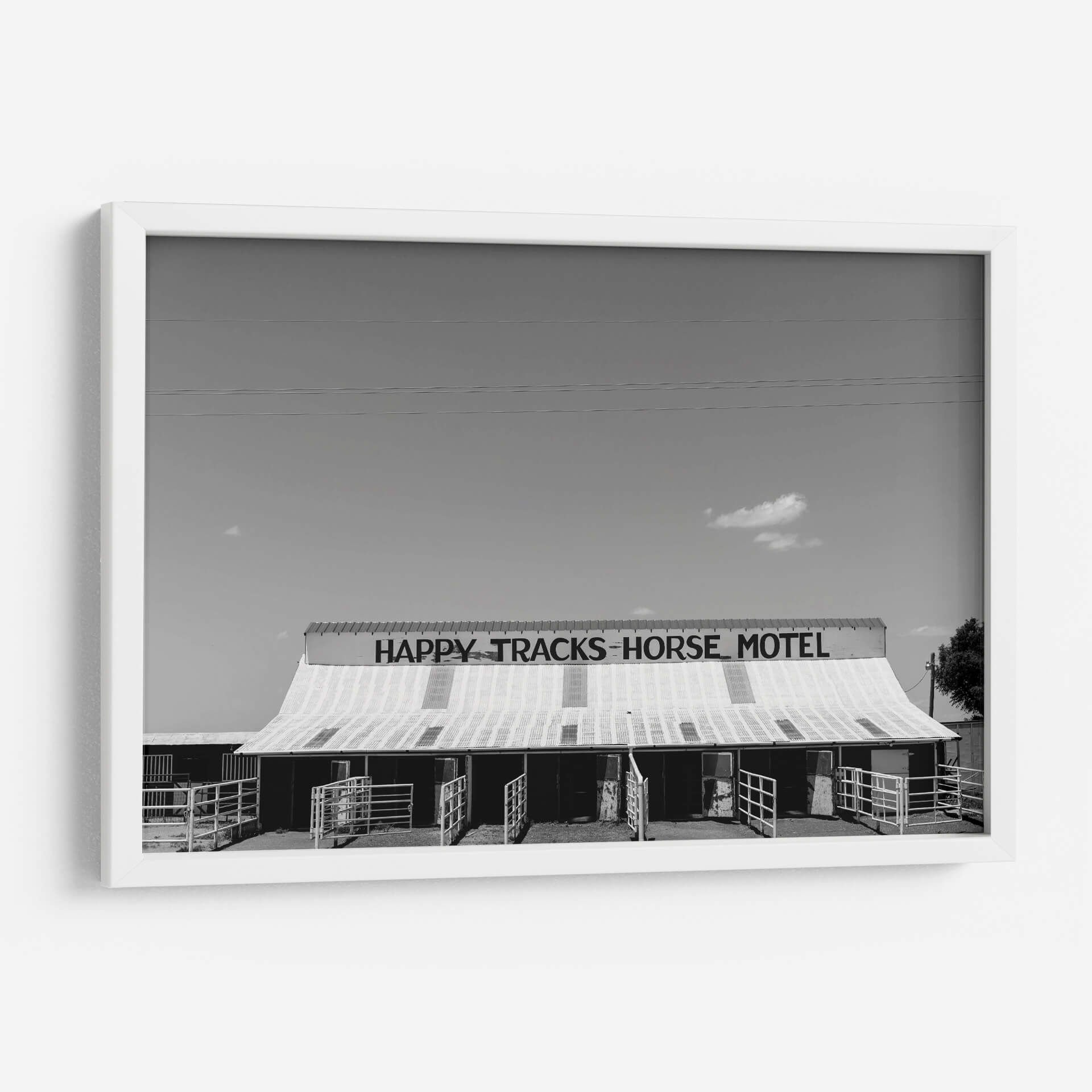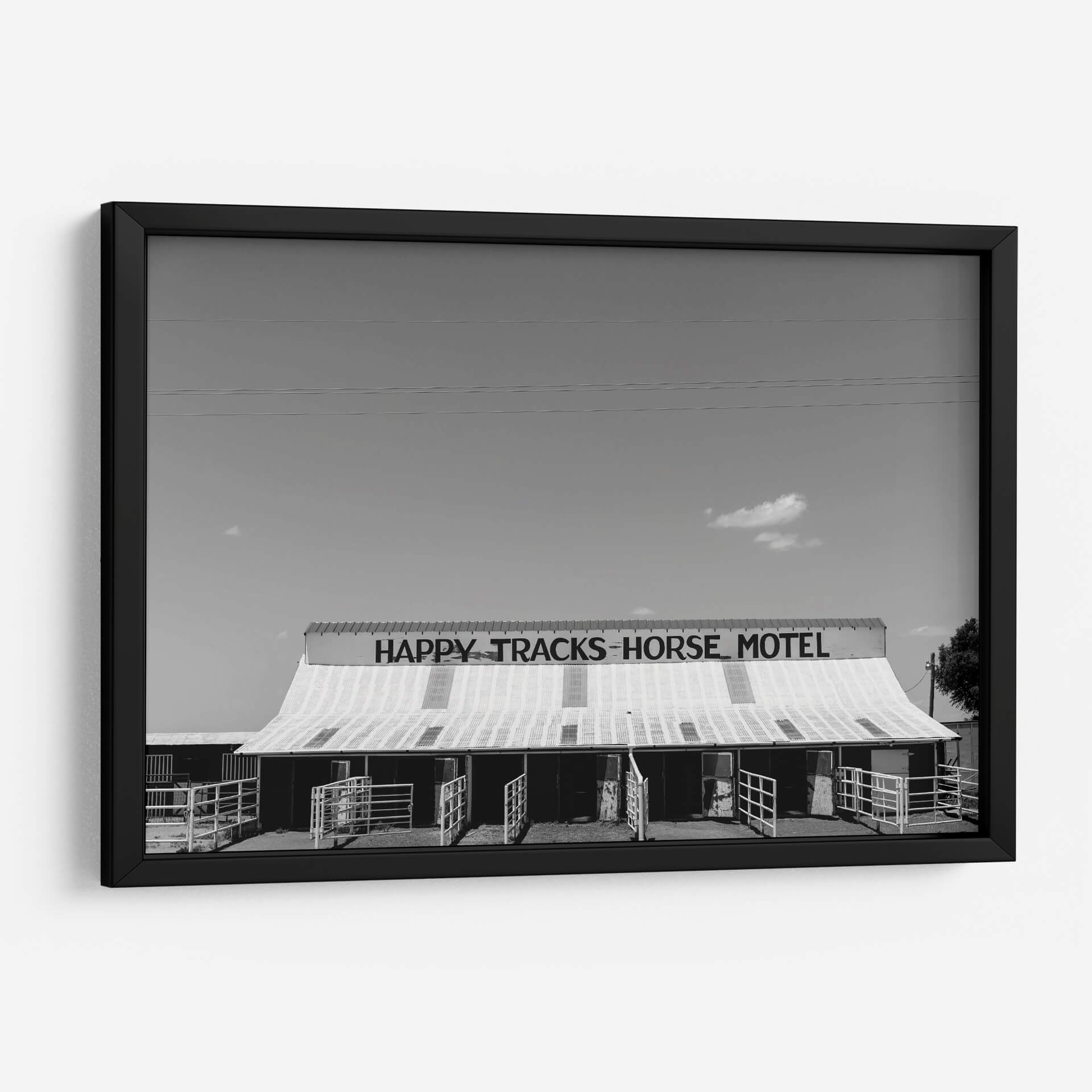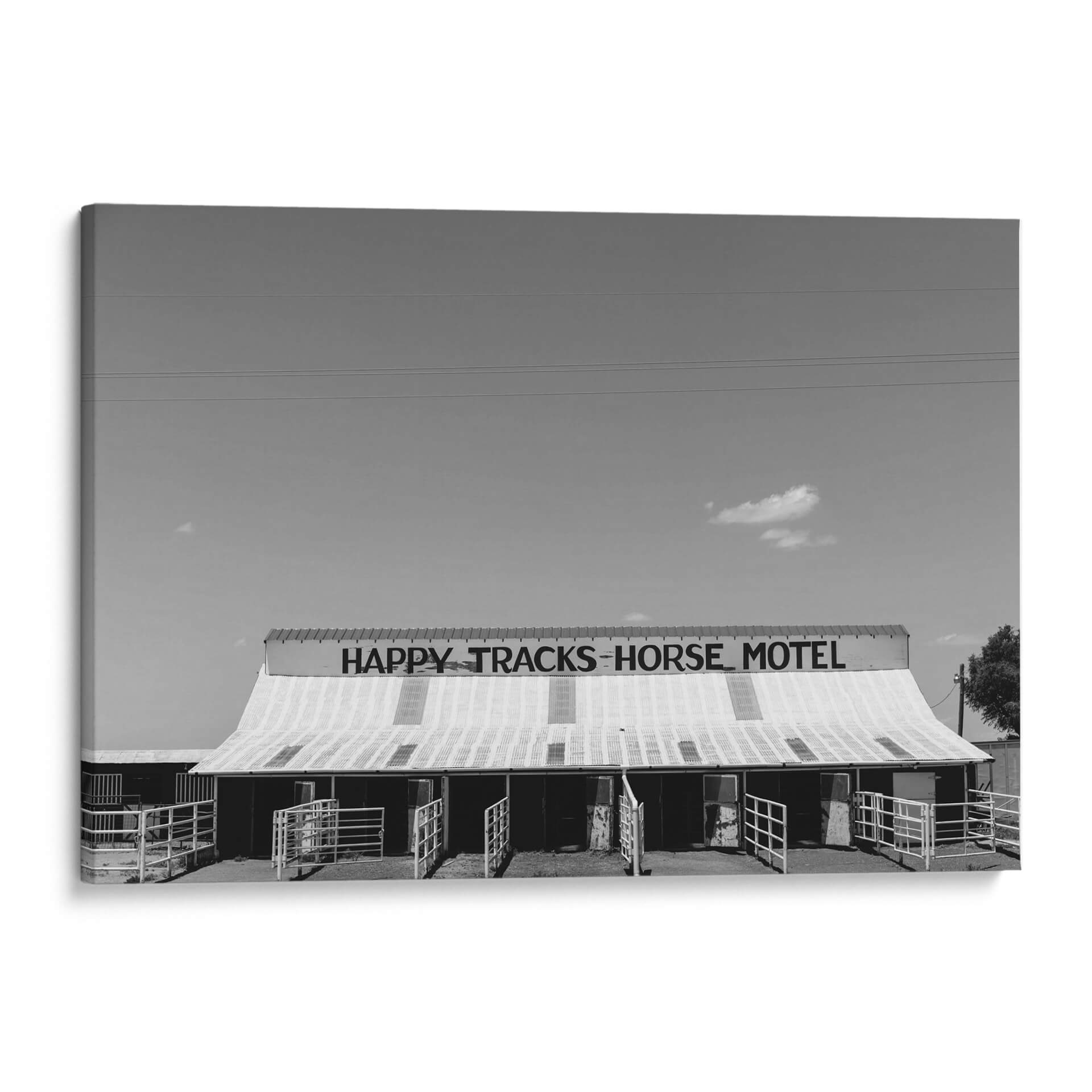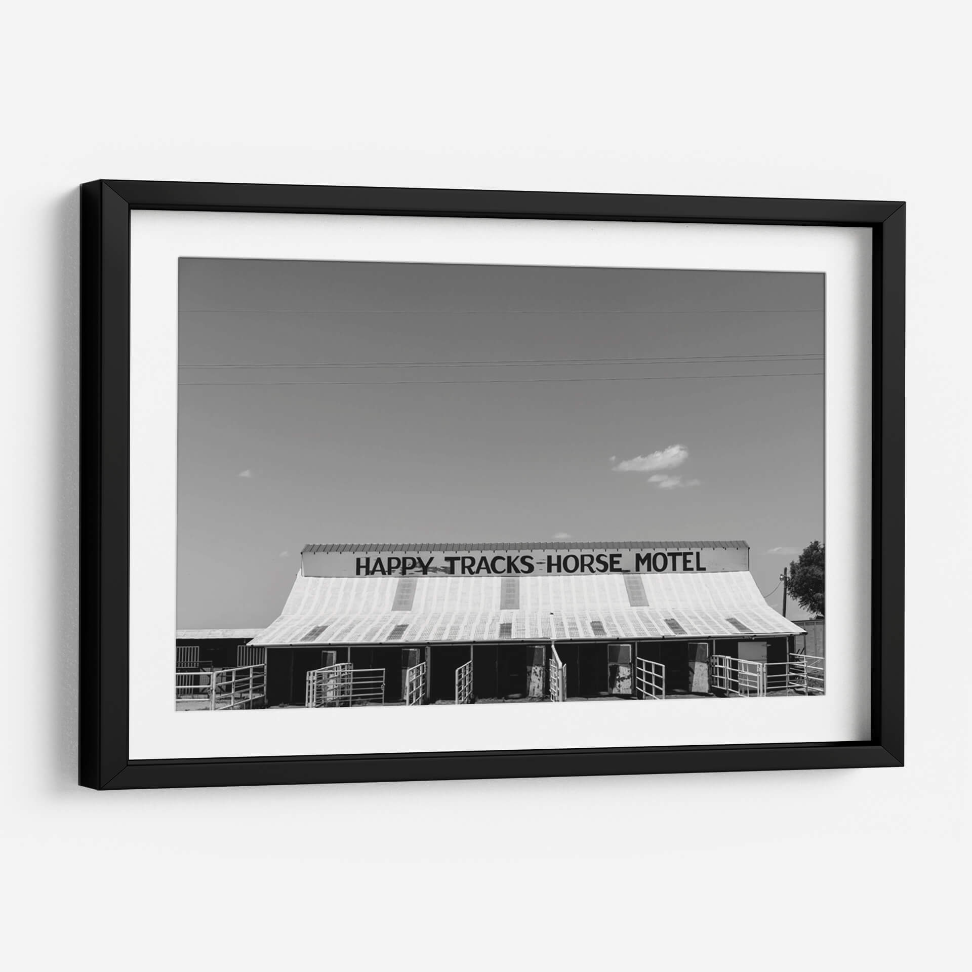 Sumérgete en la atmósfera nostálgica de "Horse Motel", una obra de arte en blanco y negro que captura la esencia de un refugio equino con un encanto atemporal. La fotografía, capturada por Bethany Young, presenta una fachada detallada de un establo, con "HAPPY TRACKS HORSE MOTEL" escrito prominentemente en la parte superior, invitando a la reflexión sobre los viajes y las estancias en lugares sencillos pero significativos. La composición se centra en la arquitectura lineal y simétrica del edificio, contrastando con el cielo despejado y las nubes dispersas, creando una sensación de amplitud y serenidad. La ausencia de color intensifica las texturas y las formas, otorgando a la imagen una profundidad y un carácter únicos. Este cuadro decorativo es perfecto para añadir un toque de carácter rústico o vintage a cualquier espacio, desde una sala de estar con influencias industriales hasta un estudio o una oficina que busque inspiración en la vida rural o en la temática ecuestre. "Horse Motel" no es solo una imagen, es una invitación a evocar recuerdos, sueños de libertad y la belleza inherente de los lugares modestos. Una pieza de arte de pared que sin duda generará conversación y aportará una estética distintiva a tu decoración.
