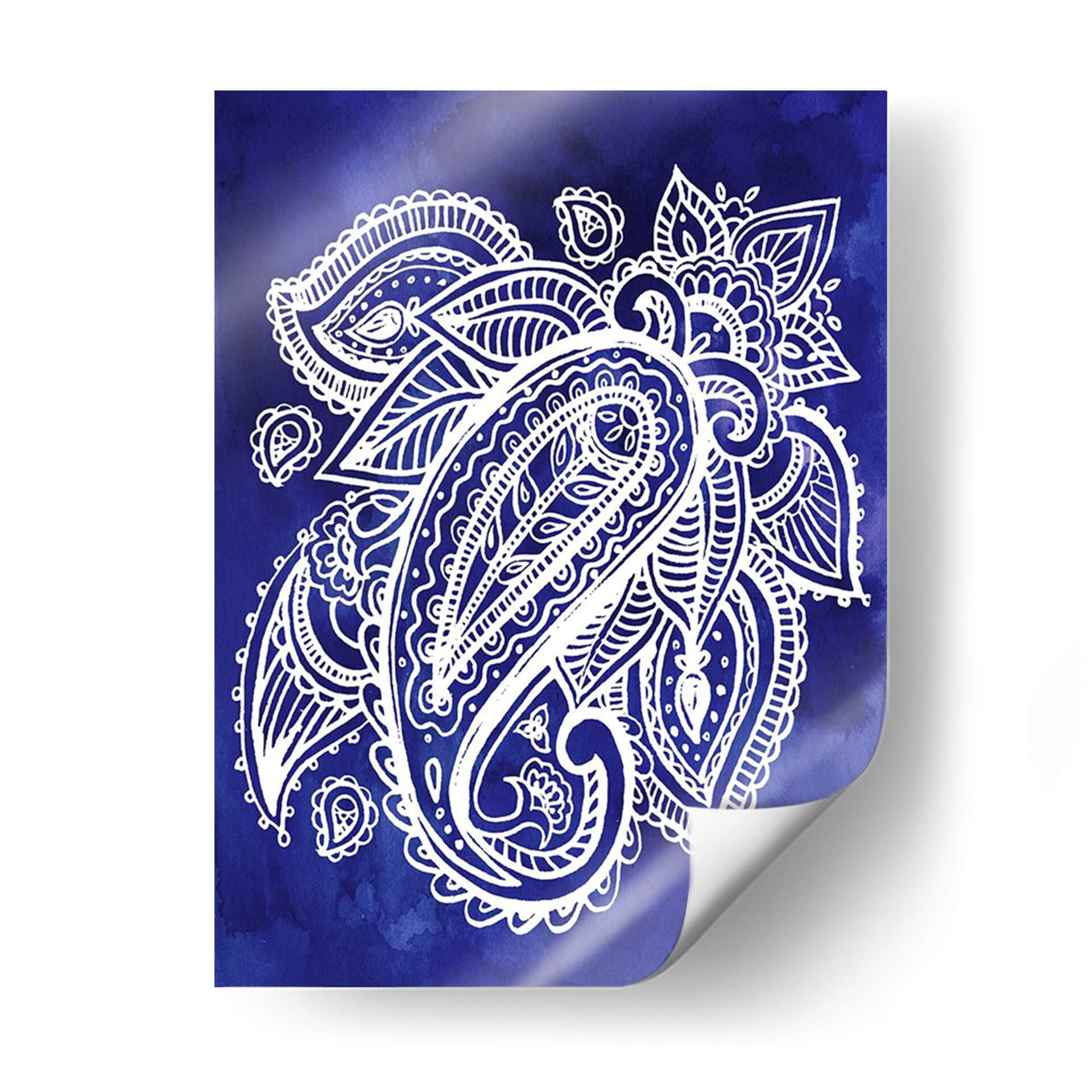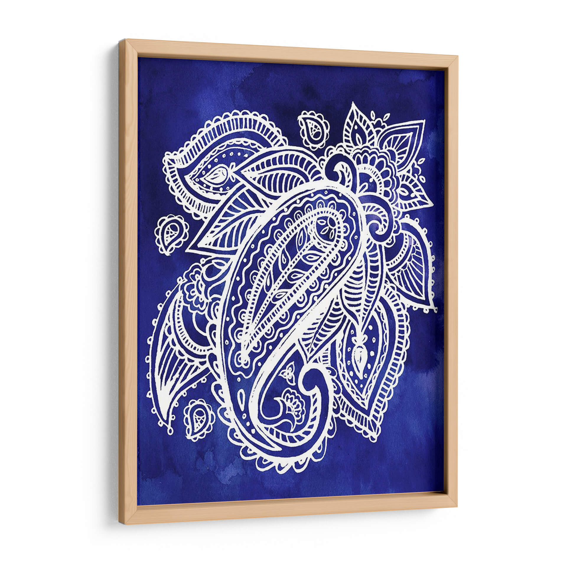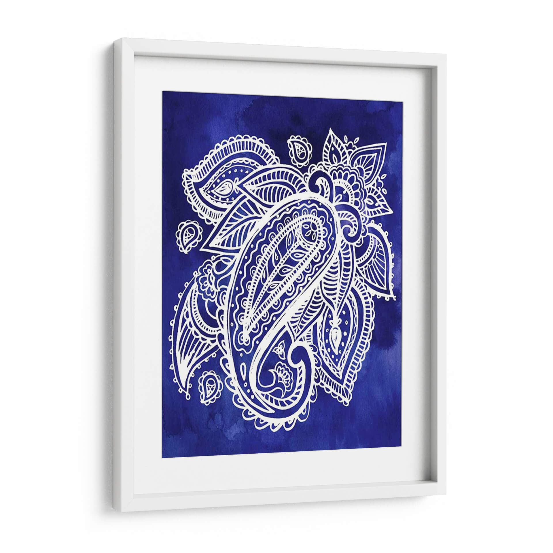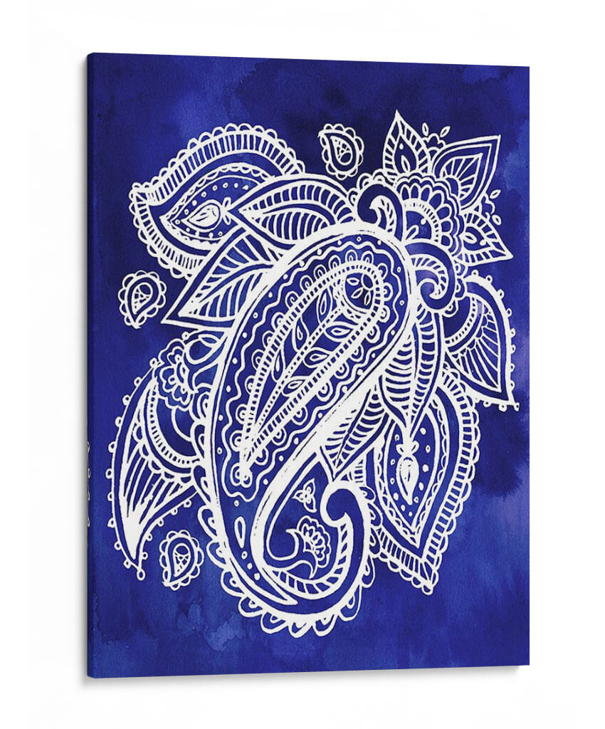 Sumérgete en la vibrante profundidad de "Indigo Paisley II", una obra de arte decorativo que captura la esencia del diseño paisley con una ejecución contemporánea. Este cuadro presenta un intrincado motivo paisley en blanco nítido, delineado con precisión sobre un fondo degradado de acuarela en un intenso tono azul índigo. La composición se centra en la forma icónica del "bote" o "lágrima", rodeada de elementos florales y curvilíneos que añaden movimiento y detalle a la pieza. La técnica de acuarela en el fondo crea una atmósfera etérea y fluida, mientras que el contraste entre el blanco y el azul profundo genera un impacto visual cautivador. "Indigo Paisley II" es perfecto para quienes buscan añadir un toque de sofisticación y un aire bohemio o étnico a su hogar u oficina. Ideal para salas de estar, dormitorios o incluso estudios, este cuadro decorativo aportará una sensación de calma y elegancia, sirviendo como un punto focal inspirador sin abrumar el espacio. Su diseño atemporal y su paleta de colores audaz lo convierten en una adición versátil a cualquier esquema de decoración, desde lo moderno hasta lo tradicional.