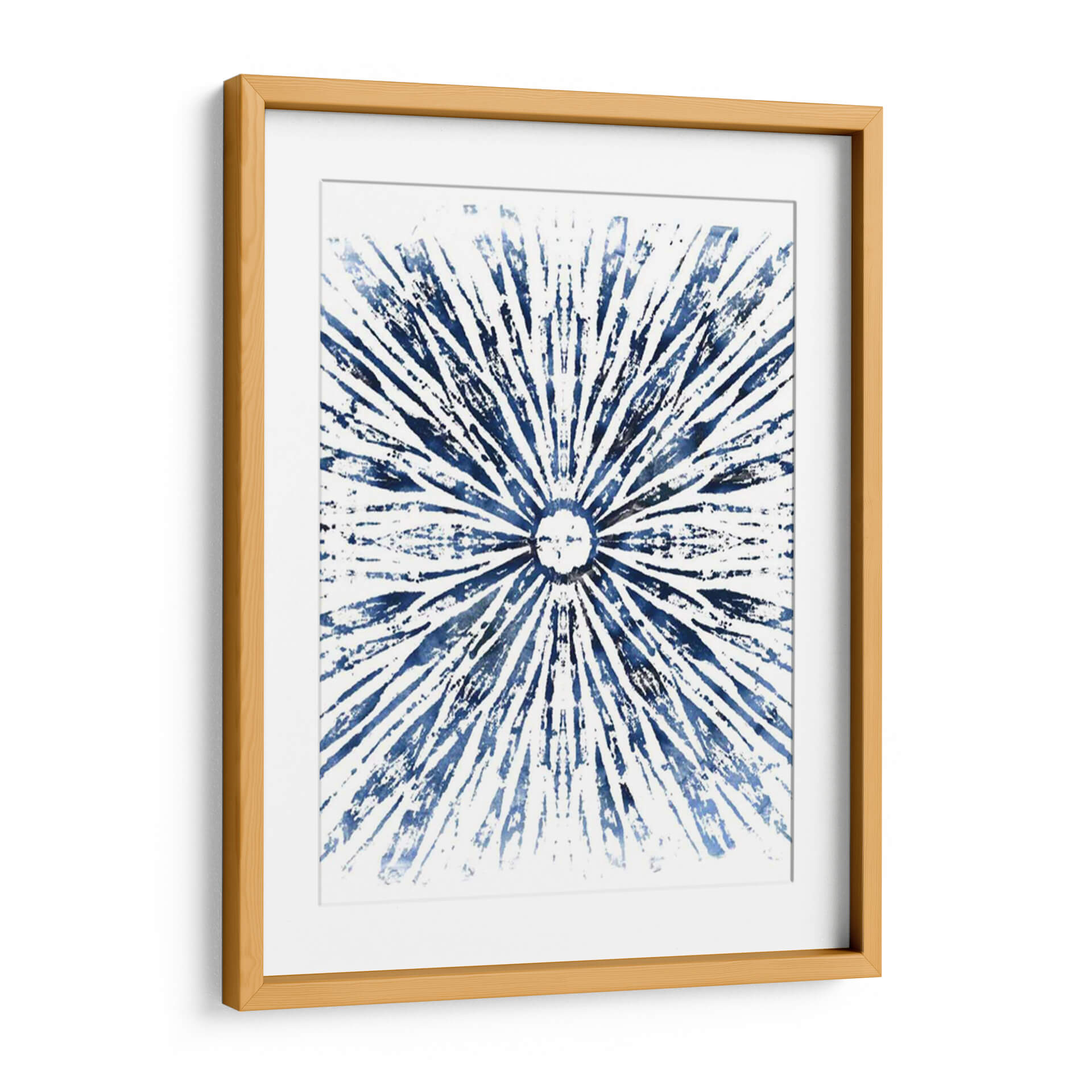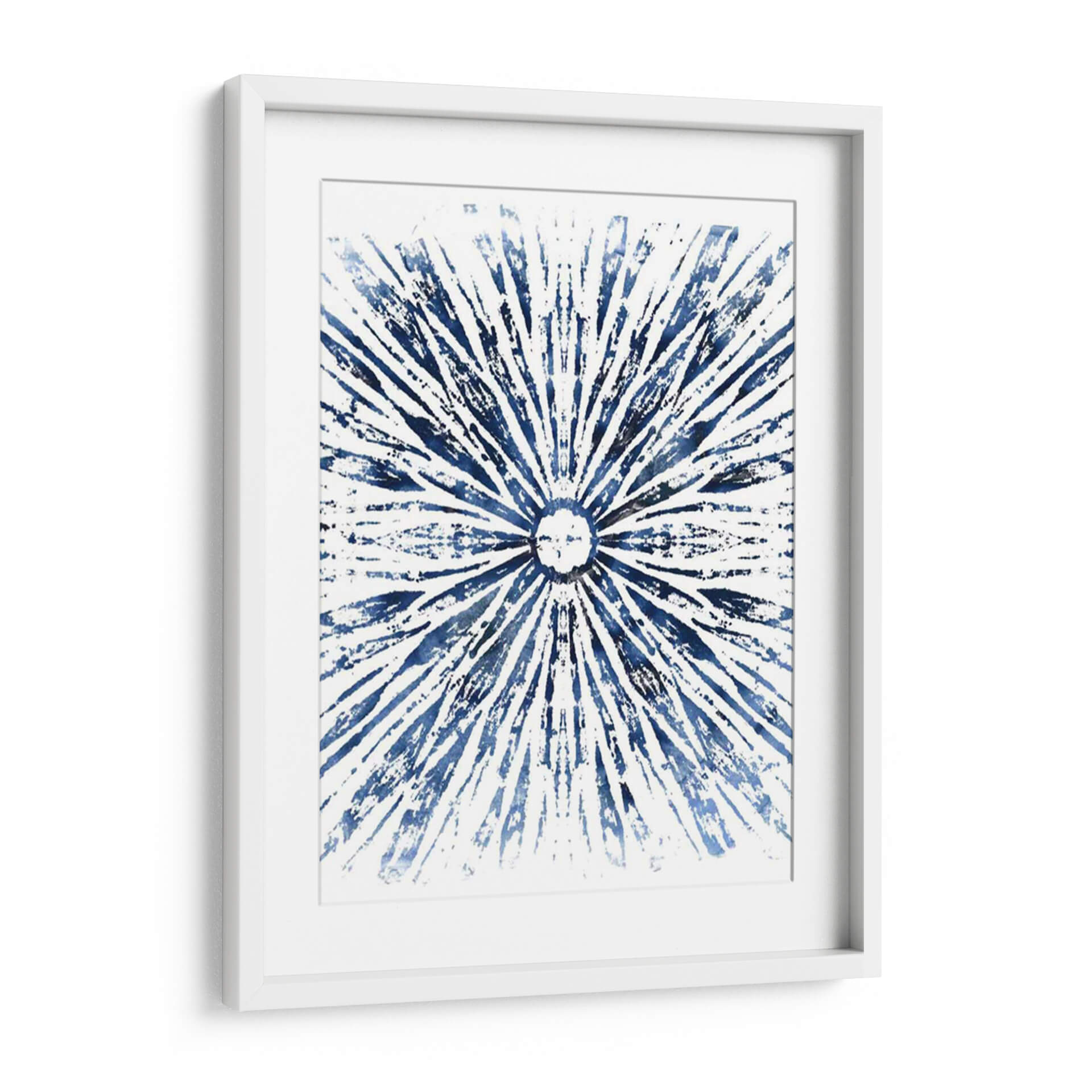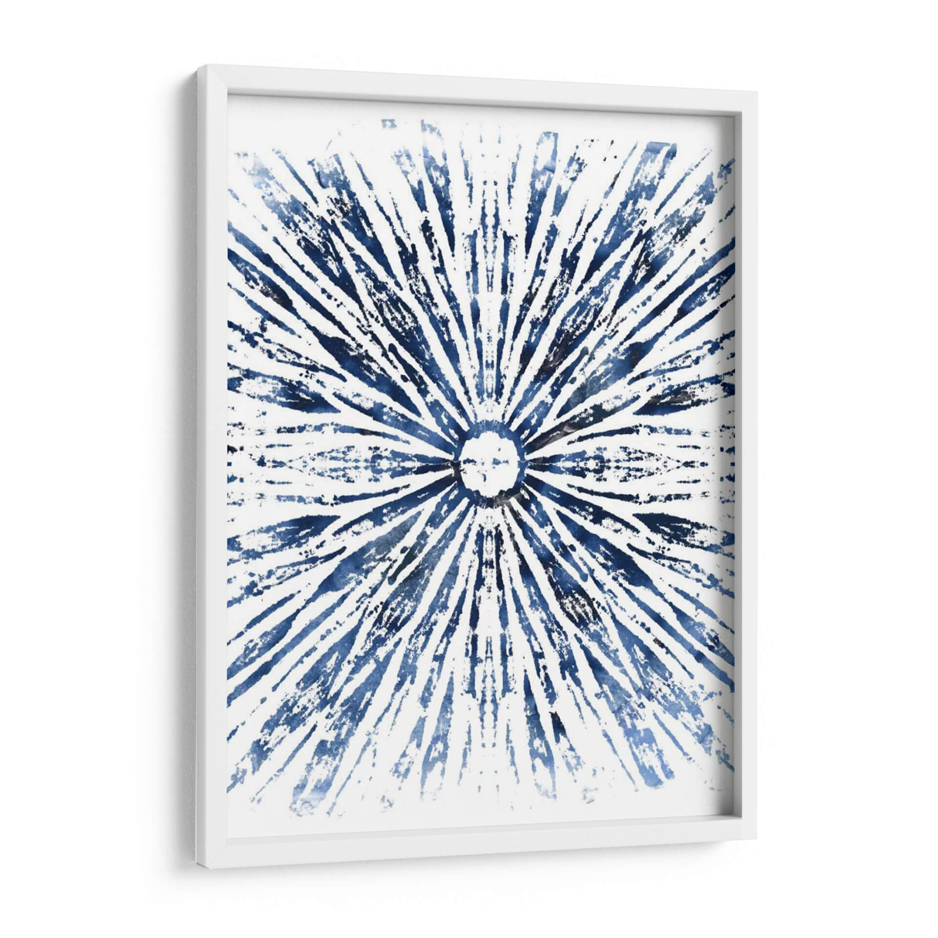 Sumérgete en la serena belleza de "Indigo Tinta Motif Viii", una obra de arte abstracta que irradia calma y elegancia. Este cuadro decorativo presenta un cautivador patrón radial en vibrantes tonos de azul índigo sobre un fondo blanco nítido. Las pinceladas audaces y texturizadas crean una sensación de movimiento y profundidad, evocando la imagen de un sol estilizado o una explosión de energía rítmica. La composición simétrica y el uso del color azul profundo invitan a la contemplación, aportando una atmósfera de tranquilidad y sofisticación a cualquier espacio. Ideal para salones modernos, dormitorios serenos u oficinas que buscan un toque de inspiración artística. La simplicidad del diseño, combinada con la intensidad del azul, lo convierte en una pieza versátil que complementa una amplia gama de estilos decorativos, desde el contemporáneo hasta el minimalista. "Indigo Tinta Motif Viii" es más que una decoración de pared; es una ventana a la introspección y un punto focal que embellece y armoniza tu entorno.